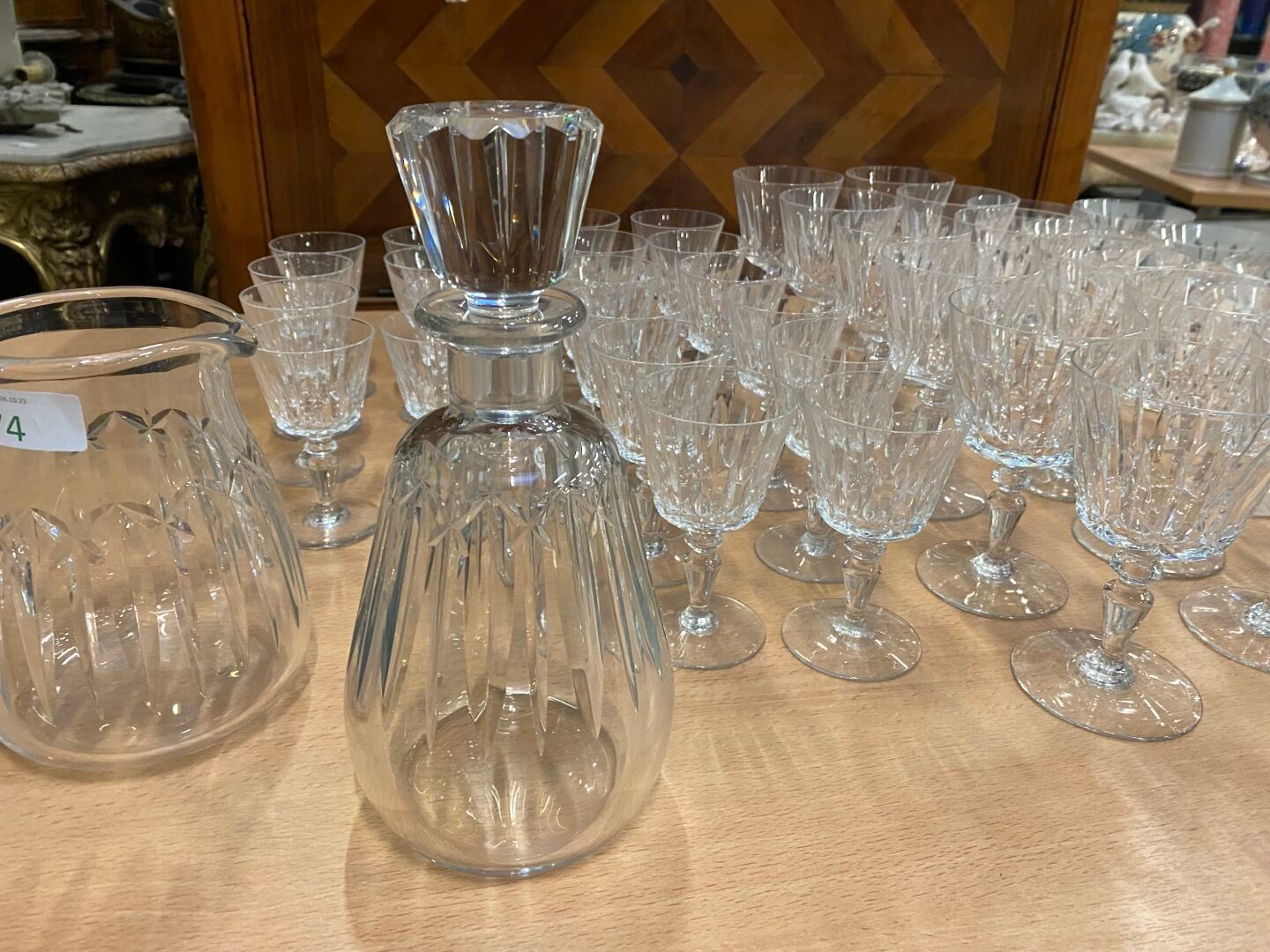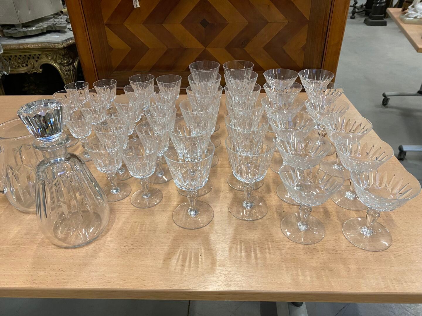 BACCARAT. A service of cut crystal GLASSES with lattice decoration including 12 champagne glasses, 12 water glasses, 12 red wine glasses, 8 white wine glasses, a jug, a wine carafe.
