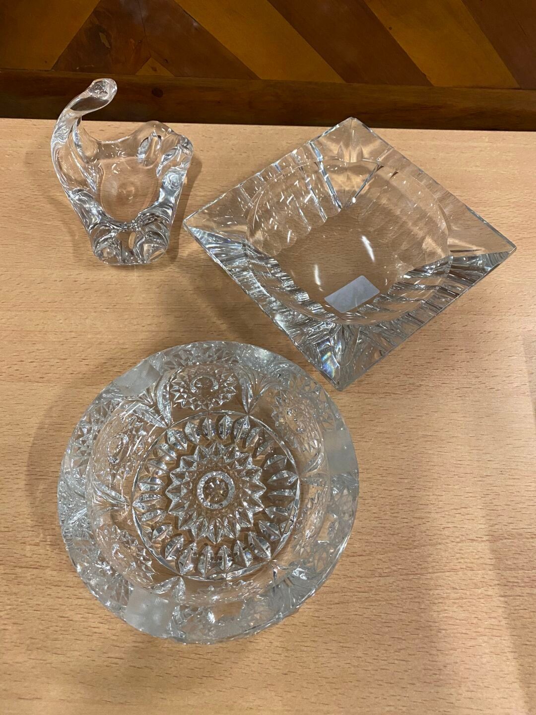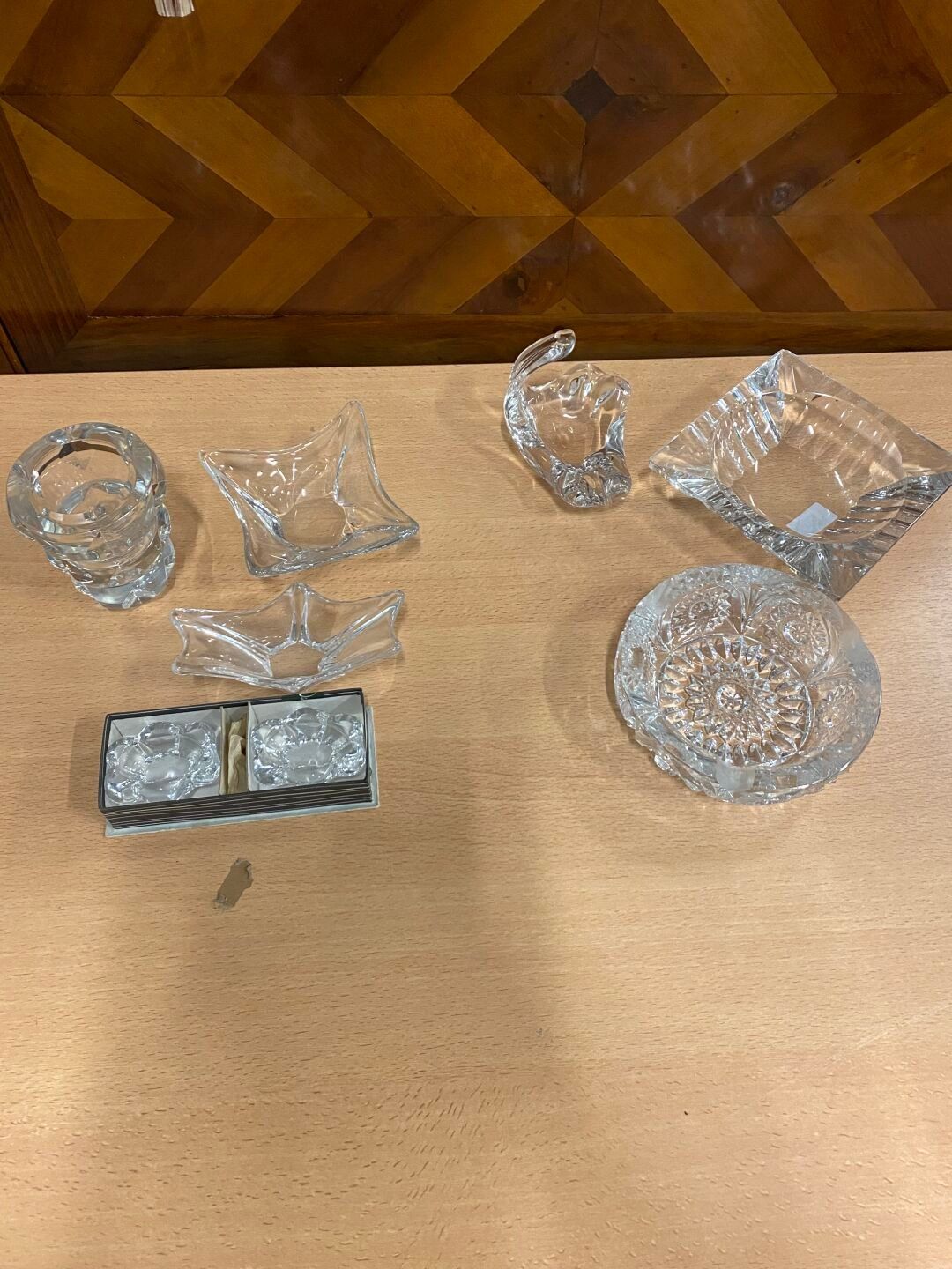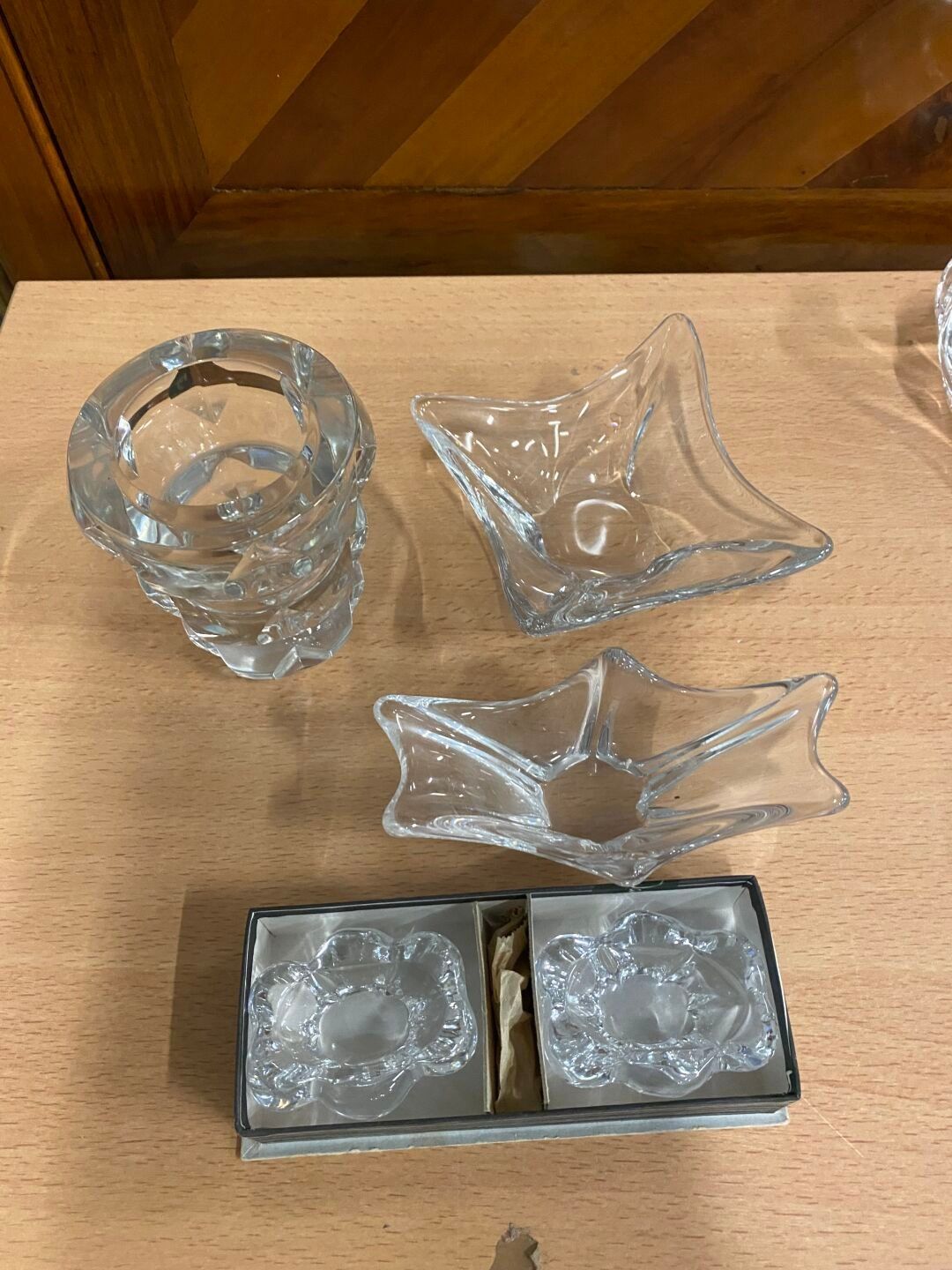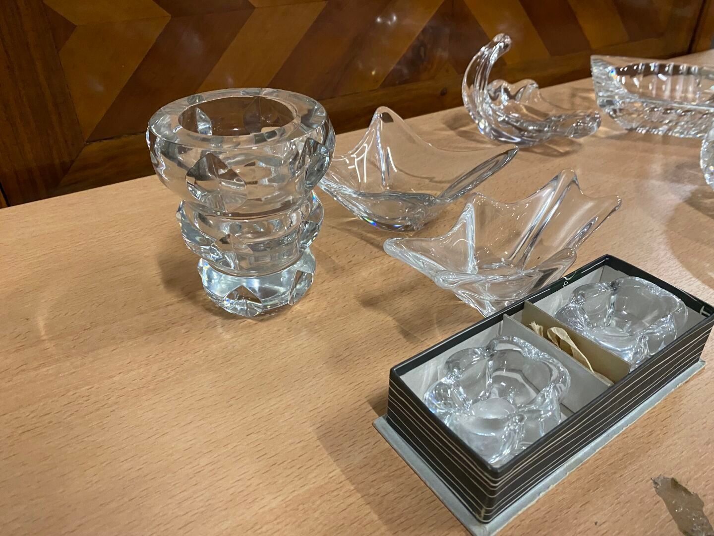 DAUM. Set comprising a small vase, two tureens and a pair of salt cellars. Two ashtrays and an unmarked pocket opener are included.