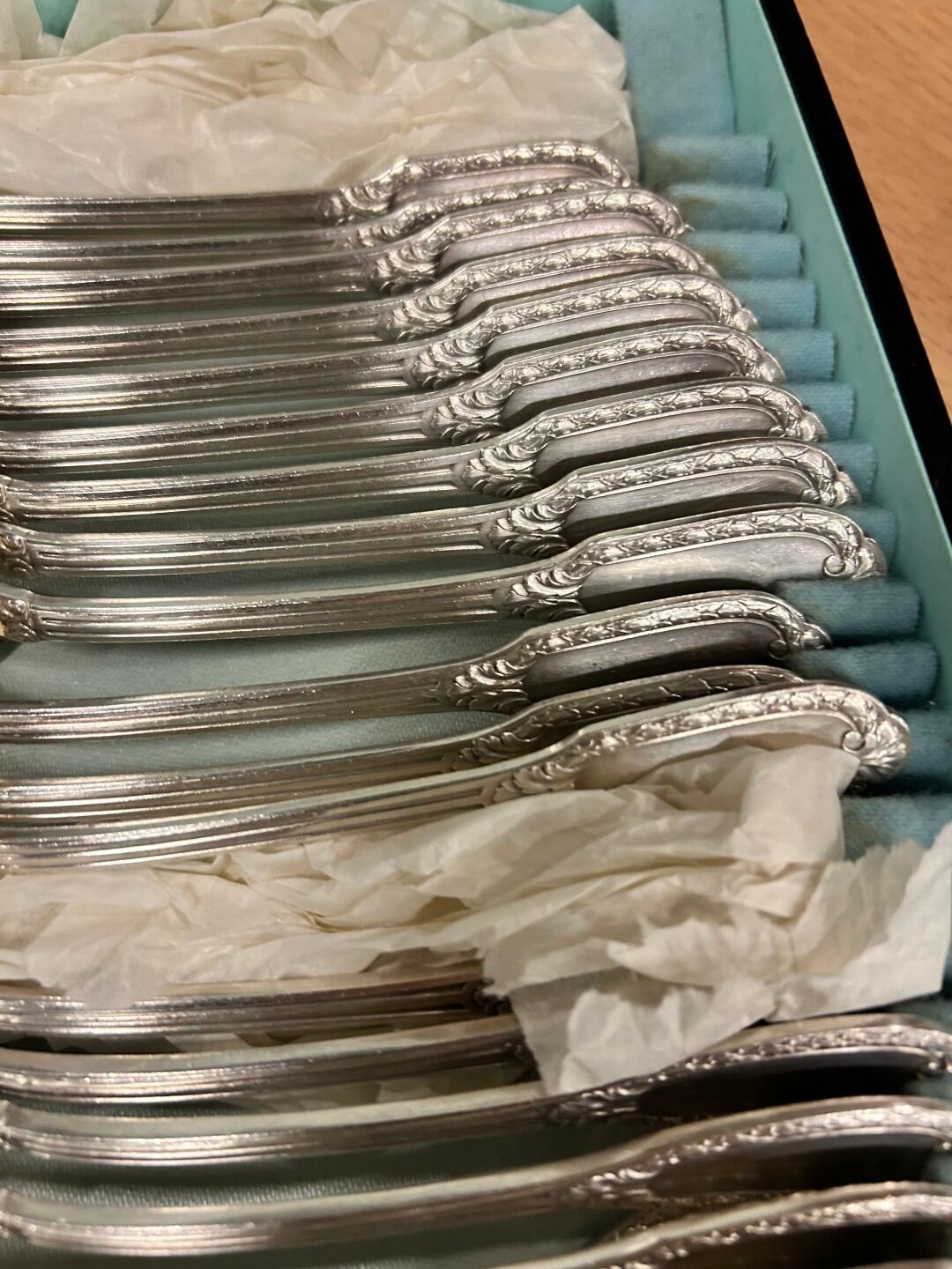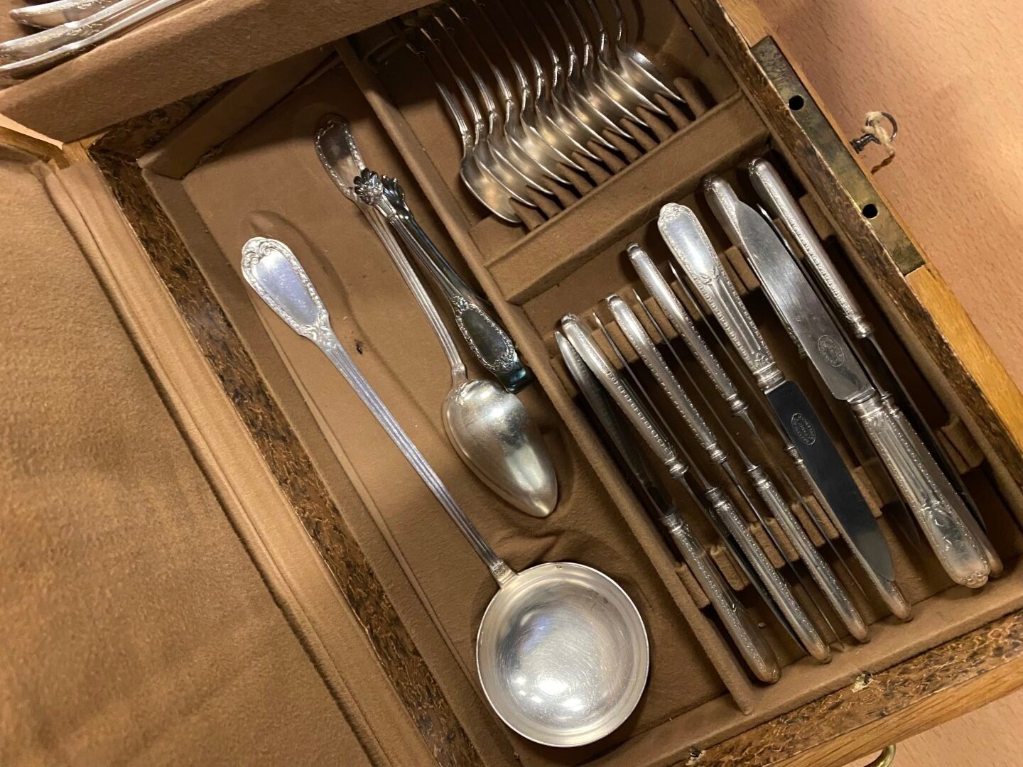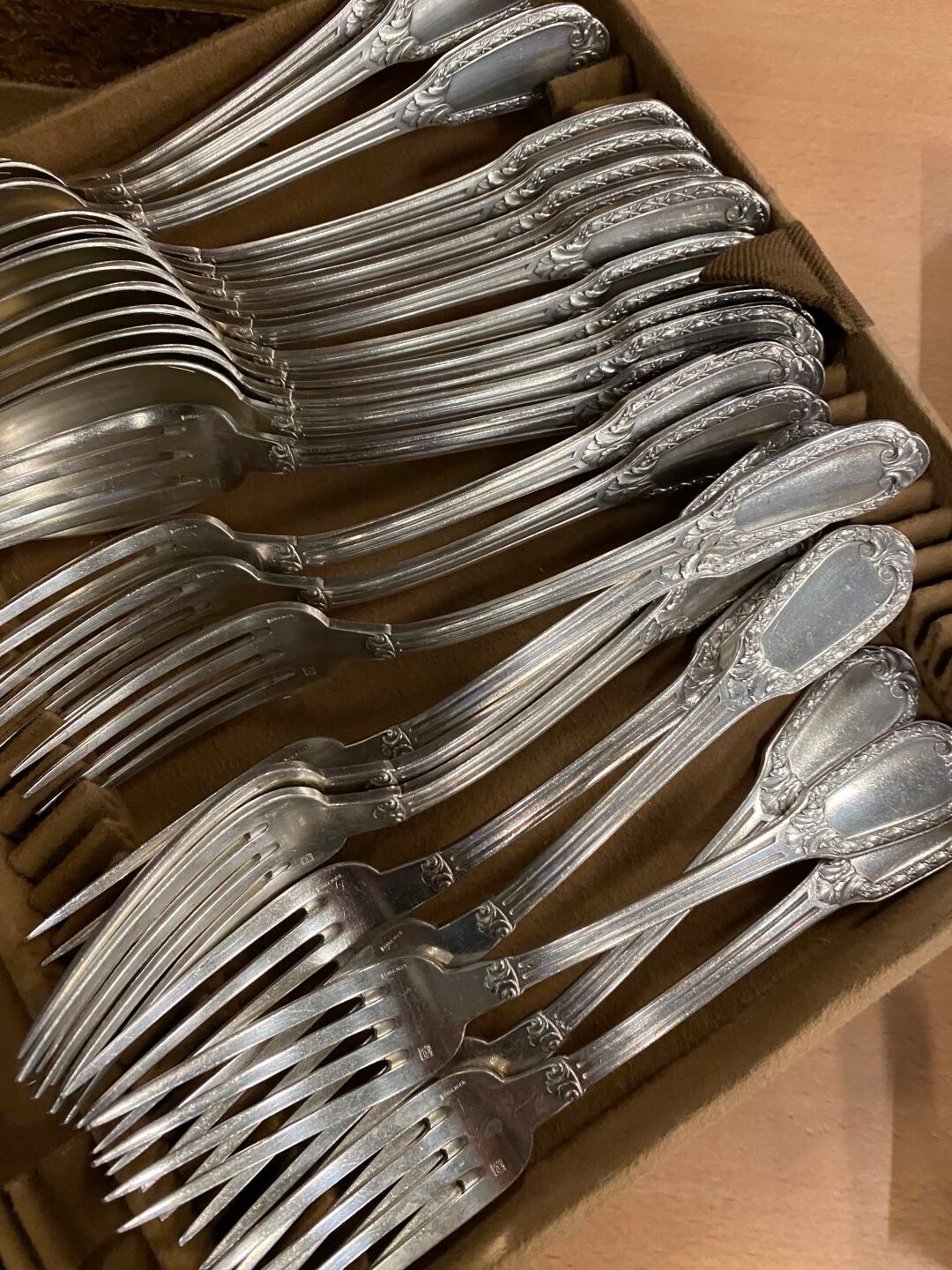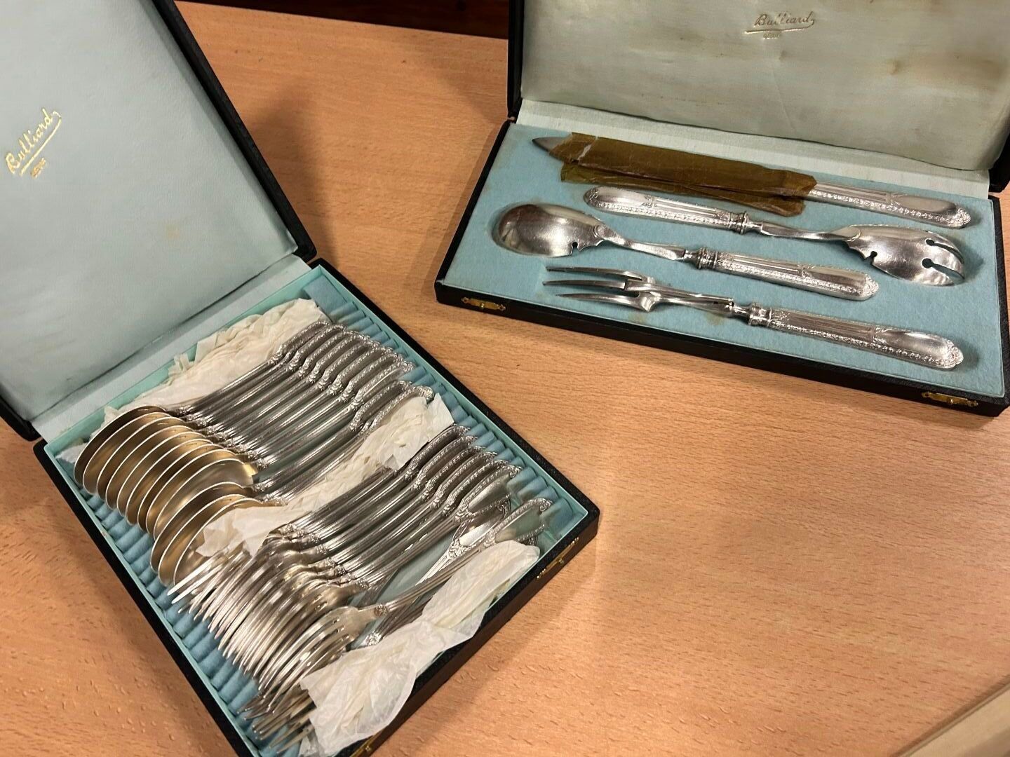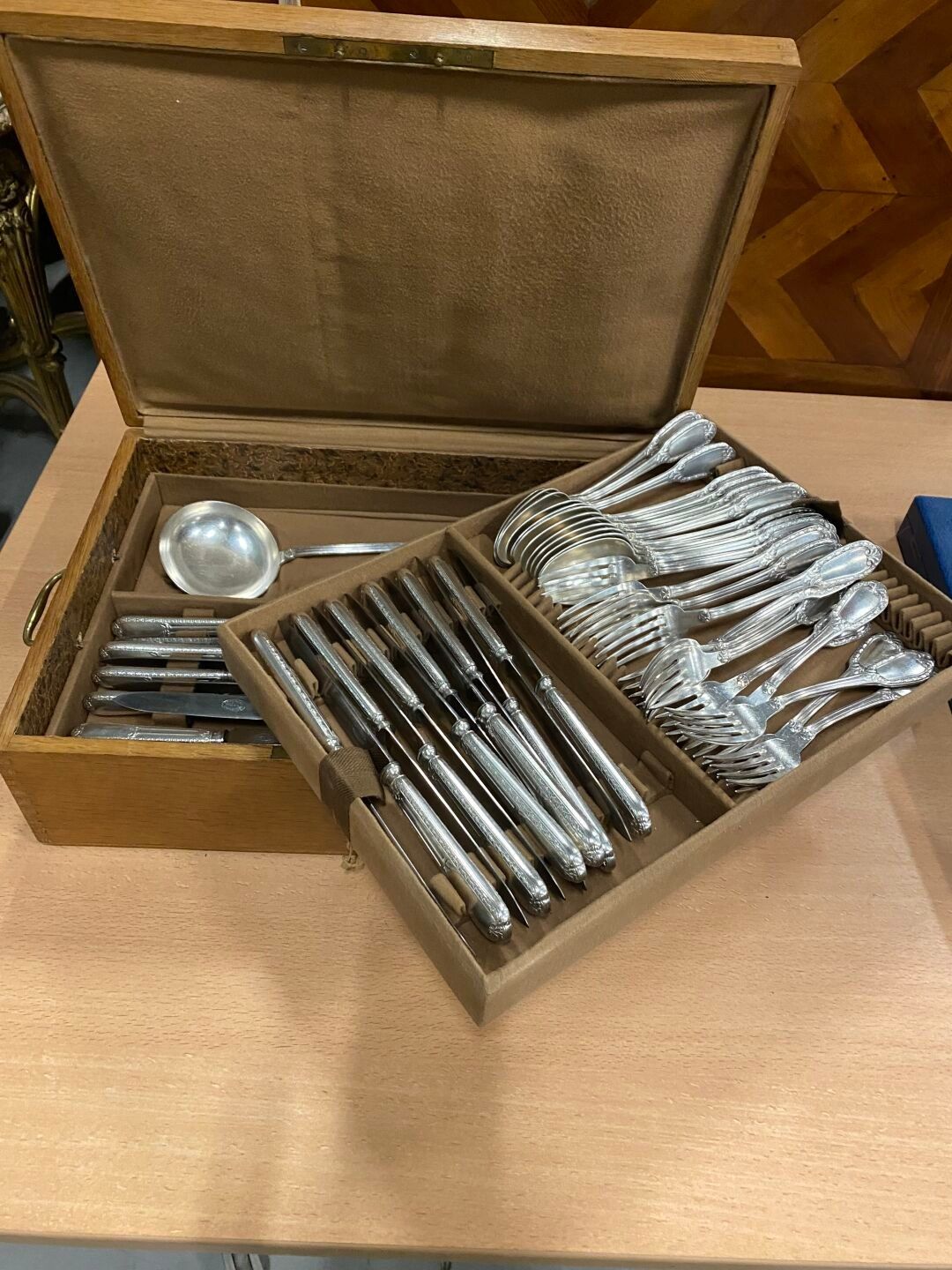 BOULENGER. Set of silver-plated cutlery decorated with laurel friezes, including large cutlery, large knives, small spoons, ladle, dessert cutlery, serving pieces and stew spoon. In its oak case (and two cases).