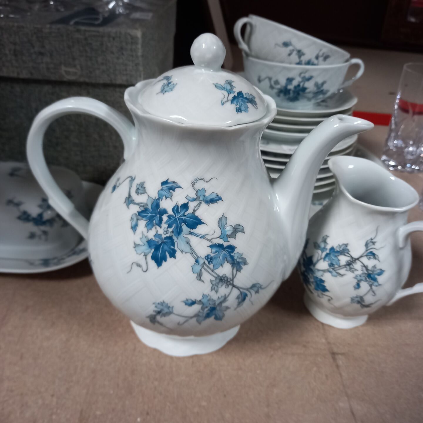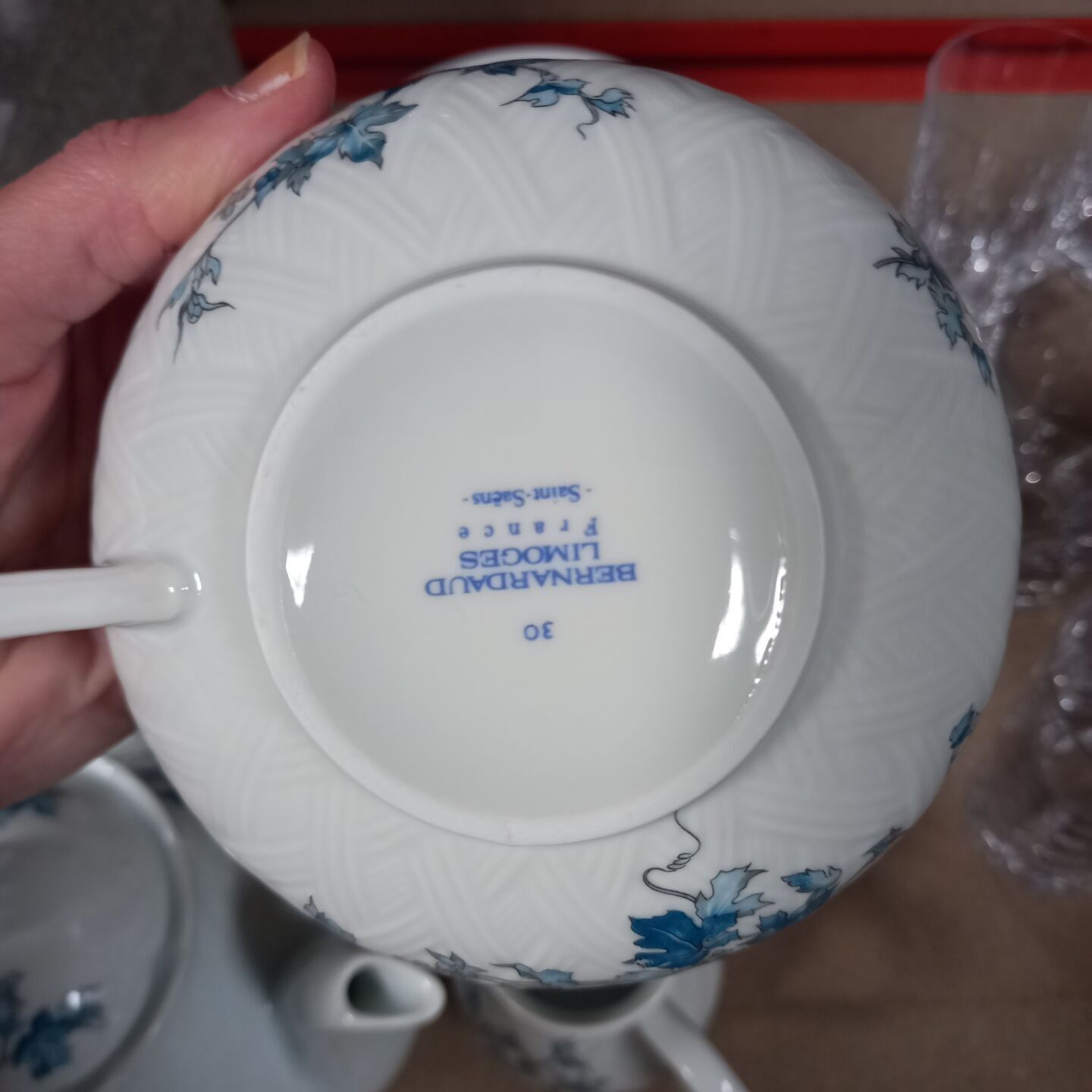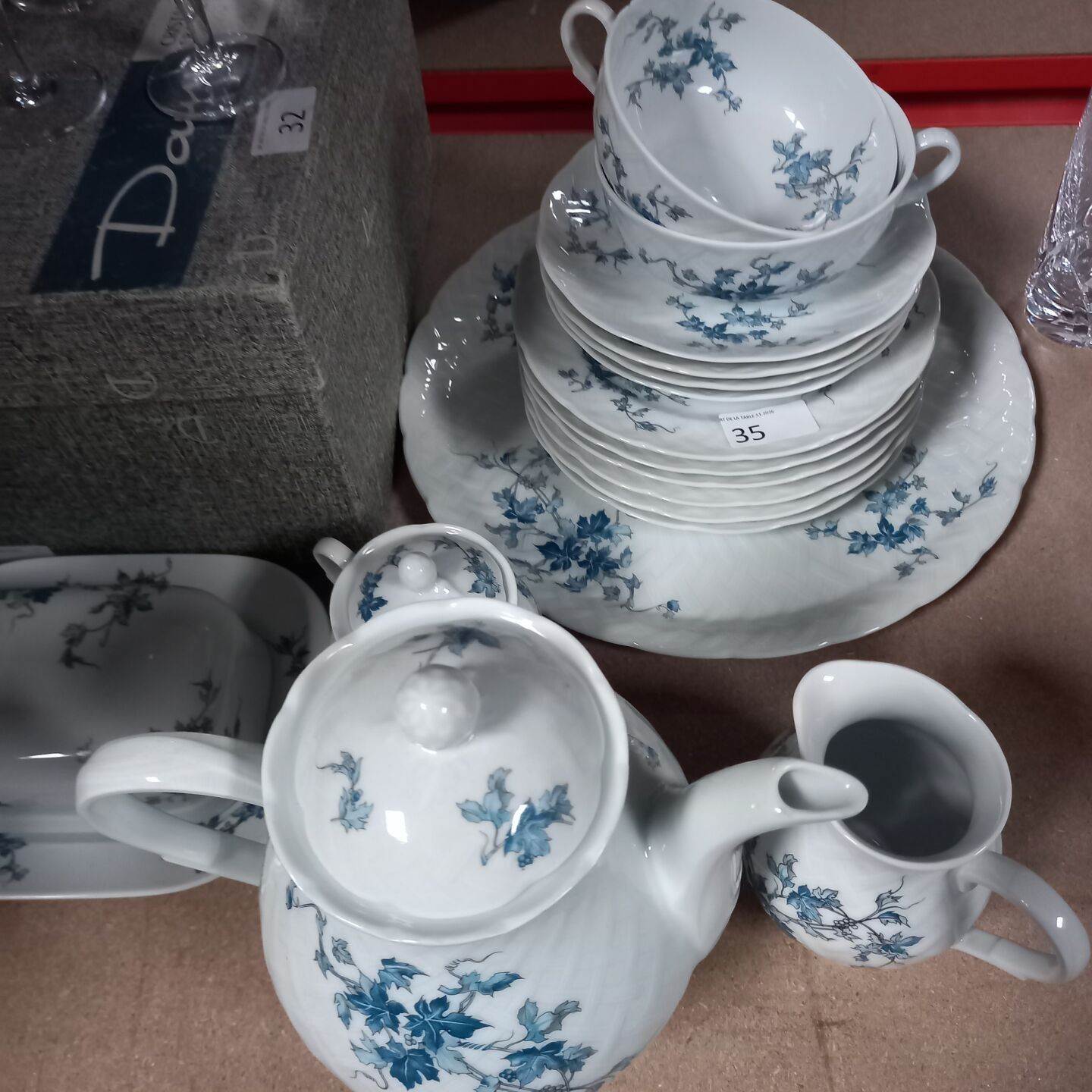 BERNARDAUD - DESSERT SET "SAINT SAENS" model in white porcelain decorated with blue flowers including: a TEAPOT, a MILK POT, a SUGAR, a BUTTER, a GATHERING DISH, six DESSERT PLATES, 2 LUNCH CUPS and four UNDER CUPS. AS IS (accidents)
