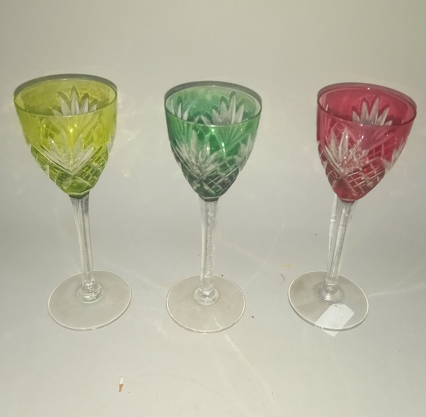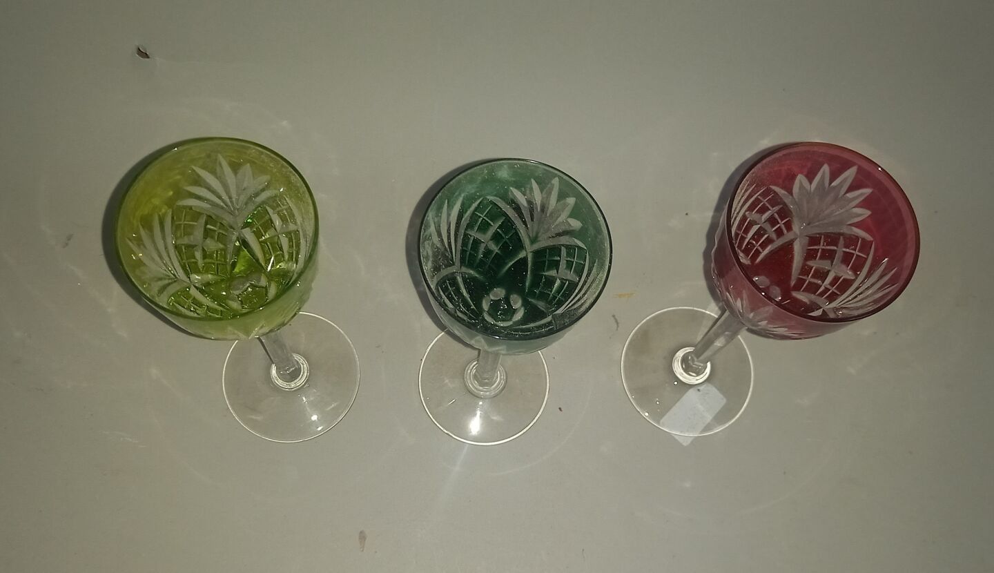 SAINT LOUIS, 3 Rhine wine glasses in coloured glass.