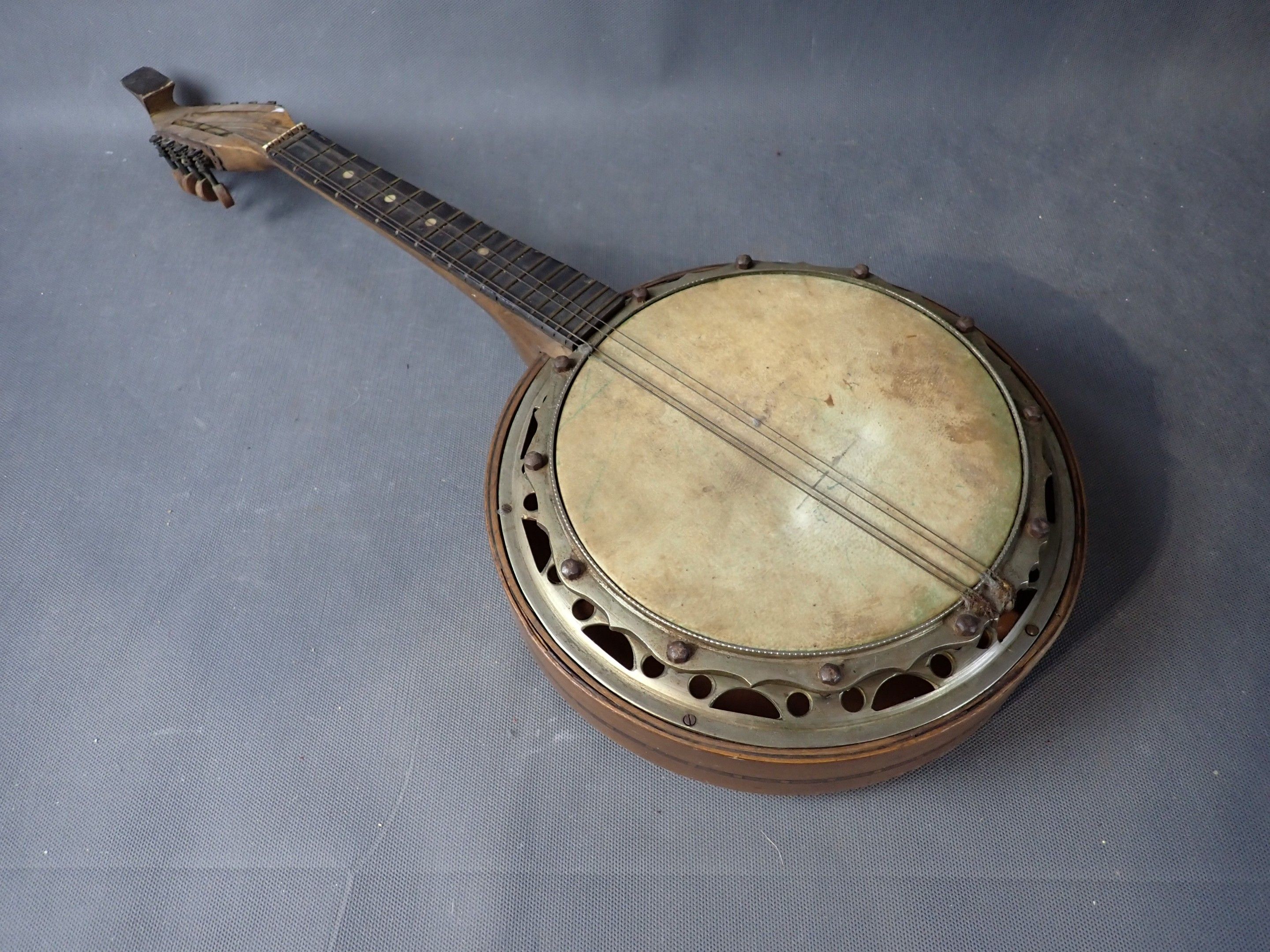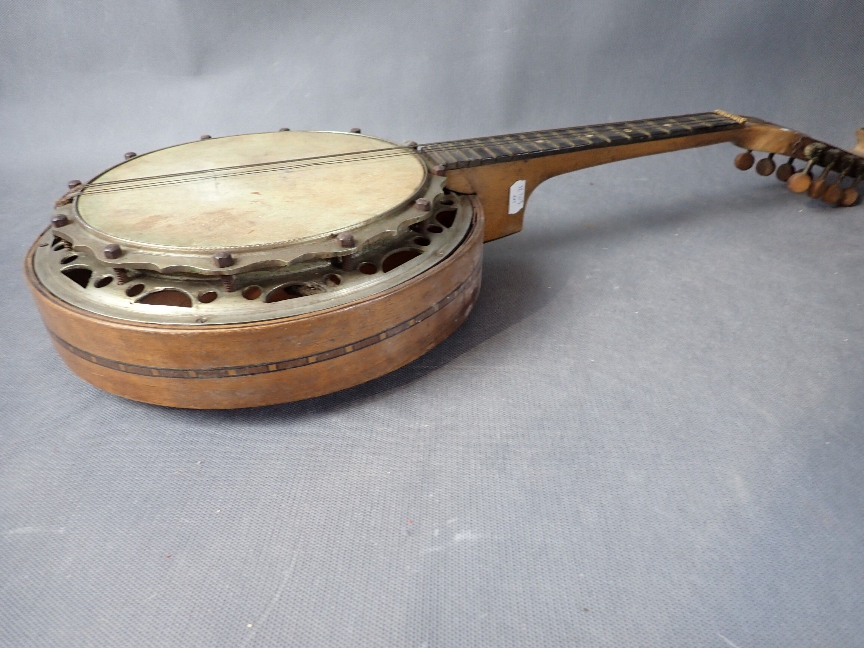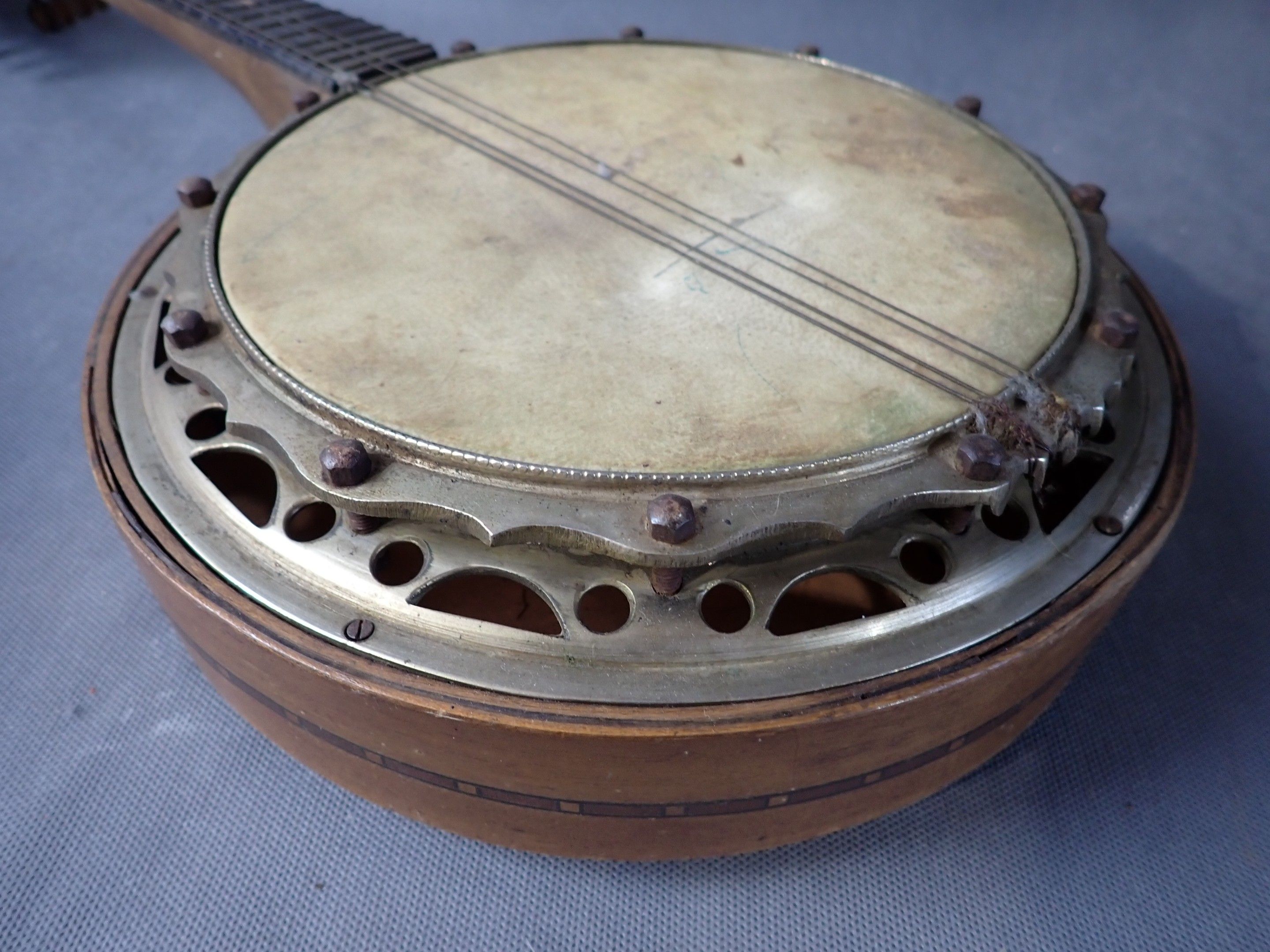 Banjo, L 63cm, inlaid body (strings missing, some oxidation …