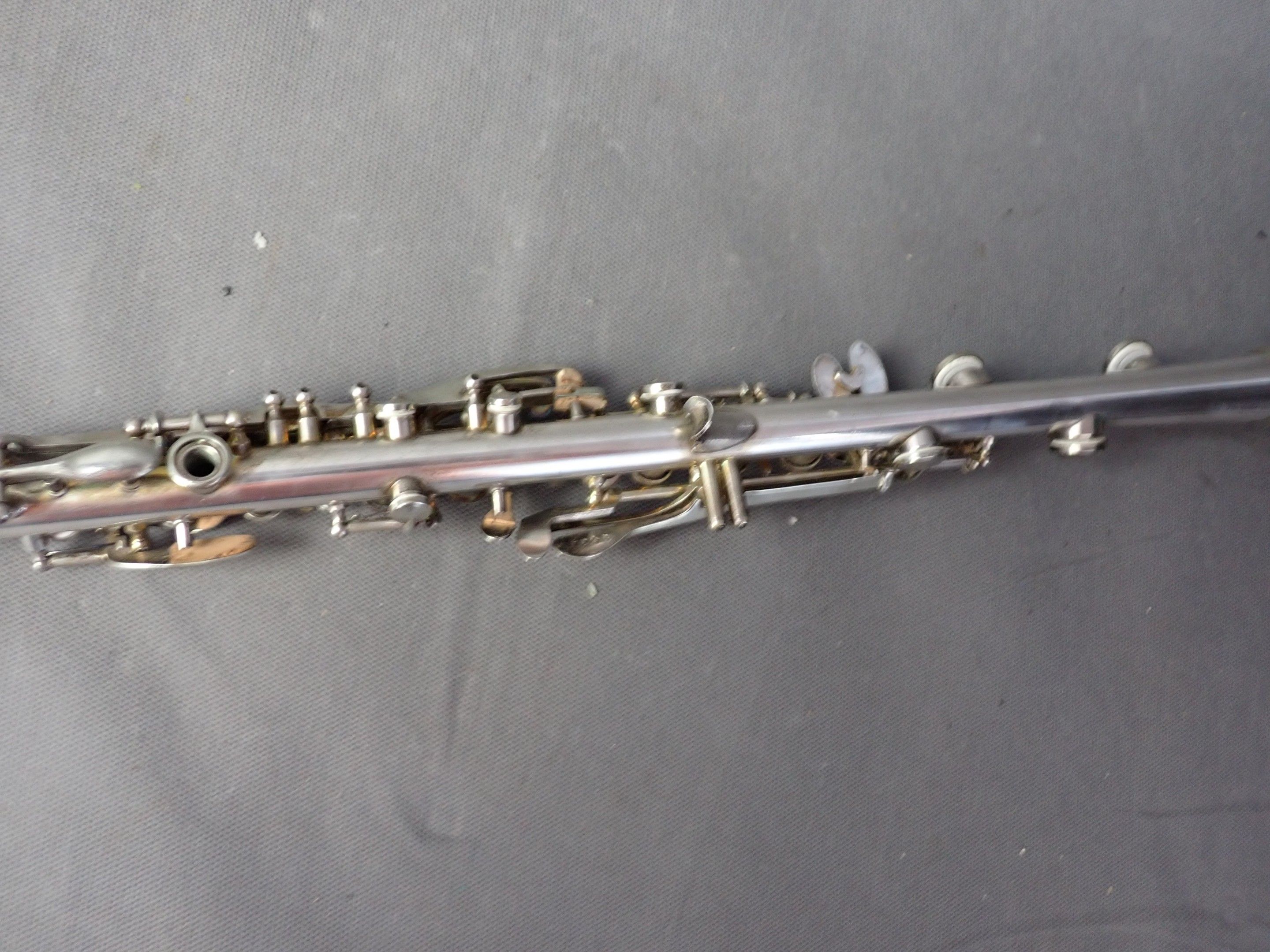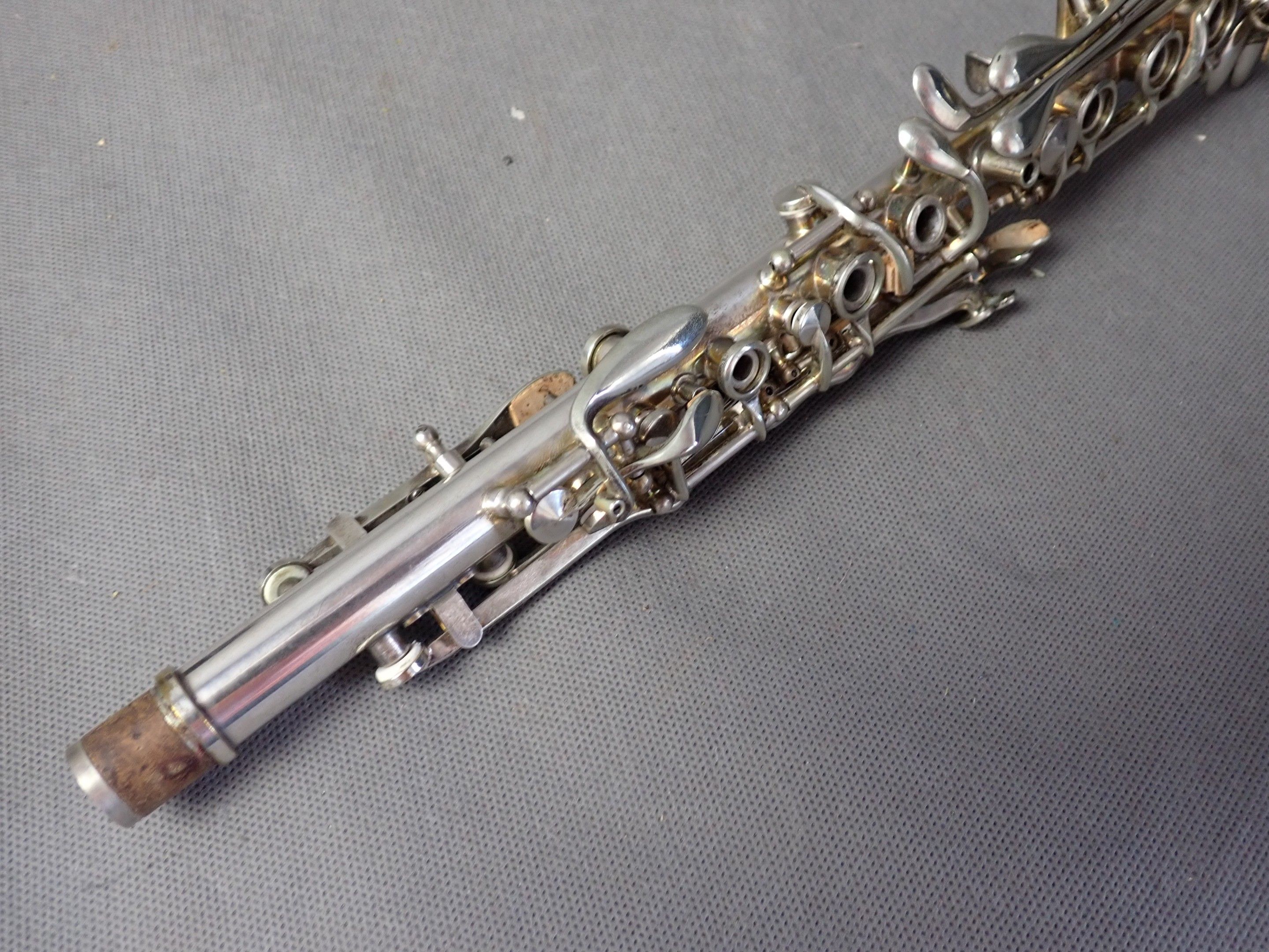 Pedler "Custombuilt" Bb Silver Clarinet, No. 47293, 1940s-1950s, single body to bell, brass barrel, played (Original case)