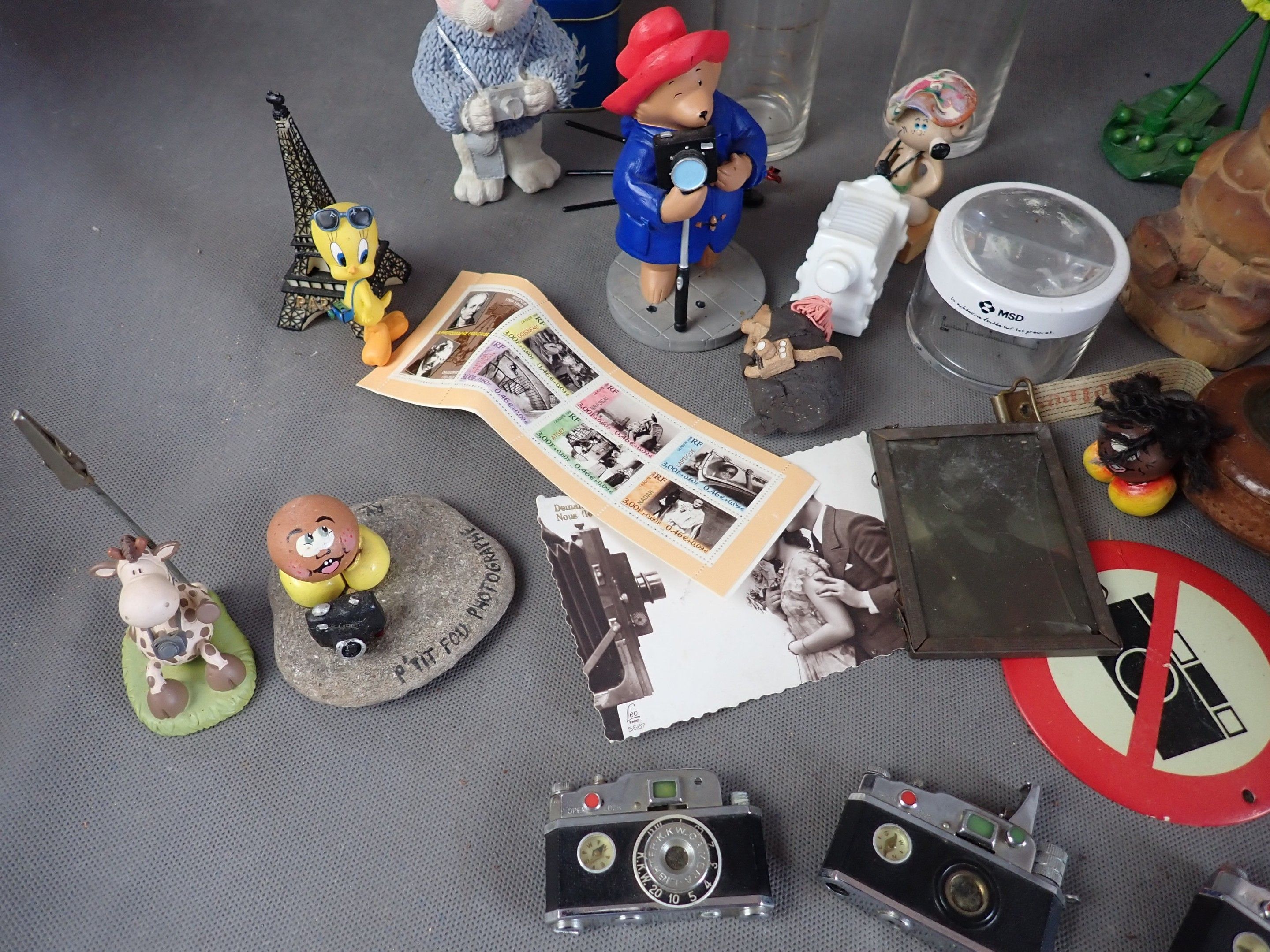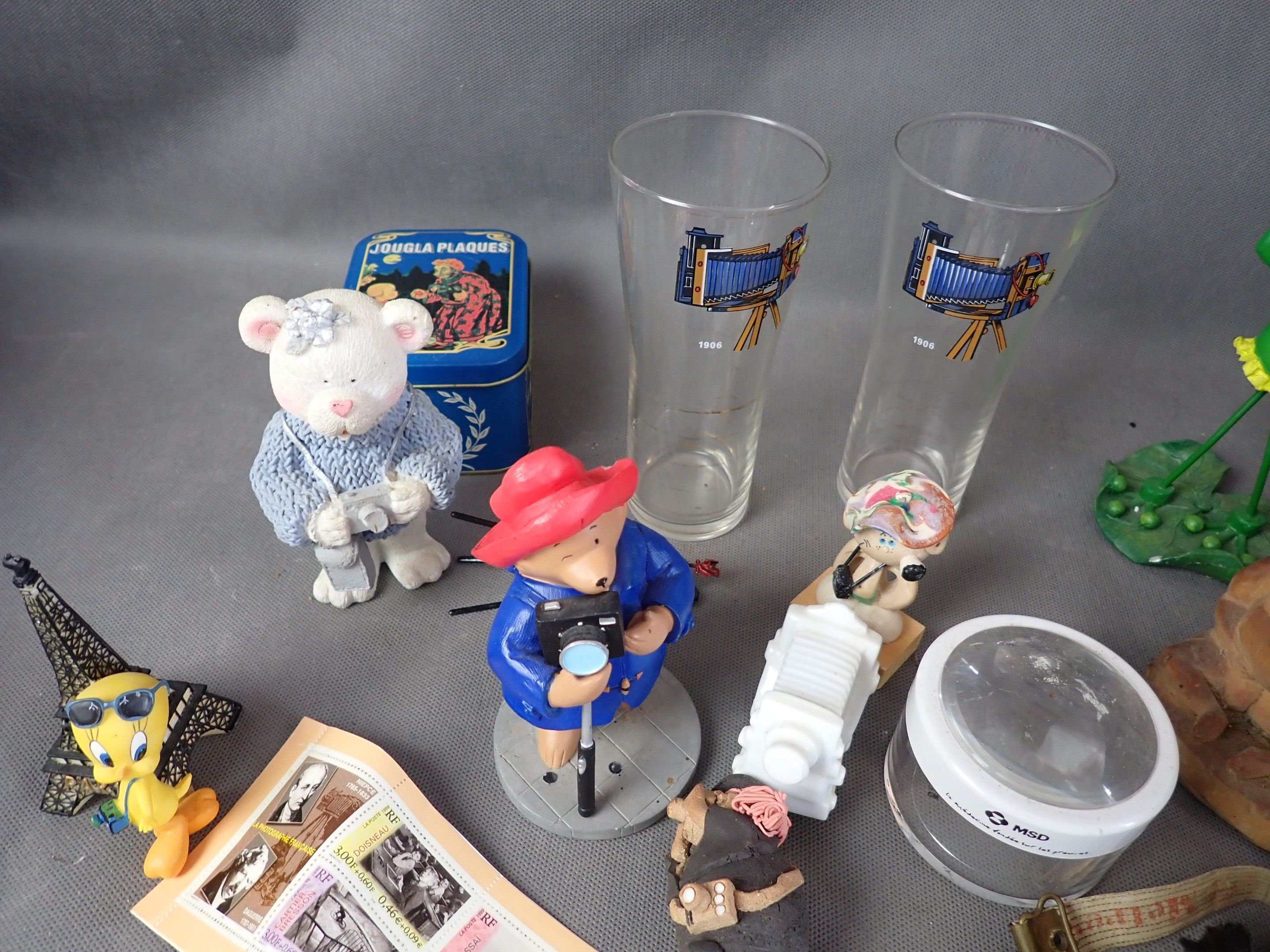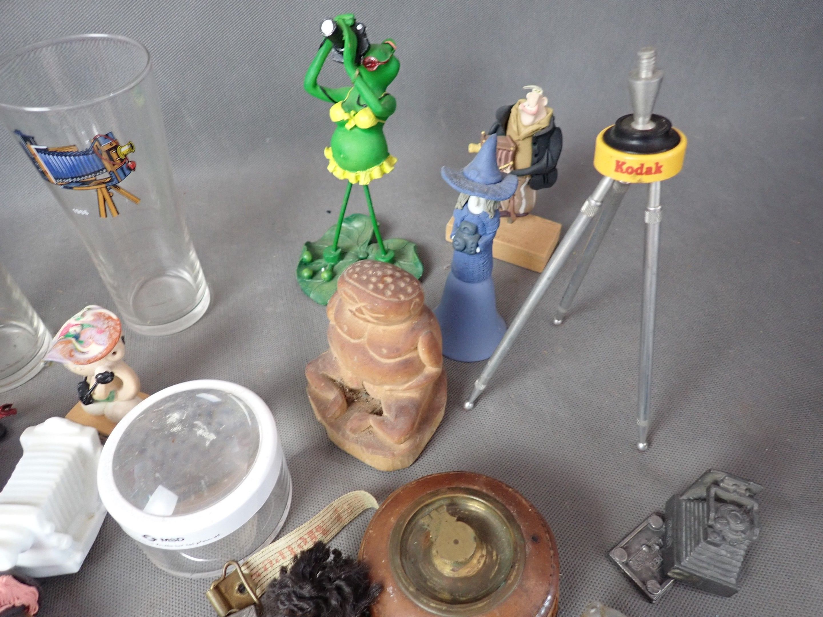 Lot of miscellaneous objects, mainly on the theme of photography, including figurines, glasses and miscellaneous (accidents).