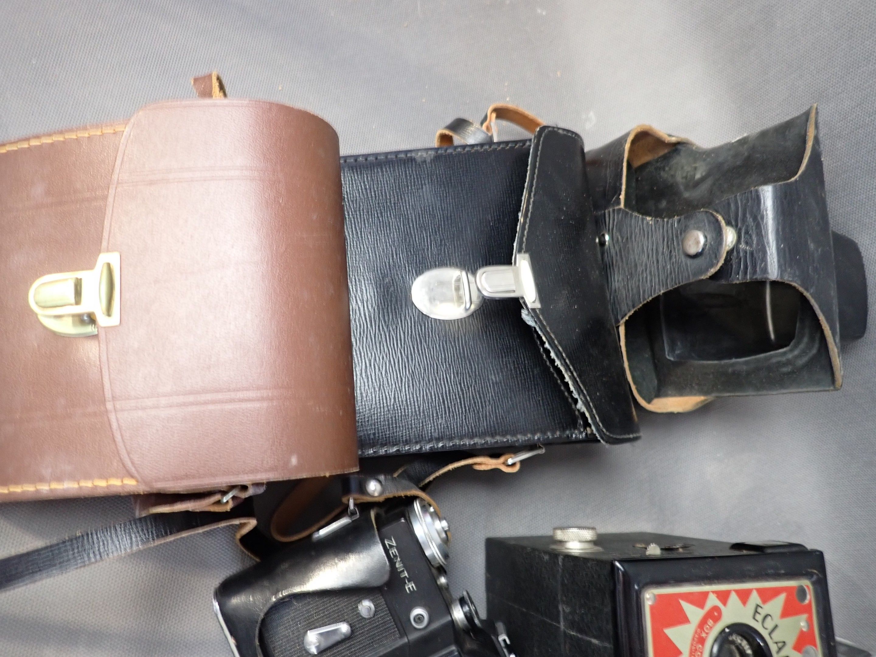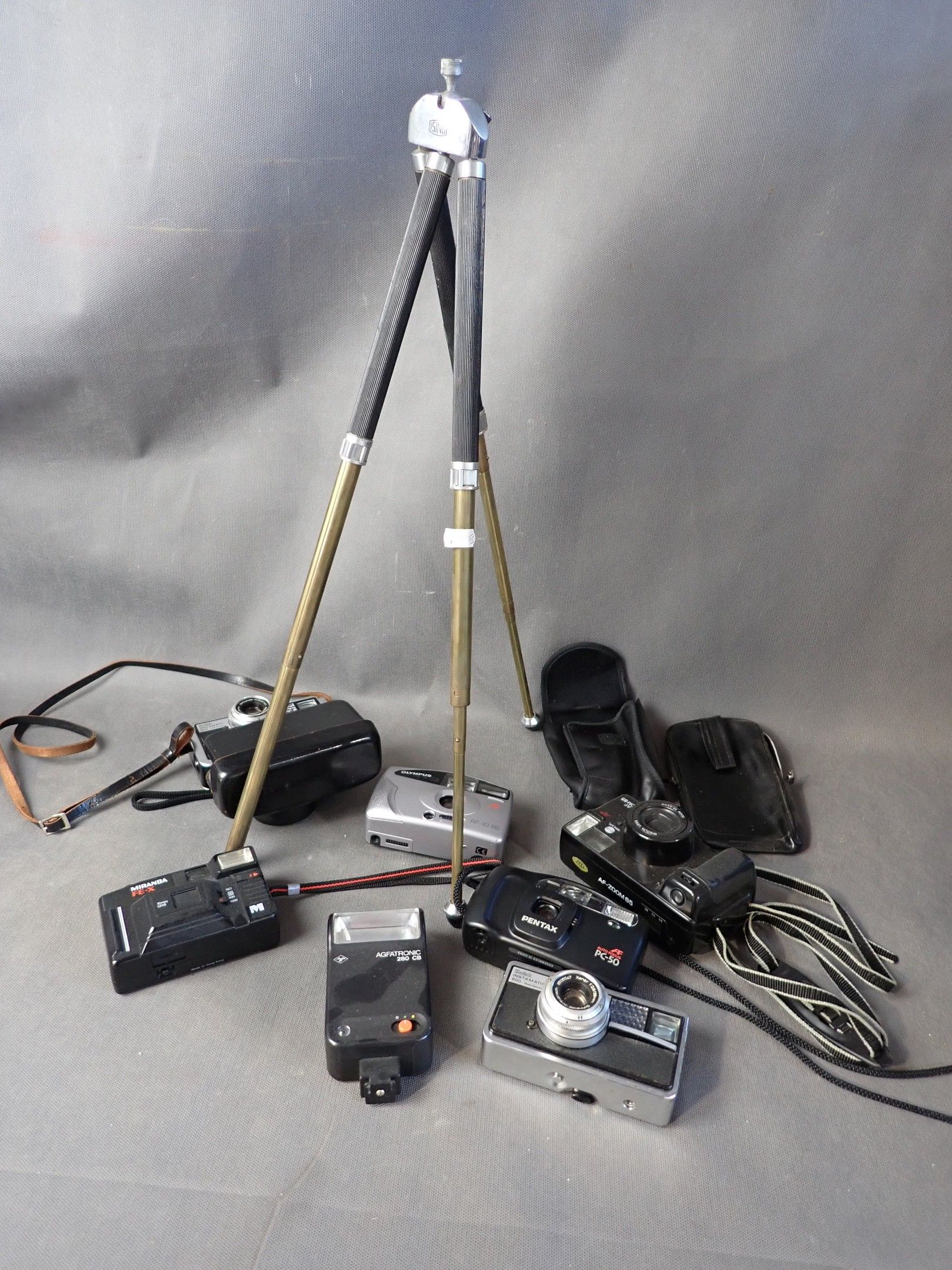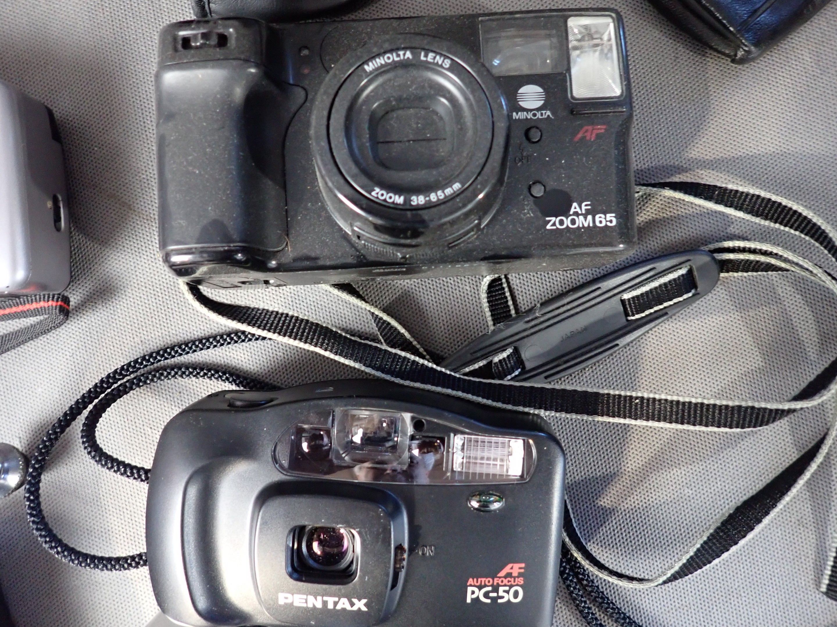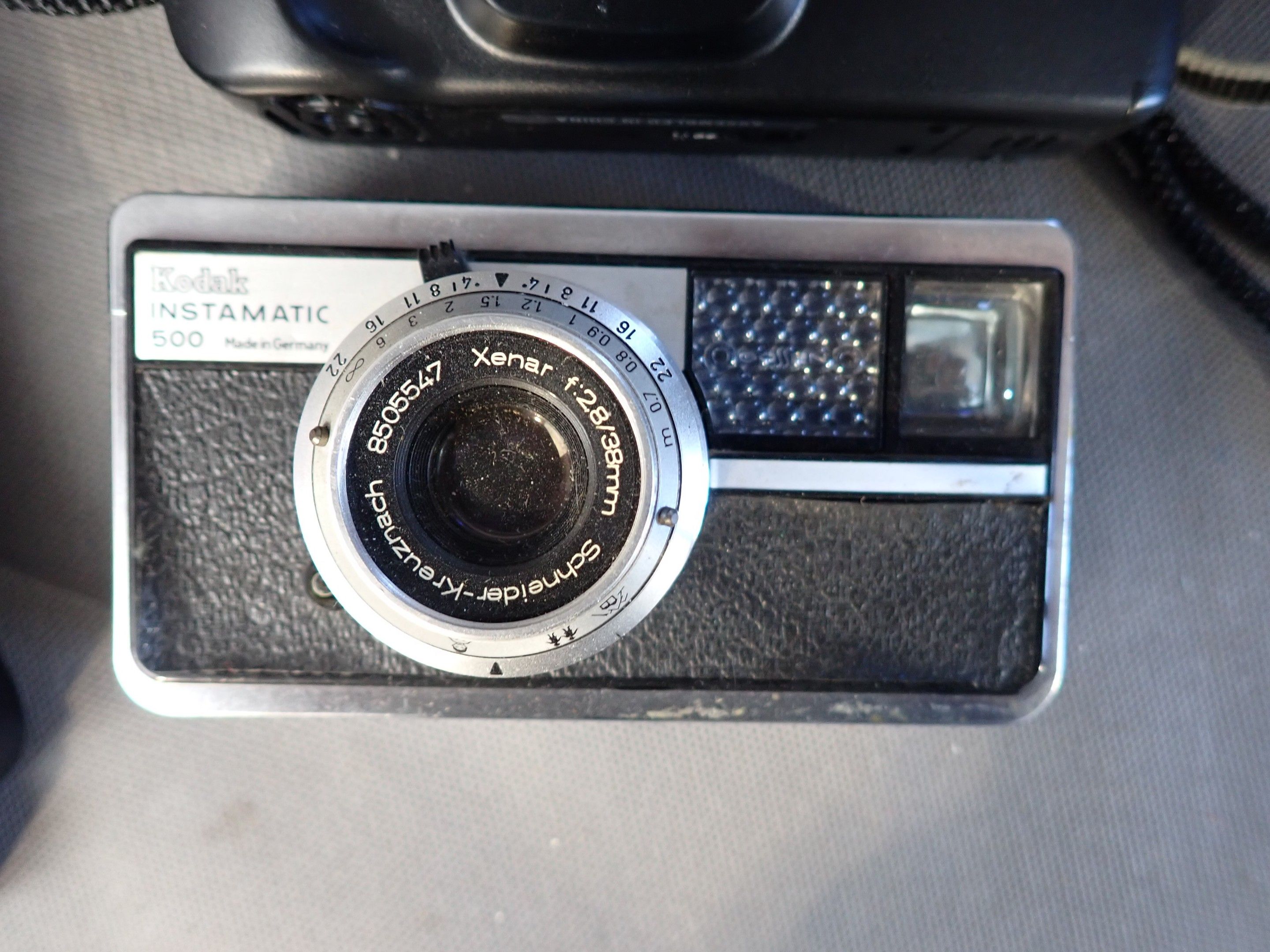 Set of film cameras including MIRANDA, OLYMPUS, KODAK, INSTAMATIC 500, MINOLTA AF 65, PENTAX and a zoom lens.