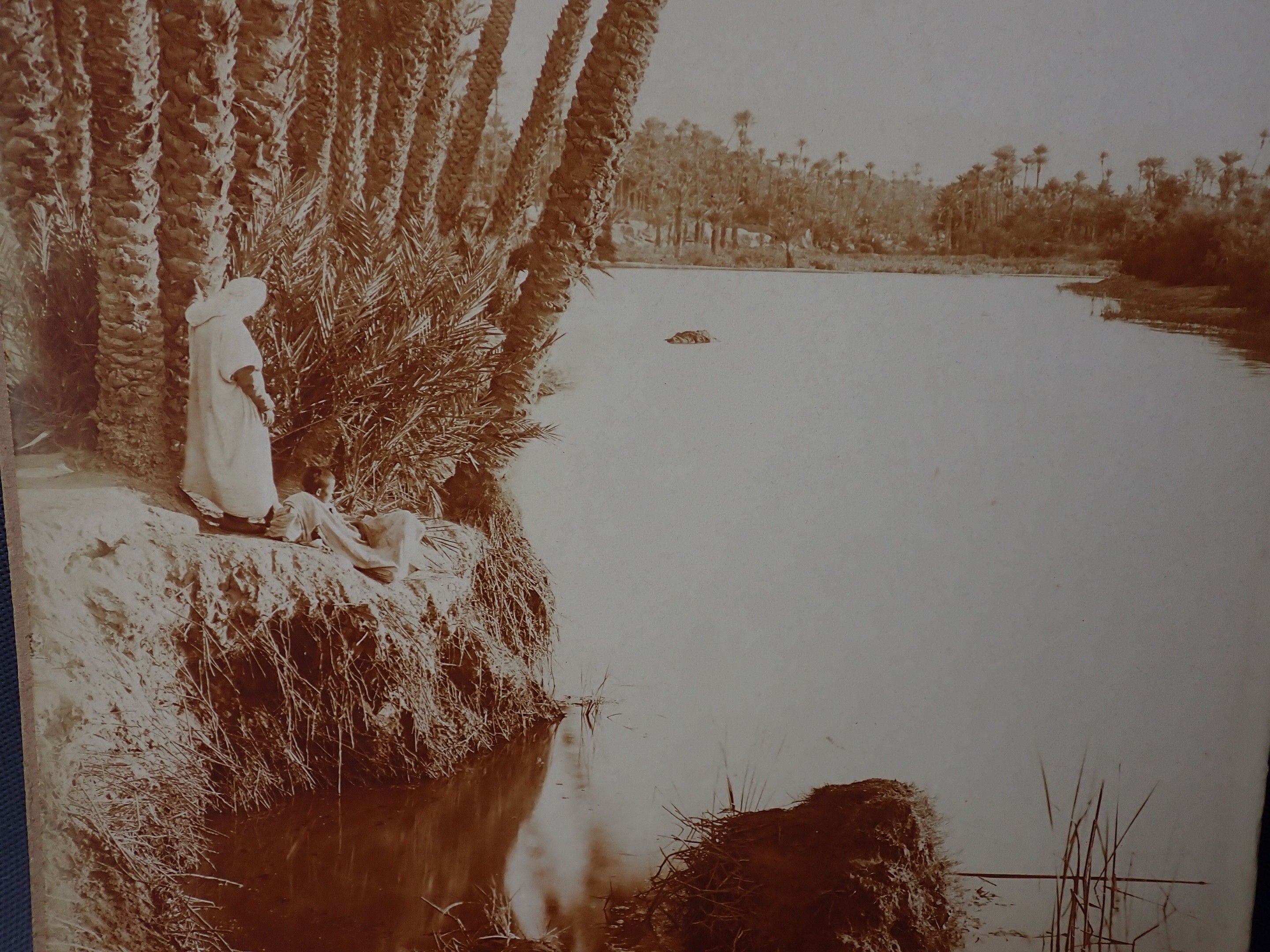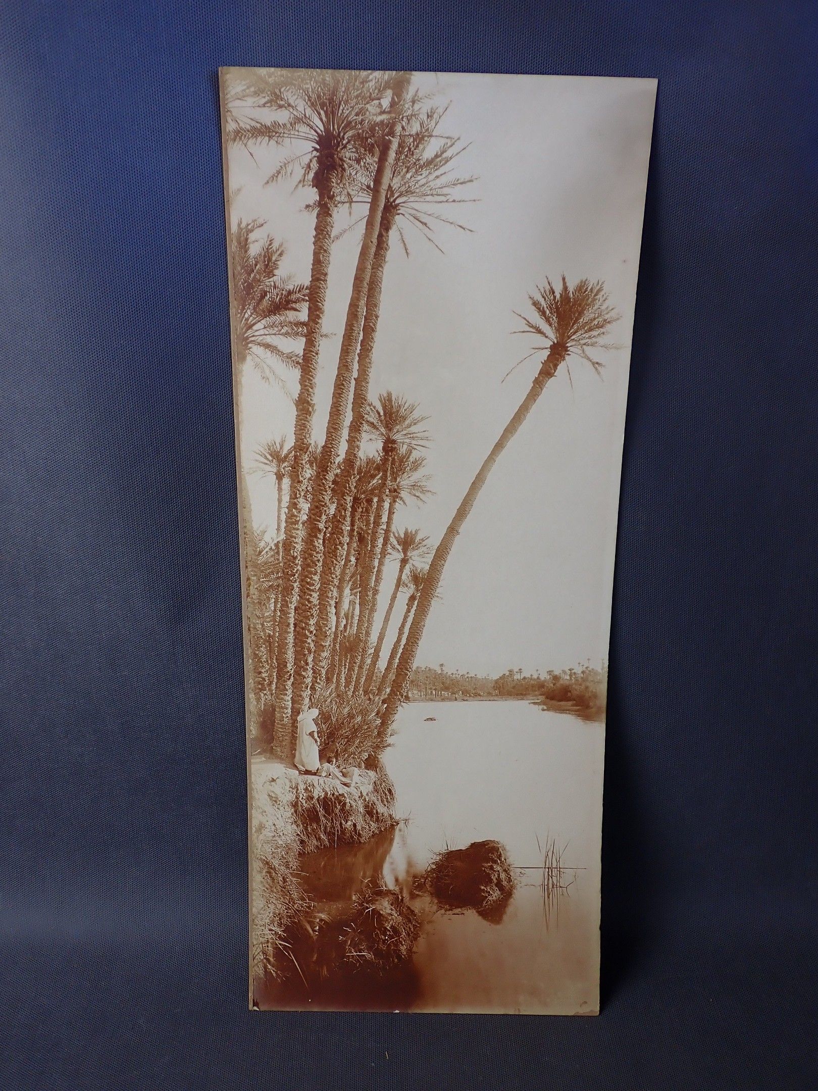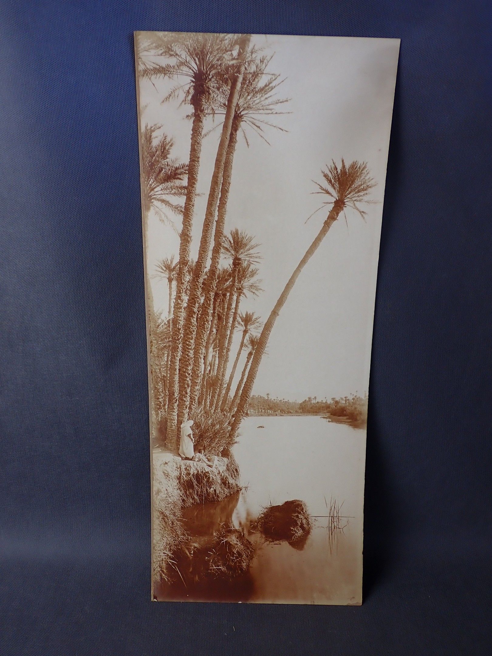 A photograph, pasted on cardboard, of an animated oriental landscape, with the stamp "A.BOUGAULT EDITEUR" 57 x 23 cm