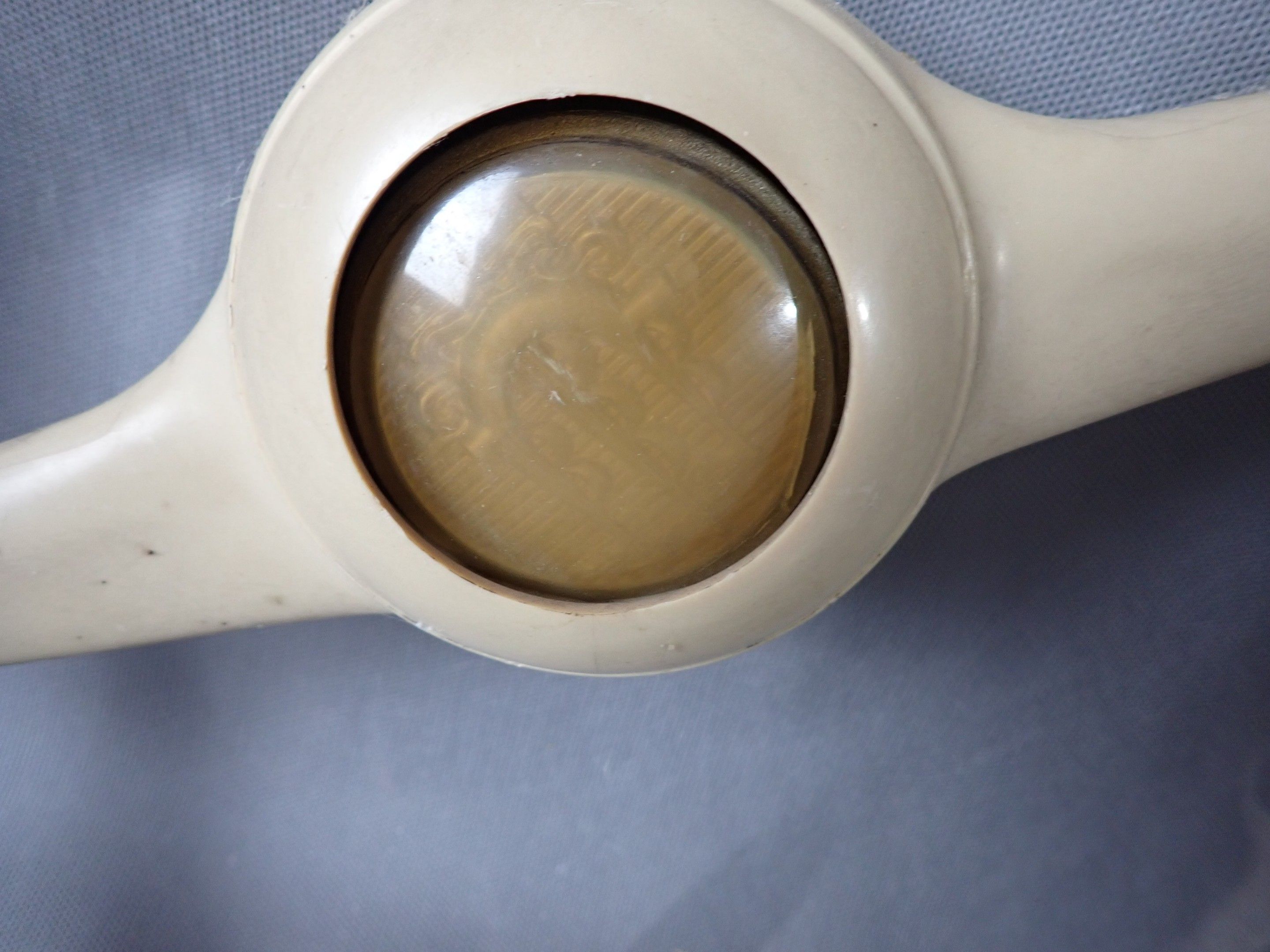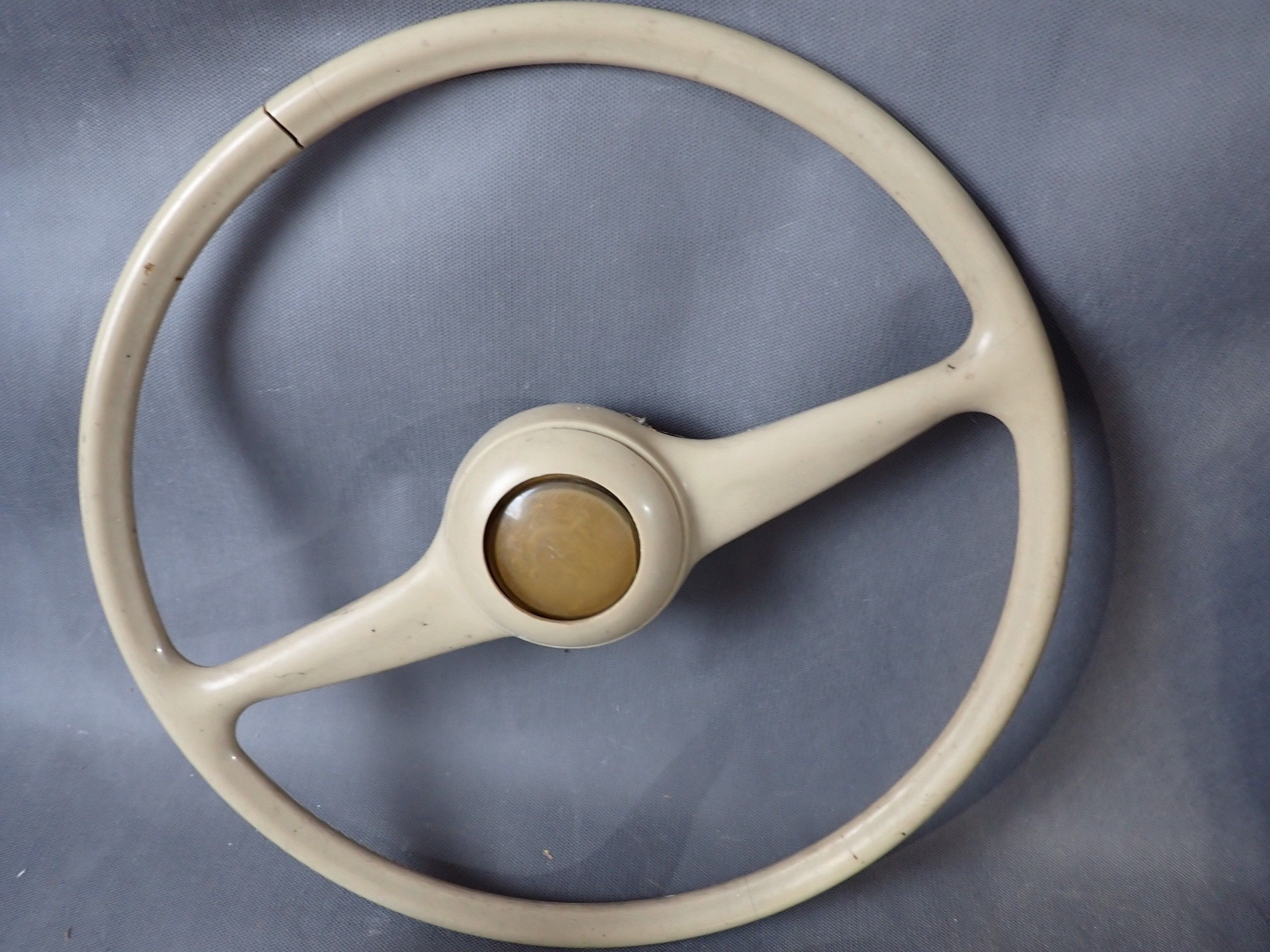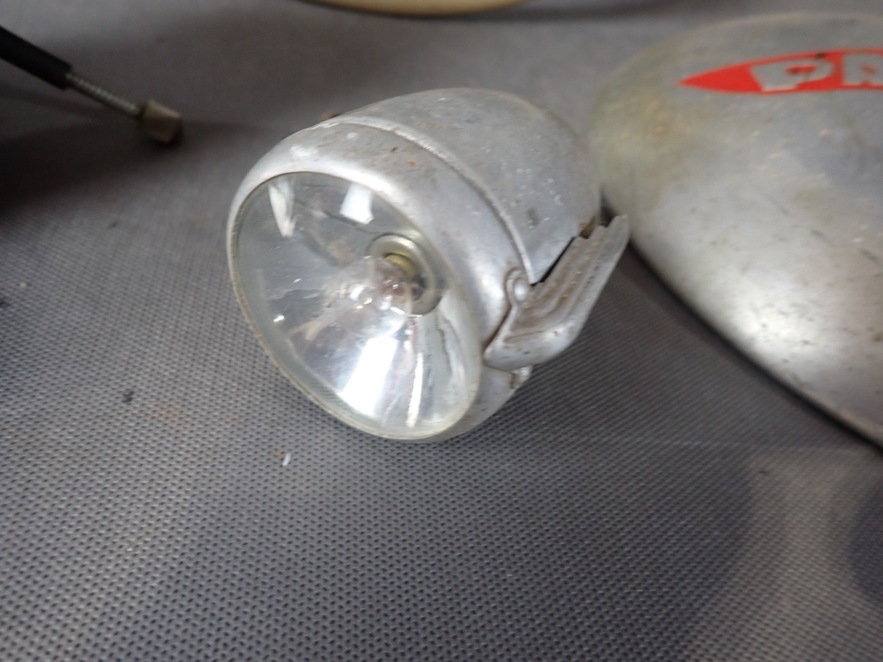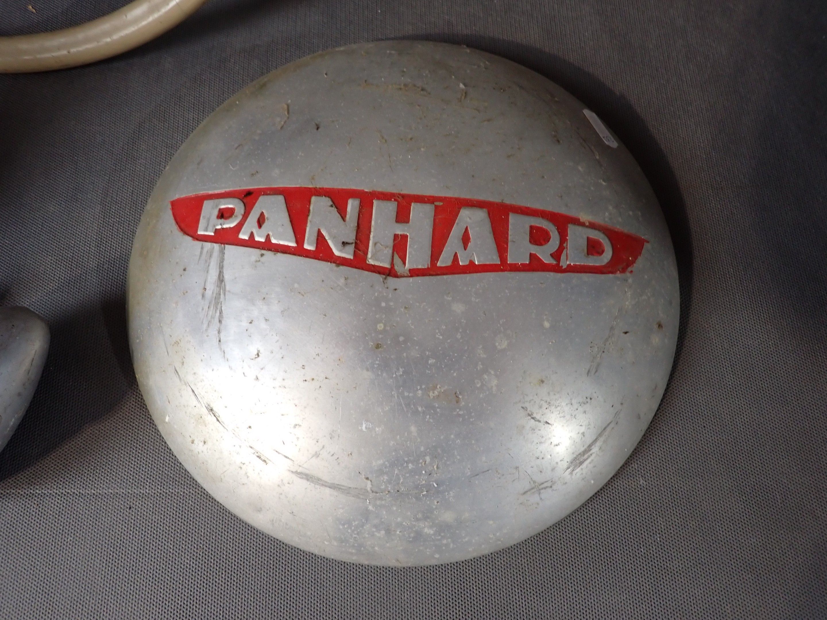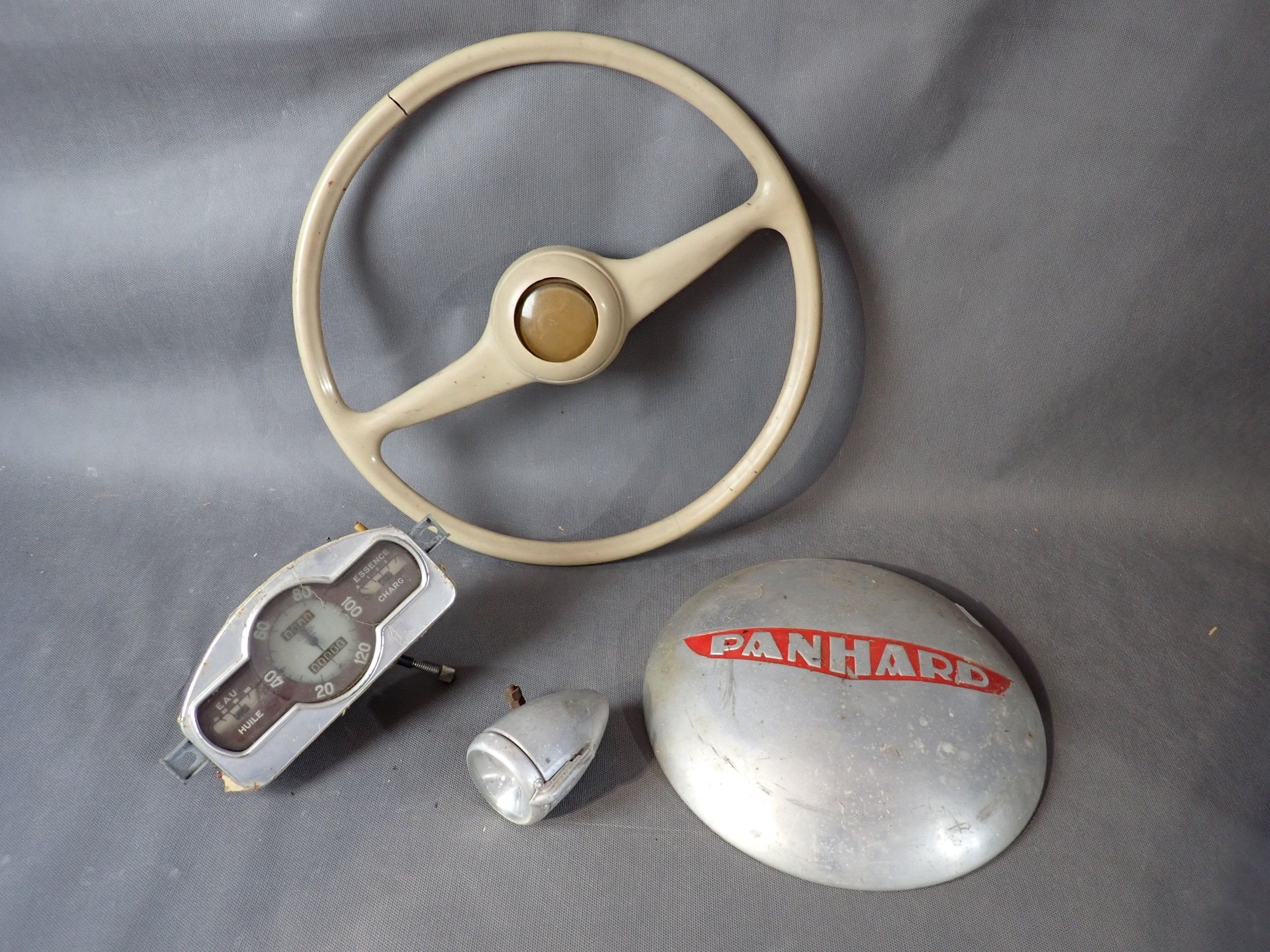 Lot including 1 panhard hubcap, 1 4cv speedo and 1 Renault steering wheel and 1 bicycle headlight