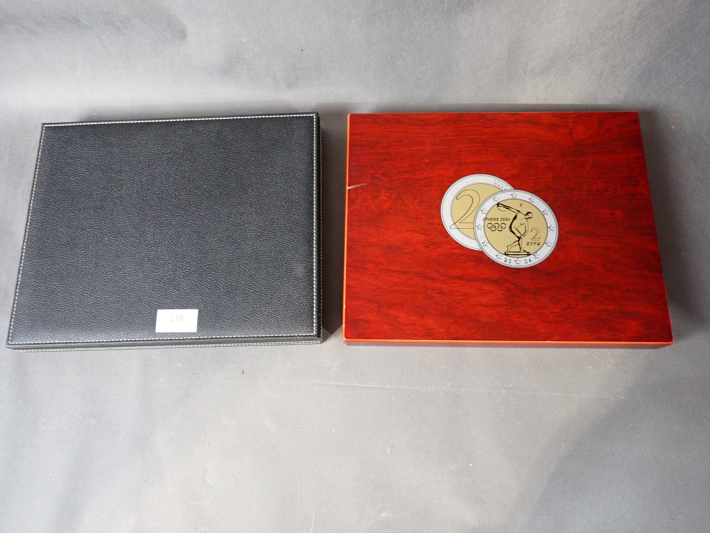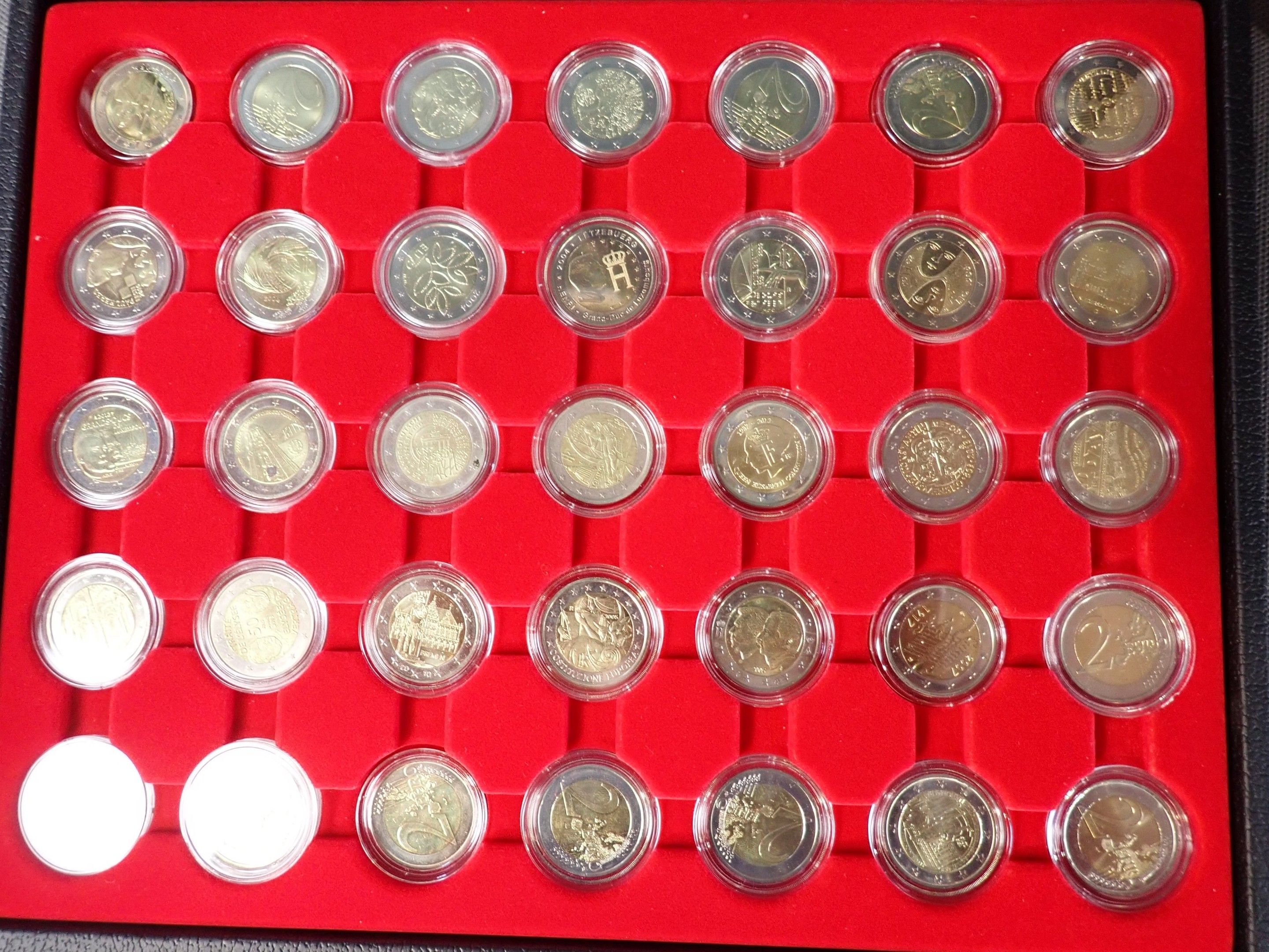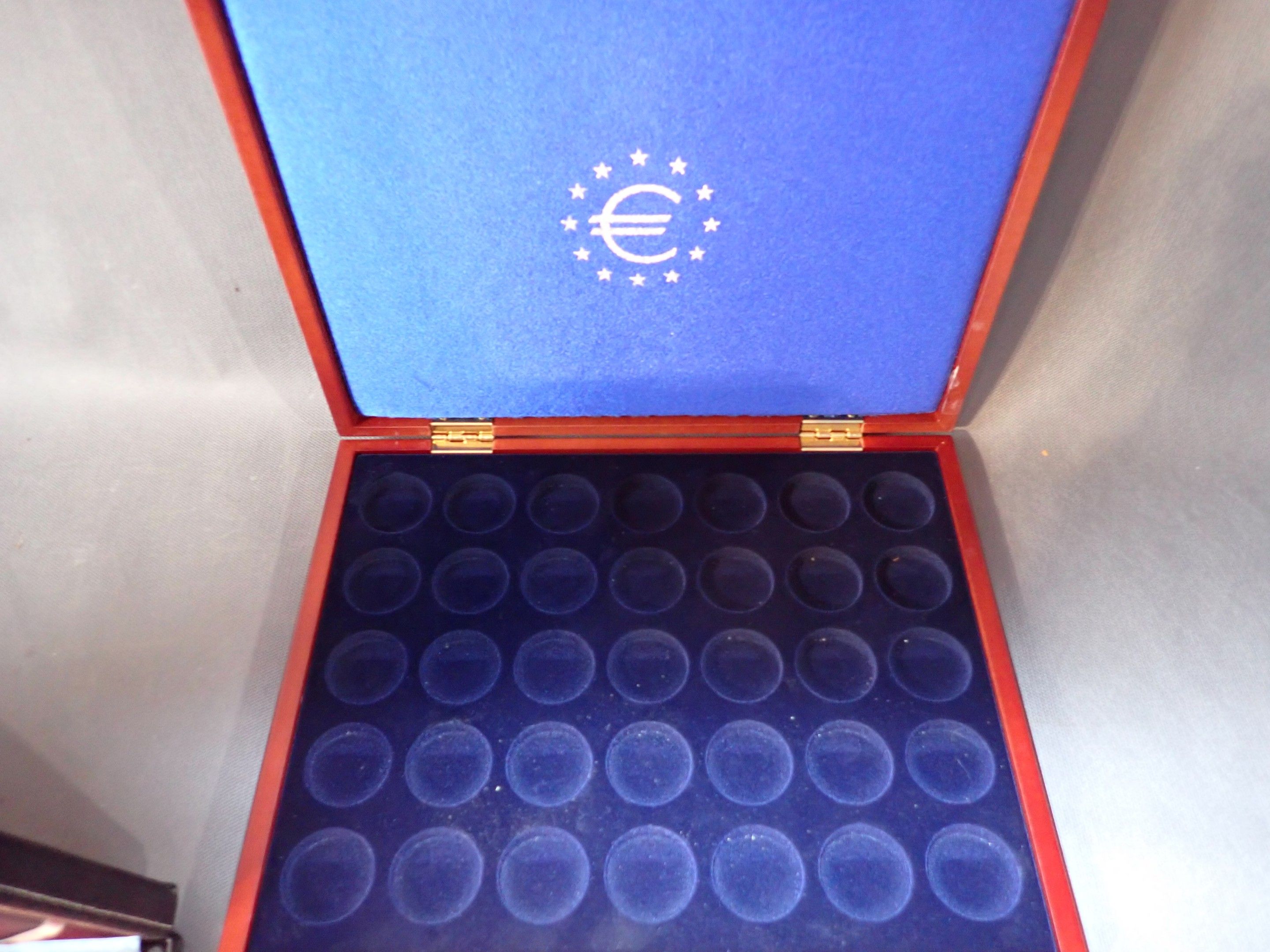 Box containing 35 2-euro coins. An empty box is enclosed.