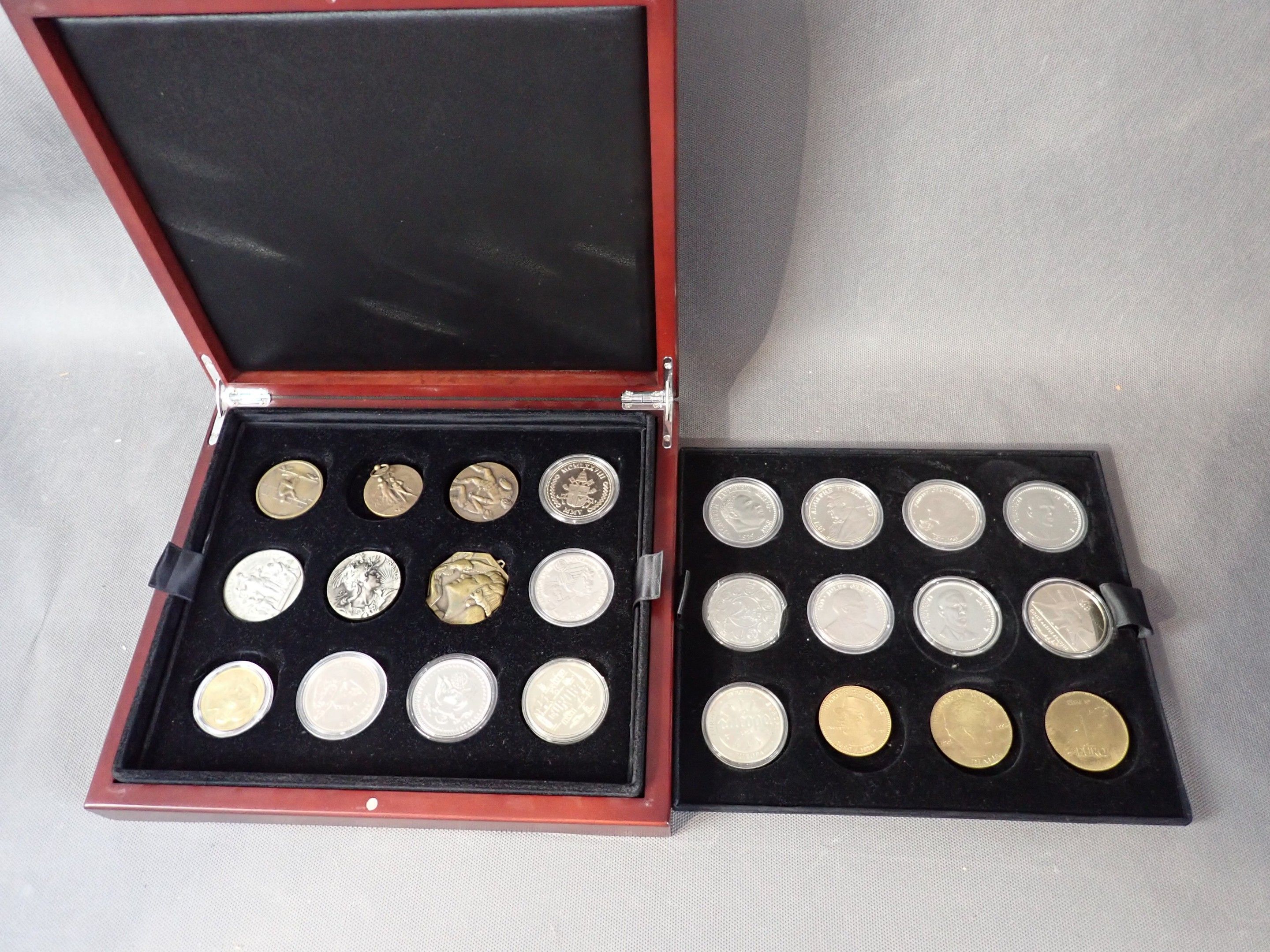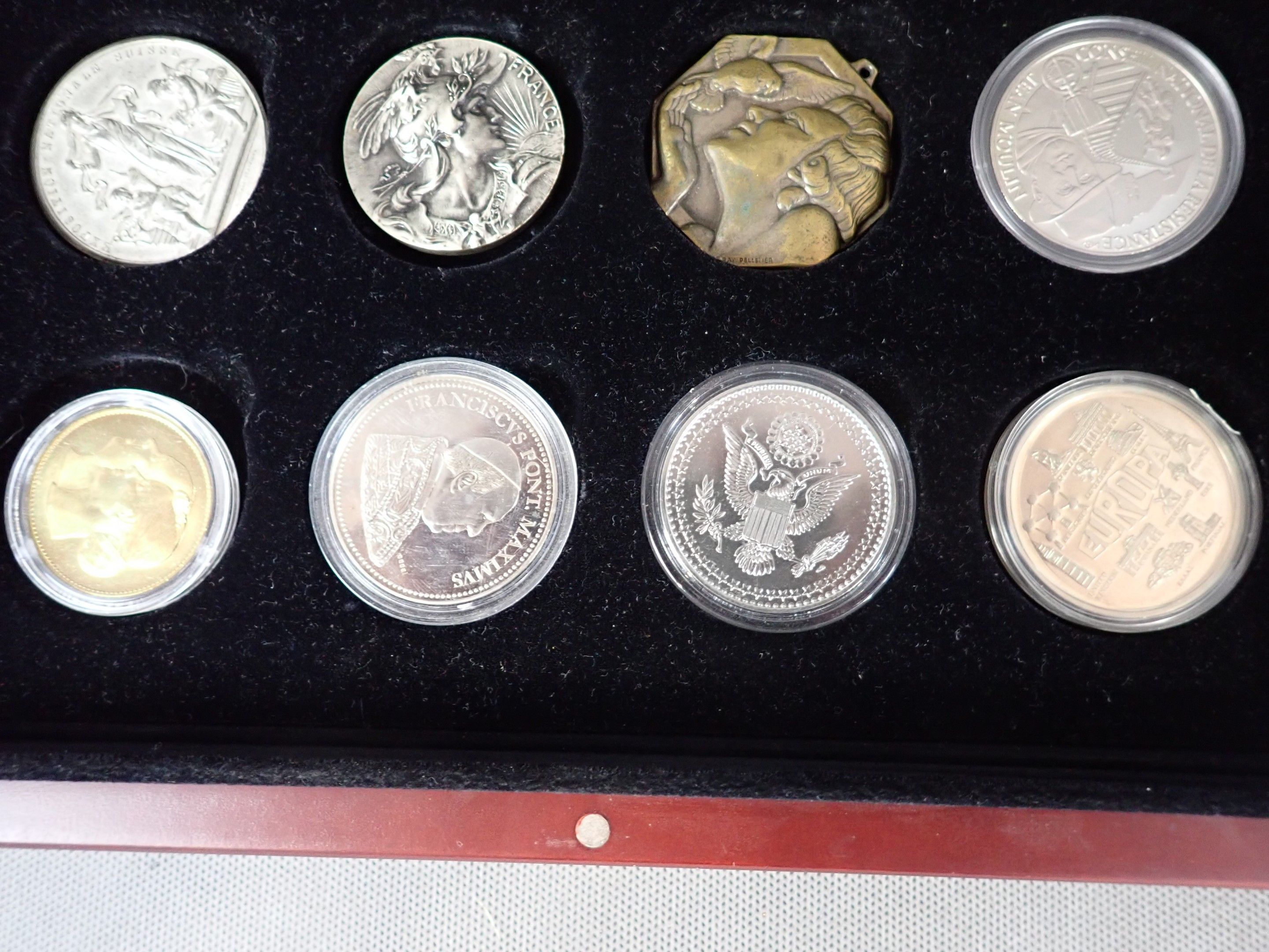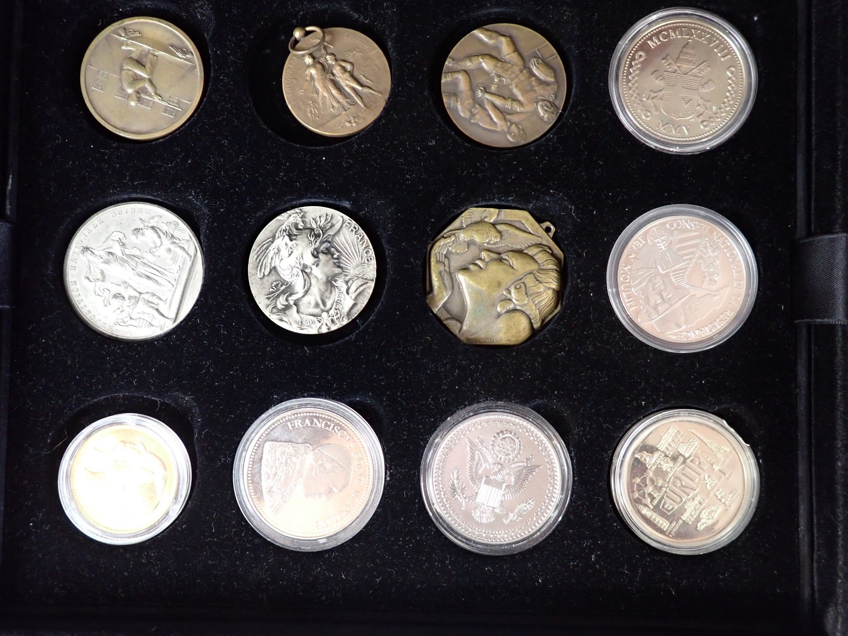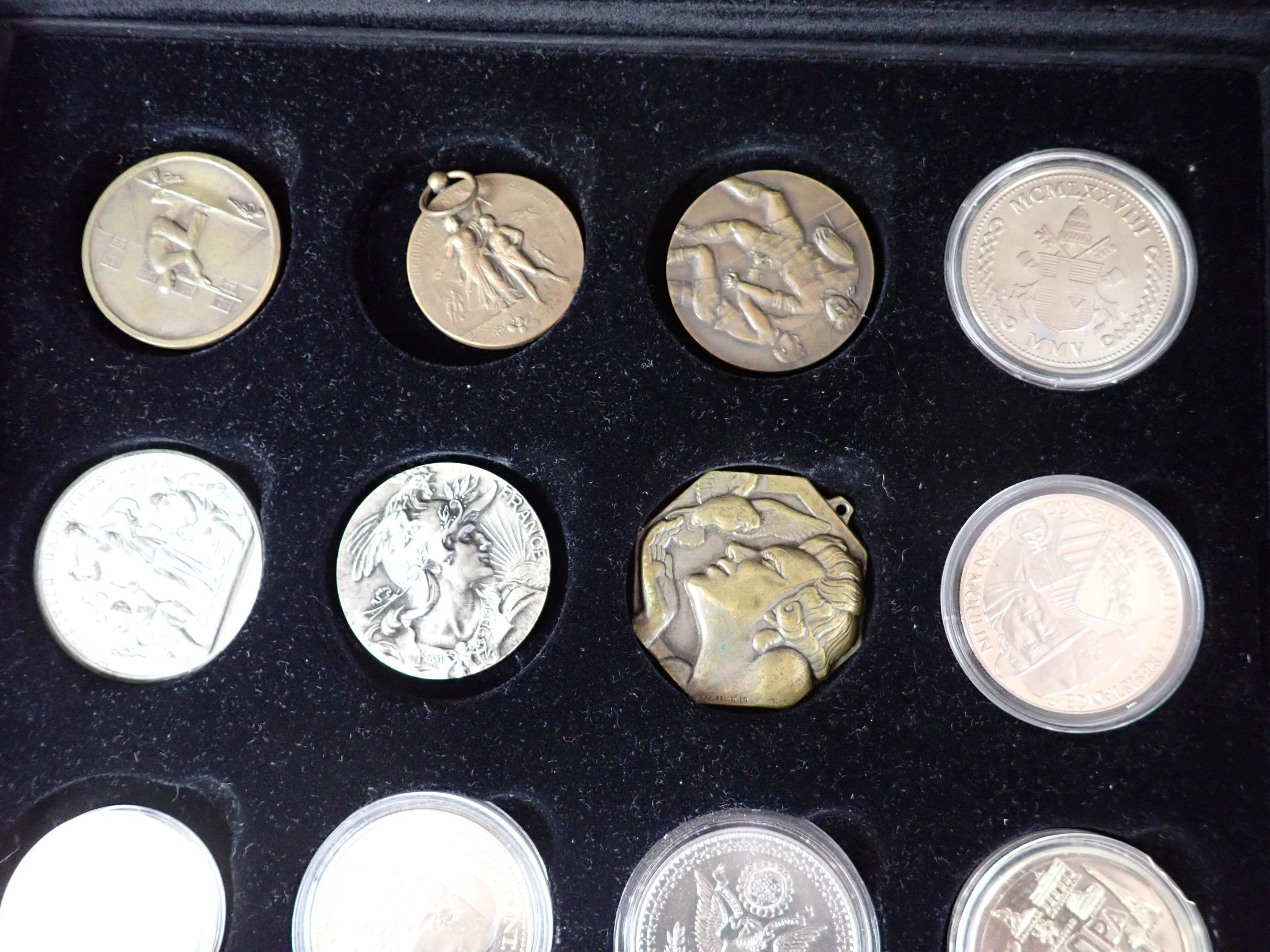 Box of 35 medals on 3 trays, base metals