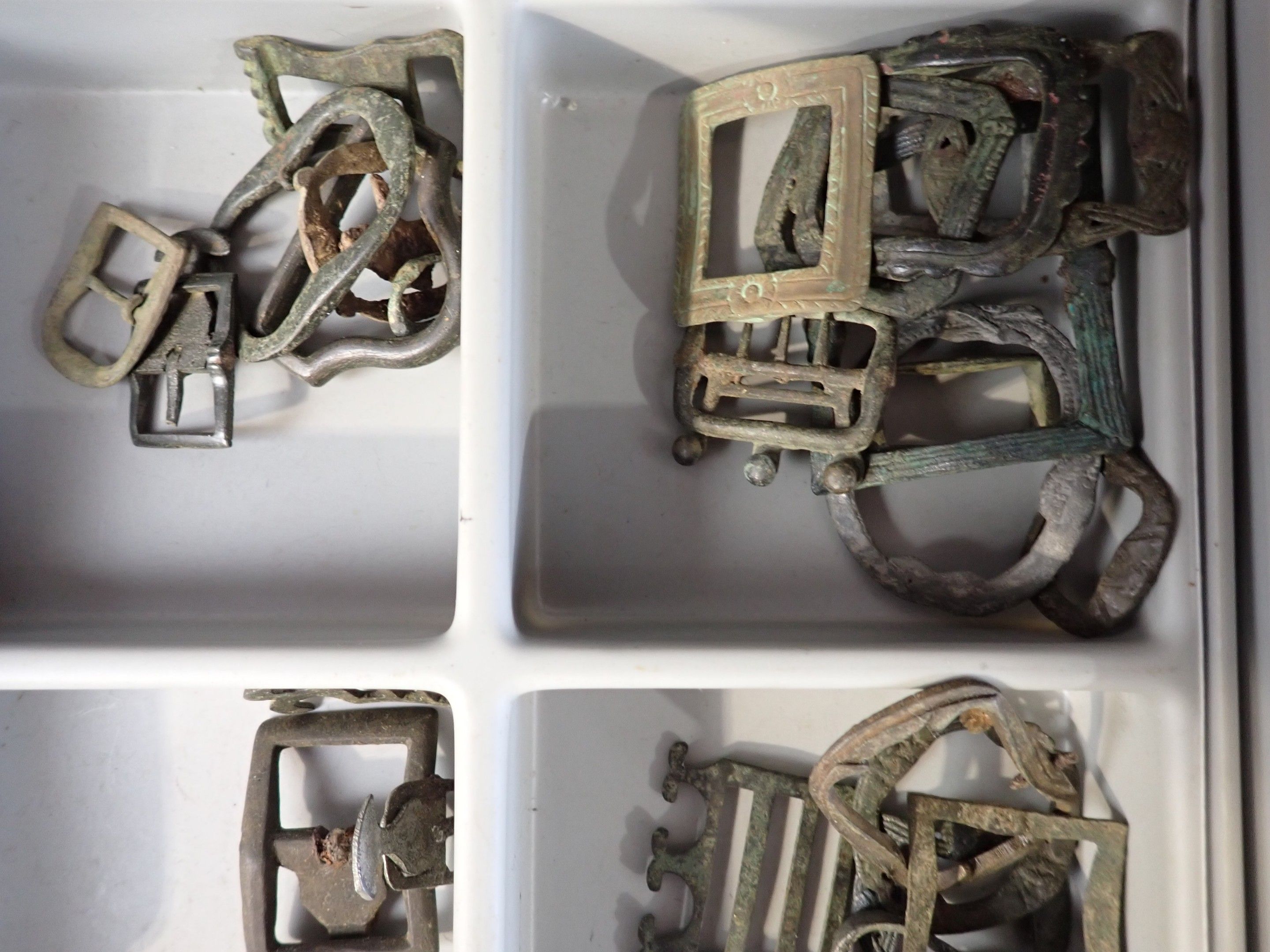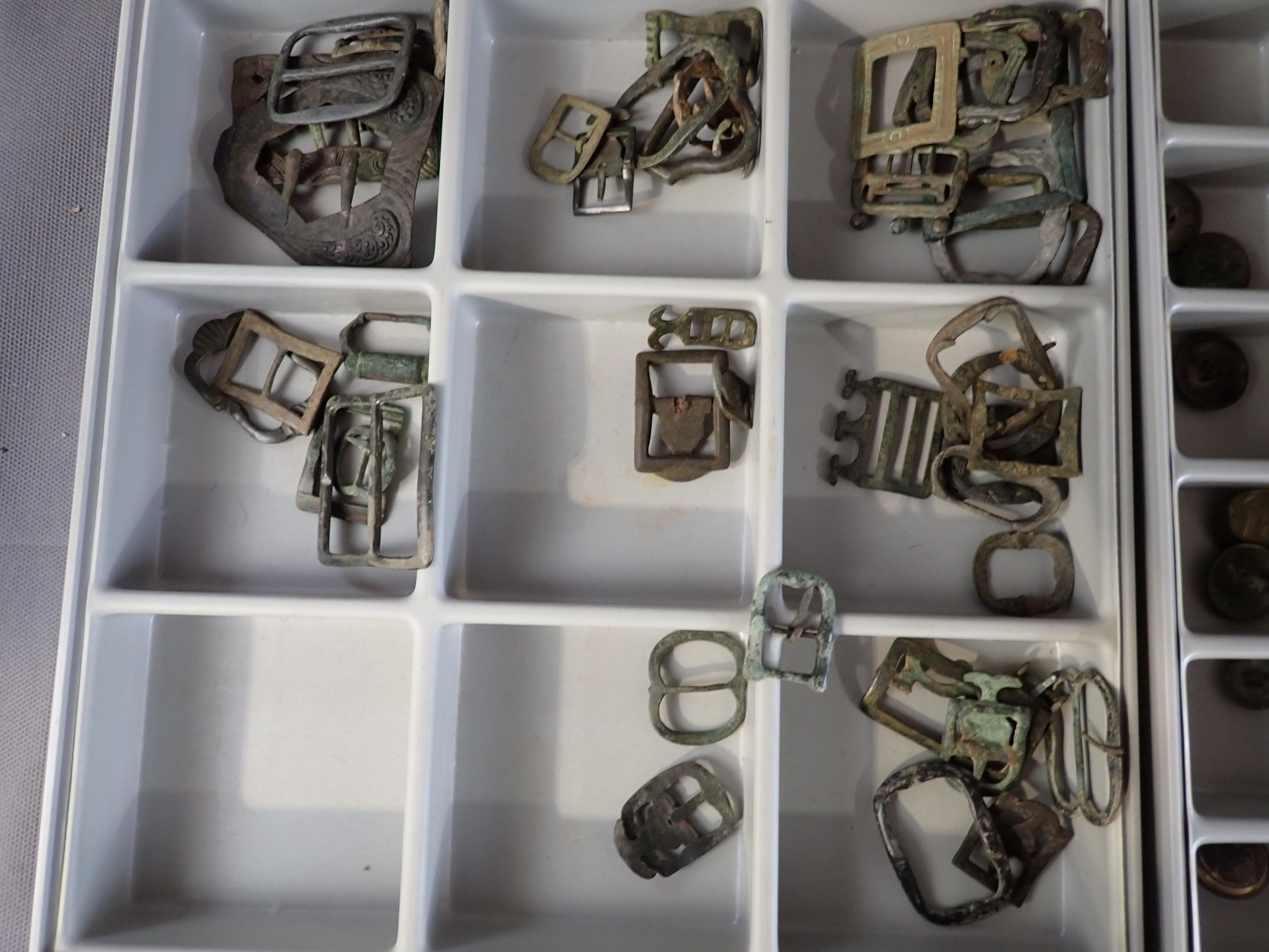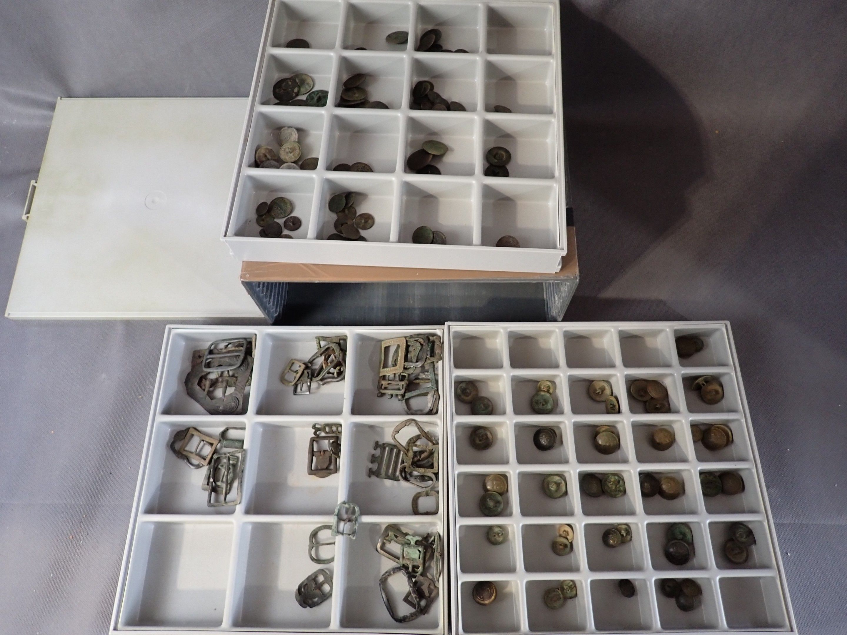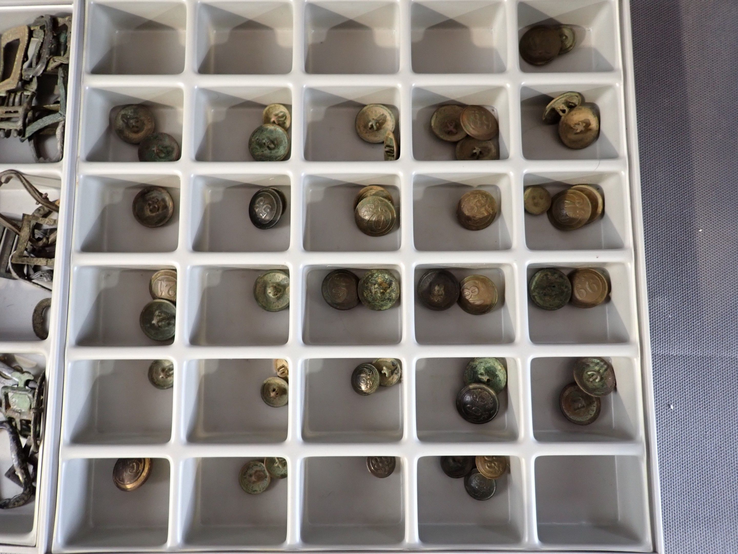 Box 4 trays containing a bulk of bulging uniform buttons with regiment numbers (XIXth) second empire with eagle and french republic old regime, as well as belt buckles.