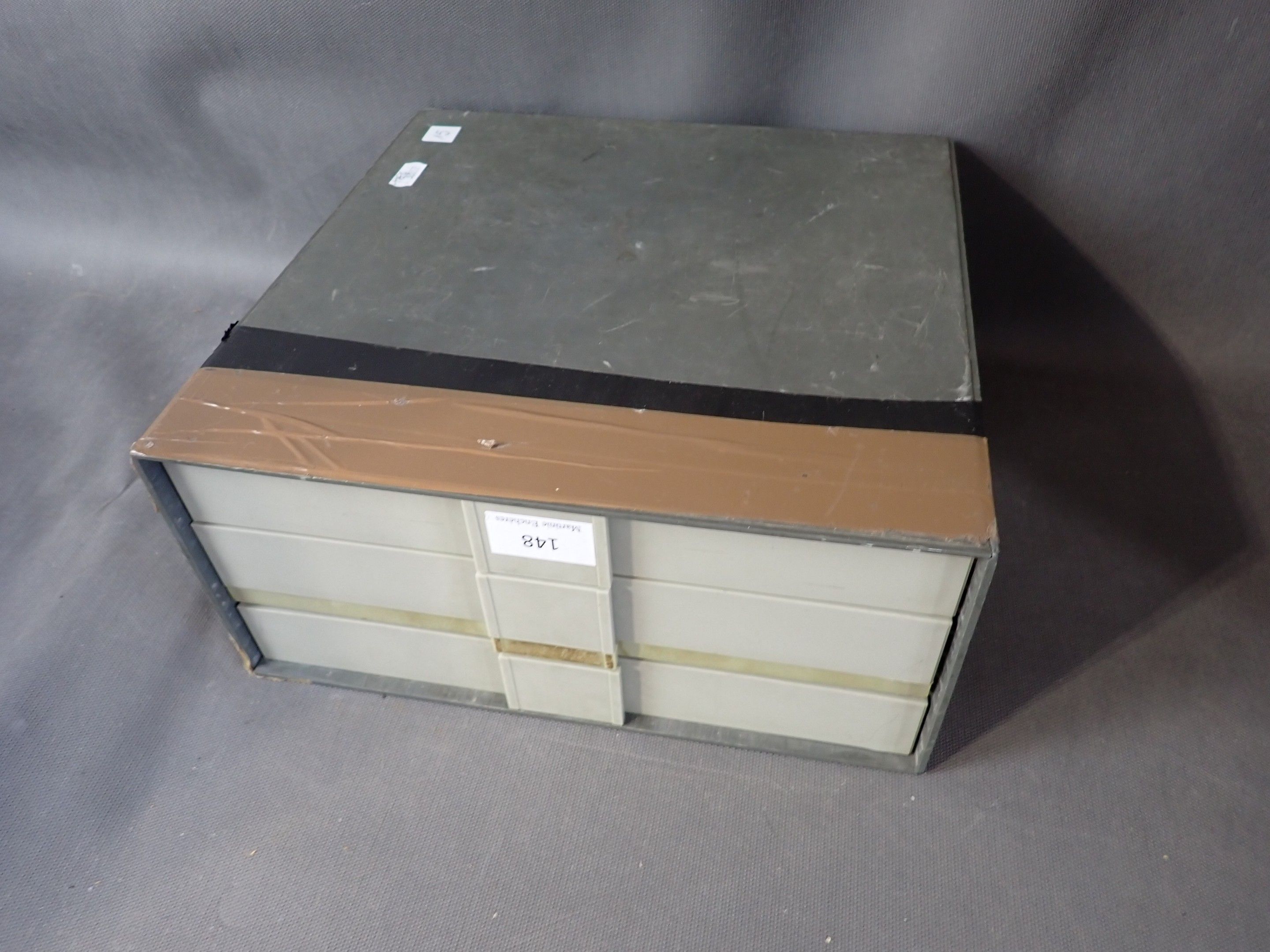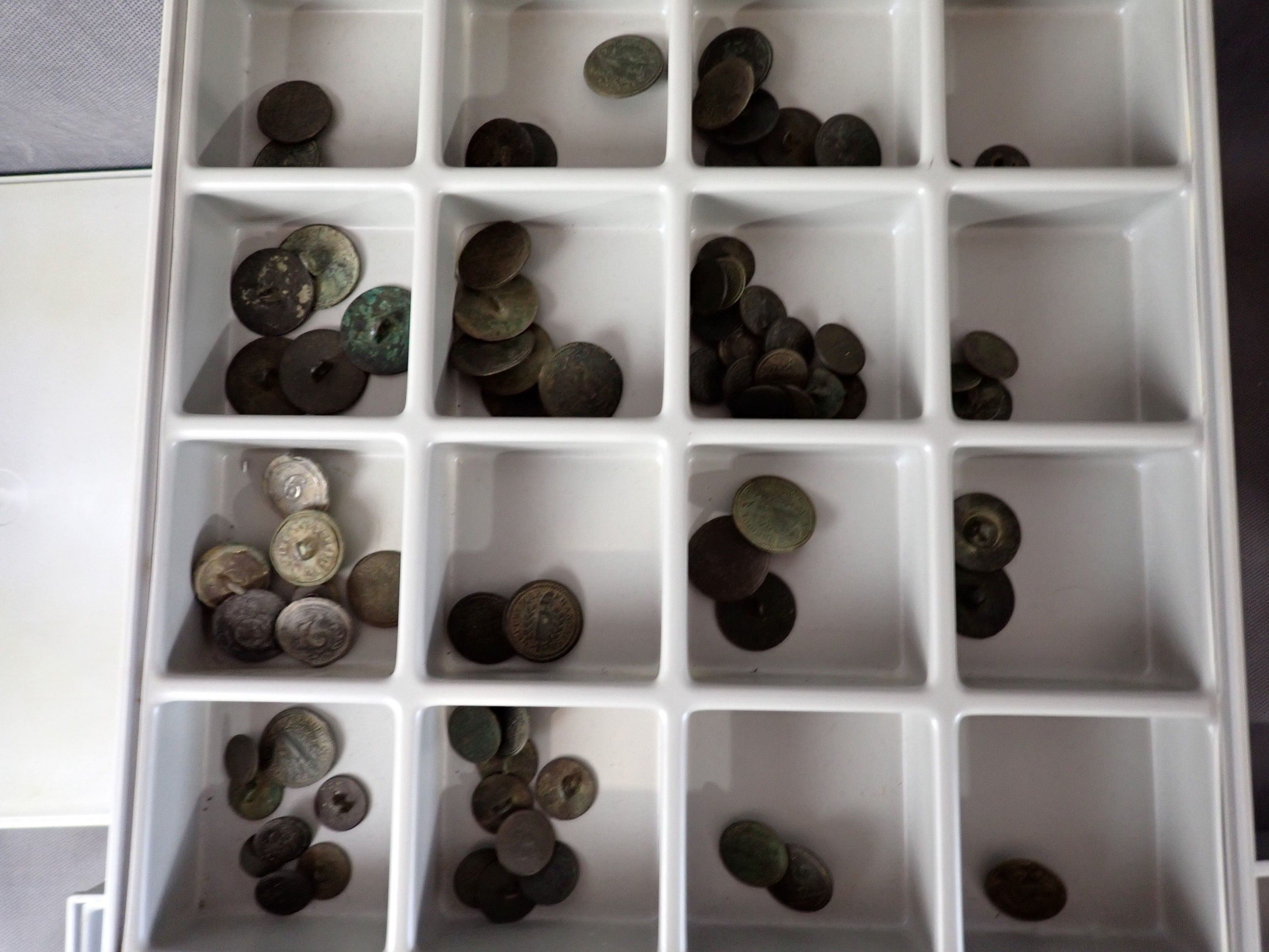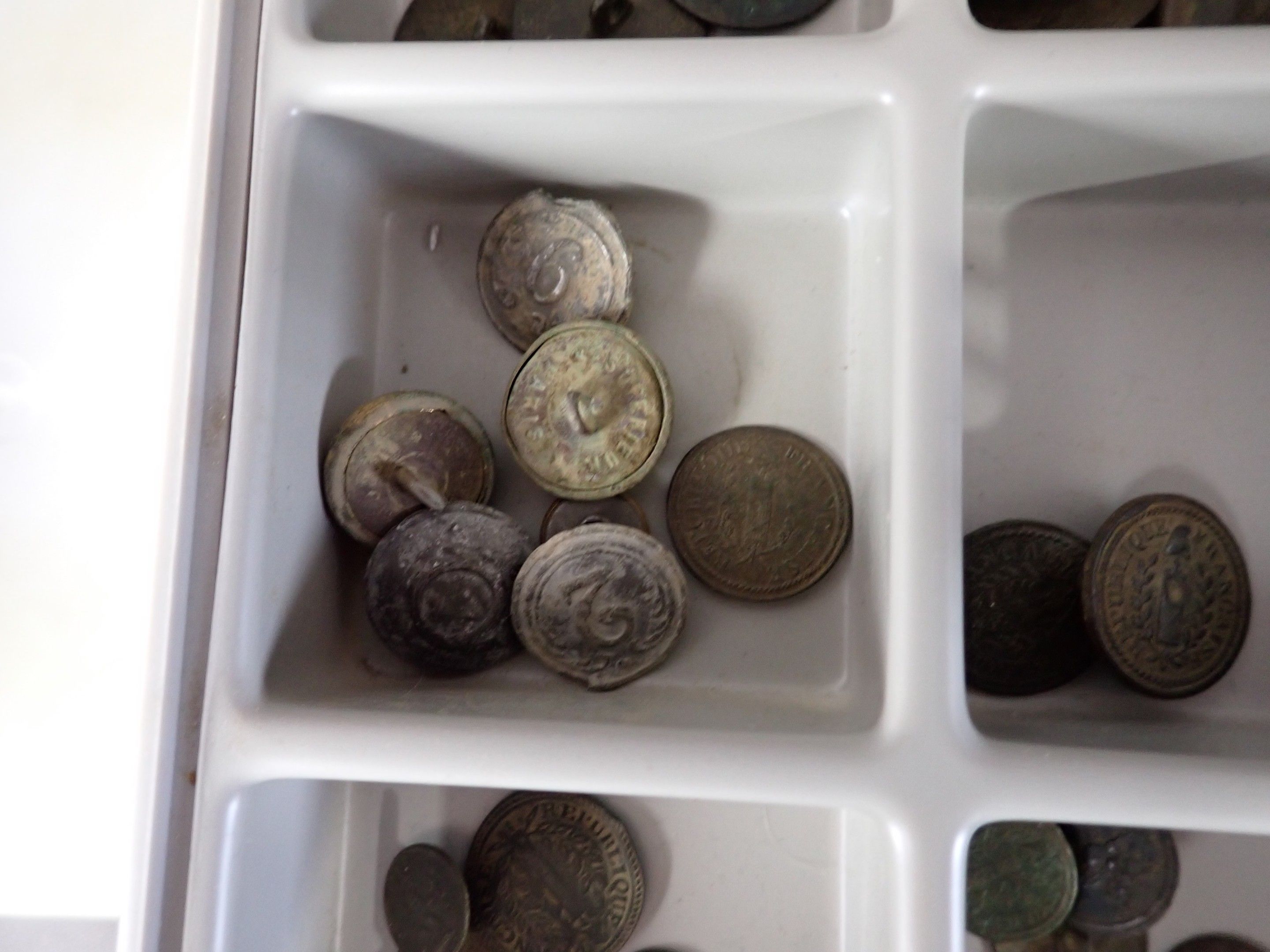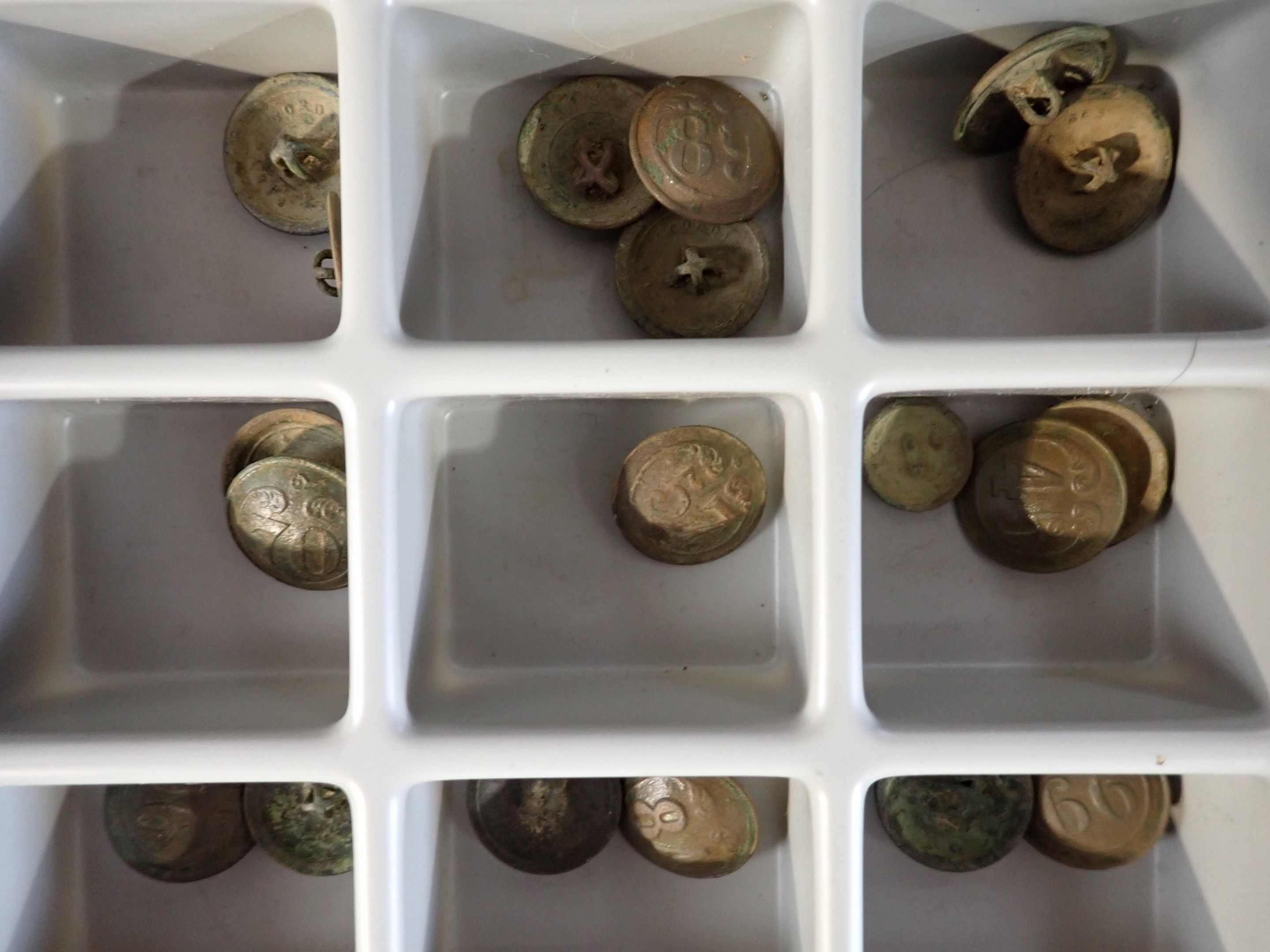 Box 4 trays containing a bulk of bulging uniform buttons wit…