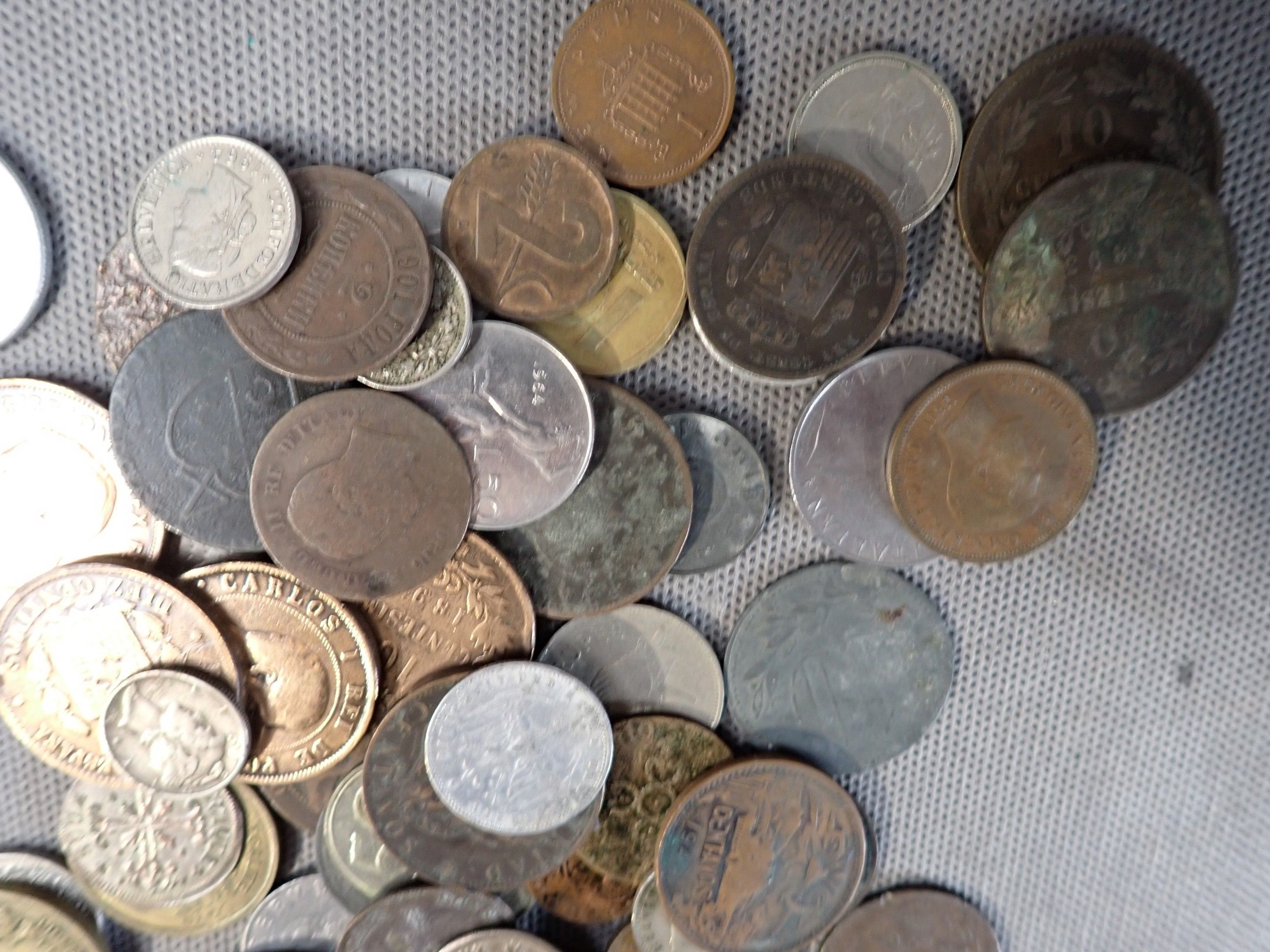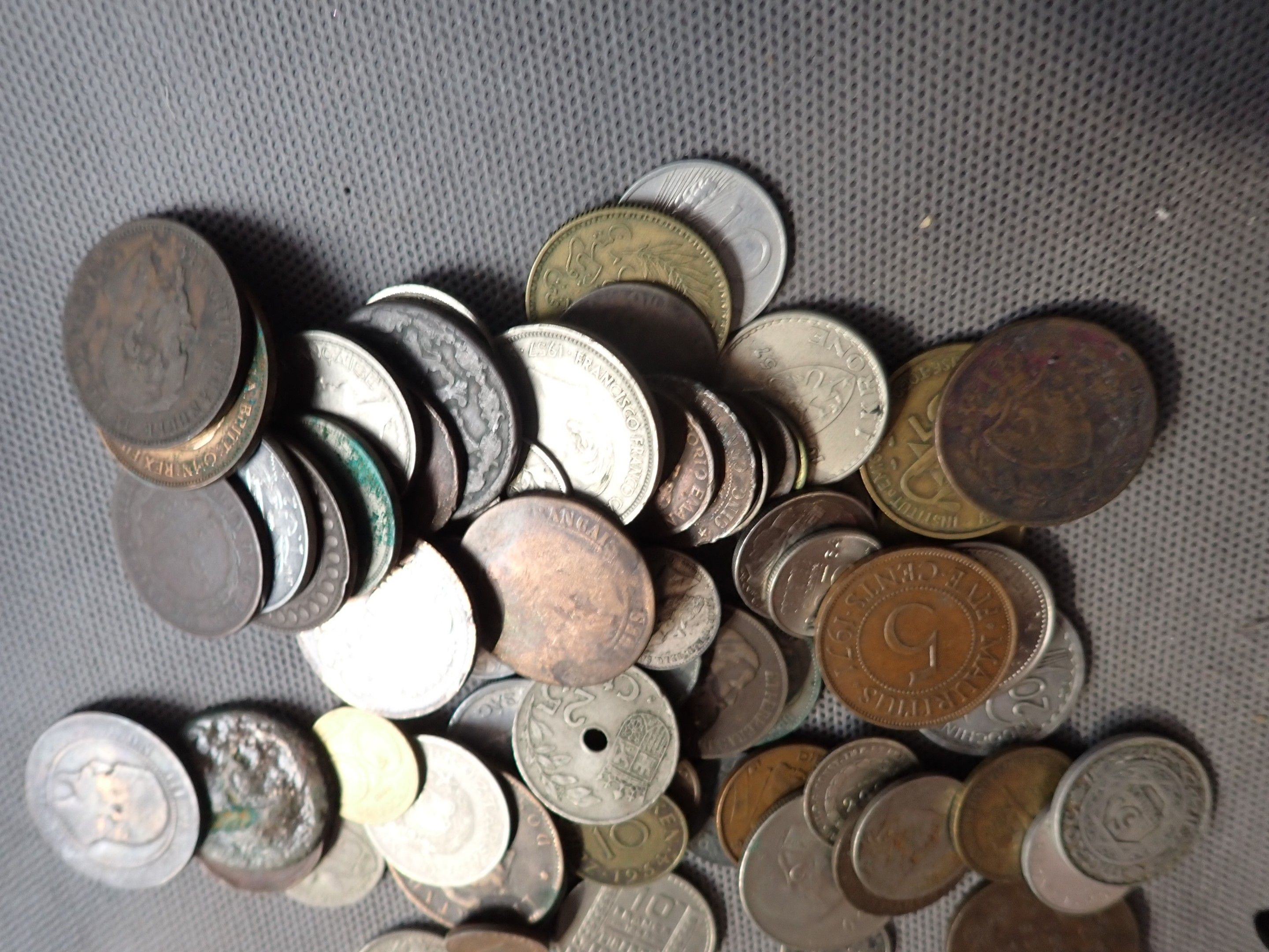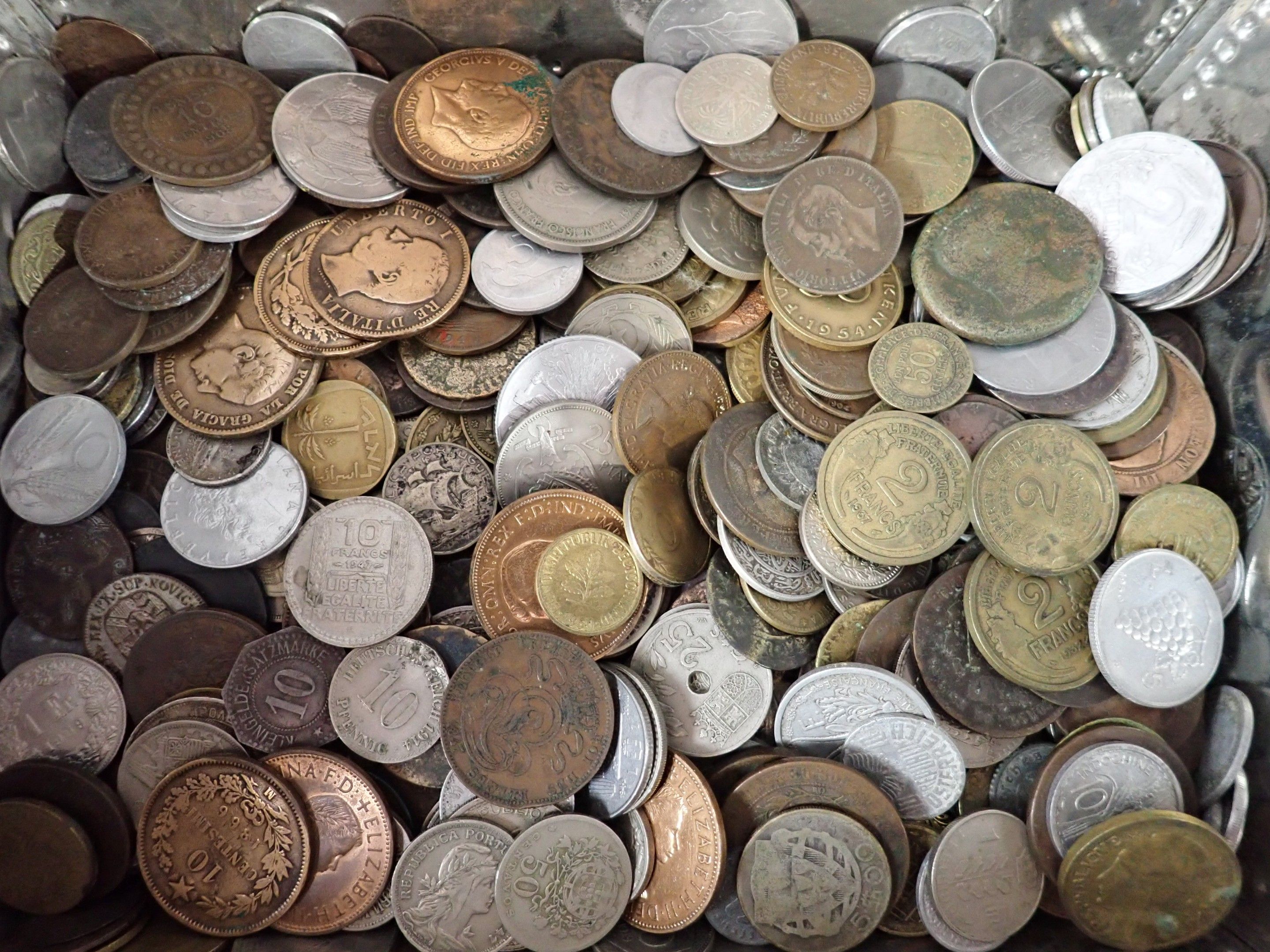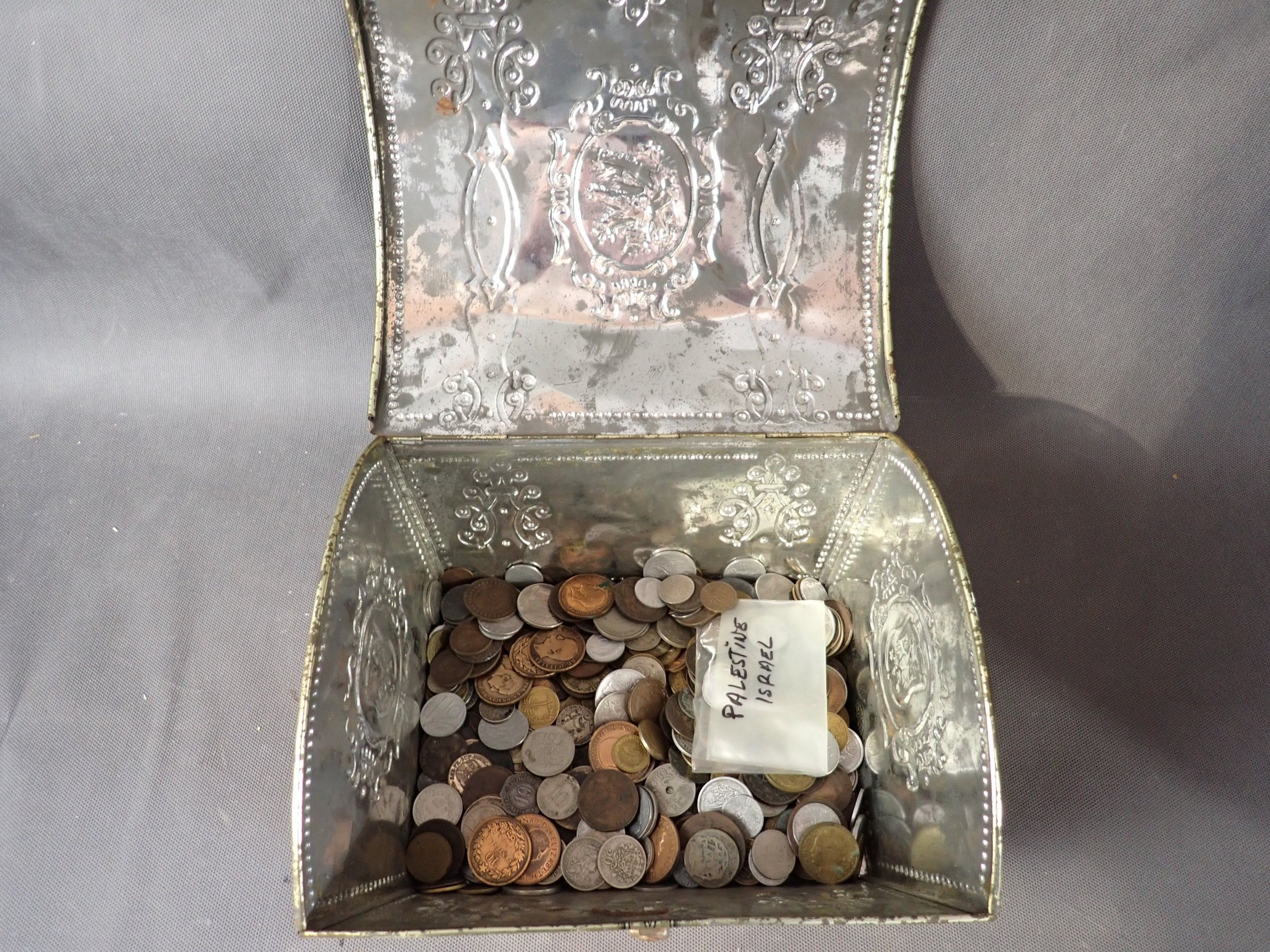 A metal case containing a bulk of foreign coins