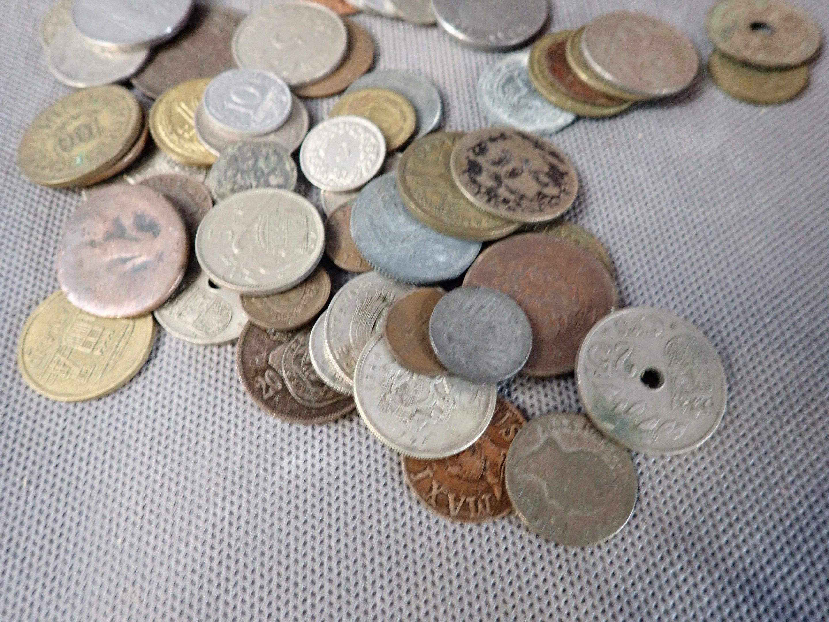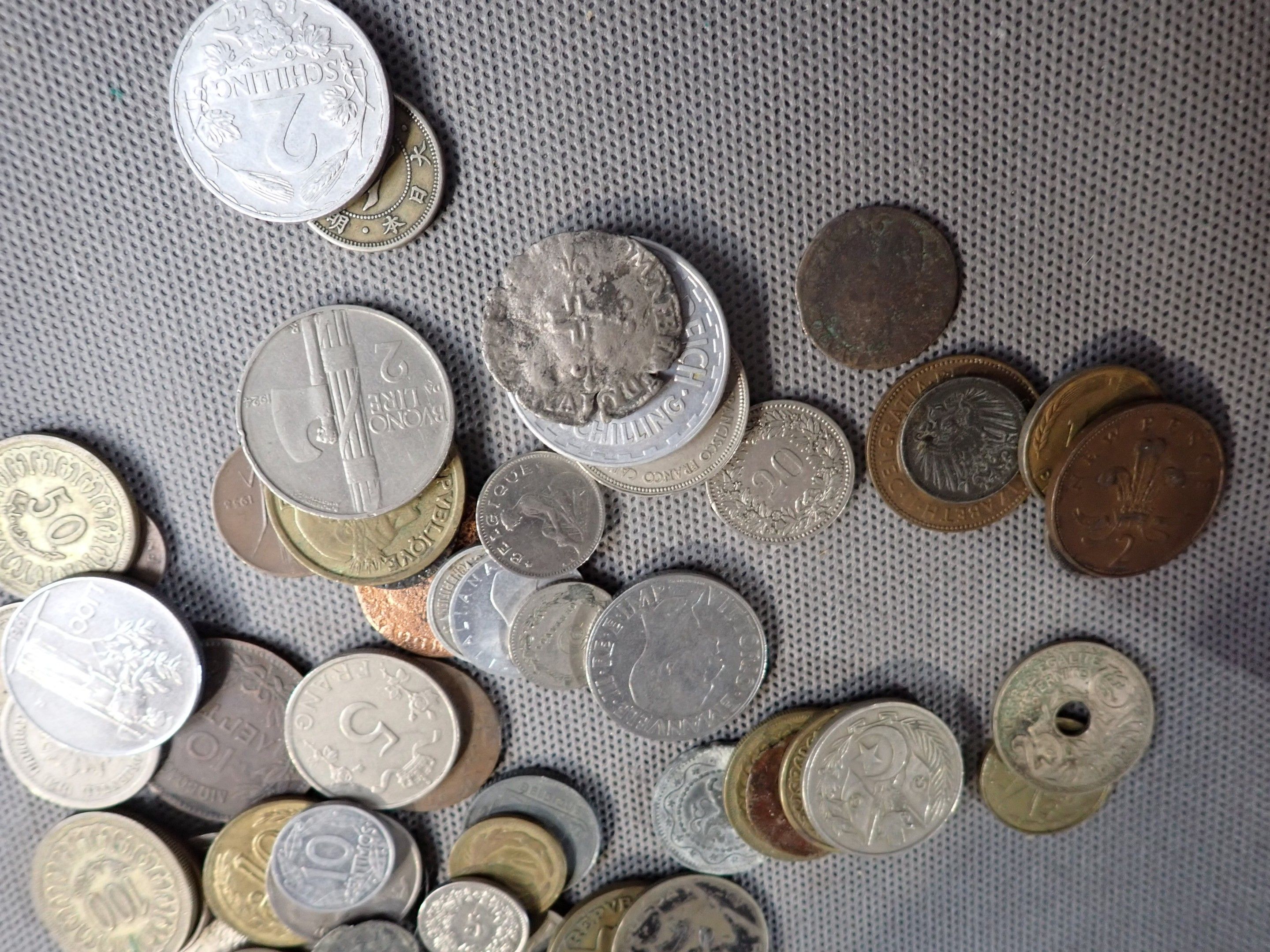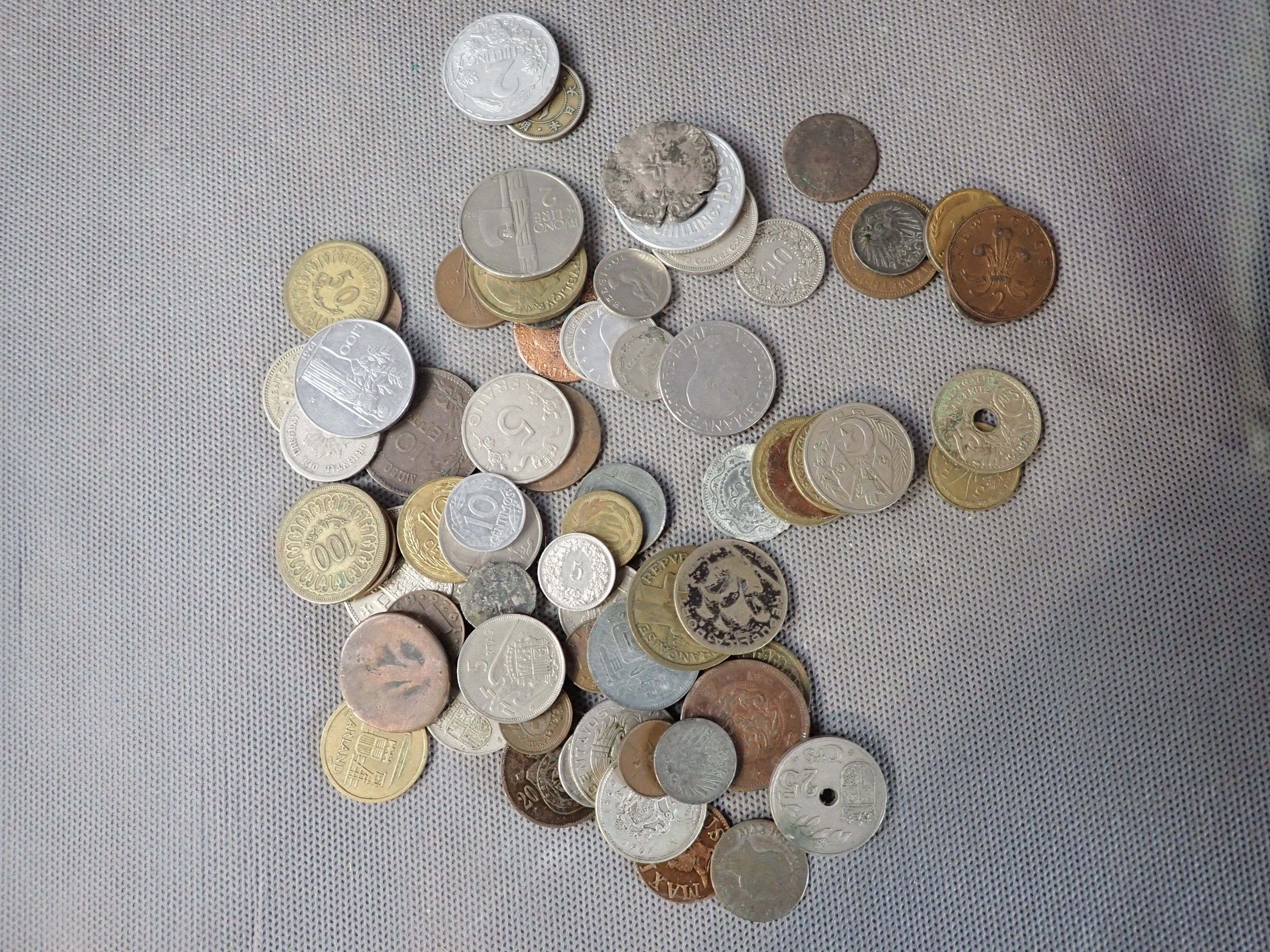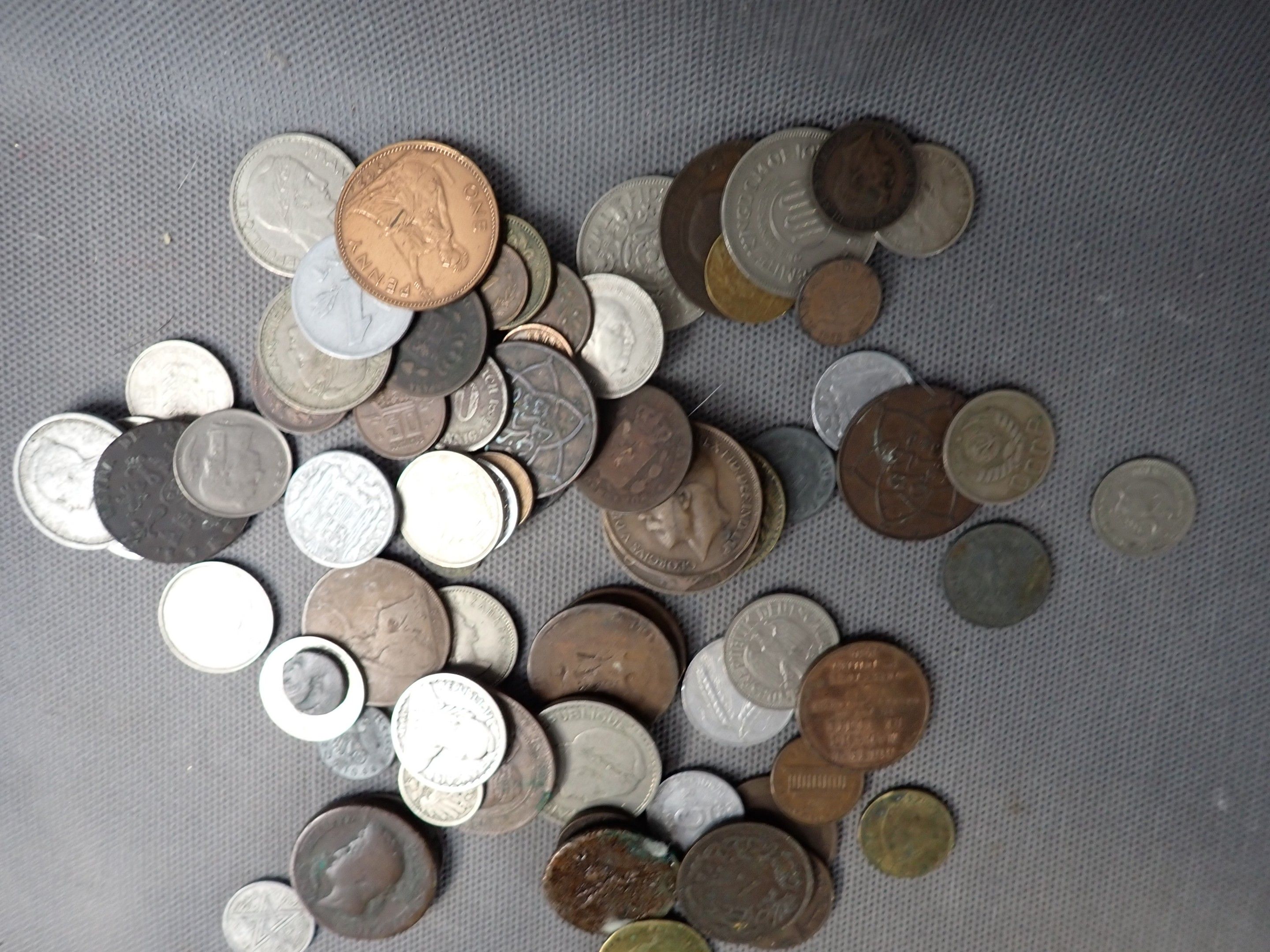 A metal case containing a bulk of foreign coins