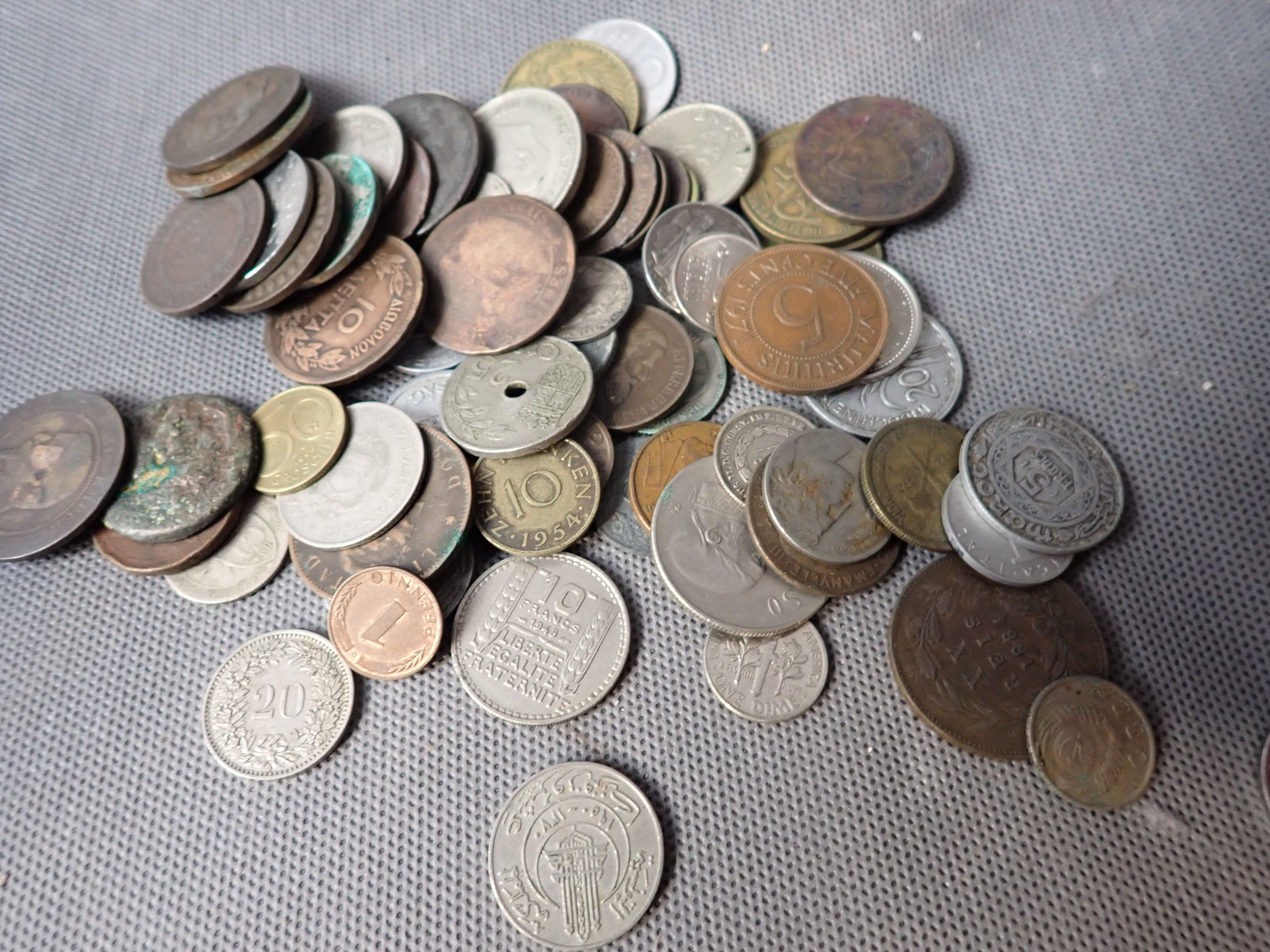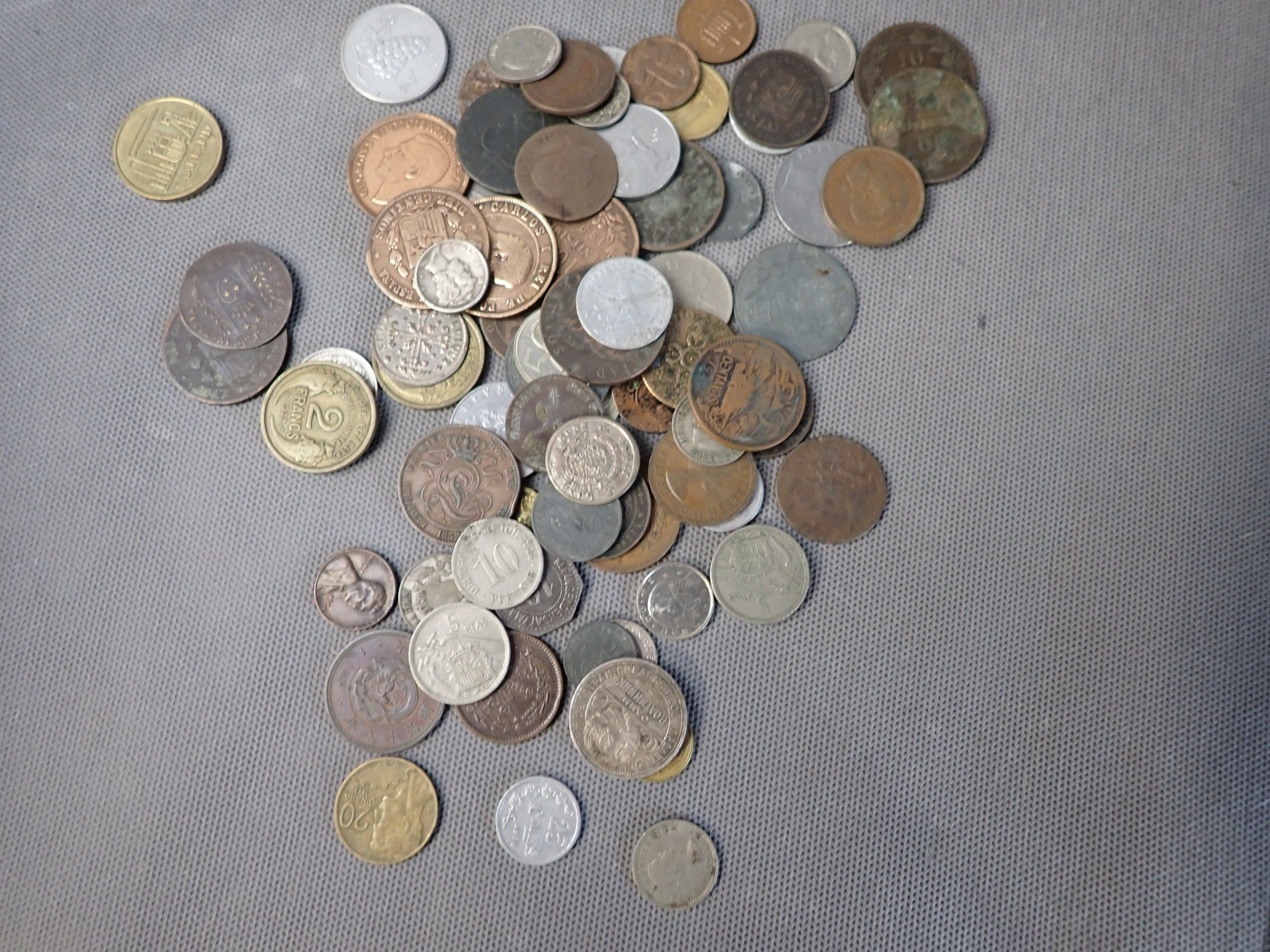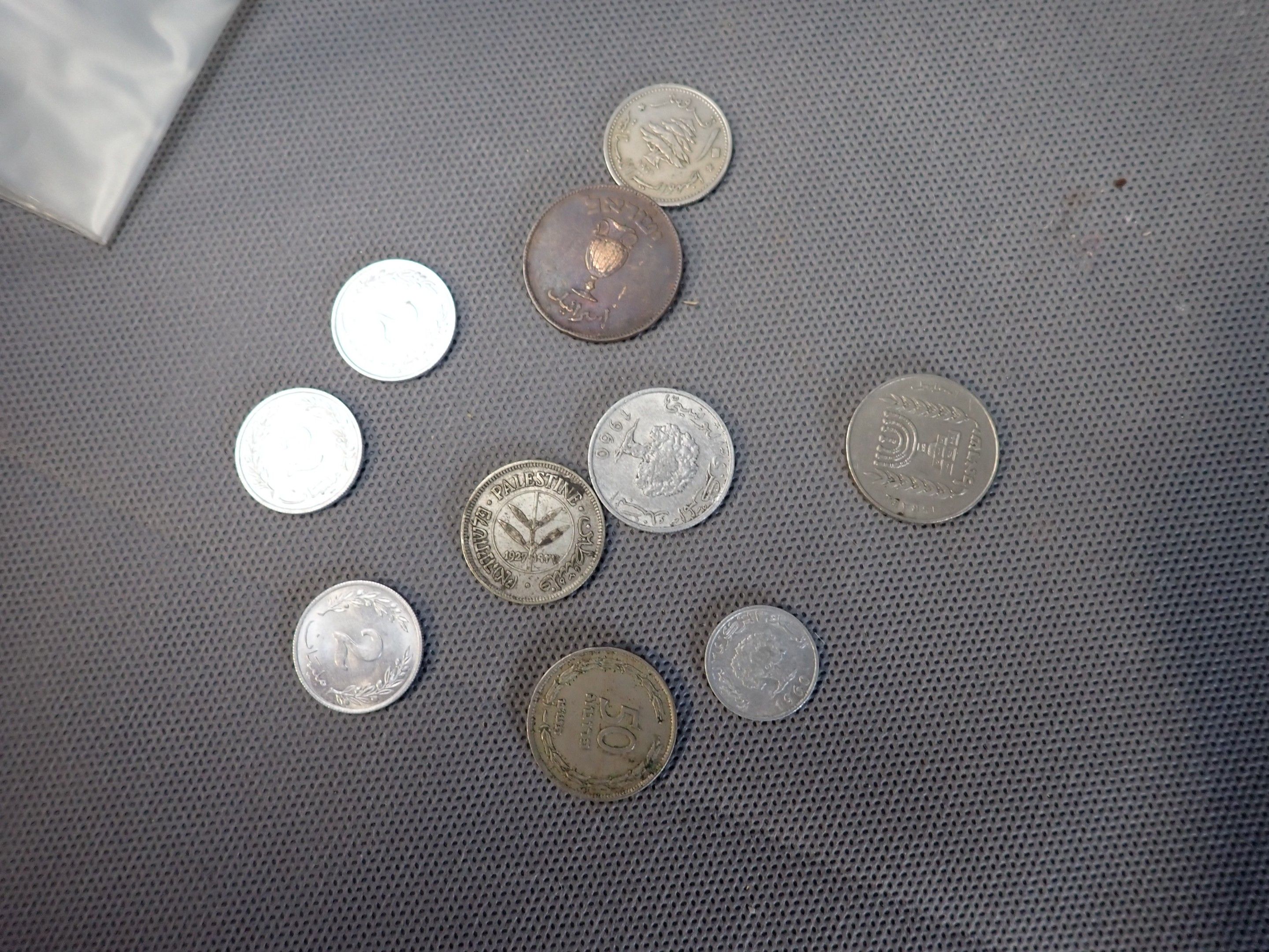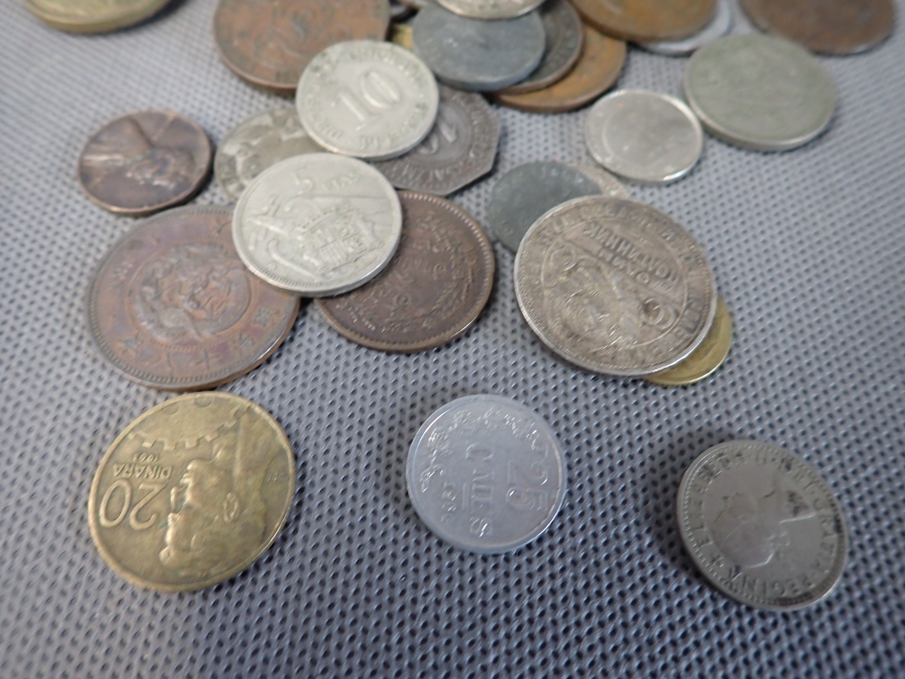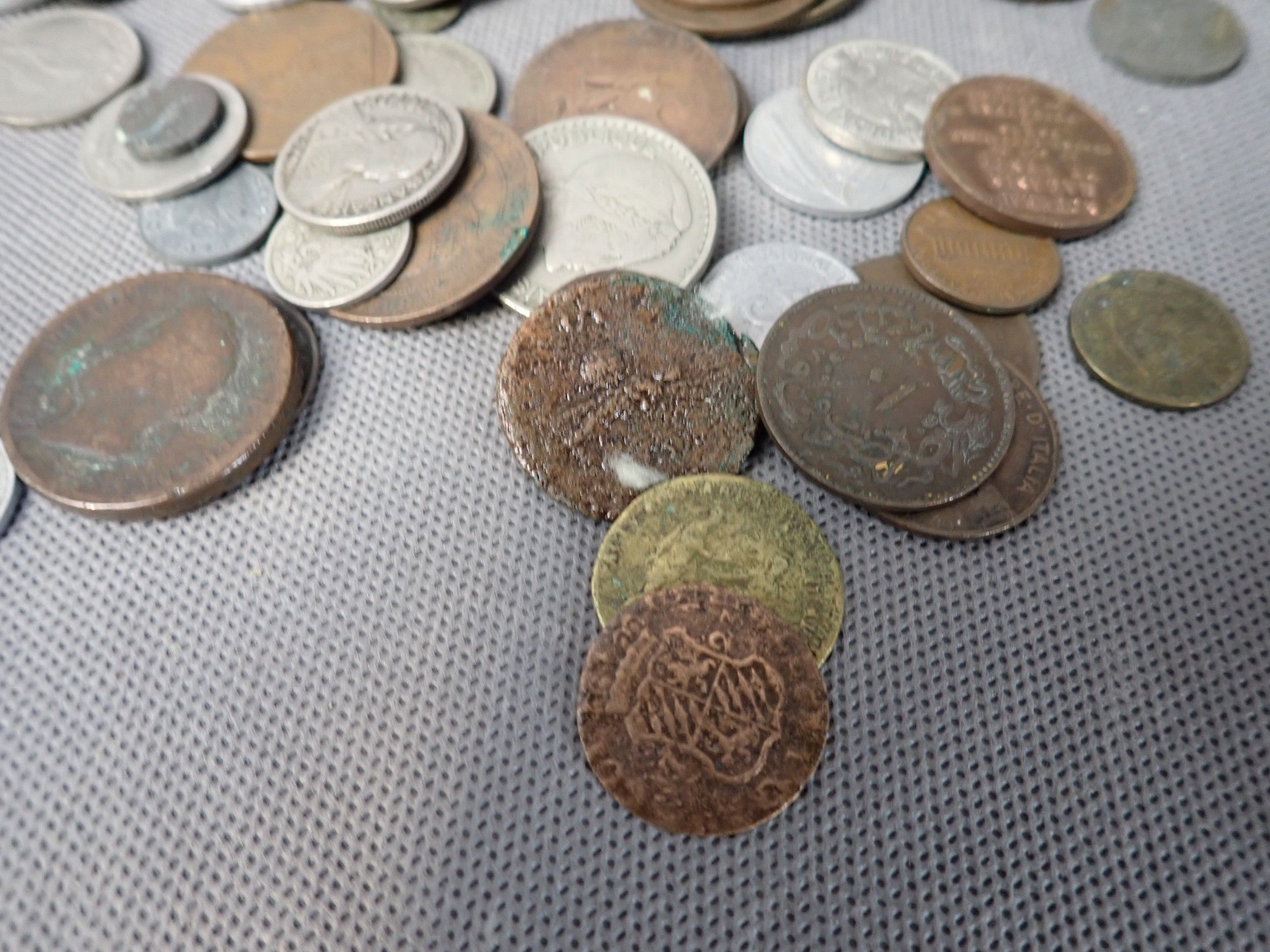 A metal case containing a bulk of foreign coins