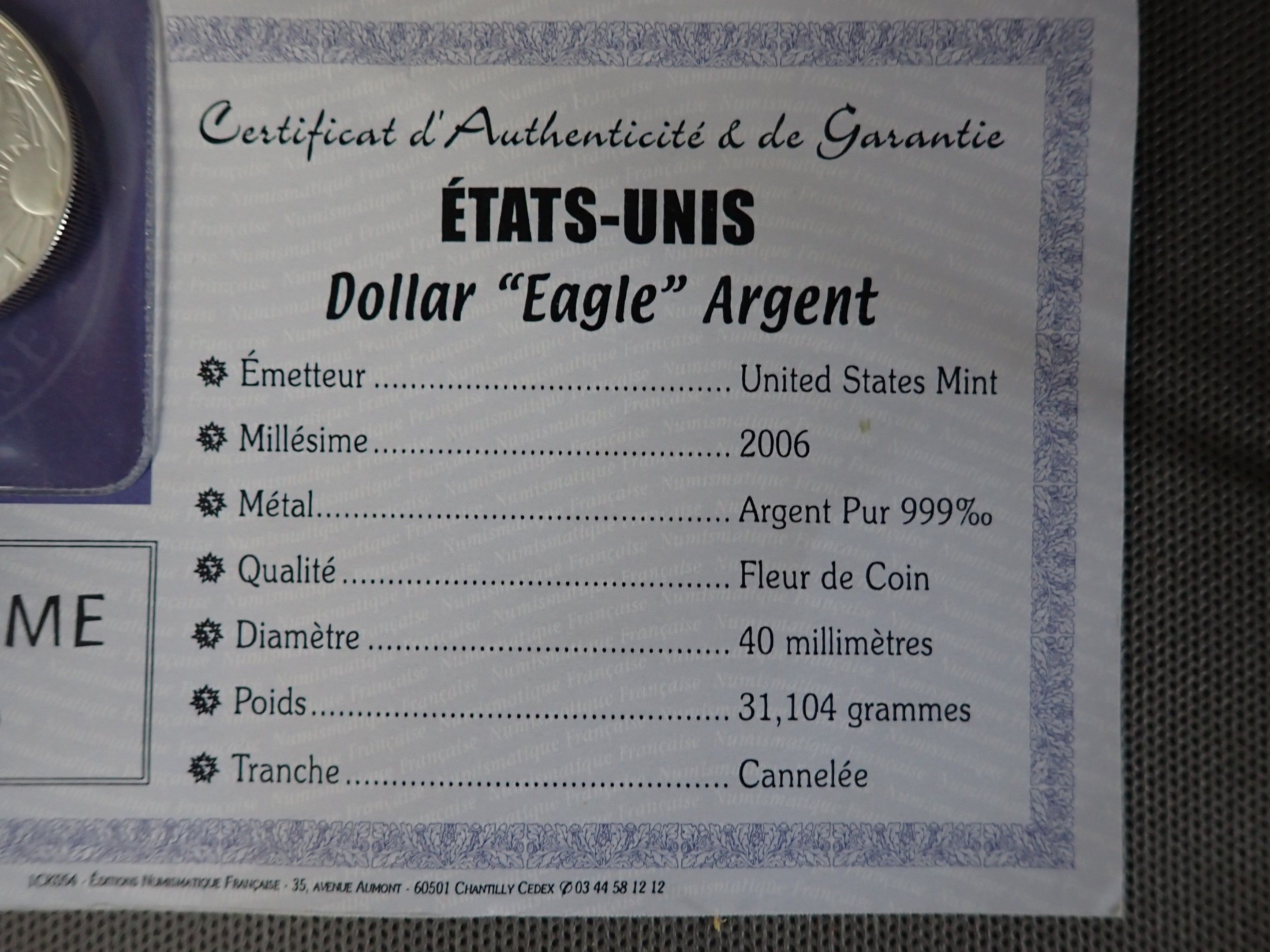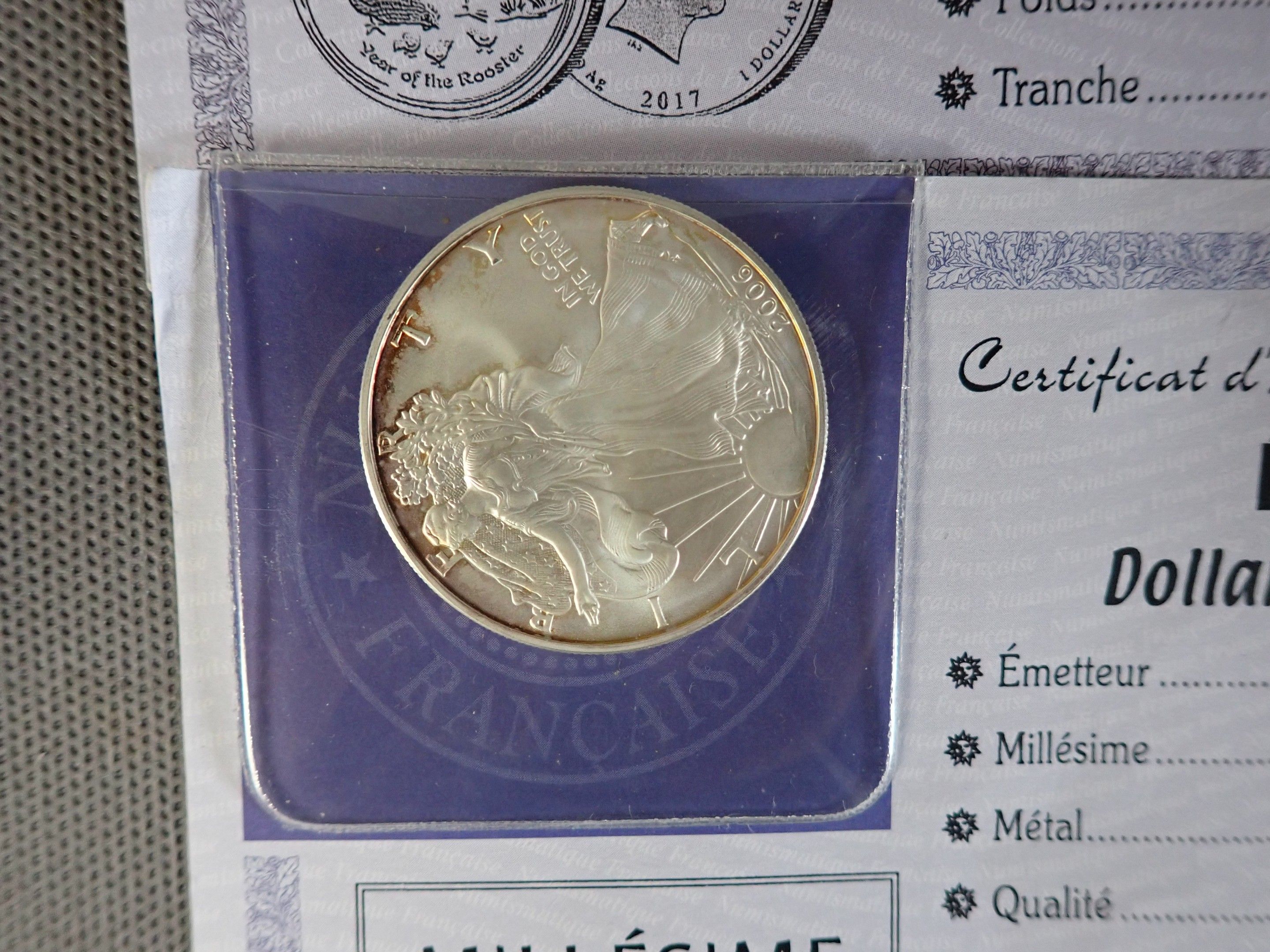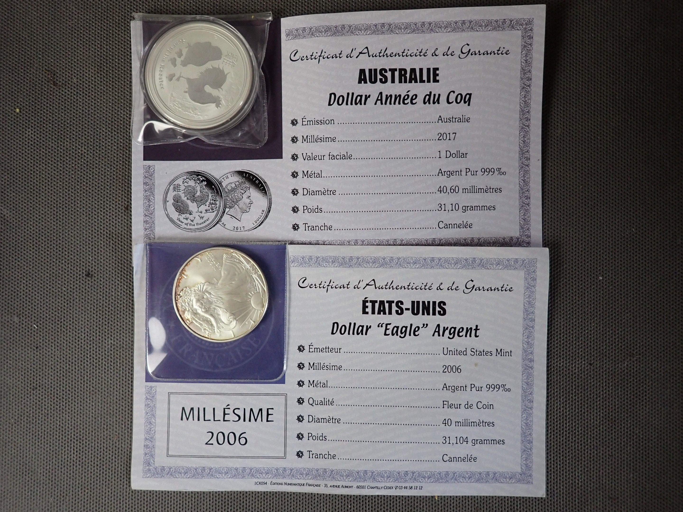 Lot comprising 1 Australian 2017 silver 1 dollar coin weighing 31.10 g and 1 silver 2006 eagle 1 dollar coin weighing 31.1 g