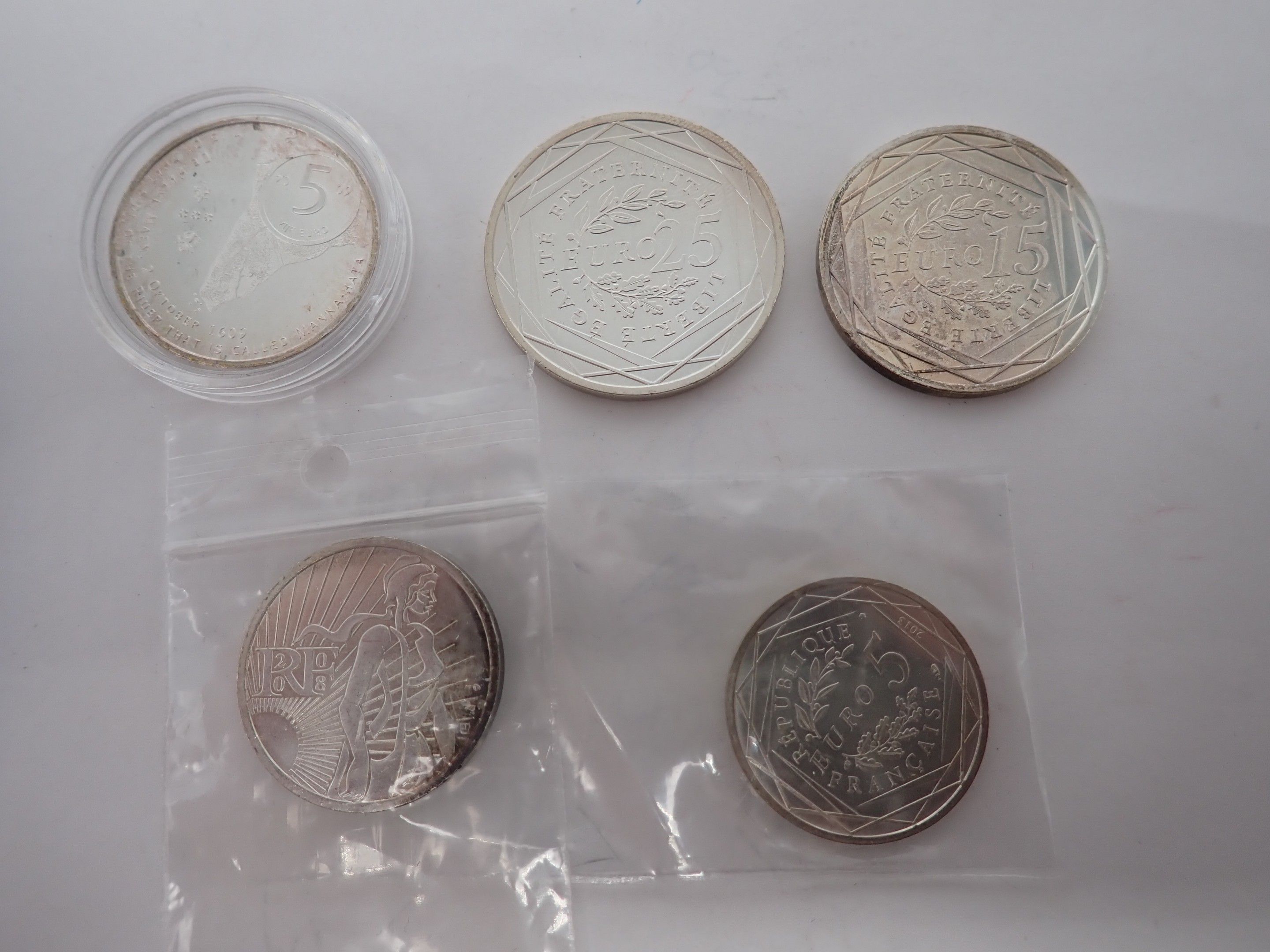 Lot comprising 3 silver 5-euro coins, 1 silver 15-euro coin and 1 silver 25-euro coin, weight 61.3 g