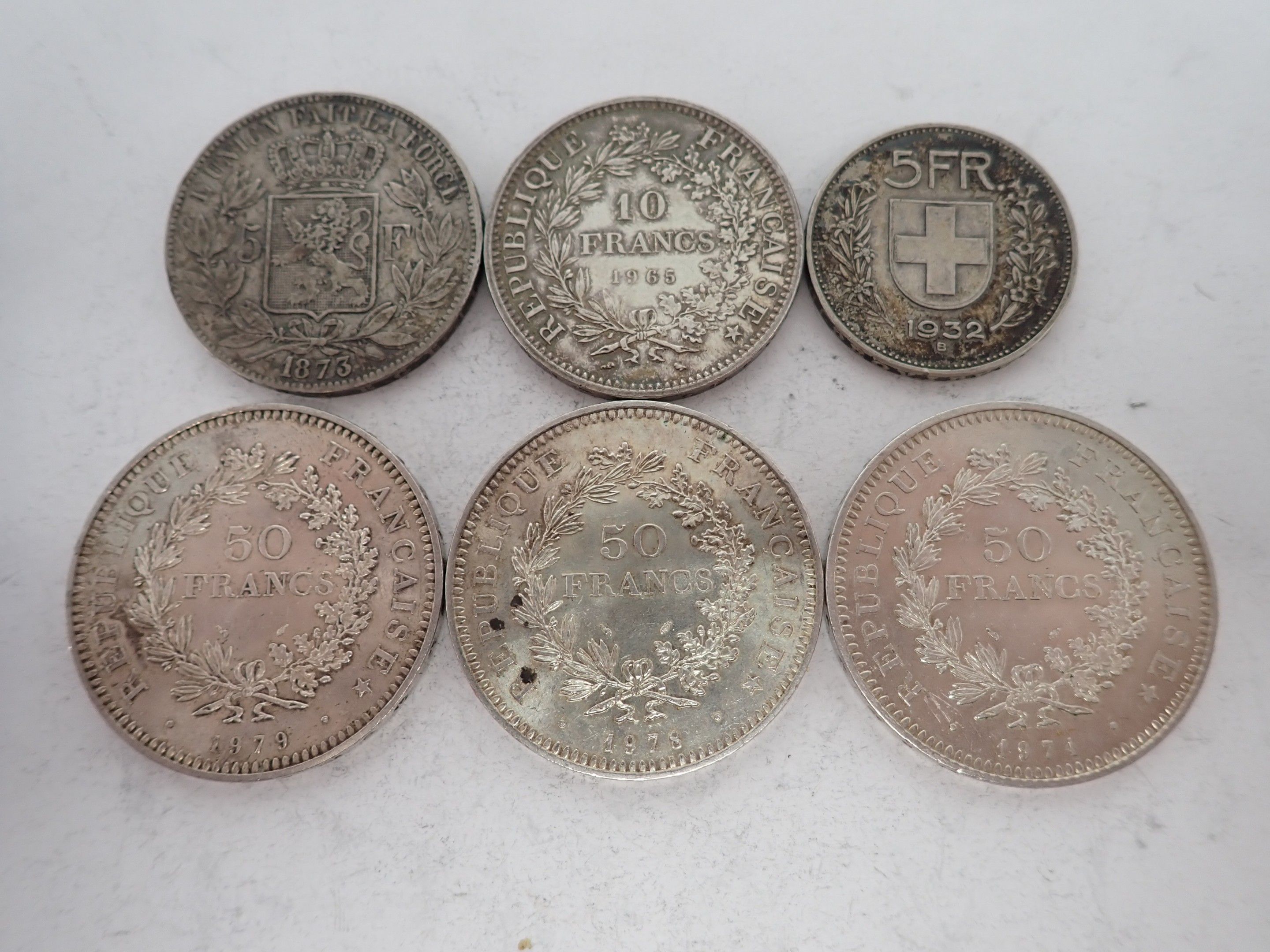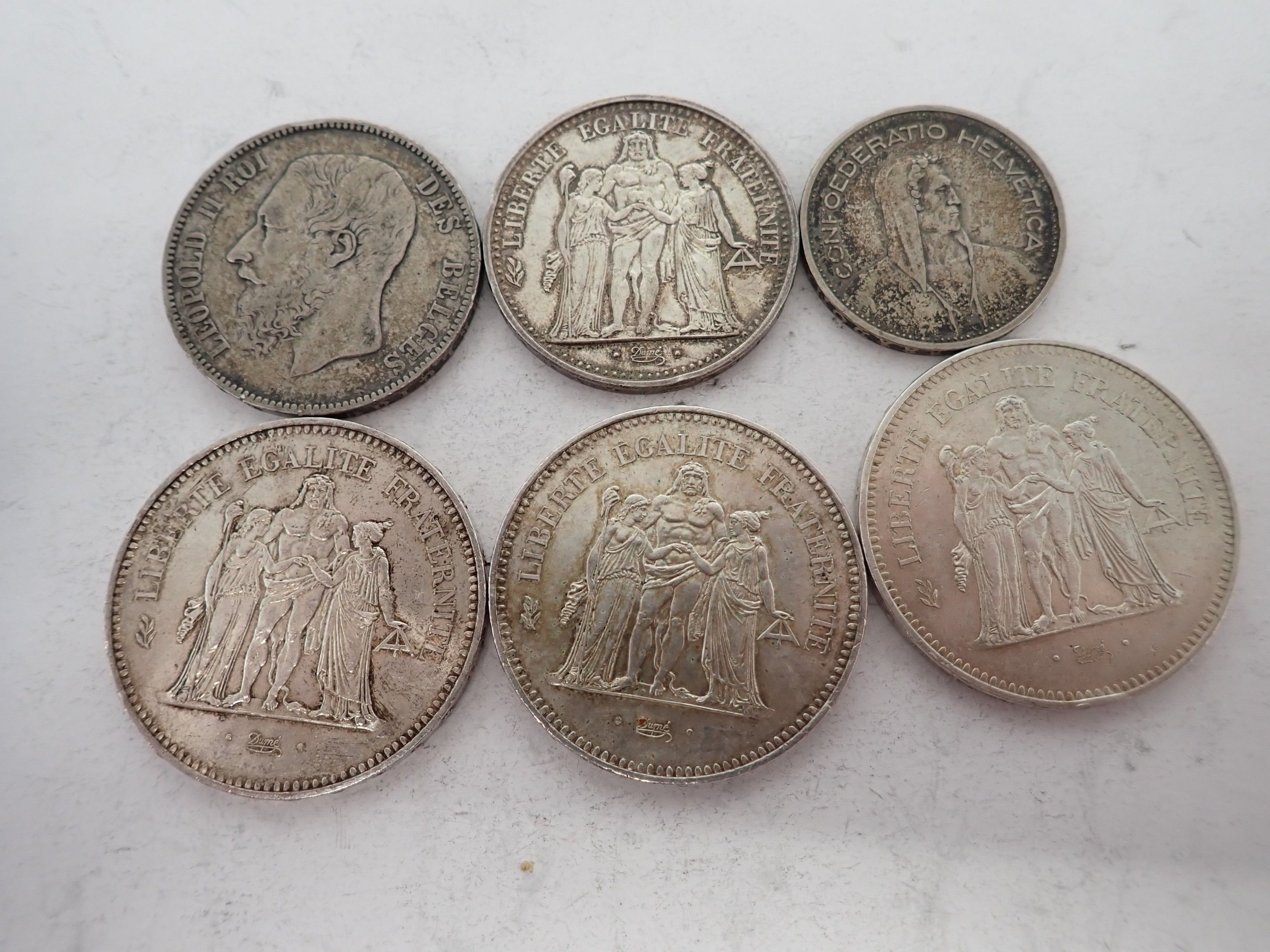 3 Coins of 50 Francs silver and 1 coin of 10 Francs silver Hercules, 1 coin of 5 Francs Swiss silver and 5 Francs Belgian silver attached, weight 154.8g