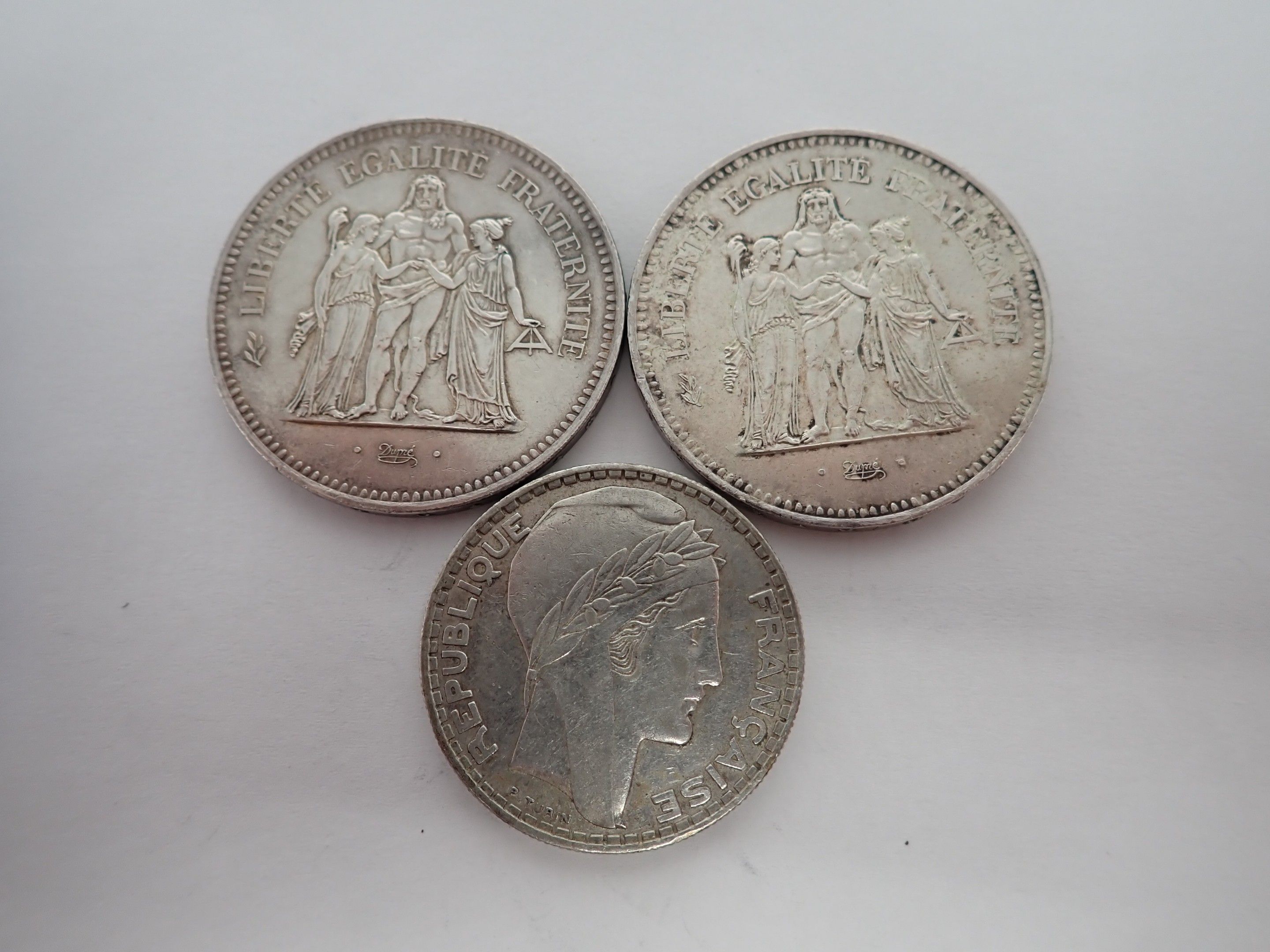 2 silver 50 franc coins and 1 silver 20 franc coin, weight 8…