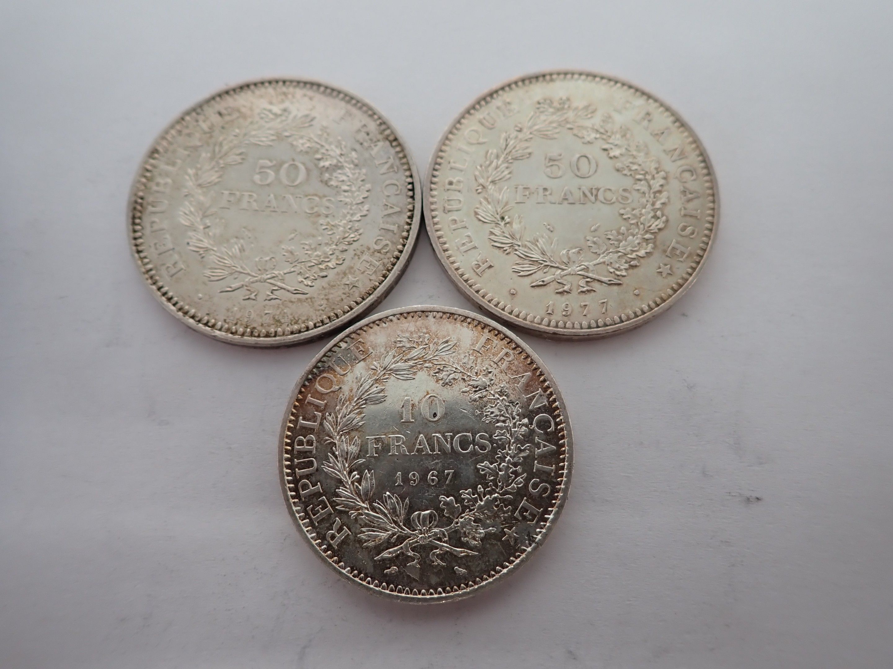 2 silver 50 franc coins and one silver 10 franc Hercules coi…