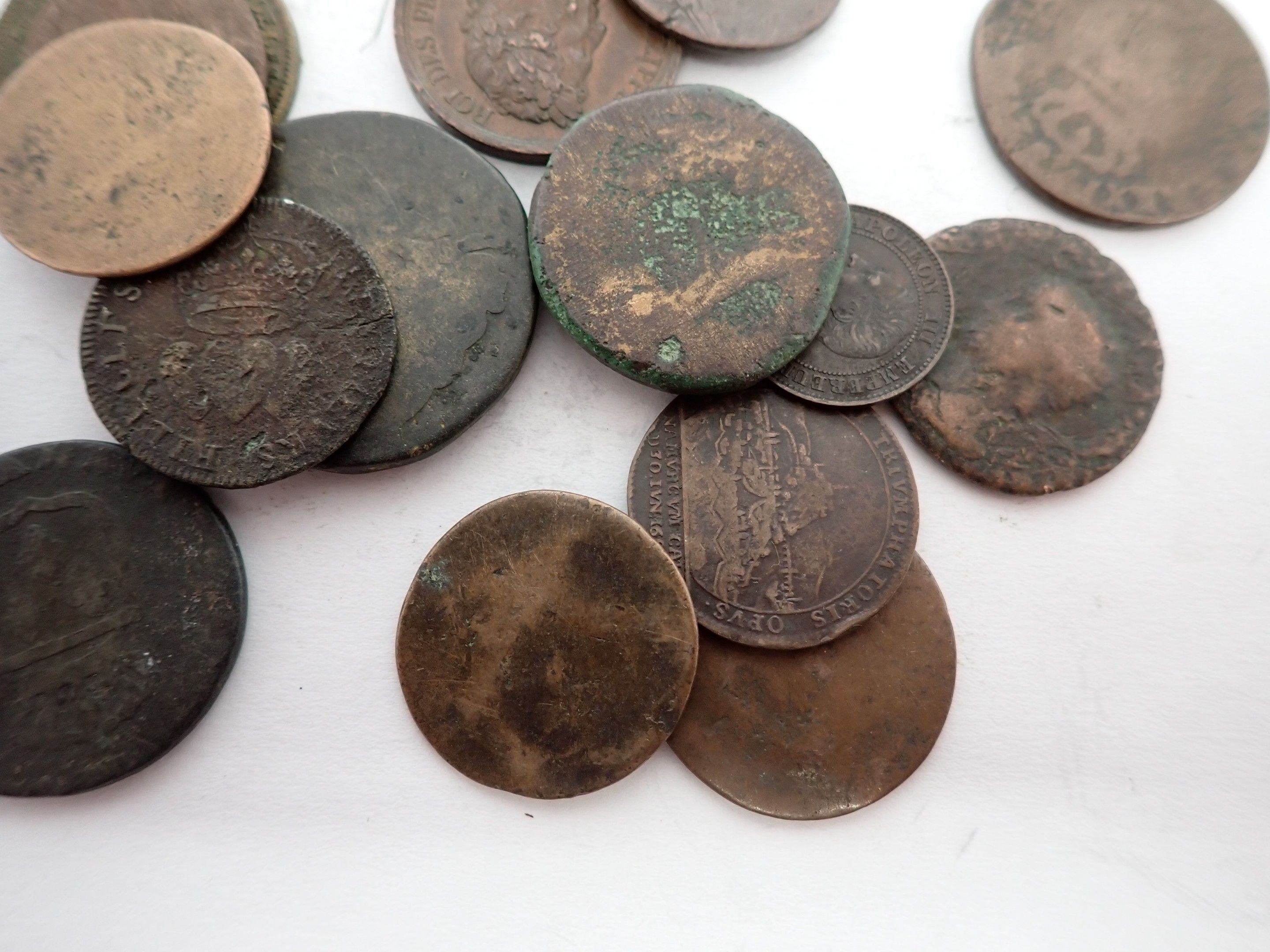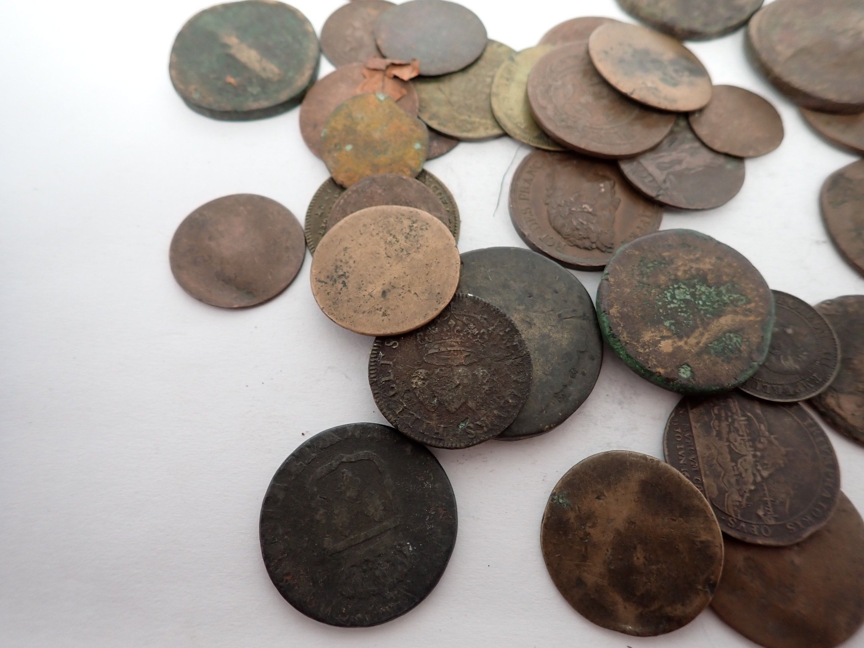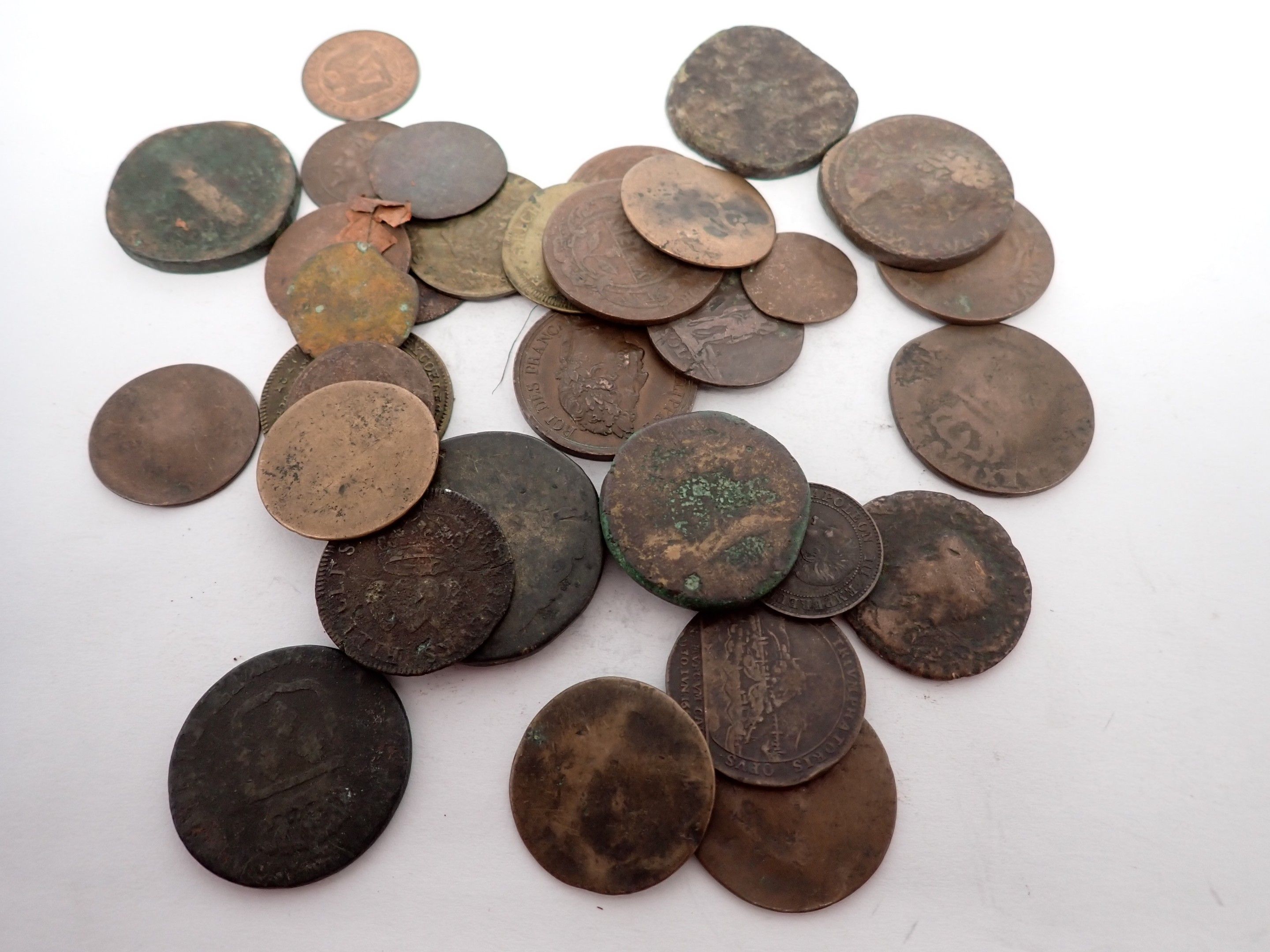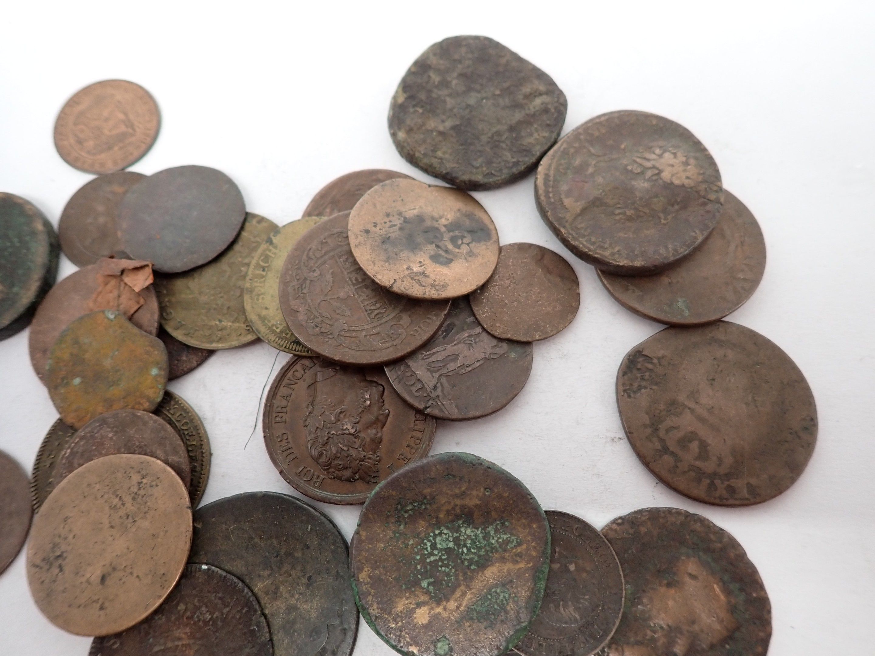 Lot of bronze and brass coins and tokens, some antiques
