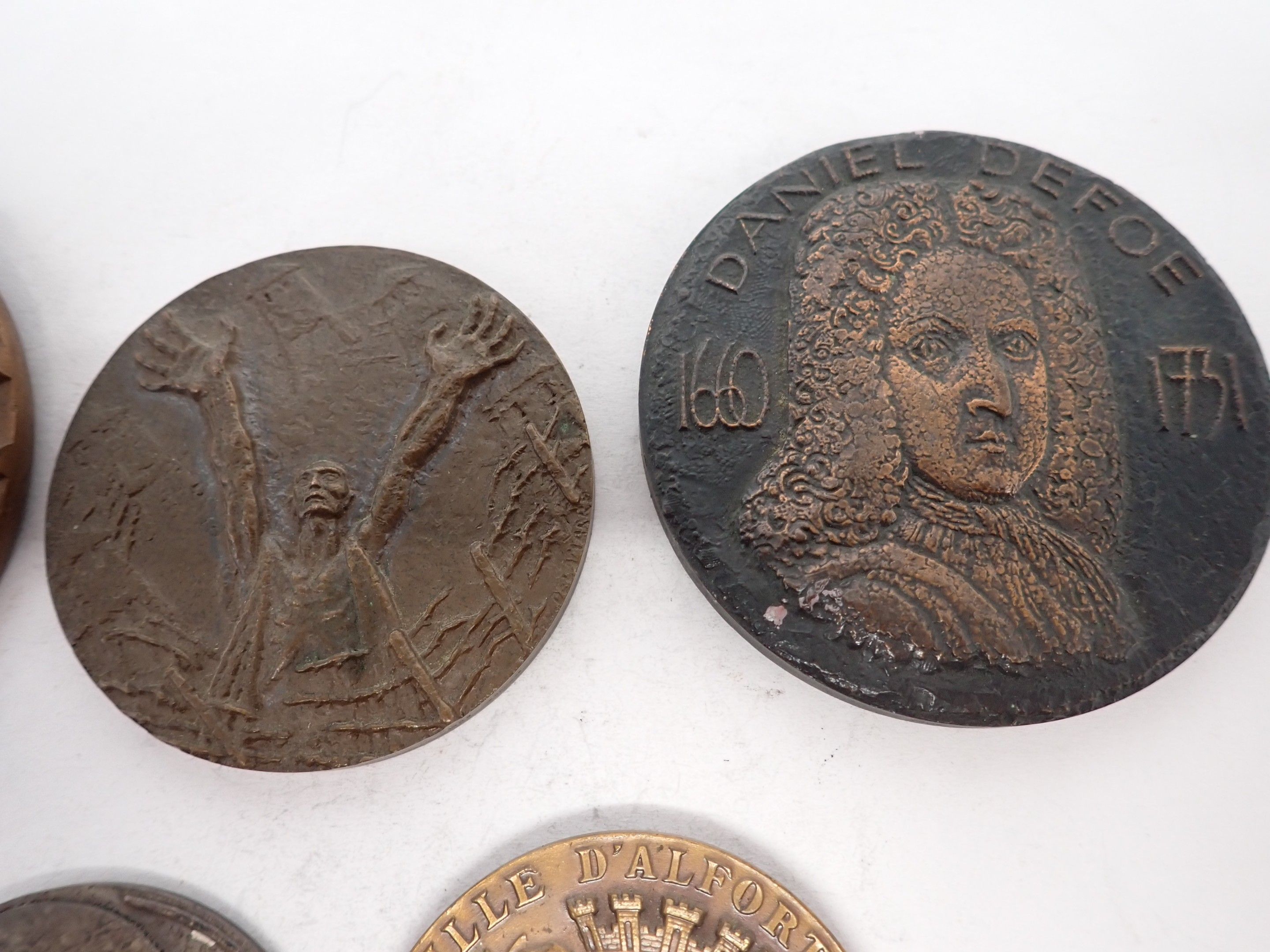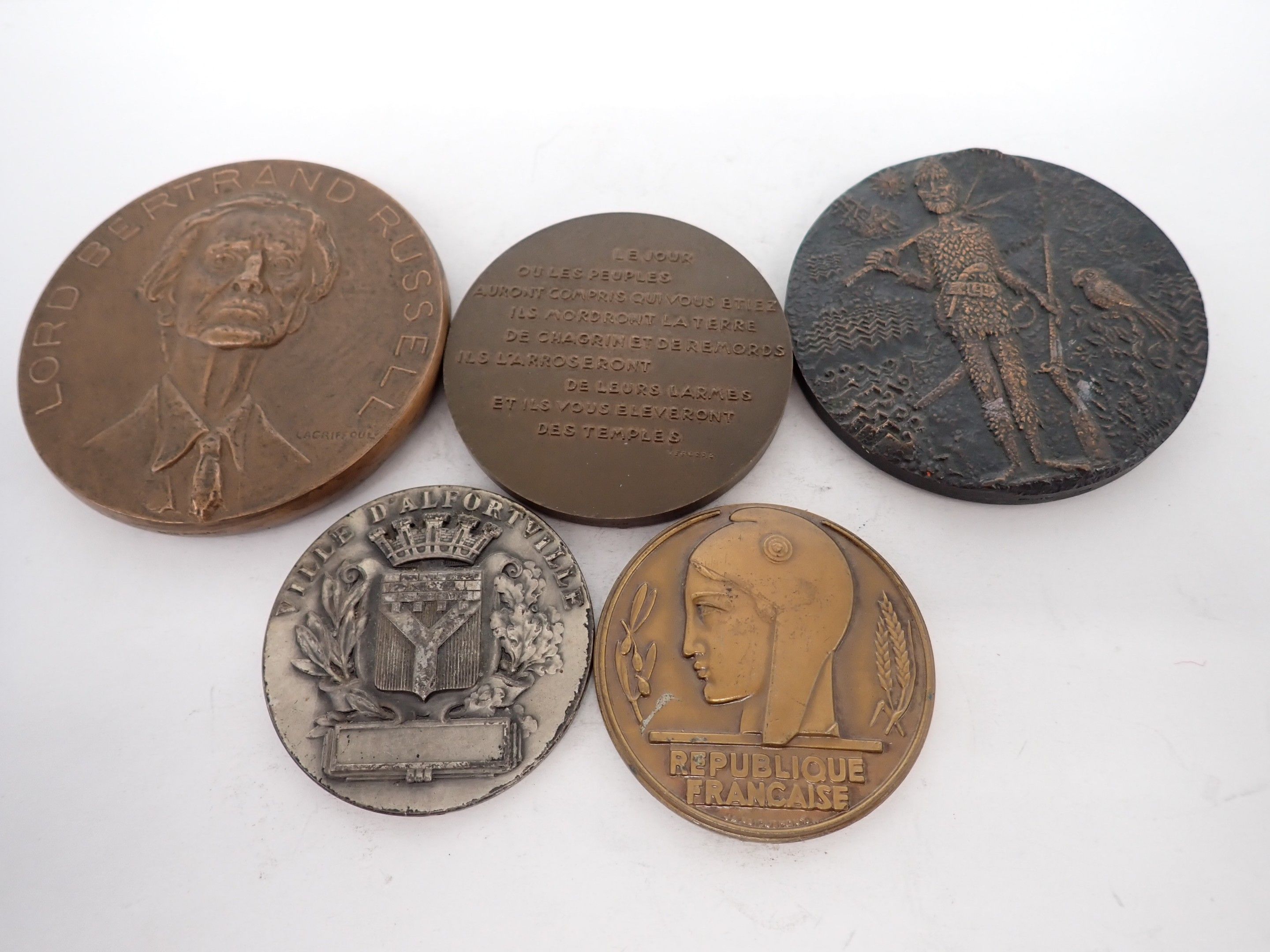 Set of 5 bronze and metal medals including a Lord Bertrand and Russell medal signed Lagriffoul, a medal signed Vercore, two Ville d'Alfortville medals signed Briquemont, a Daniel Defoe medal.