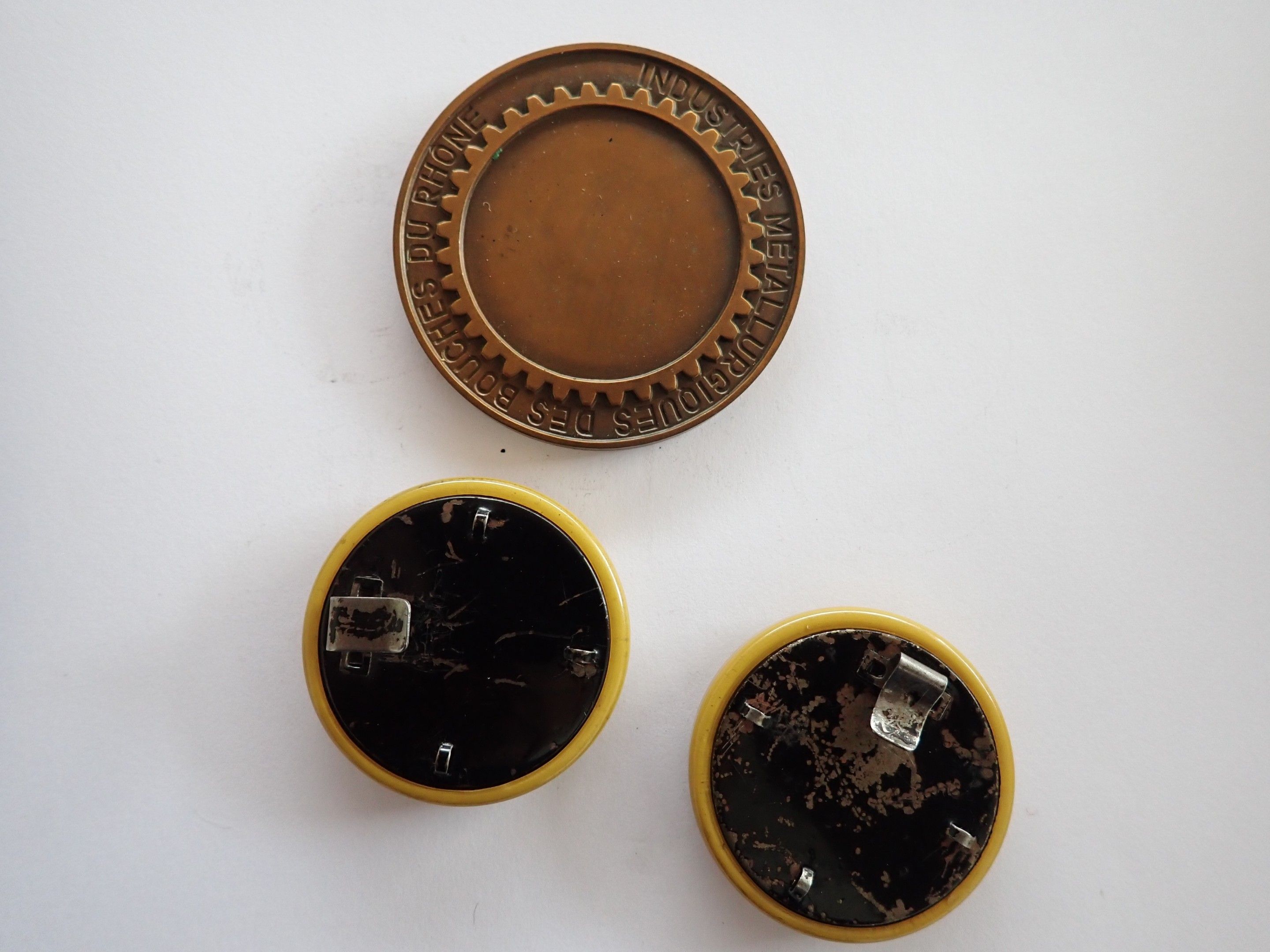 Bronze work medal, diam. 6cm, with 2 bakelite buttons.