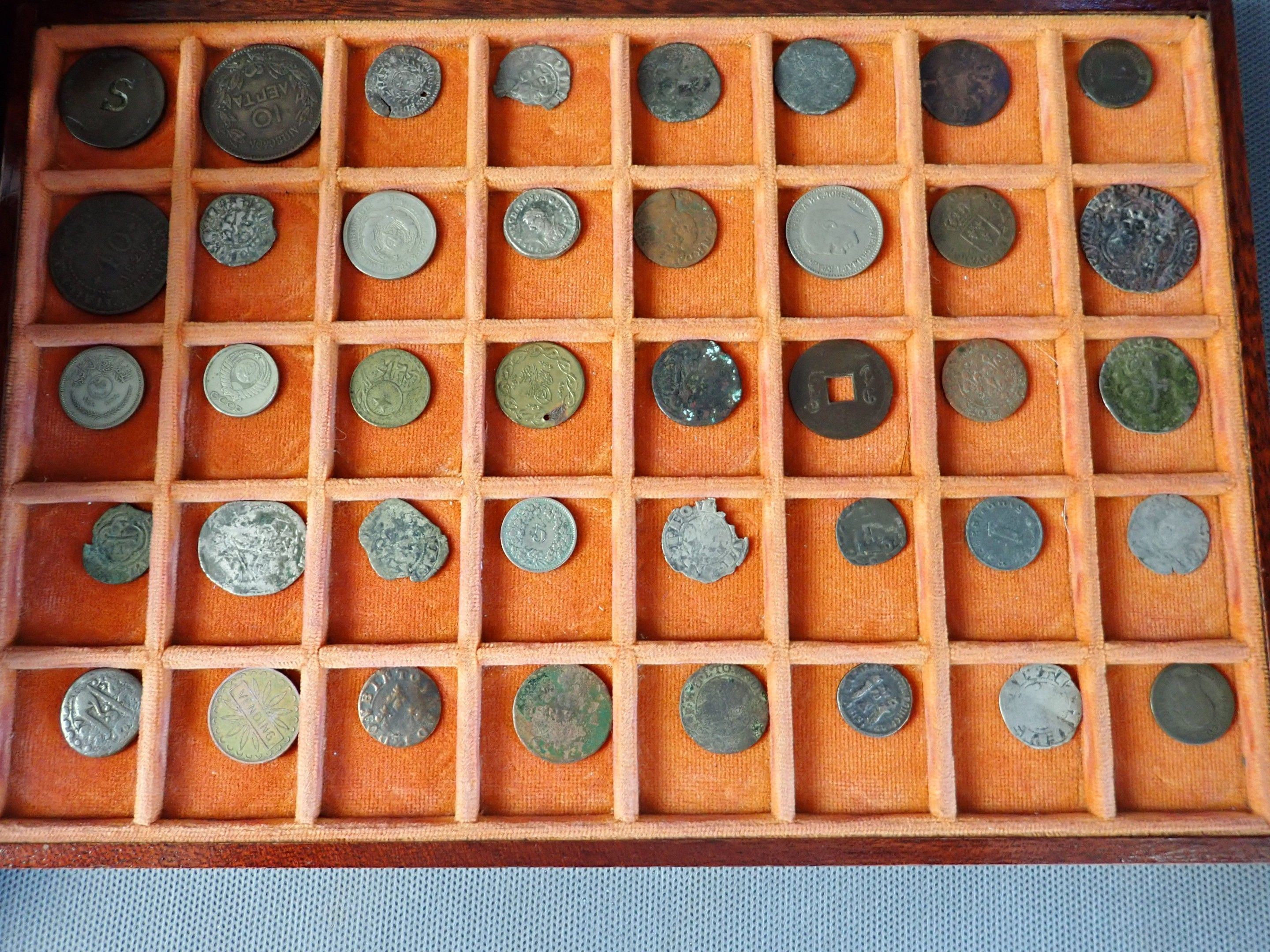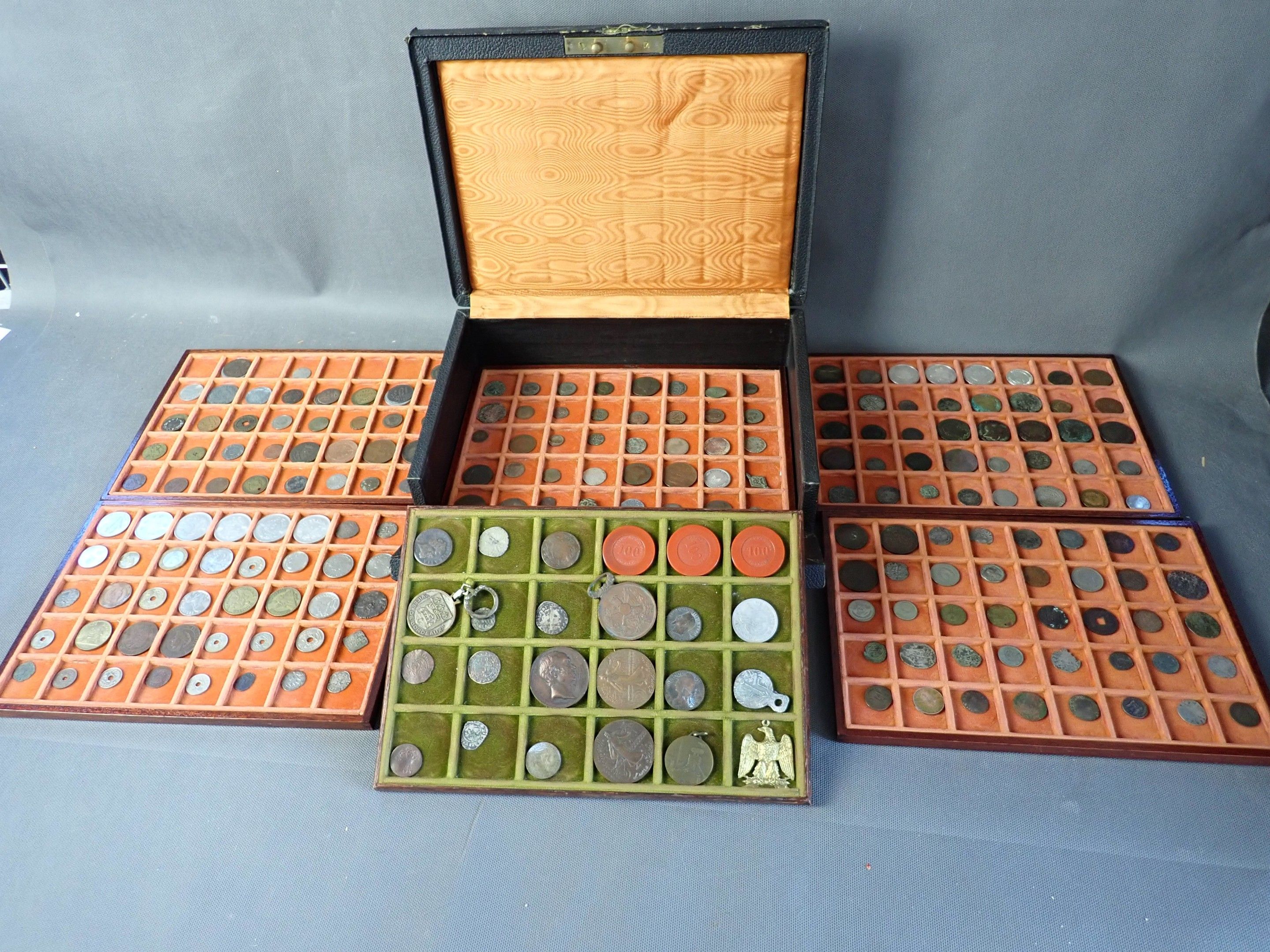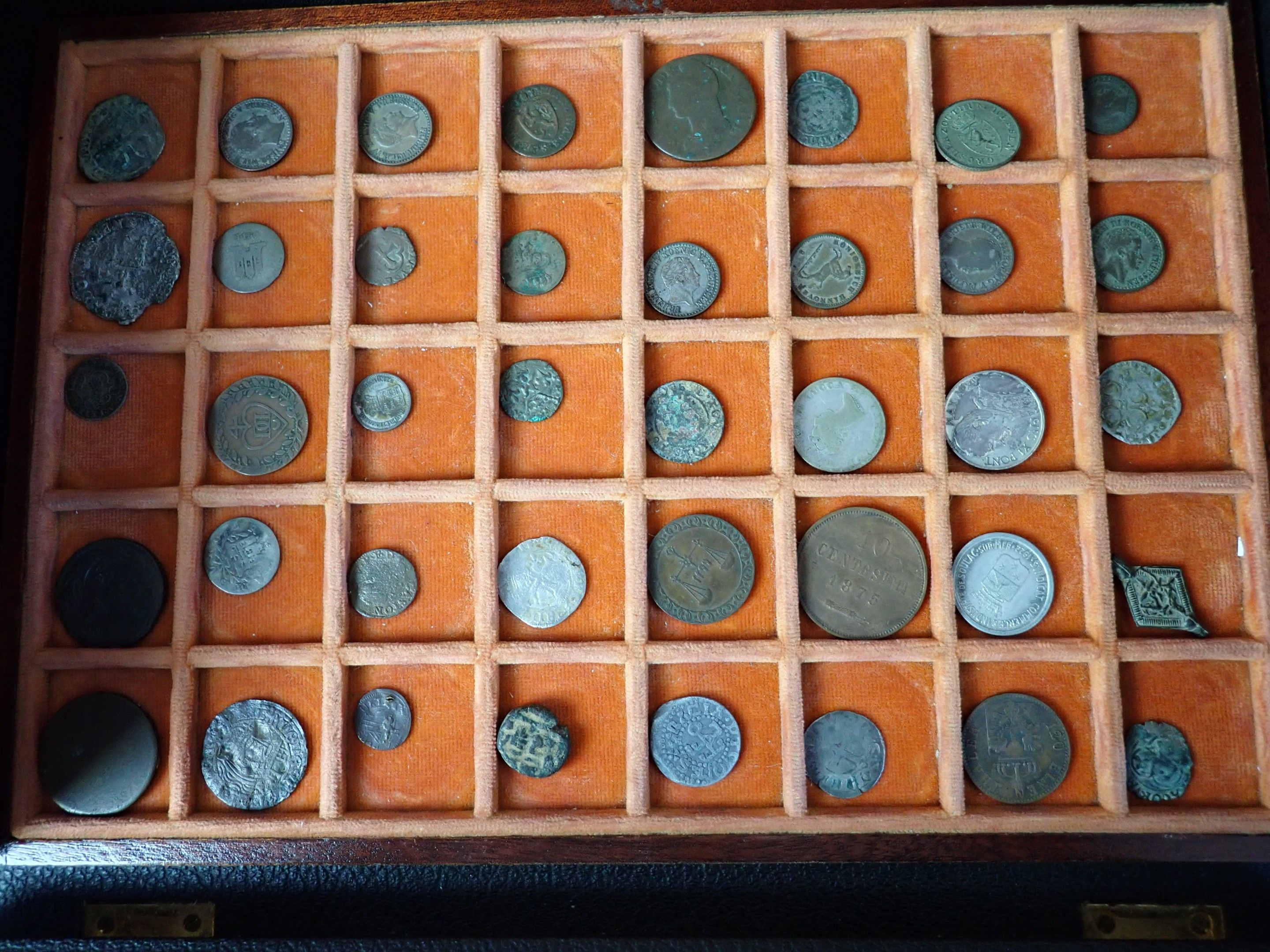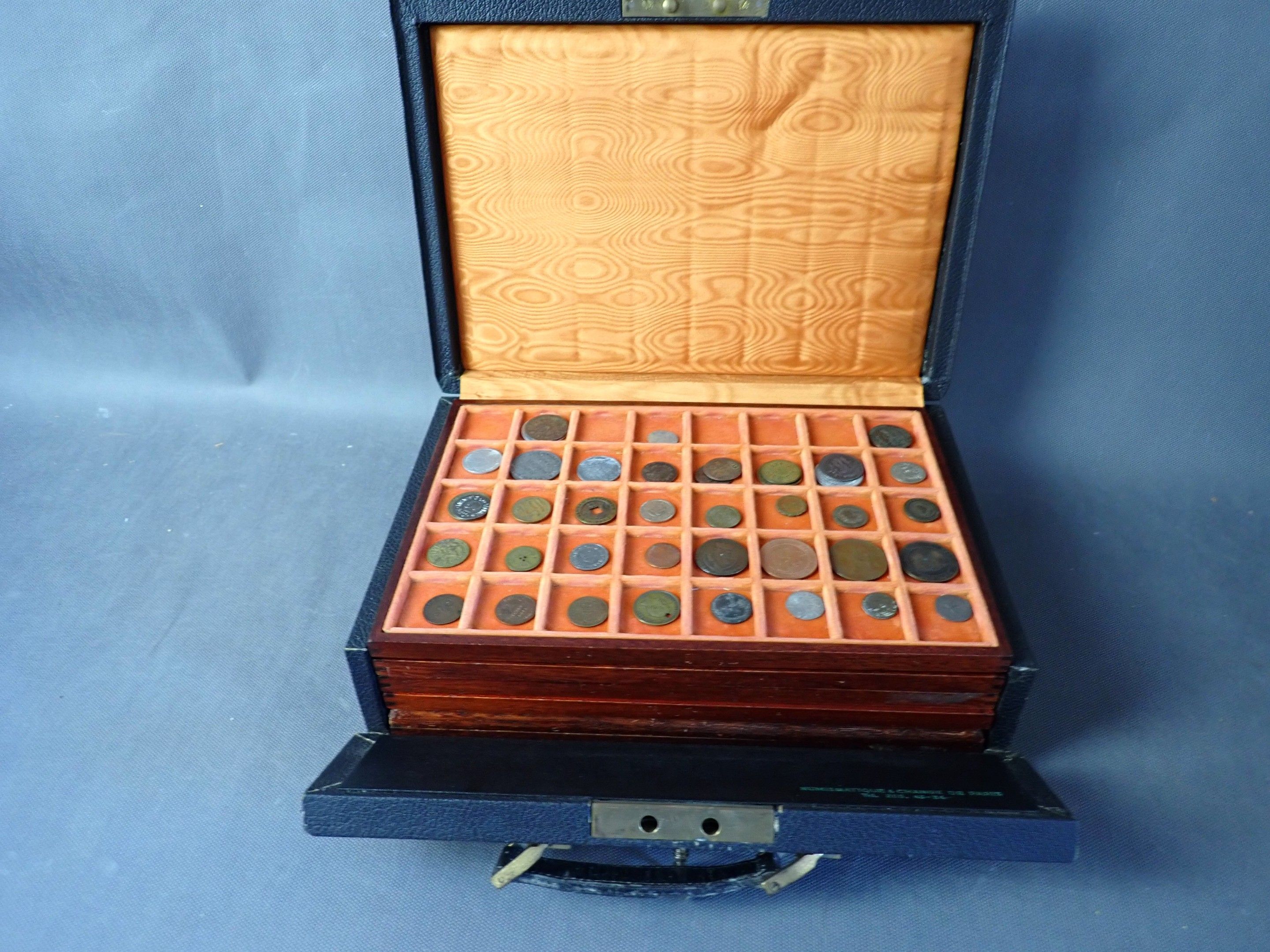 Key-operated case containing 224 small base metal coins, tokens and medals, all states
