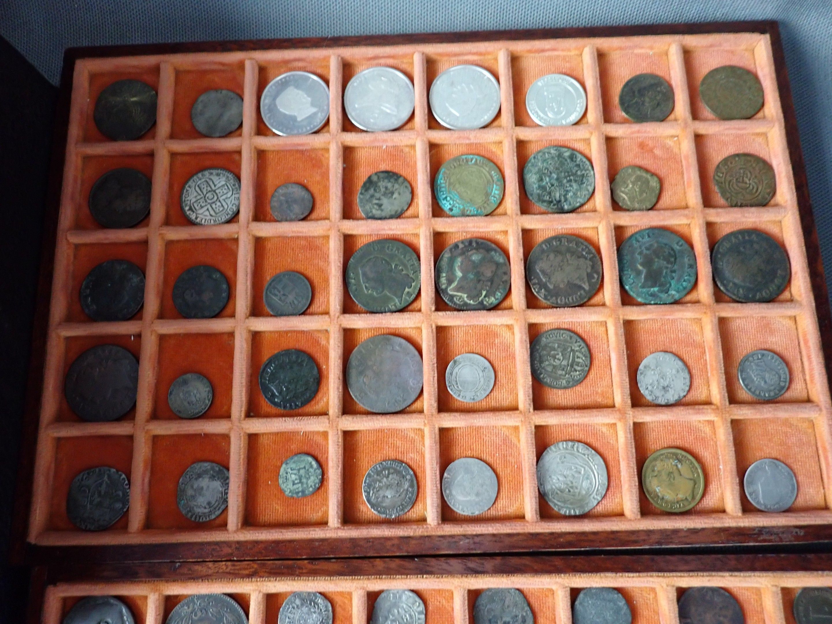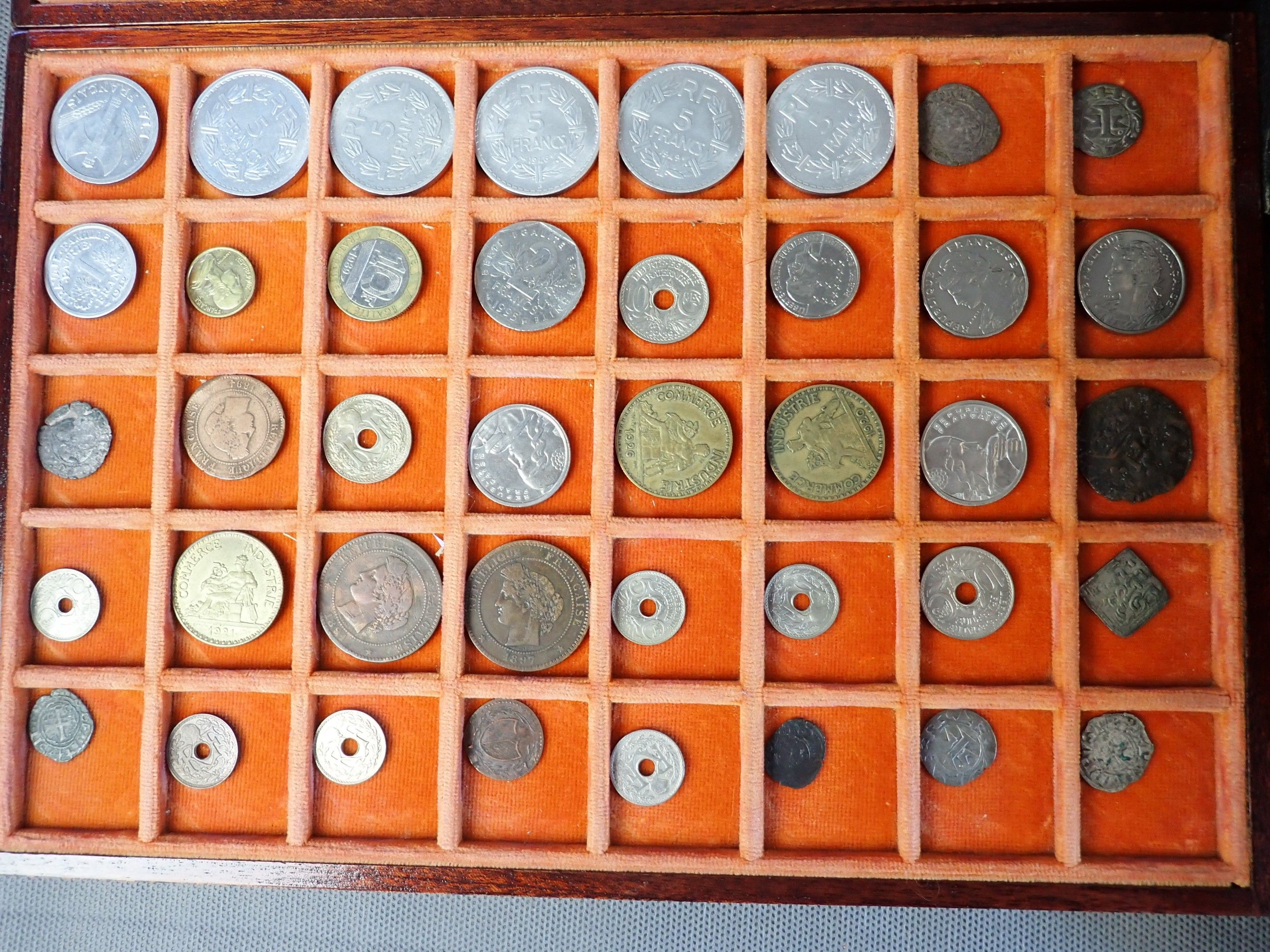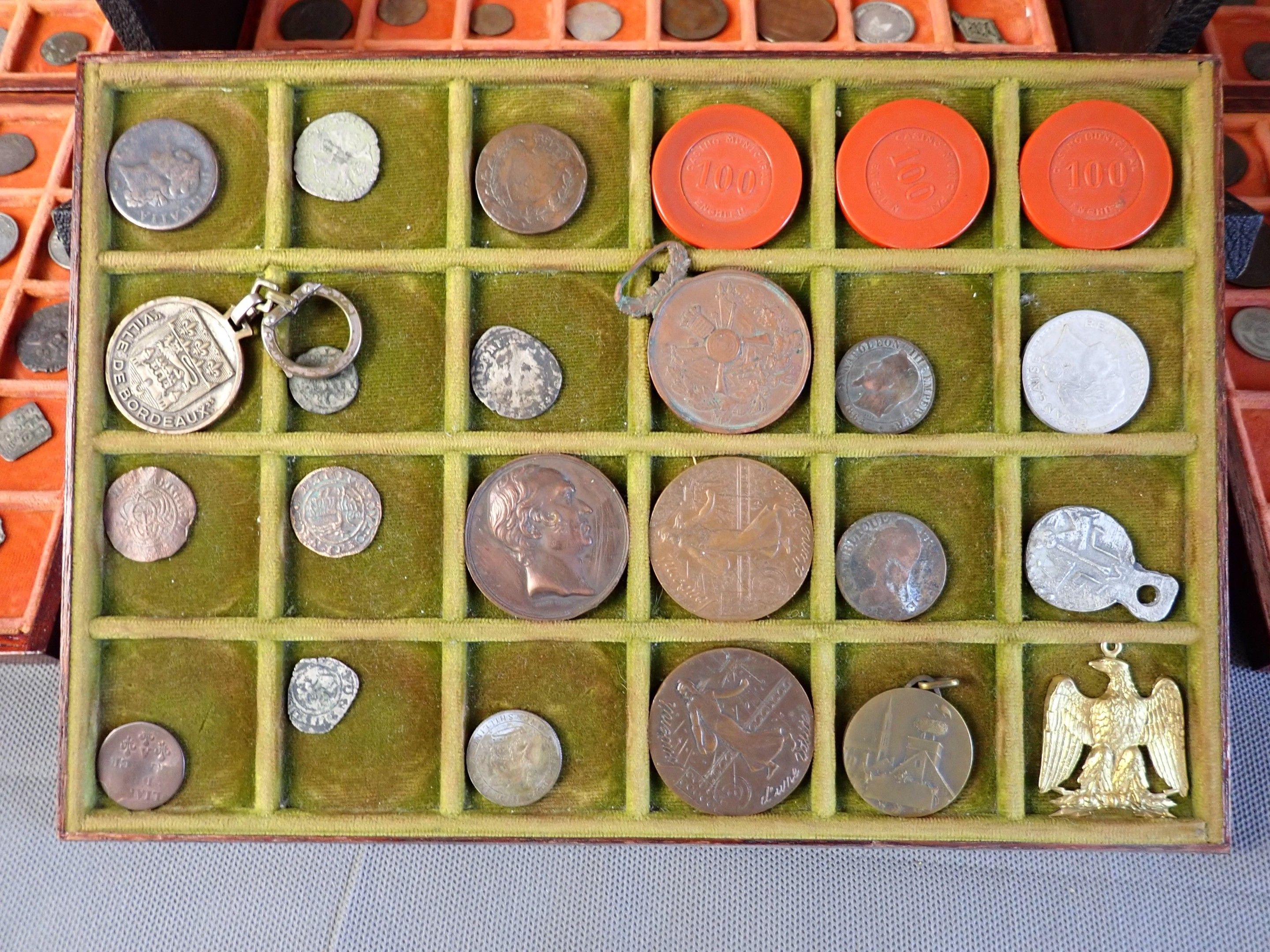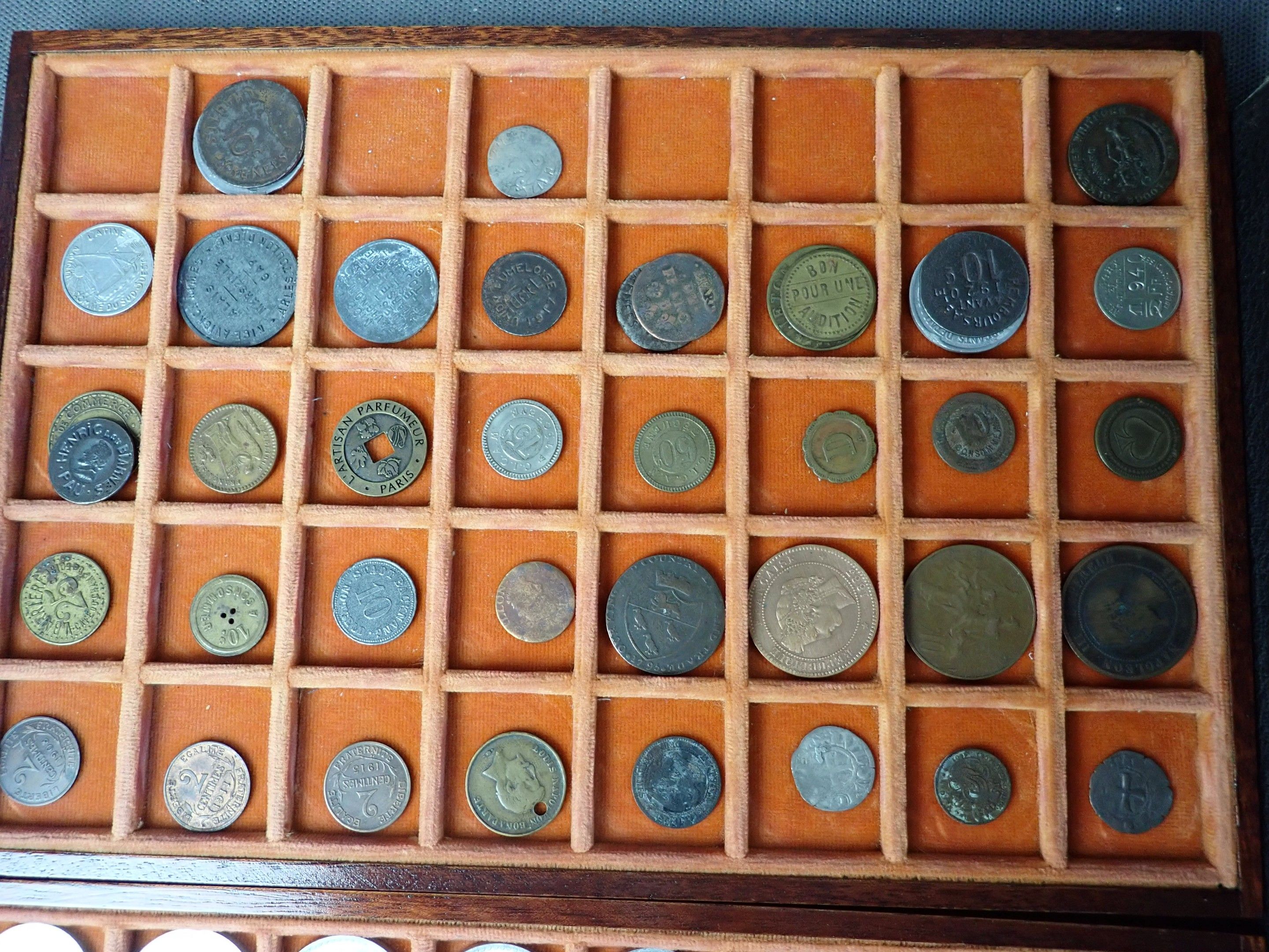 Key-operated case containing 224 small base metal coins, tokens and medals, all states