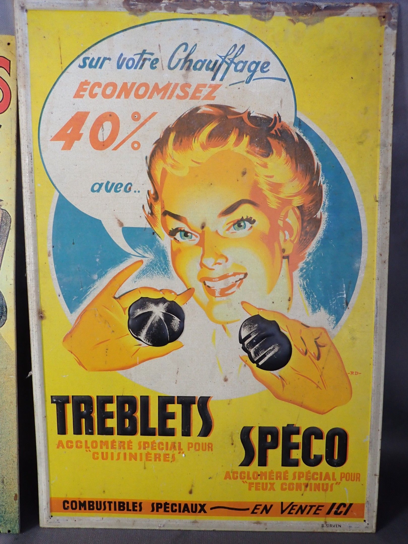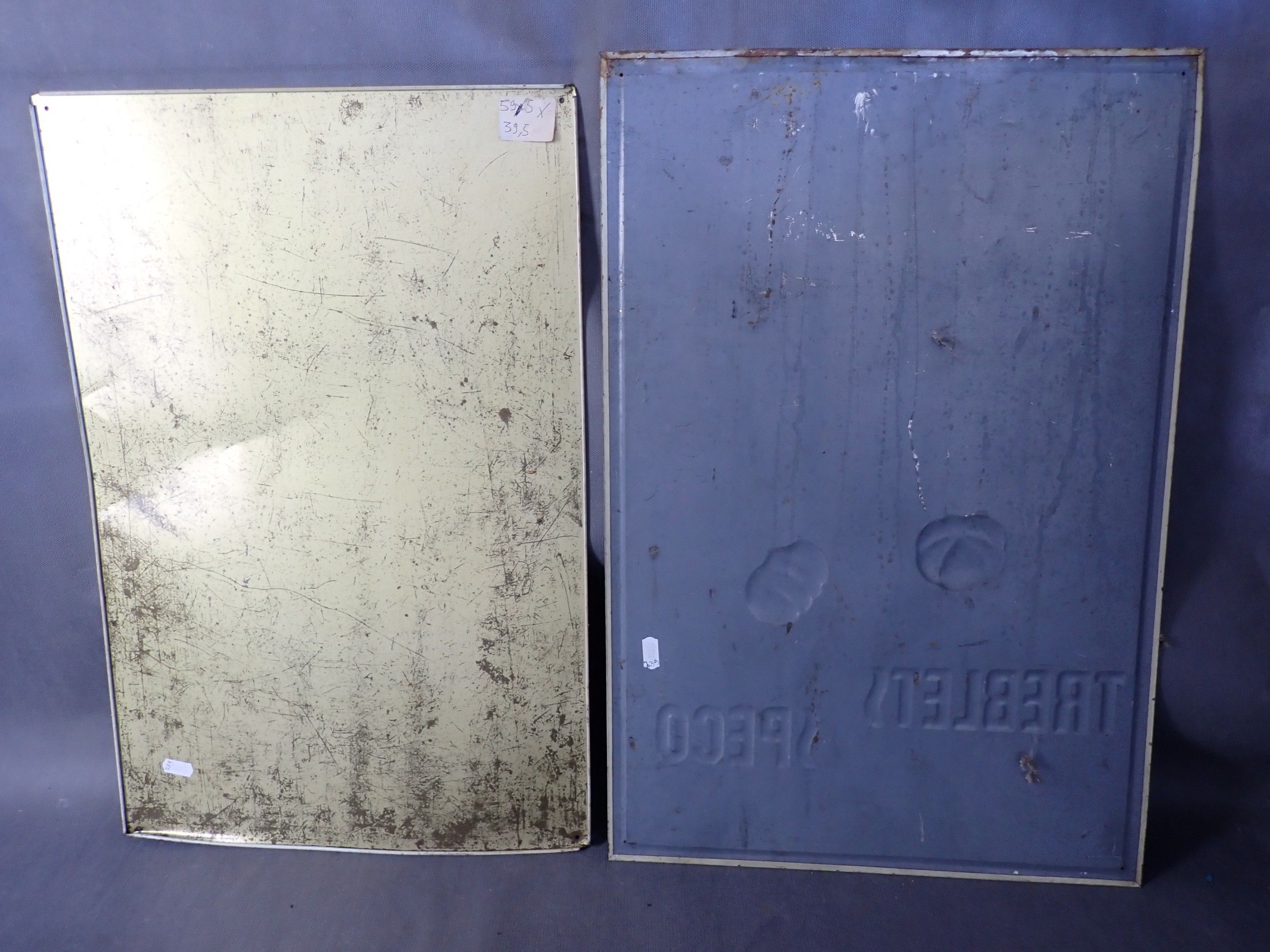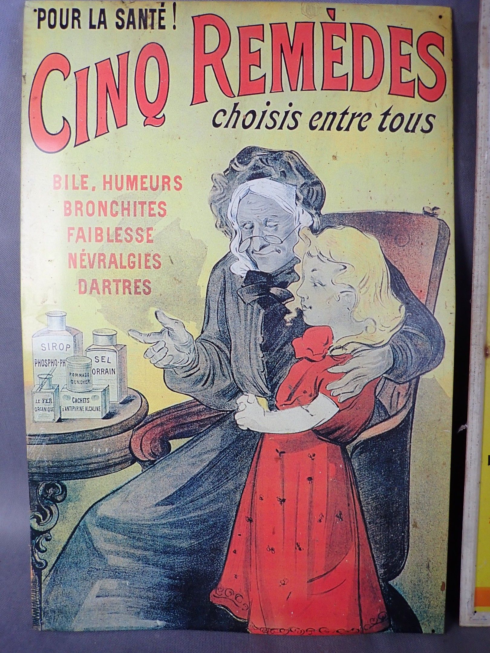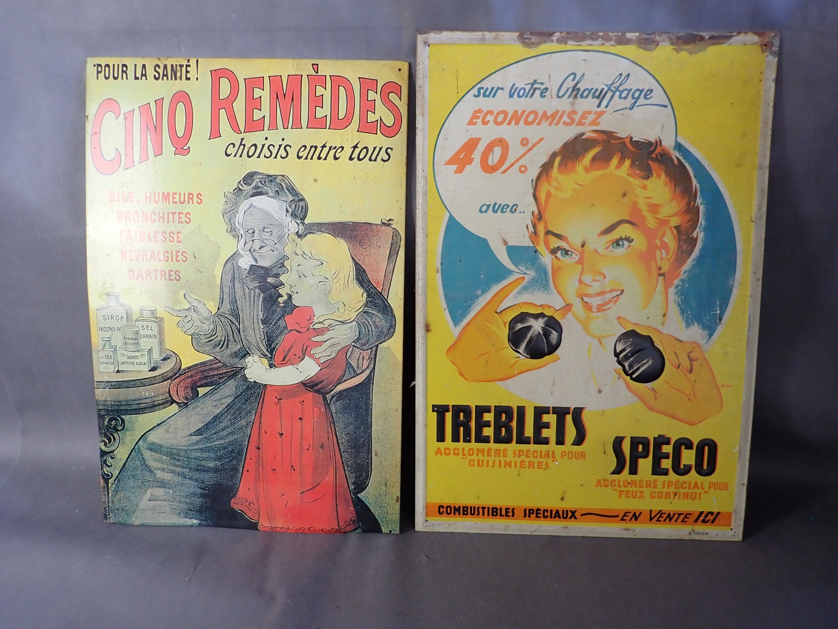 Set of 2 screen-printed plates including Treblets Speco and a Cinq Remèdes reproduction, 61 x 41cm and 59 x 39cm