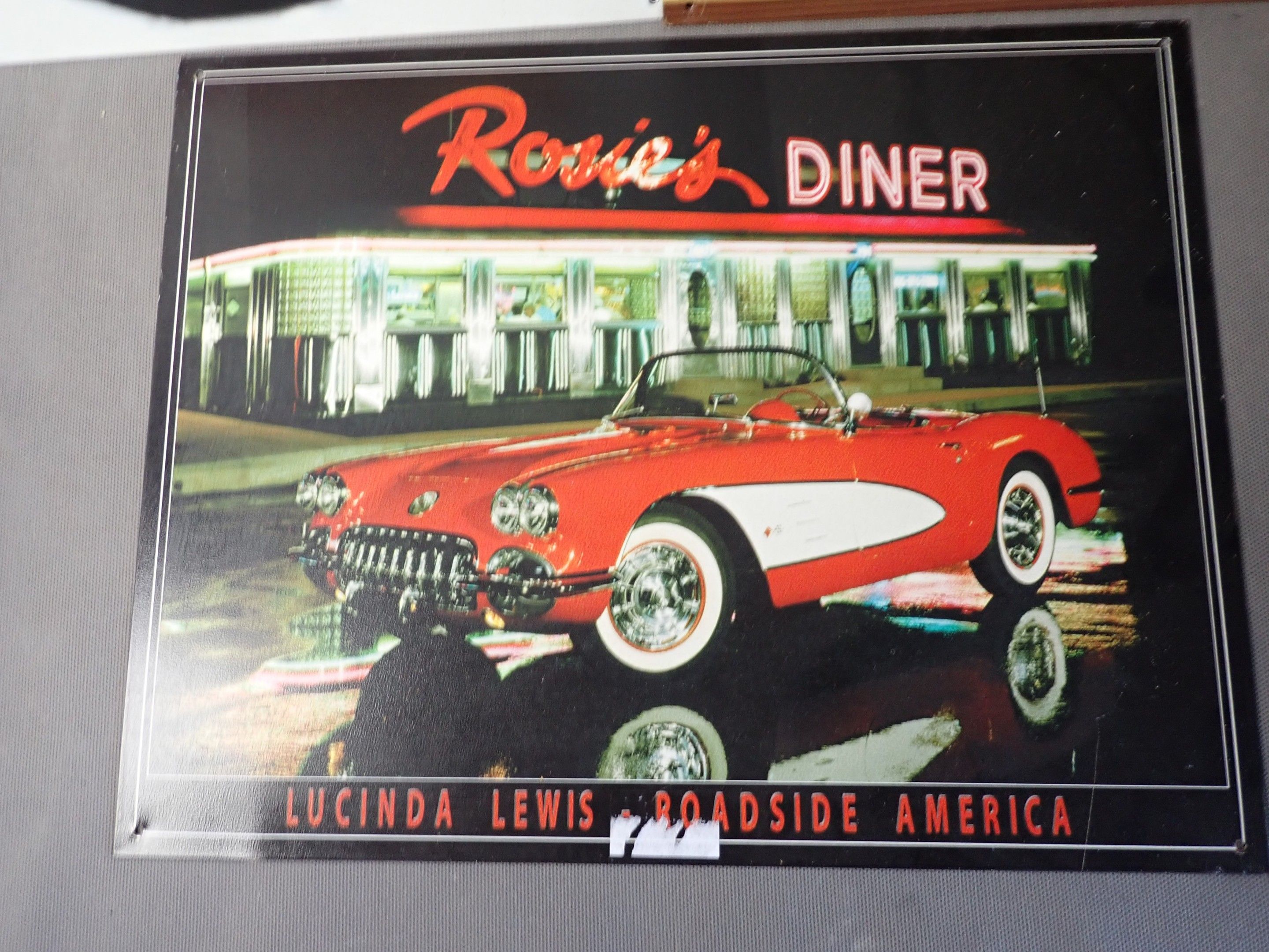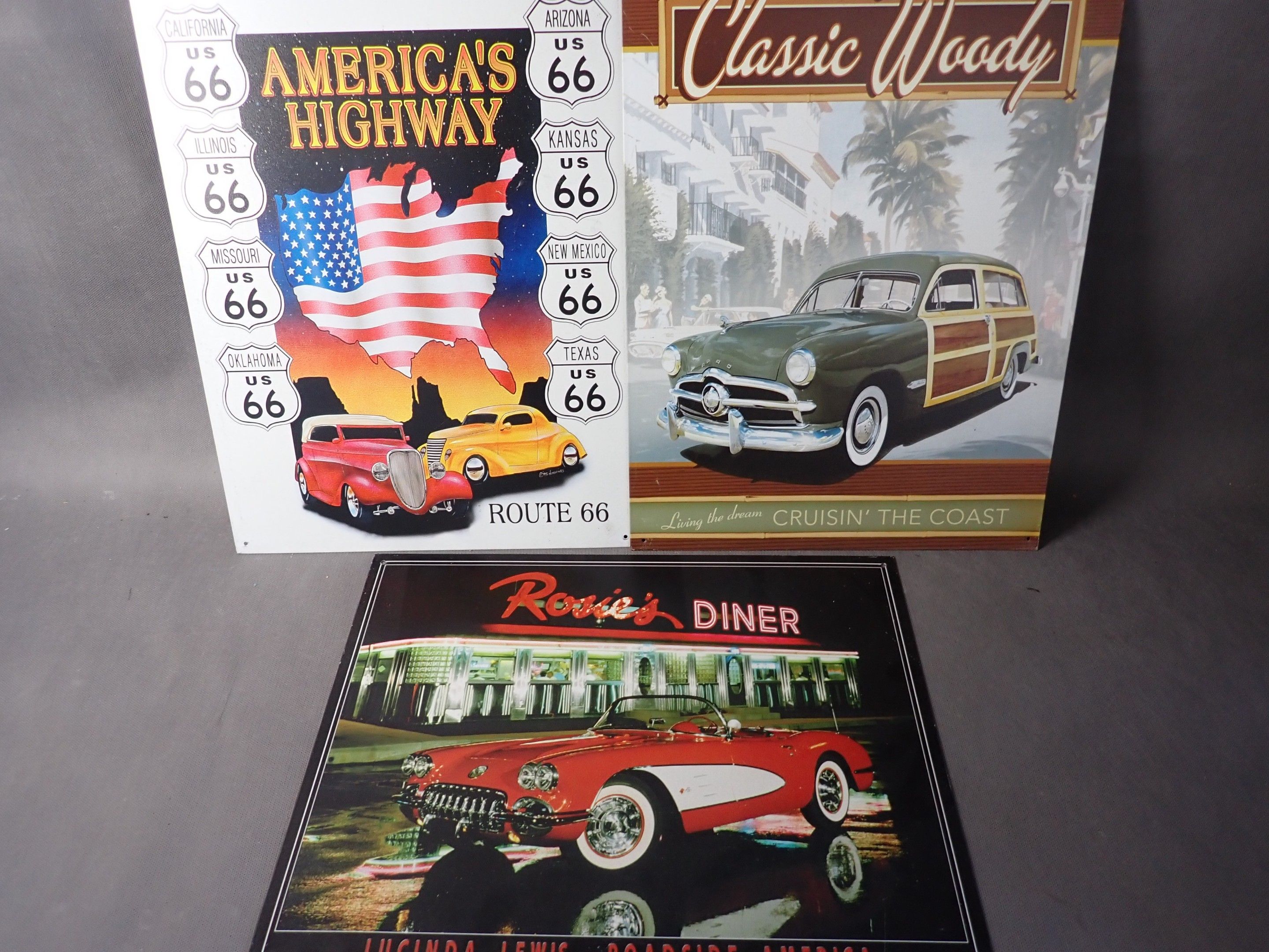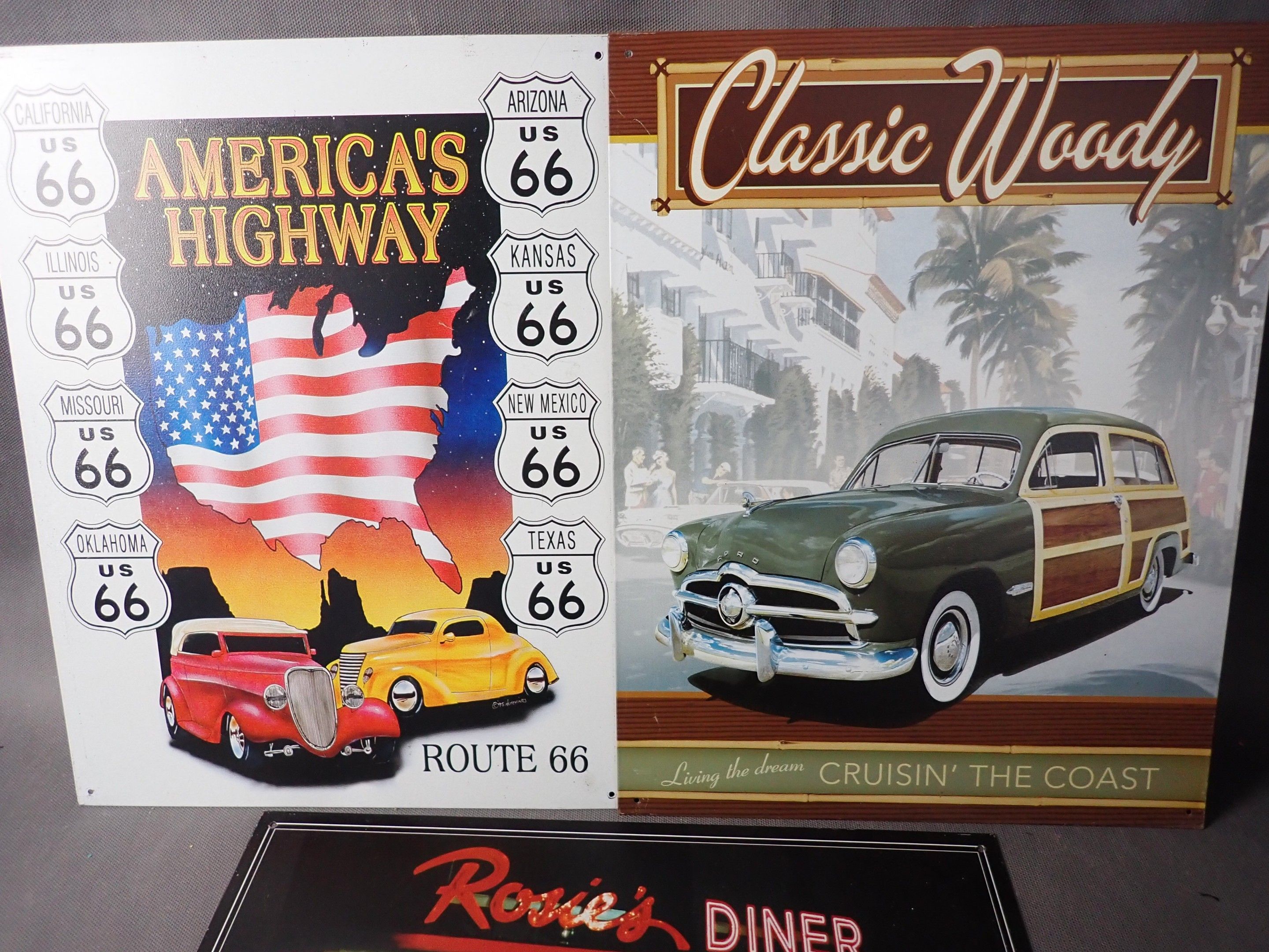 Set of 3 metal advertising plaques, 40.5x31.5 cm including Classic Woody, Rosie's Diner America's Highway (sold as is)