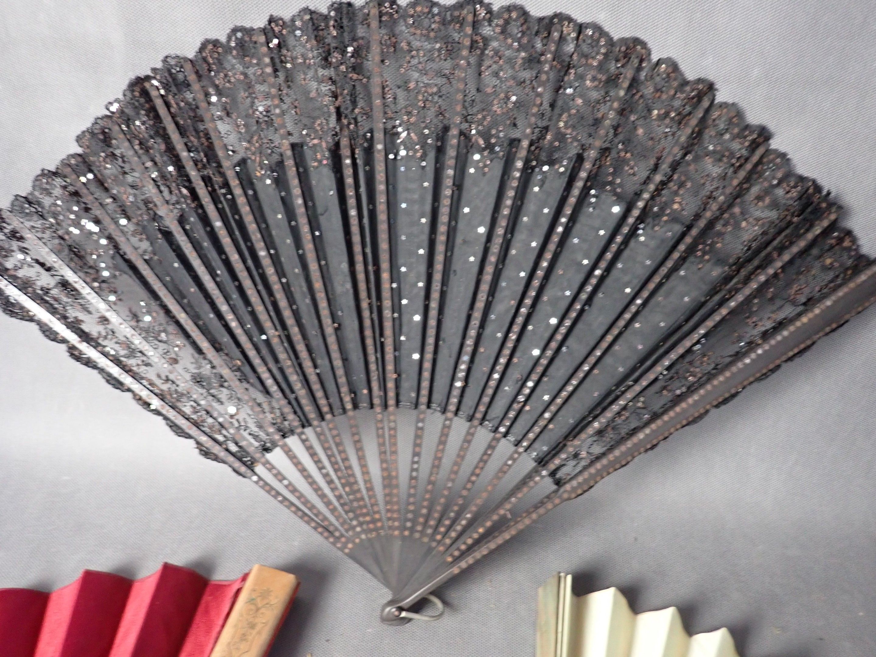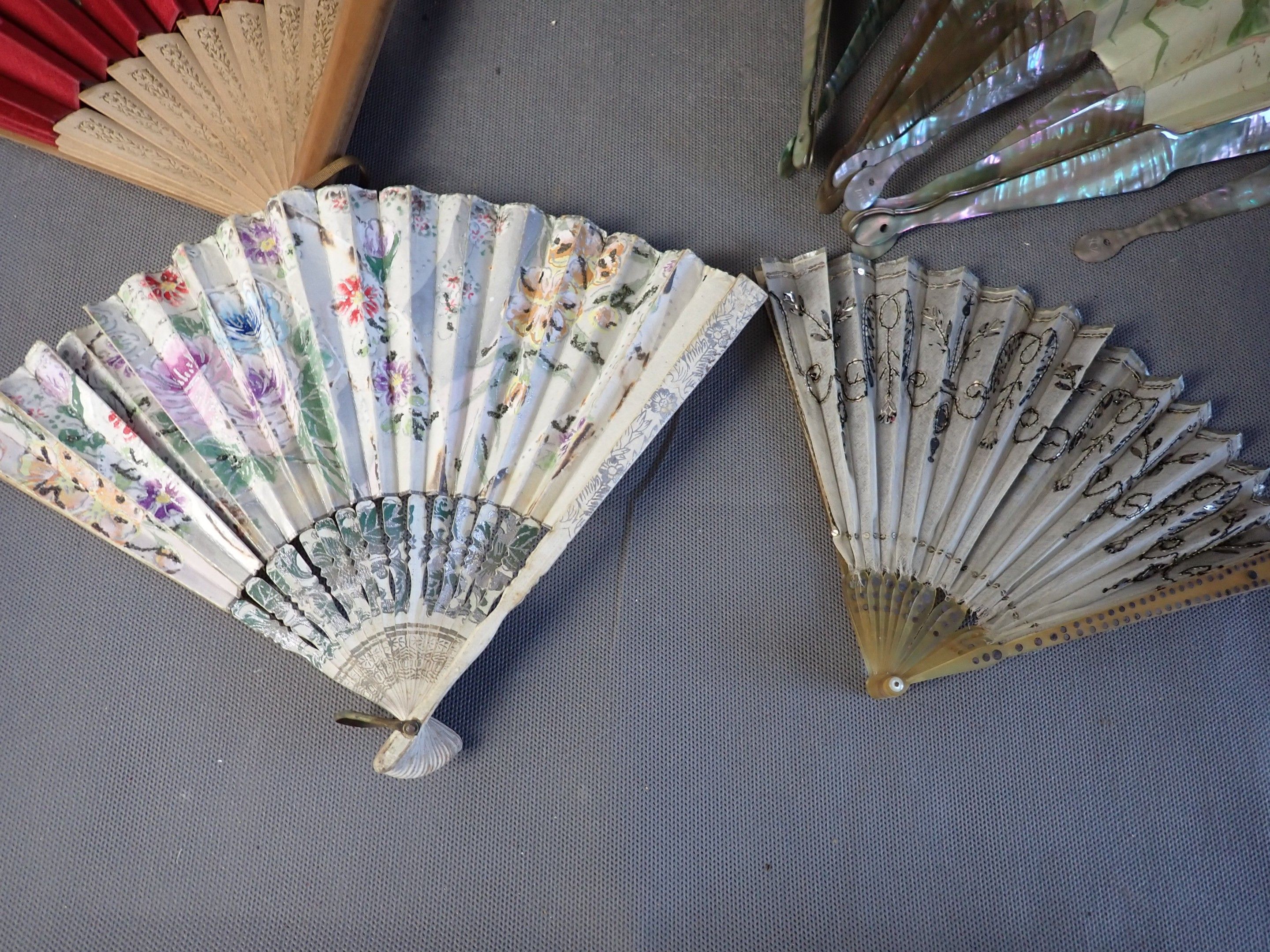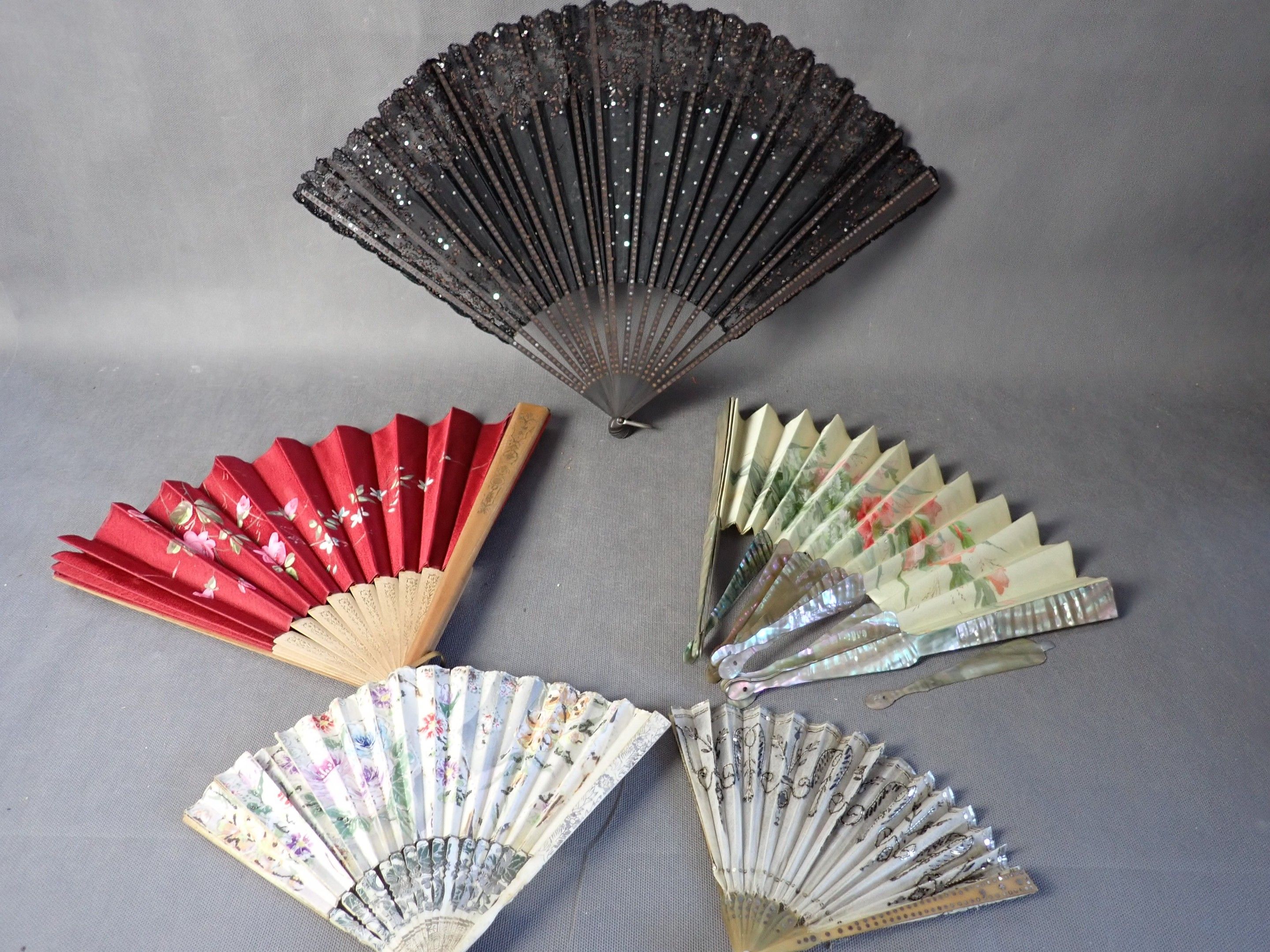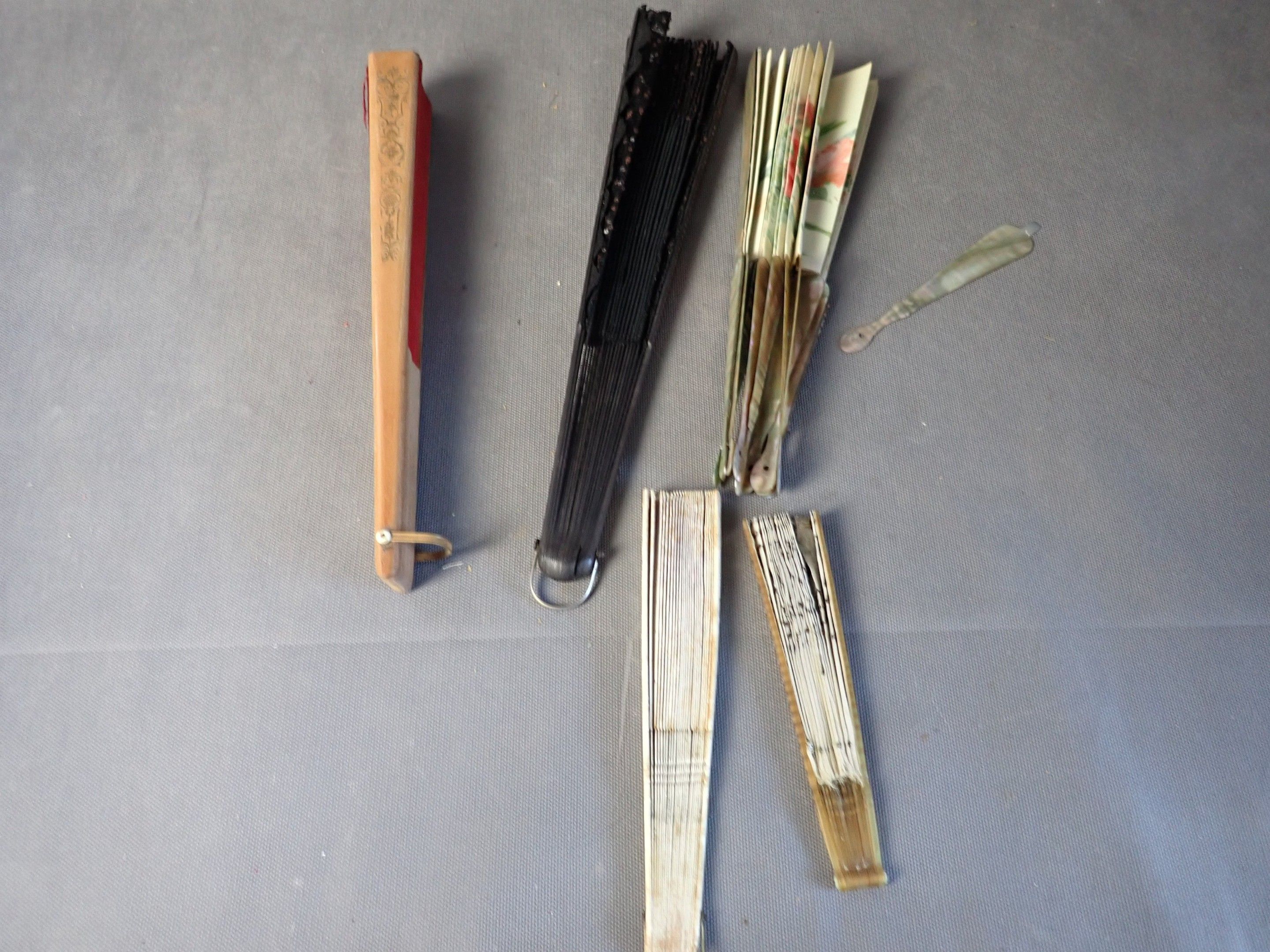 Lot comprising a mother-of-pearl fan, a cardboard fan, a bone fan, a horn fan, a lace fan and a fabric and wood fan (accidents).