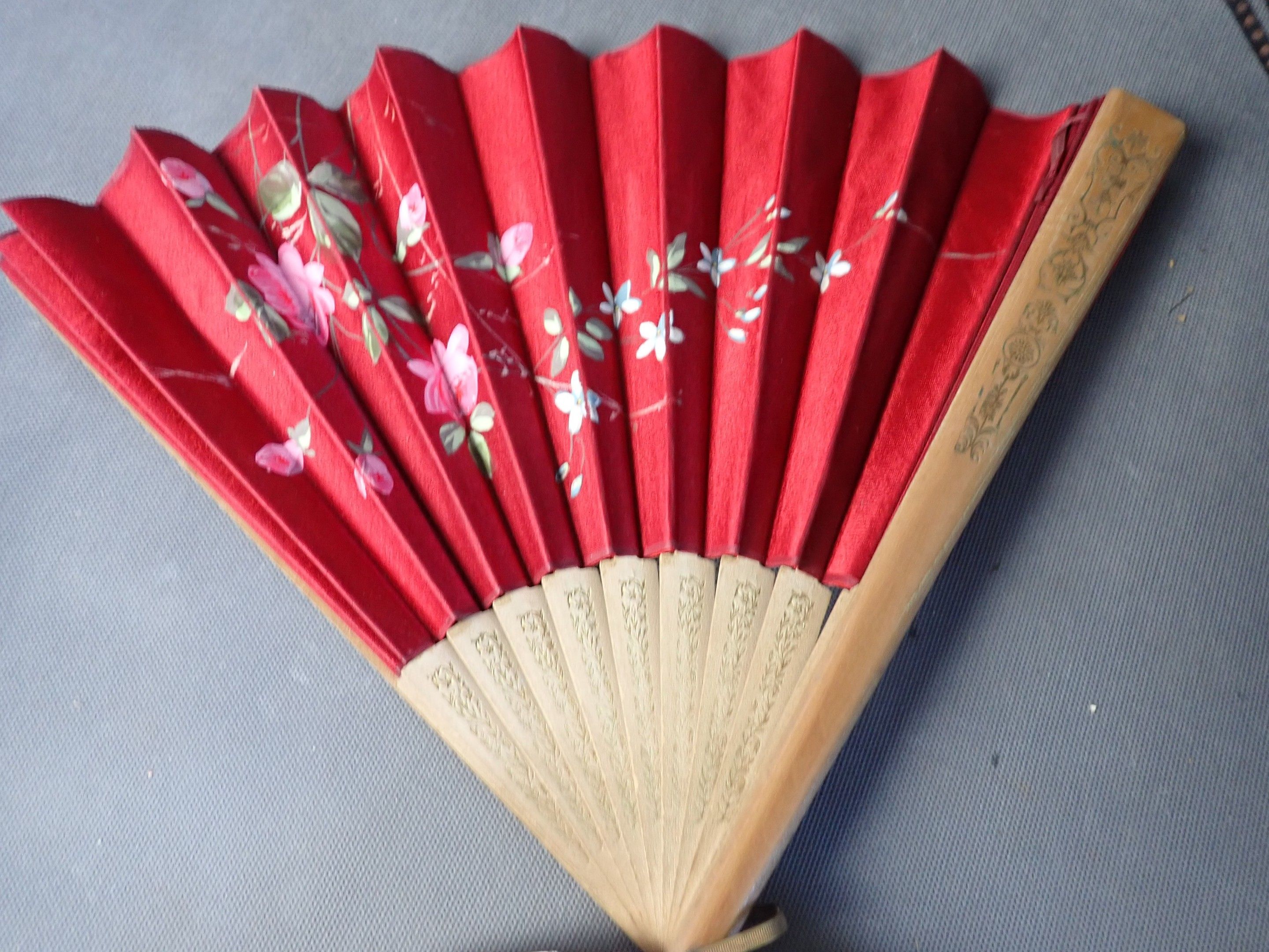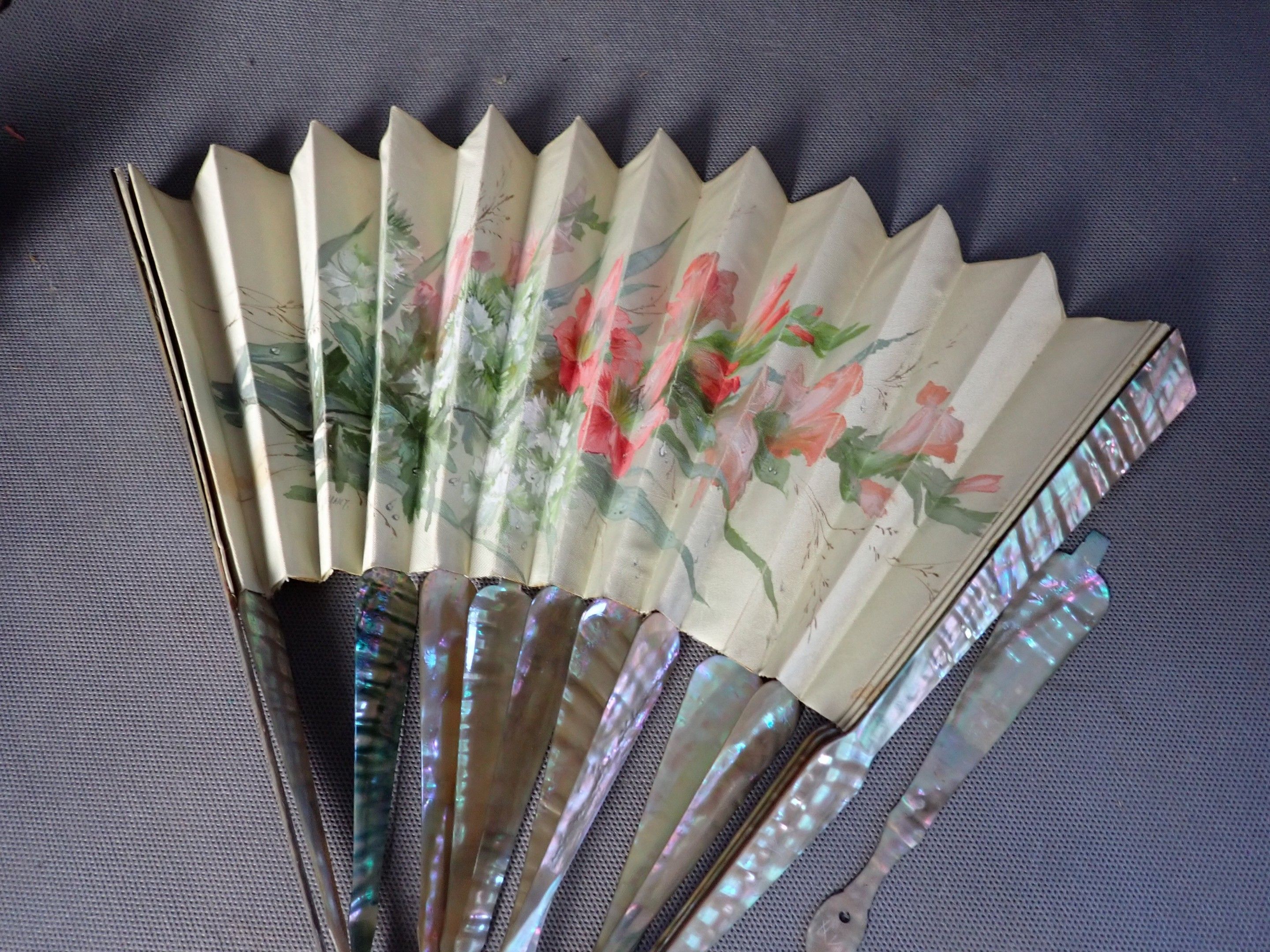 Lot comprising a mother-of-pearl fan, a cardboard fan, a bon…