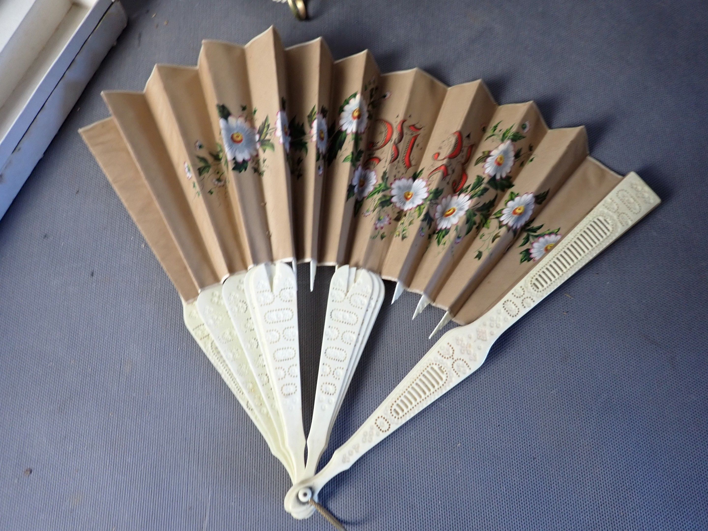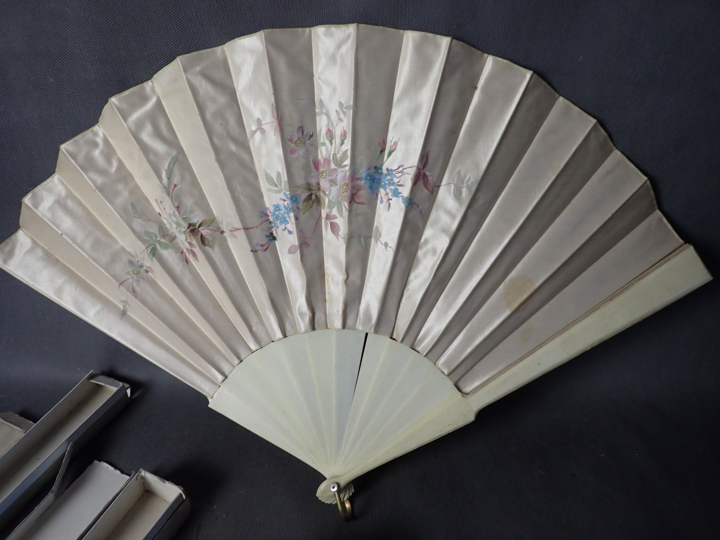 Set of 2 bone sprig and plume fans, painted silk leaves, one…