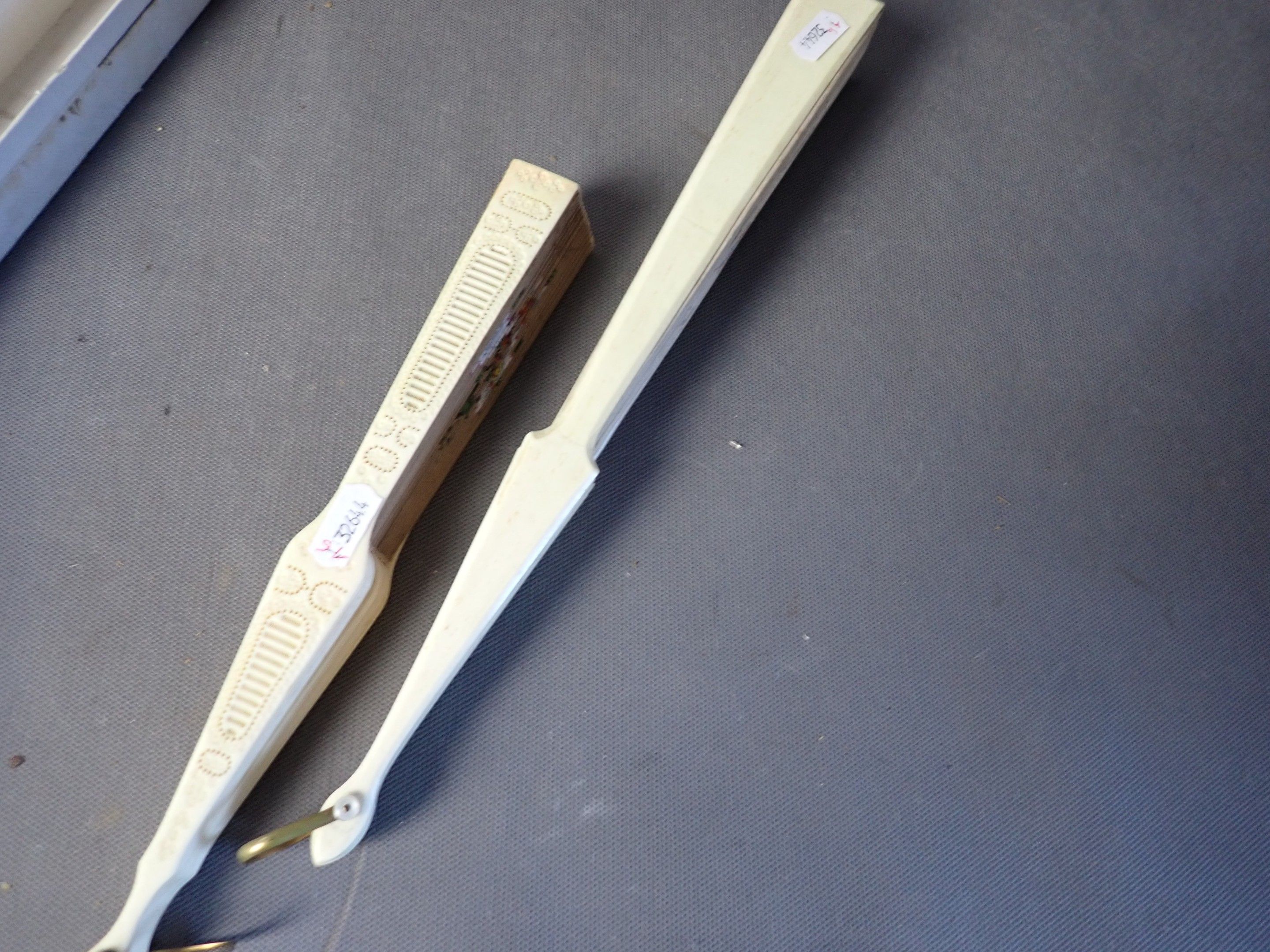 Set of 2 bone sprig and plume fans, painted silk leaves, one damaged