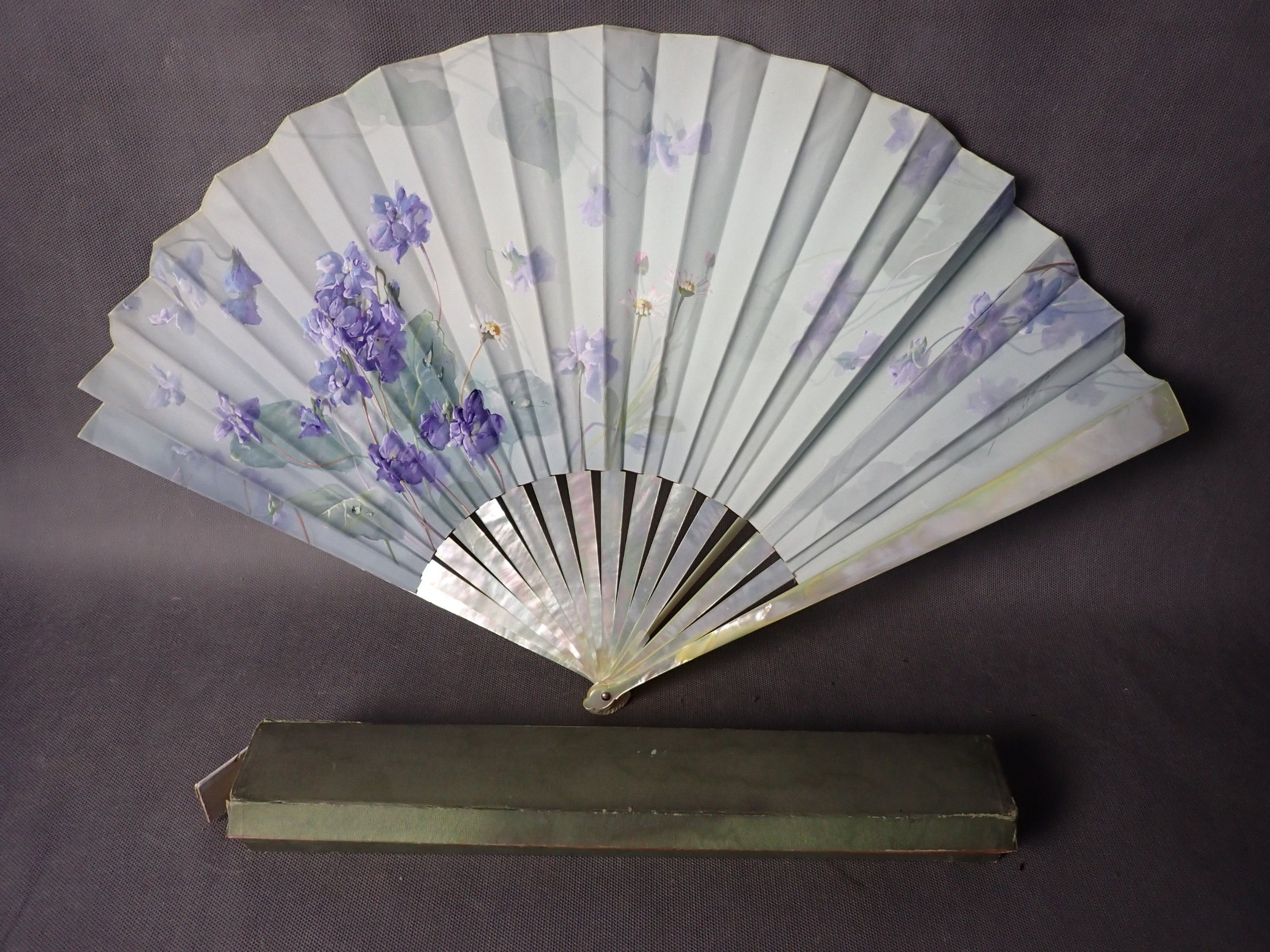 Large mother-of-pearl fan with painted leaves, signed GILLE,…