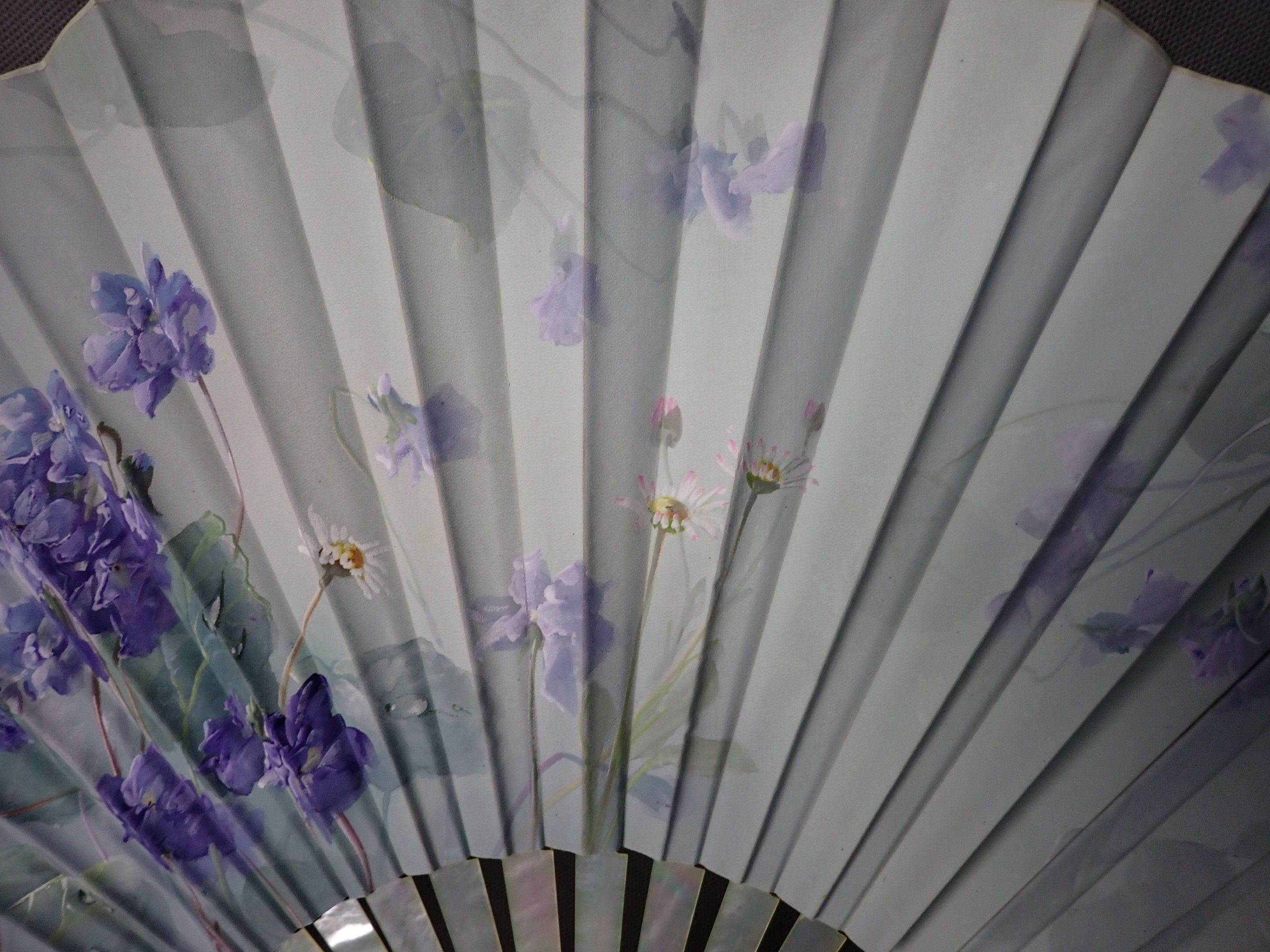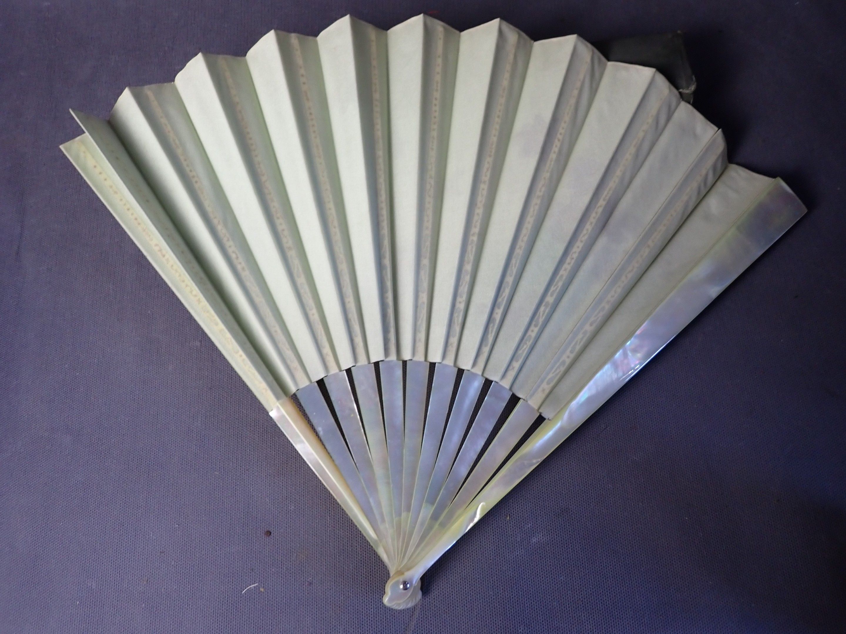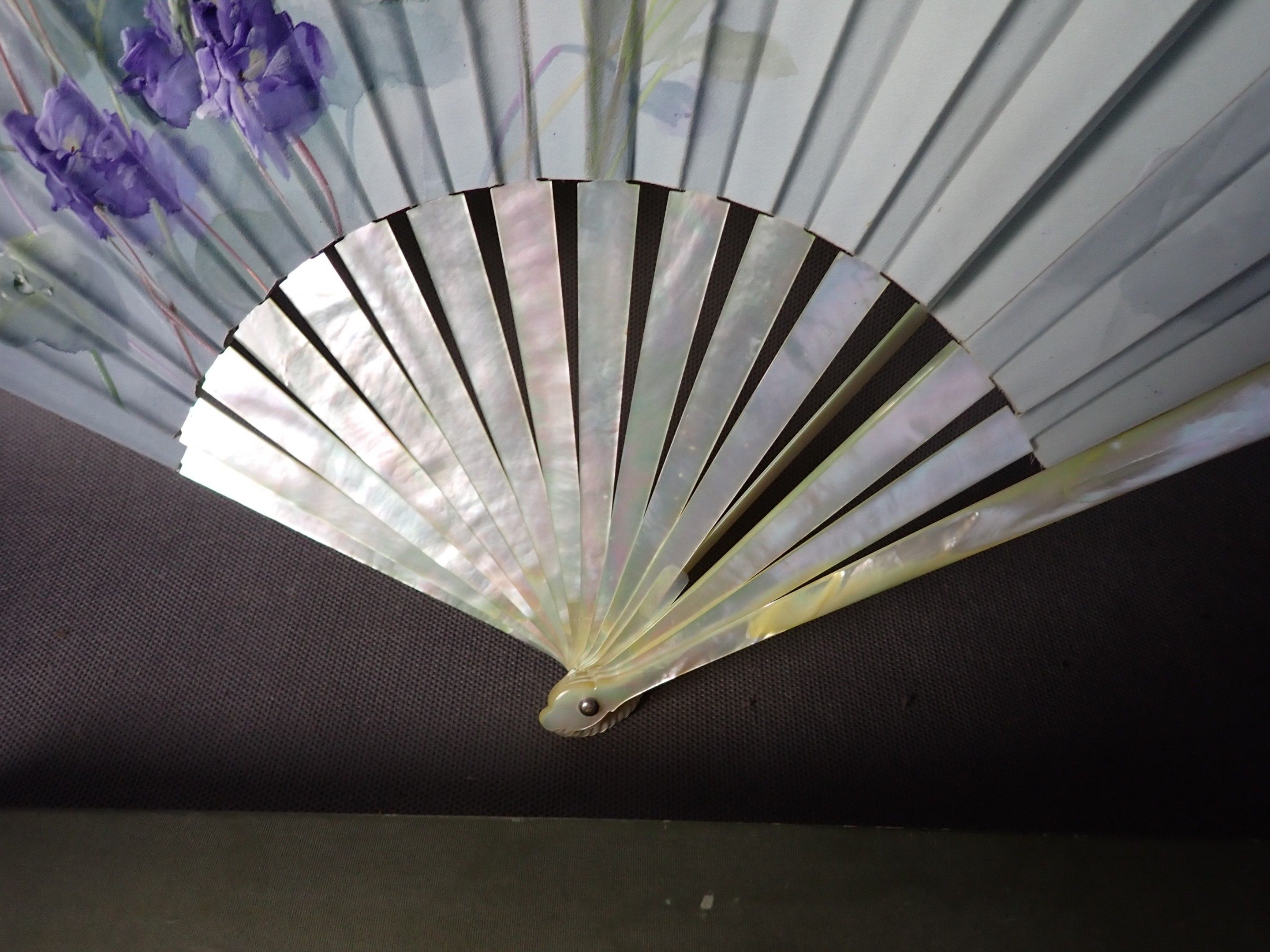 Large mother-of-pearl fan with painted leaves, signed GILLE, 35x60 cm (strand to be reattached)