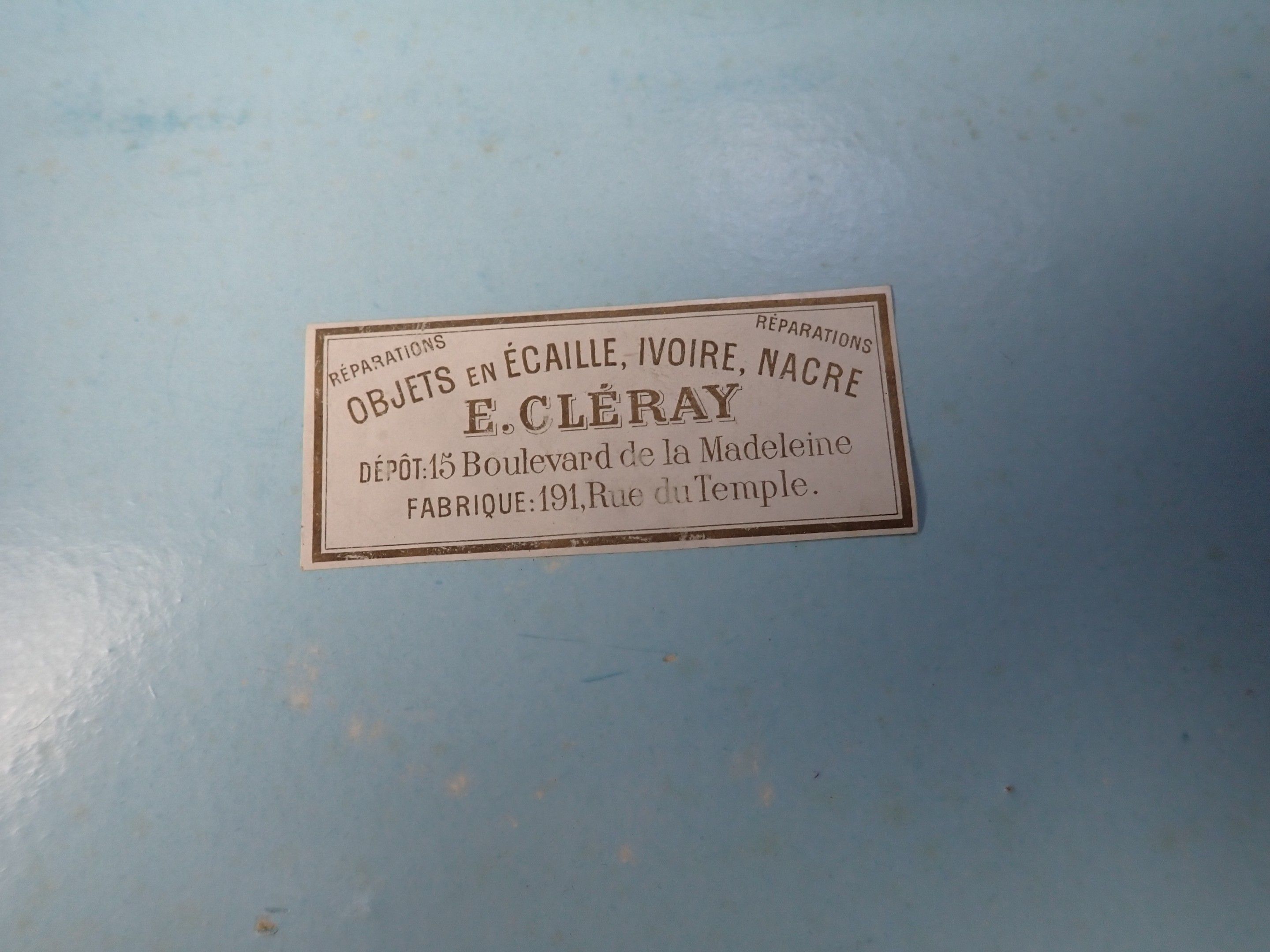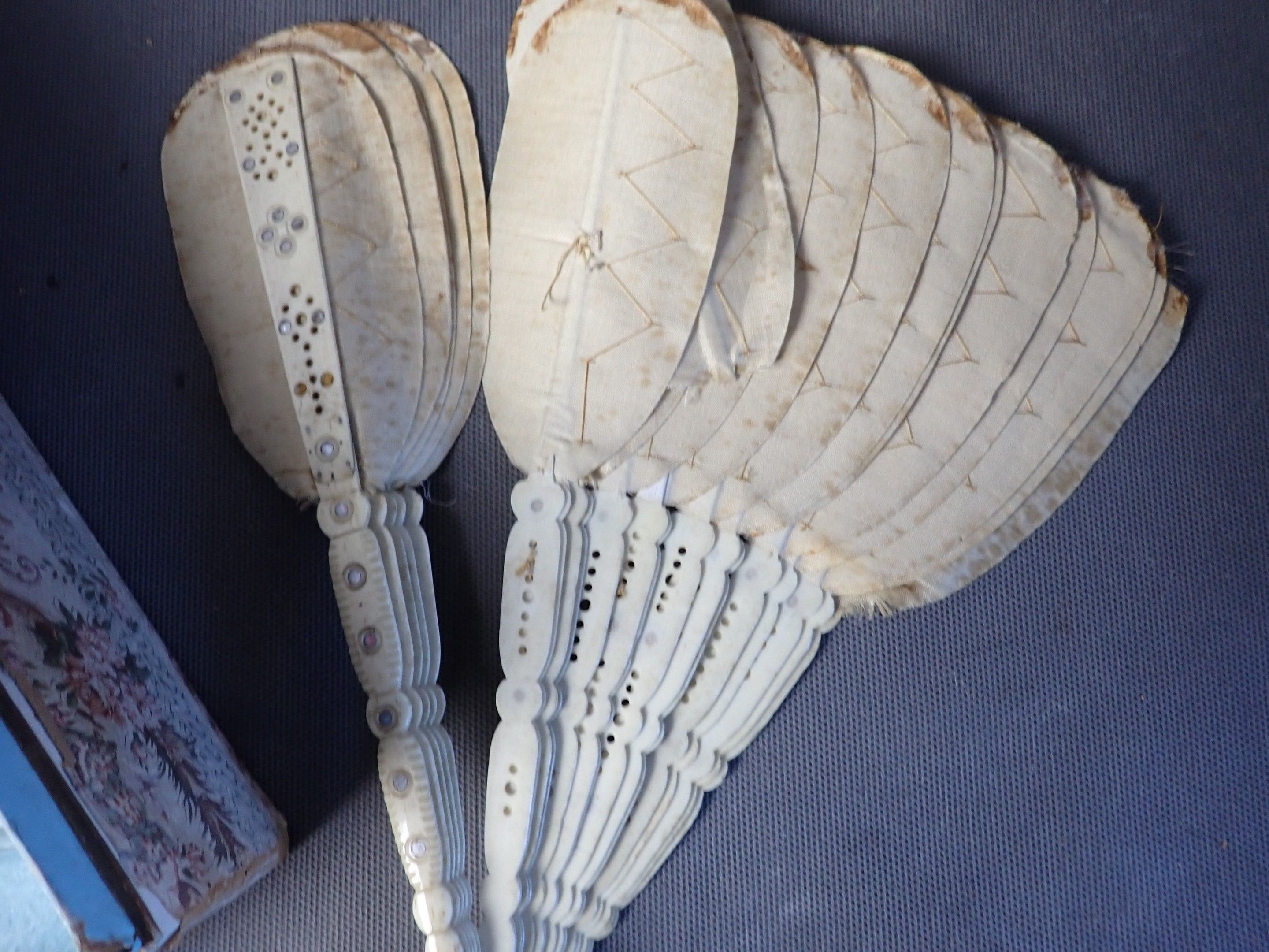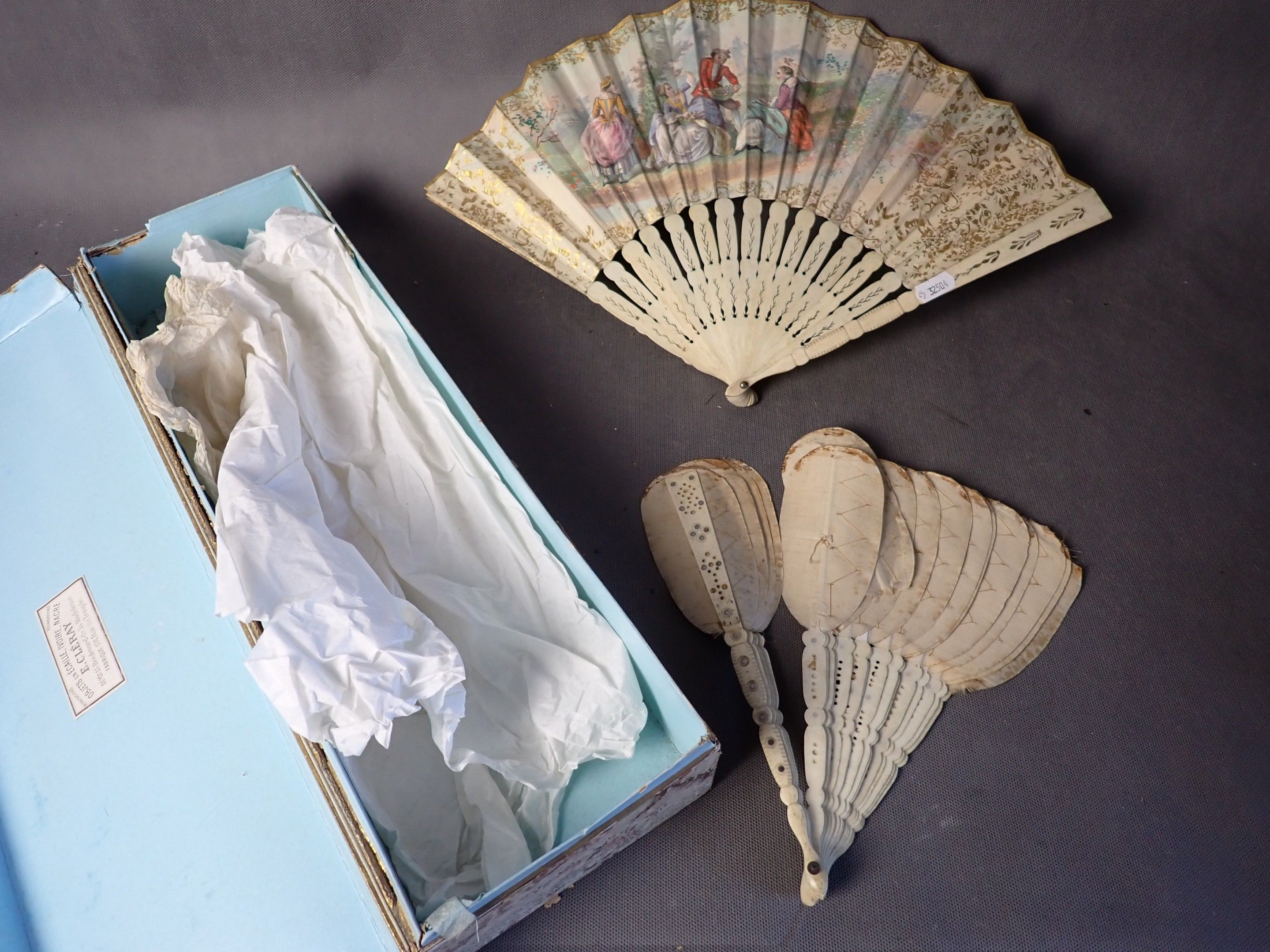 Bone fan, decorated with a galant scene, 26.5x50 cm, a second damaged fan and 1 box are attached.