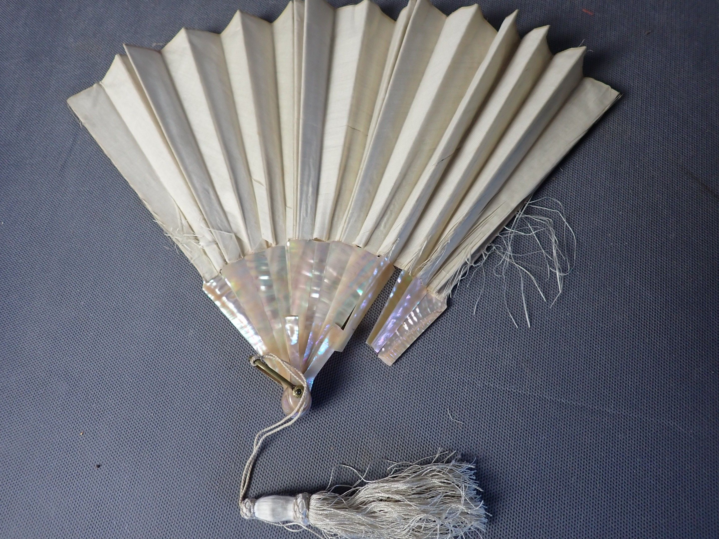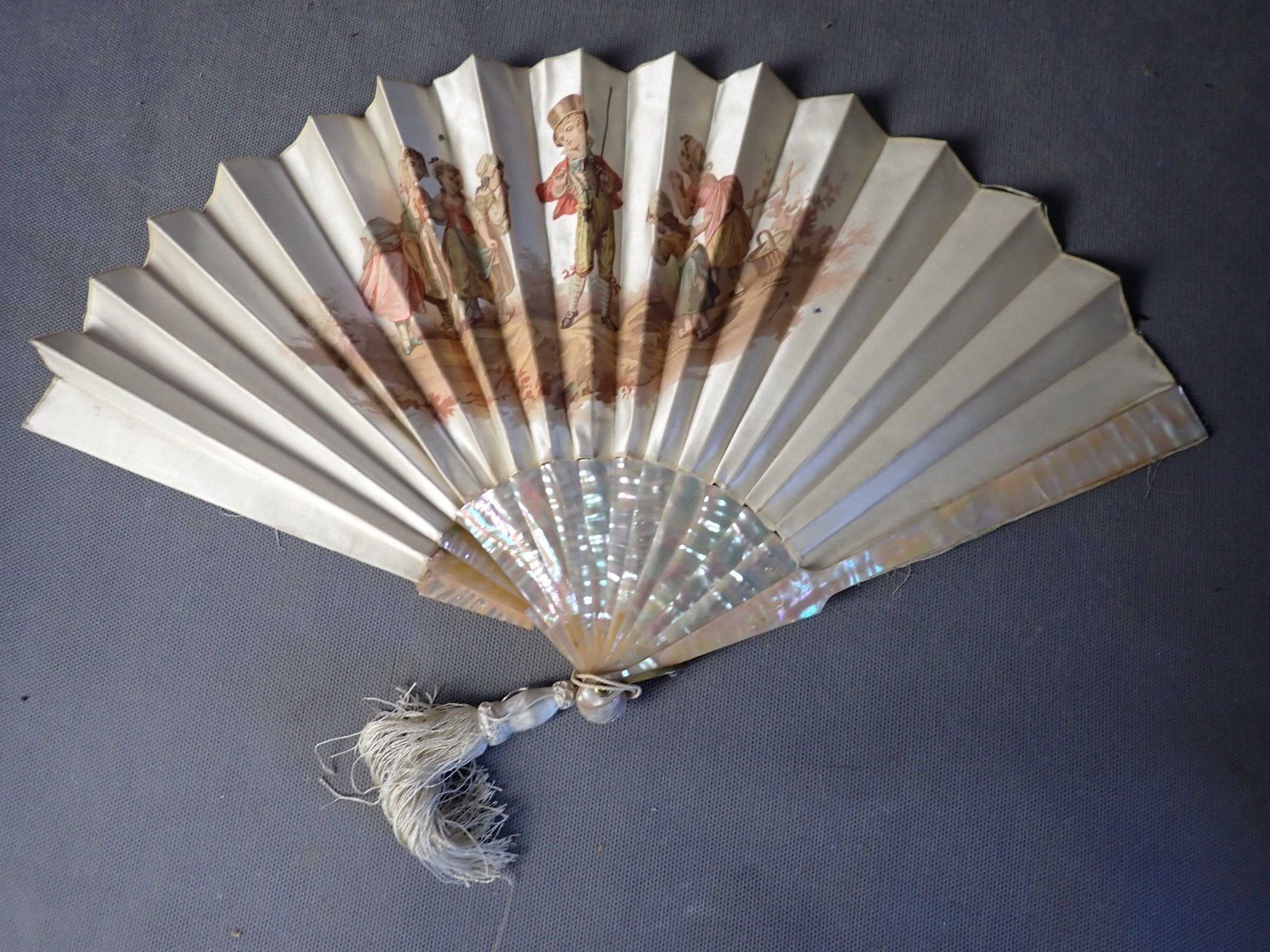 Mother-of-pearl fan, decorated with a scene of children, H 25.5 cm (damage to 3 strands)