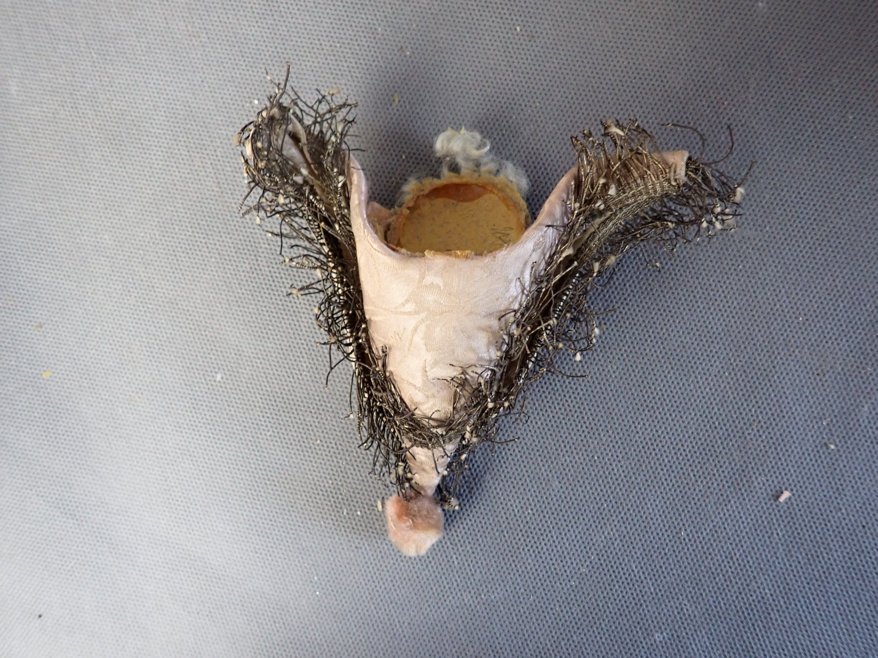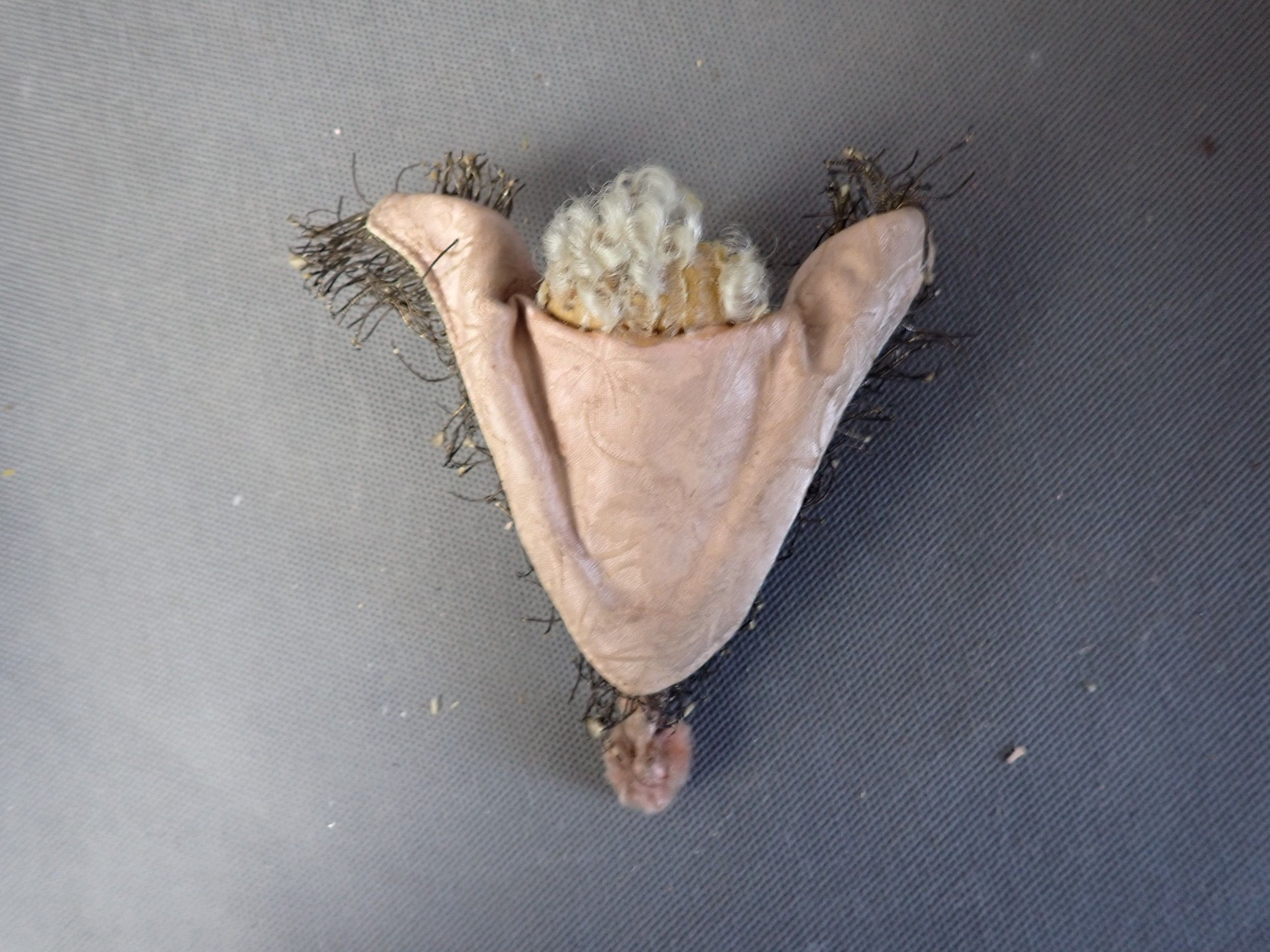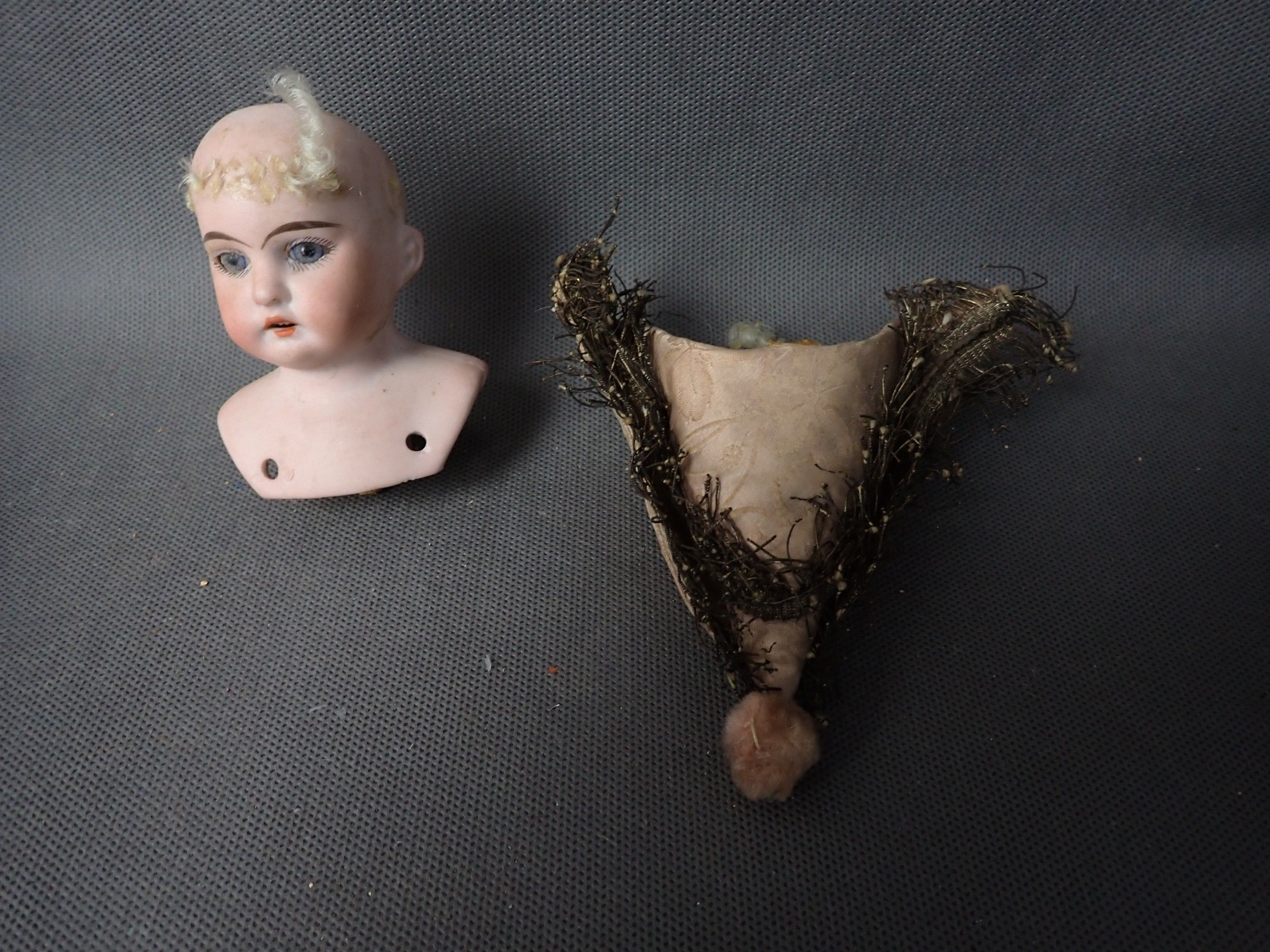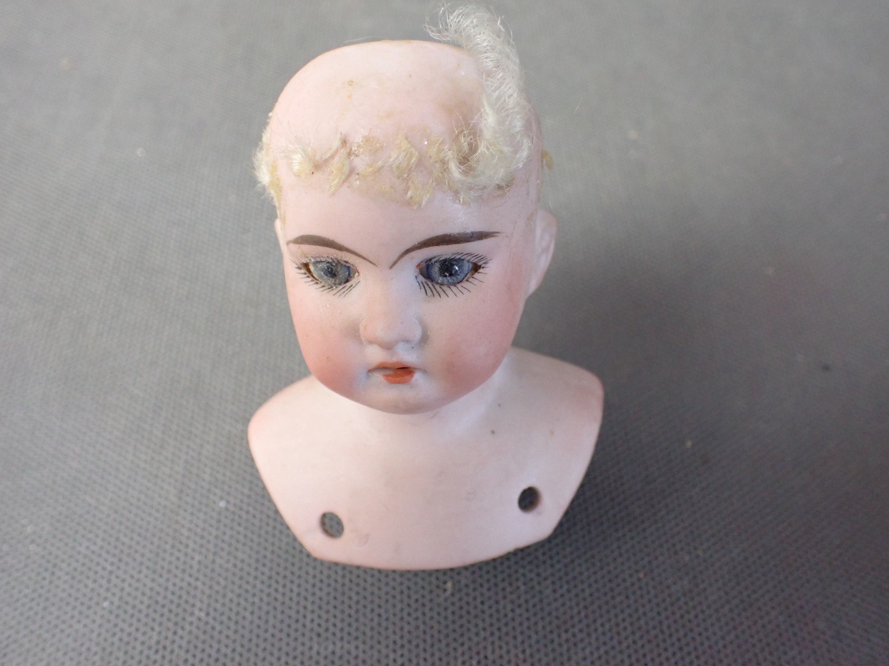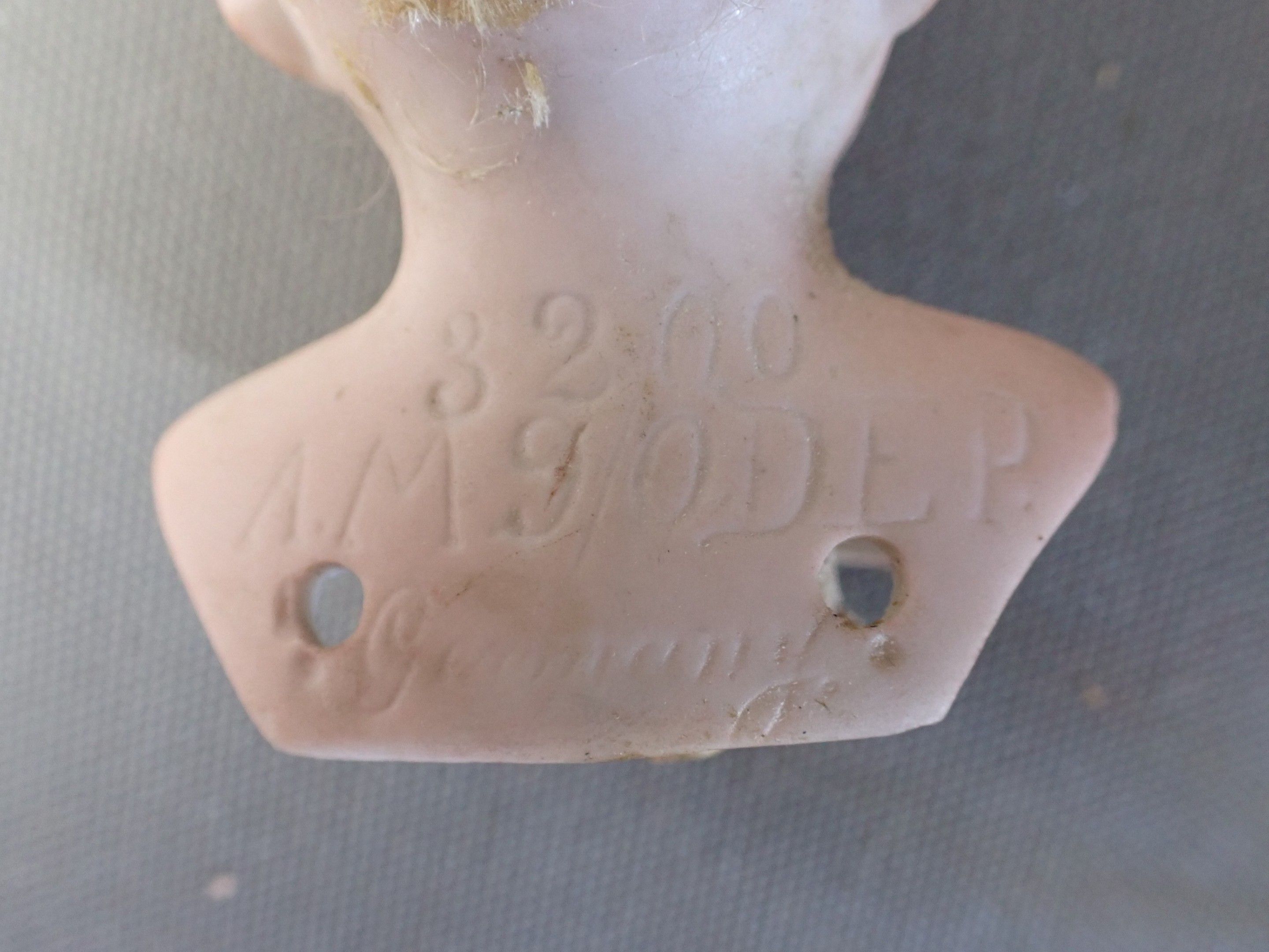 A. M .ODEP GERMANY Porcelain doll's head, open mouth, sulphide eyes, marked on the back "3200 A.M.9/O.DEP.Germany", H 8 cm, 1 hat attached