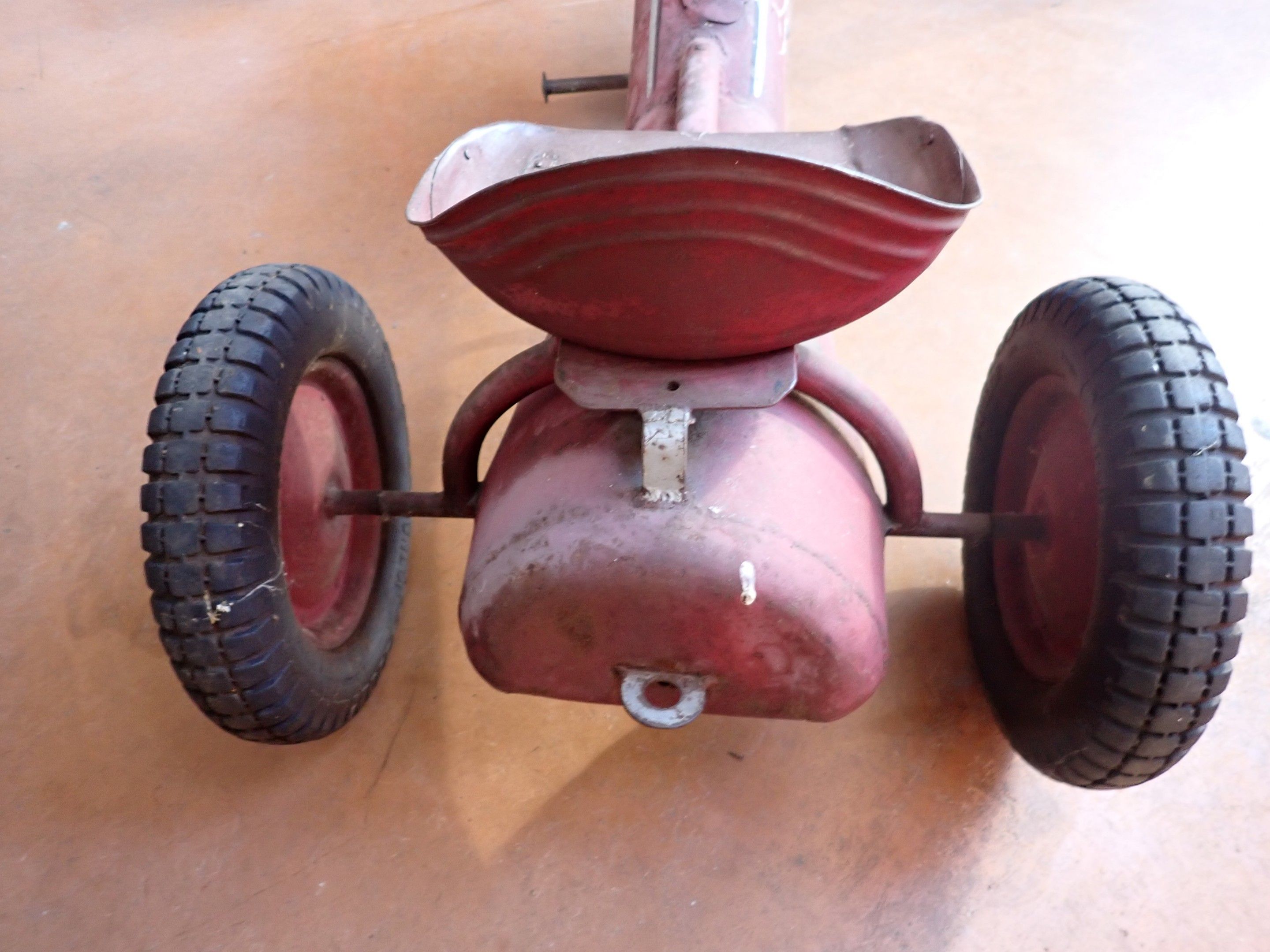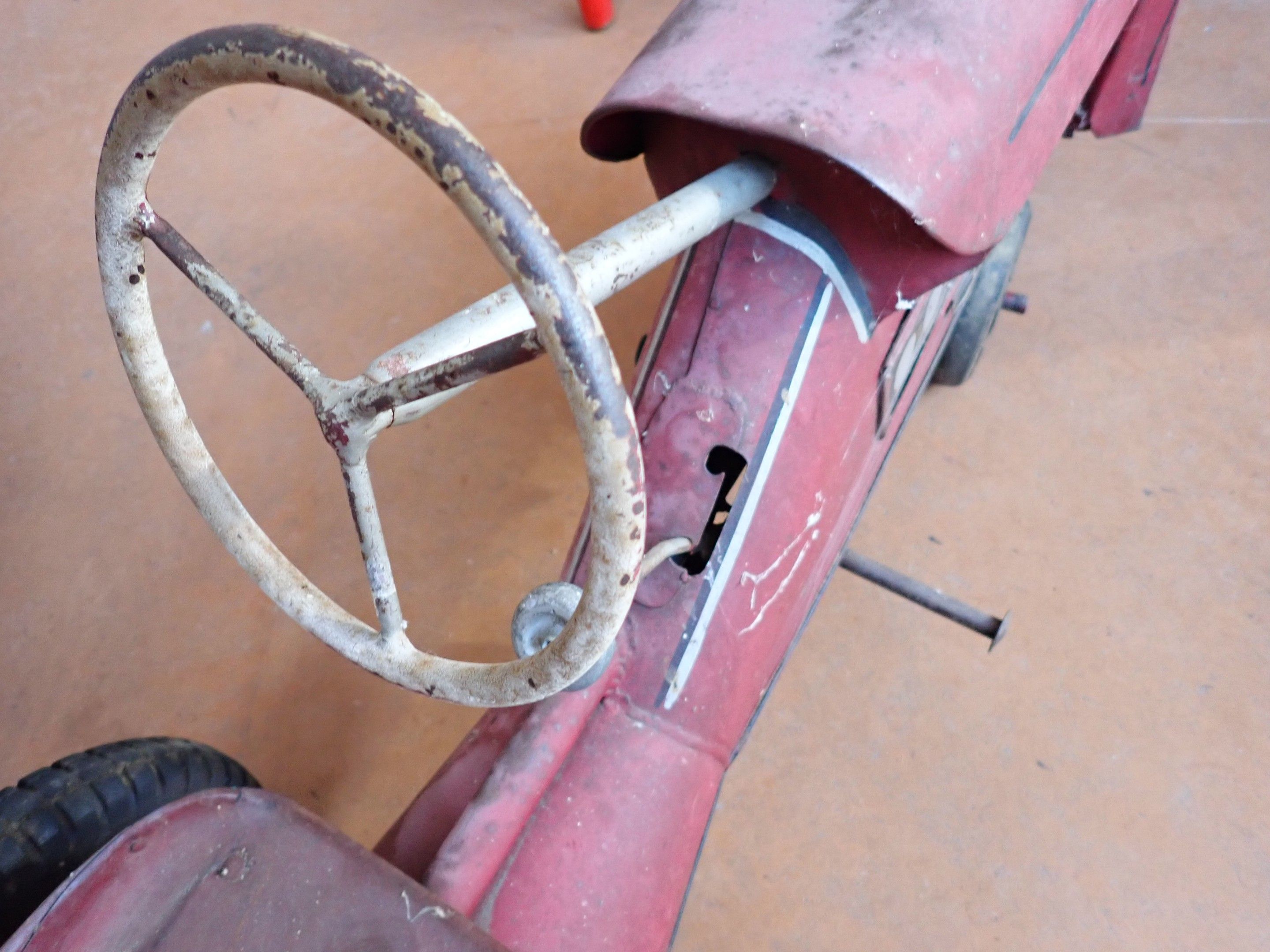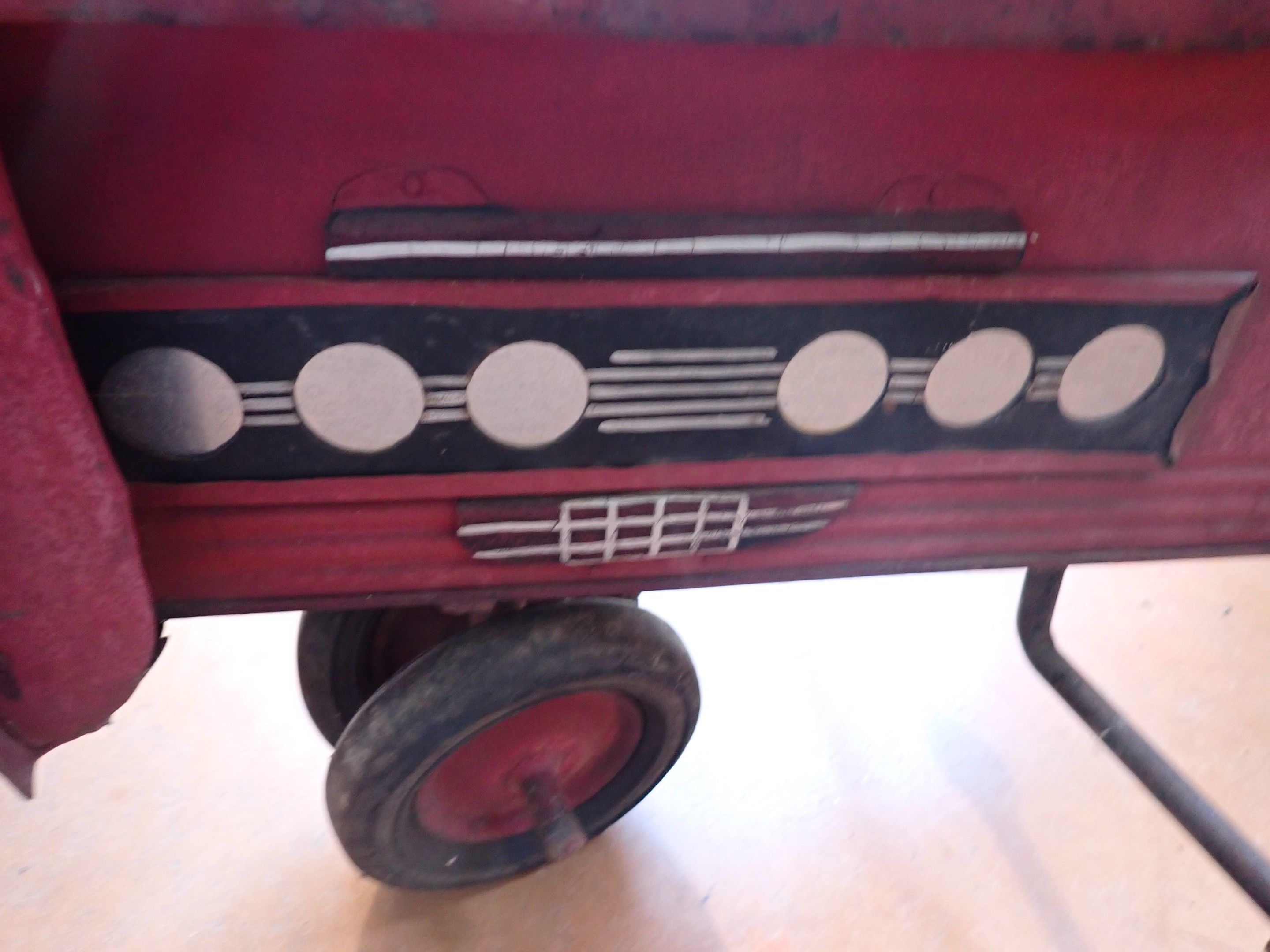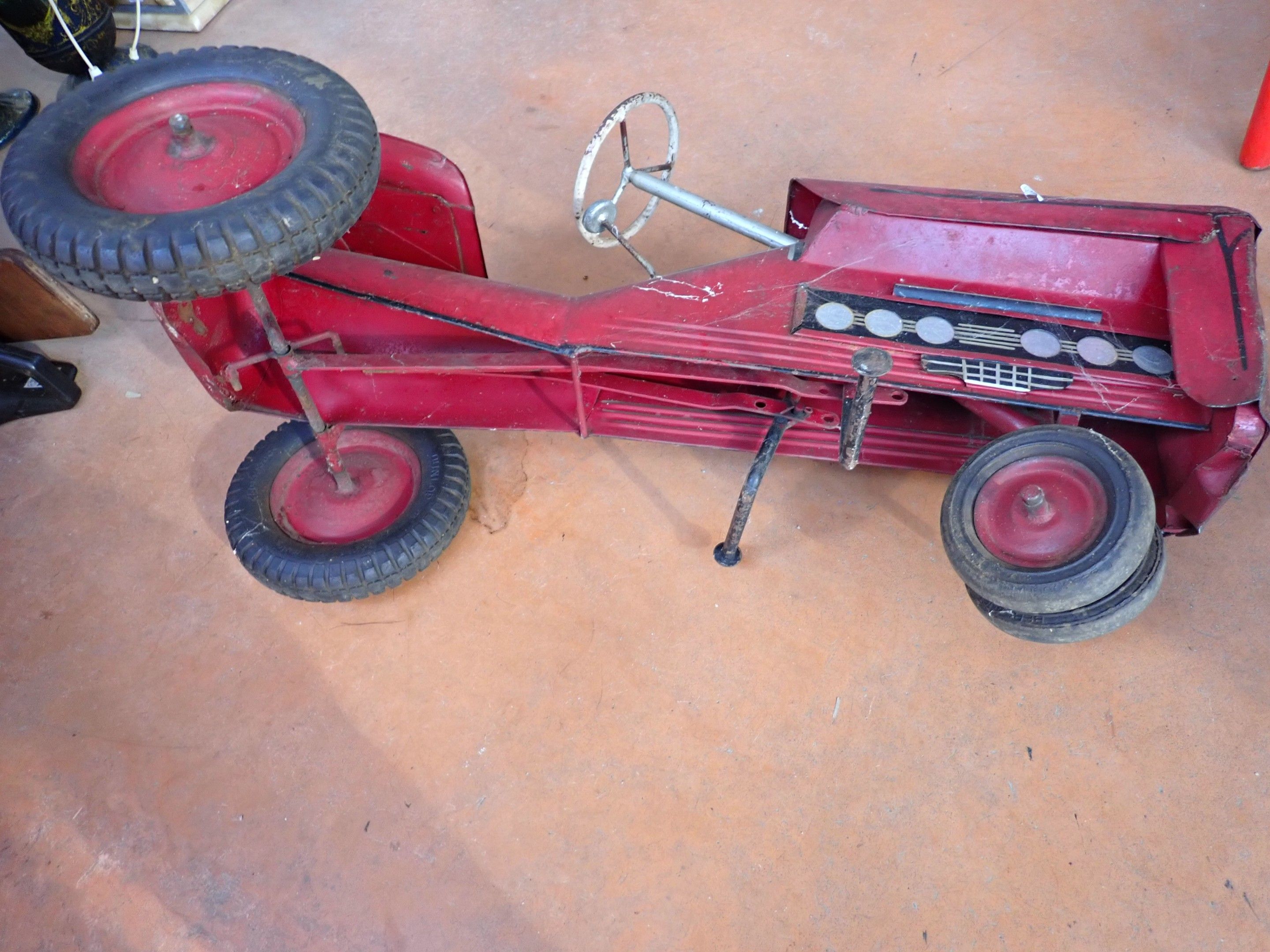 Pedal tractor in painted sheet metal, 90 cm long (oxidation and dents)