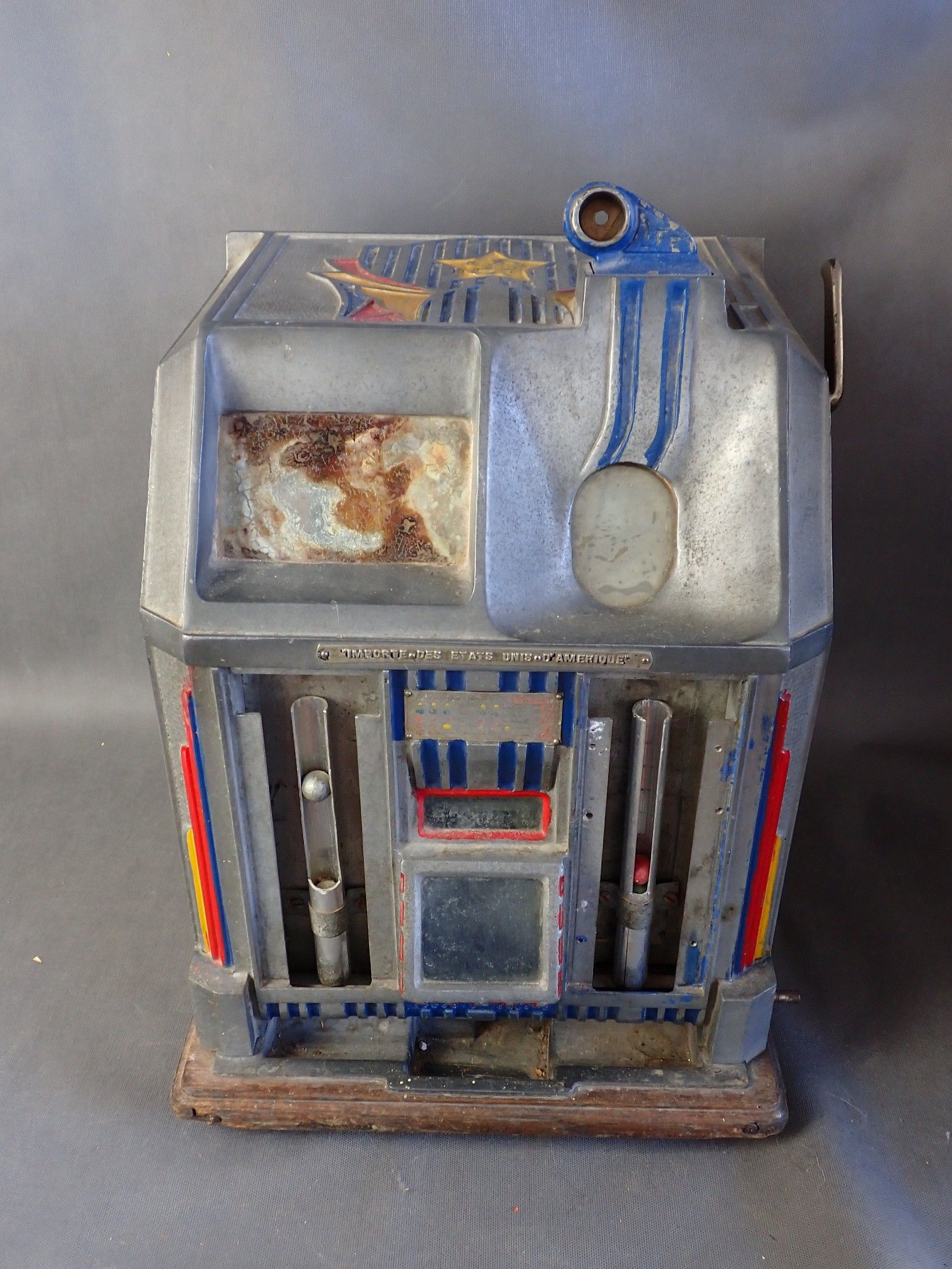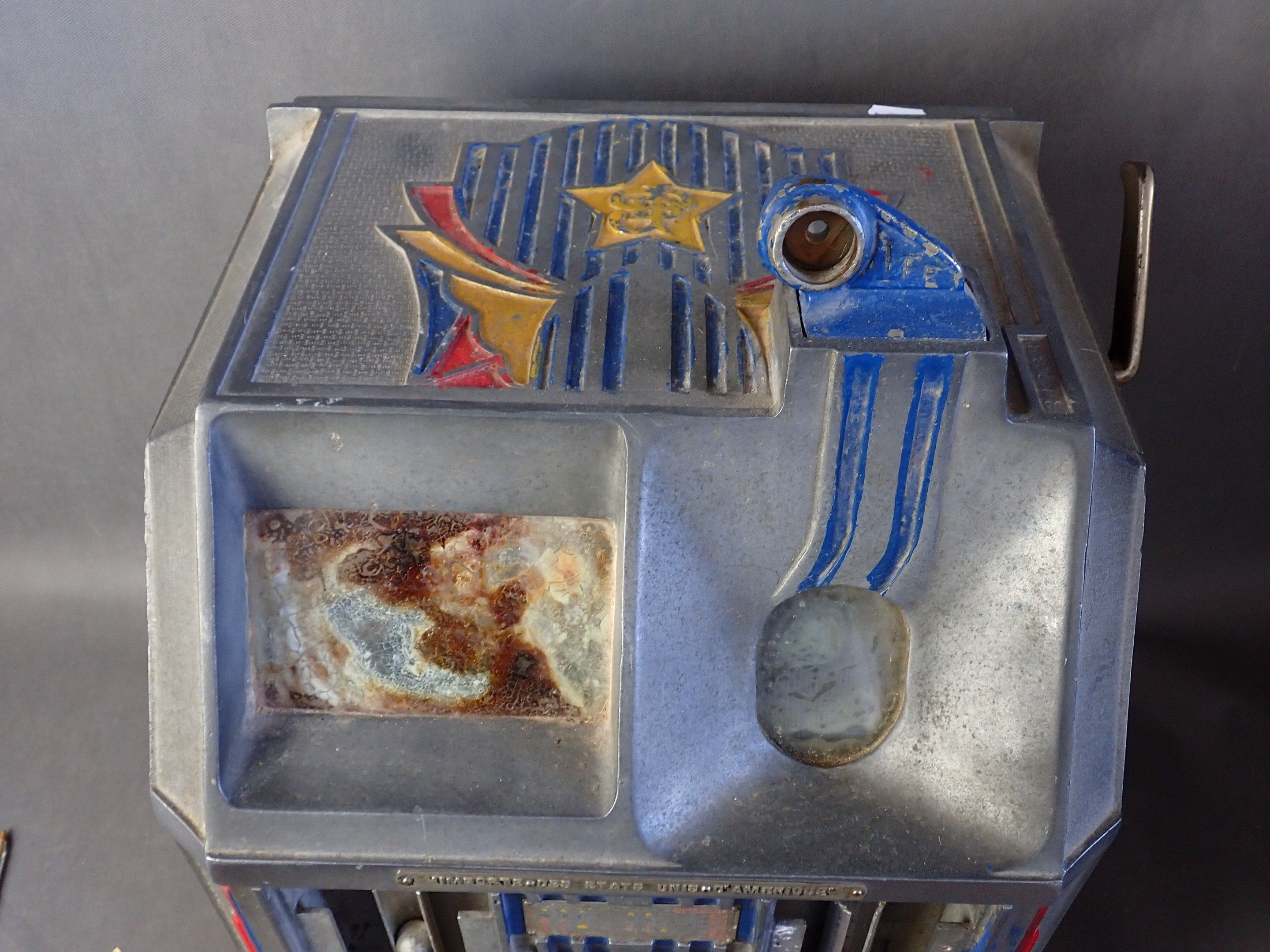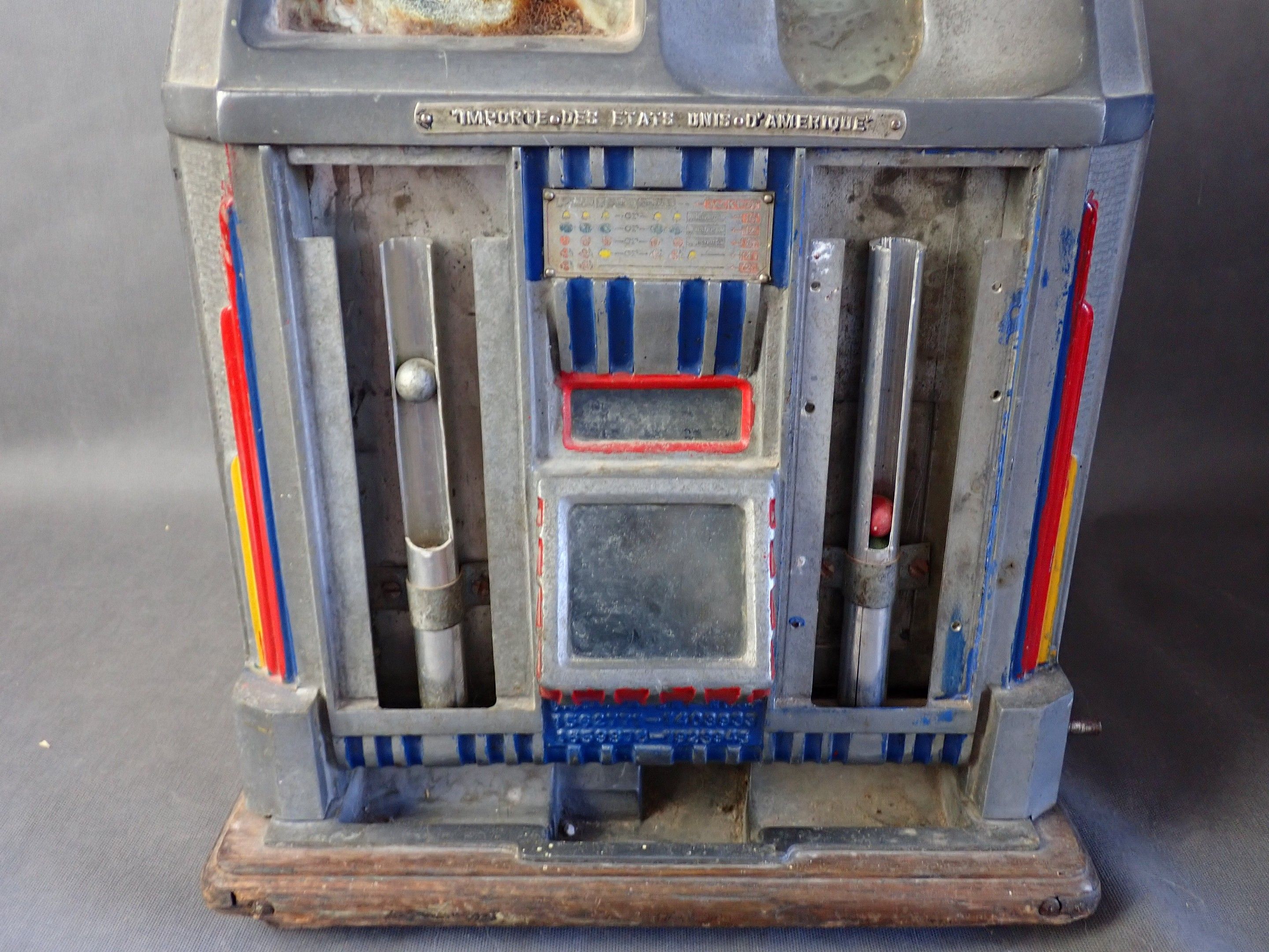 Painted cast-iron three-roller coin-operated machine 38 x 33 cm. H. 48 cm with a set of tokens (missing and damaged)