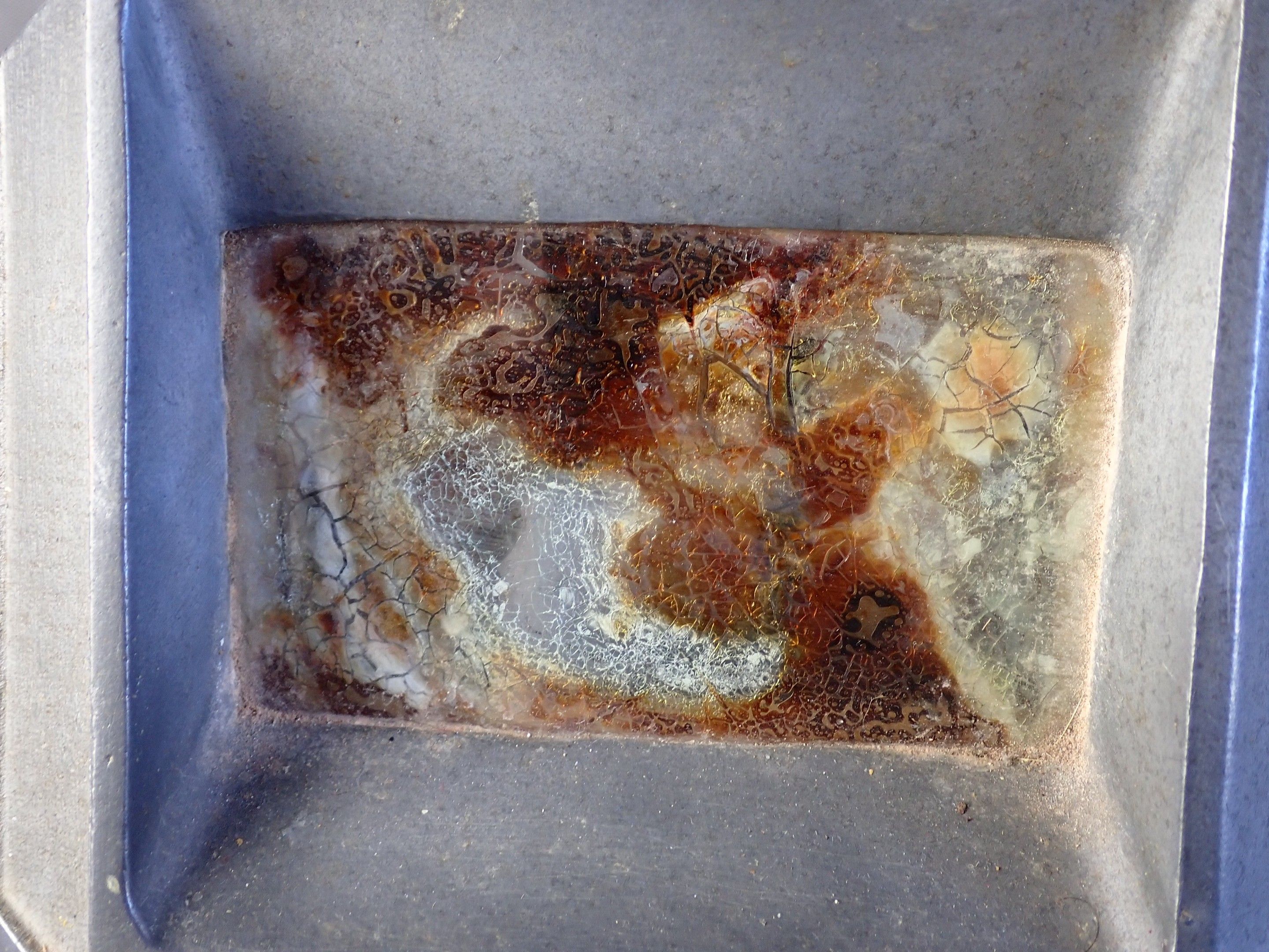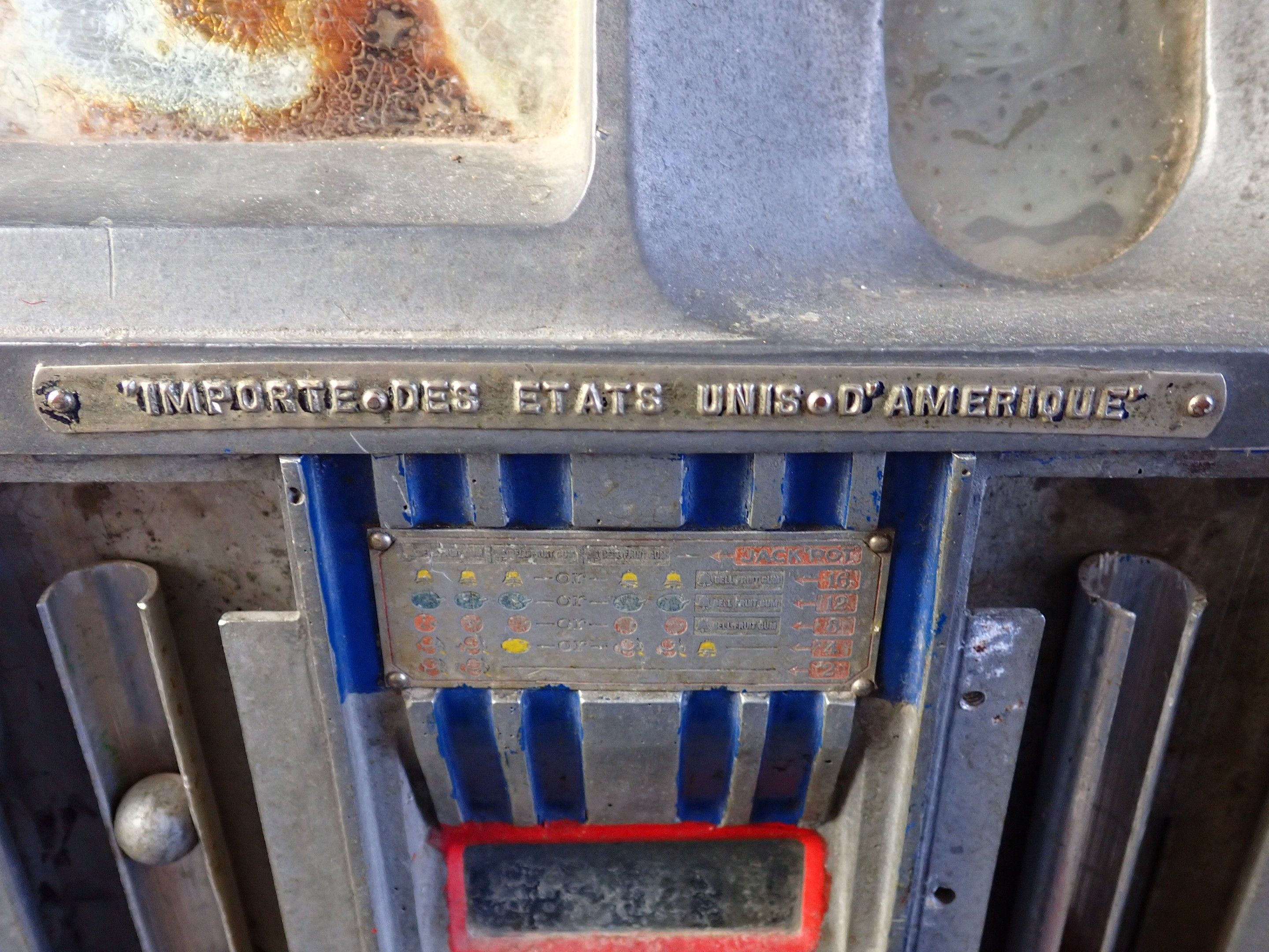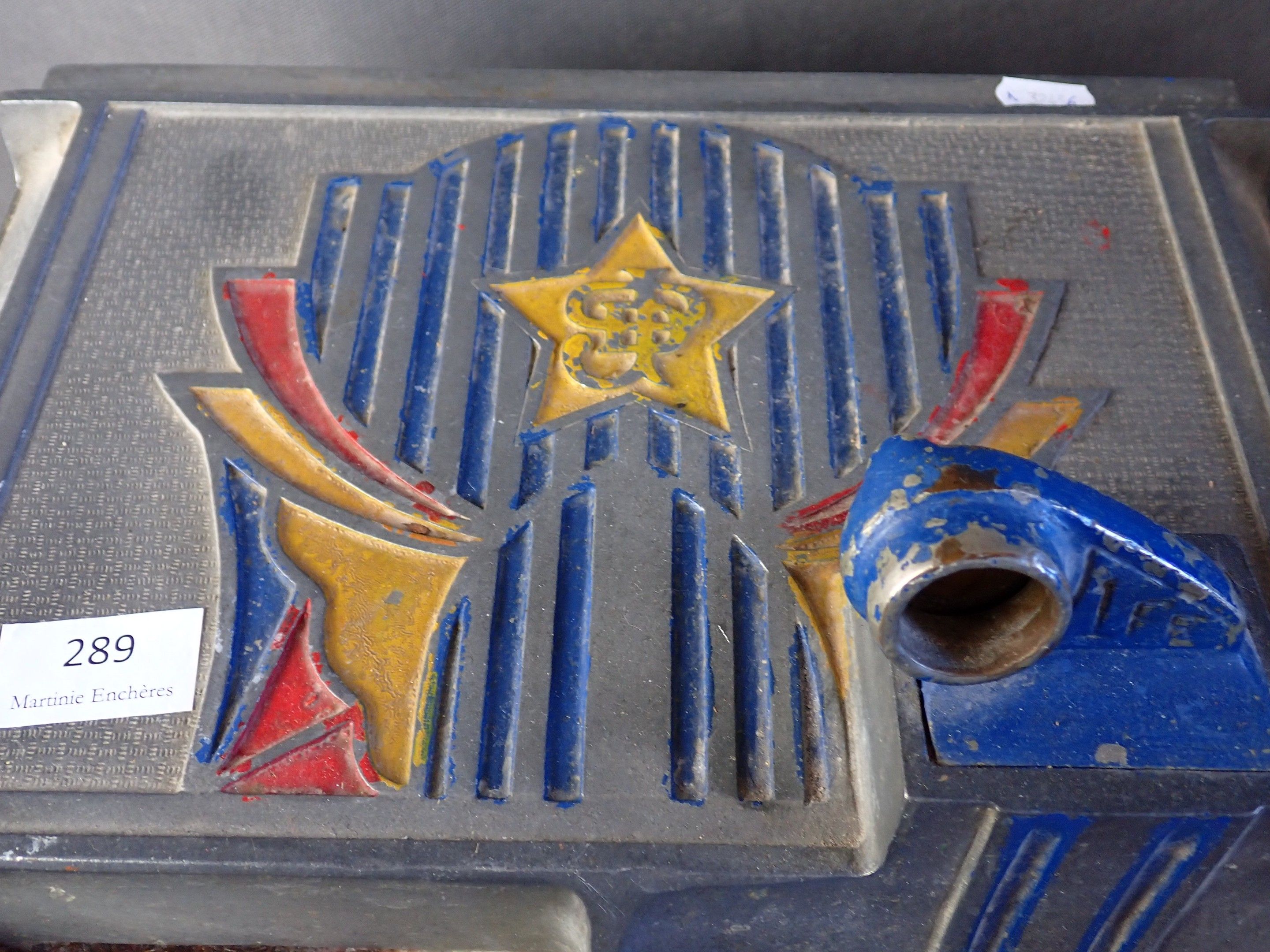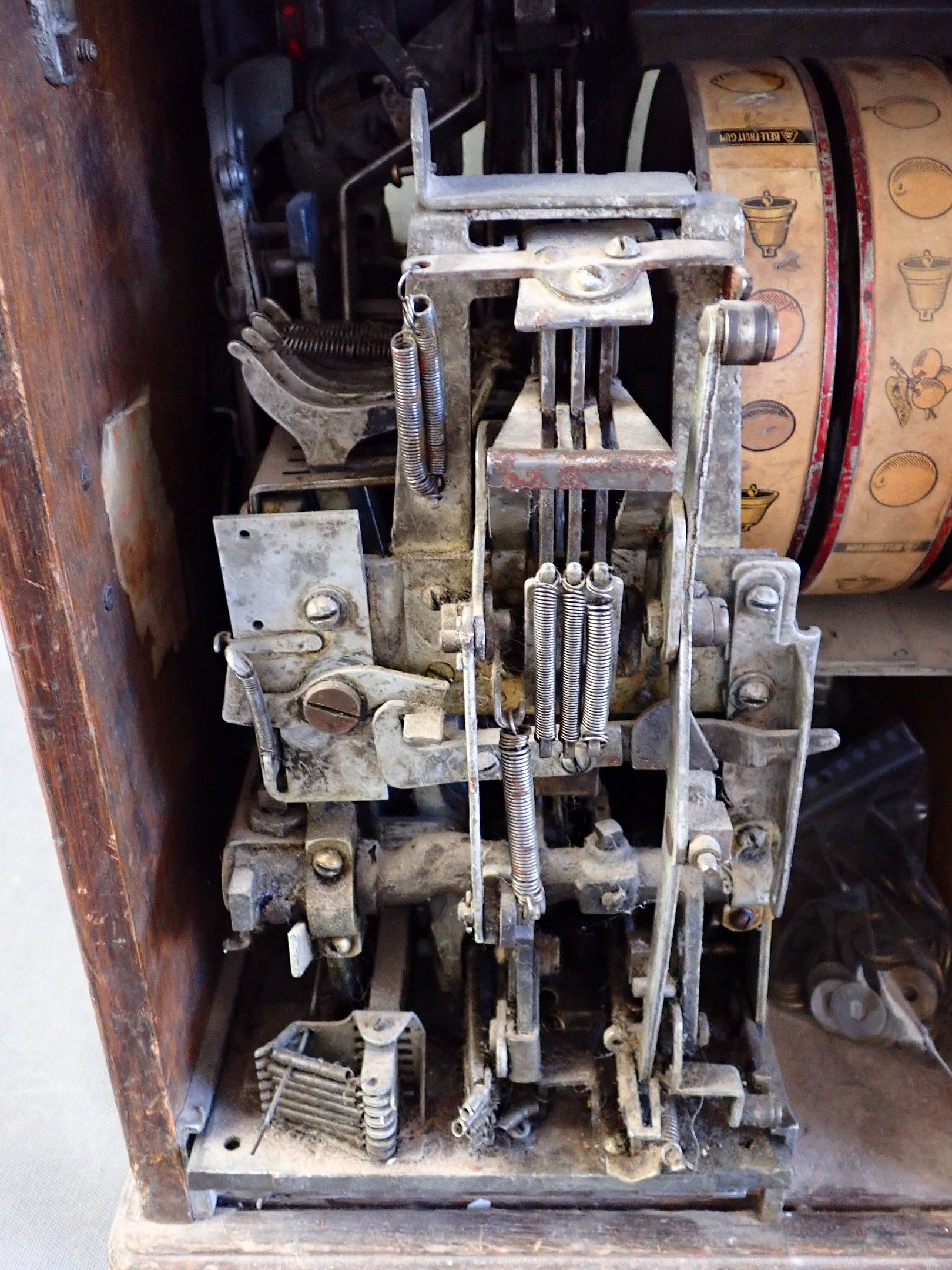 Painted cast-iron three-roller coin-operated machine 38 x 33 cm. H. 48 cm with a set of tokens (missing and damaged)