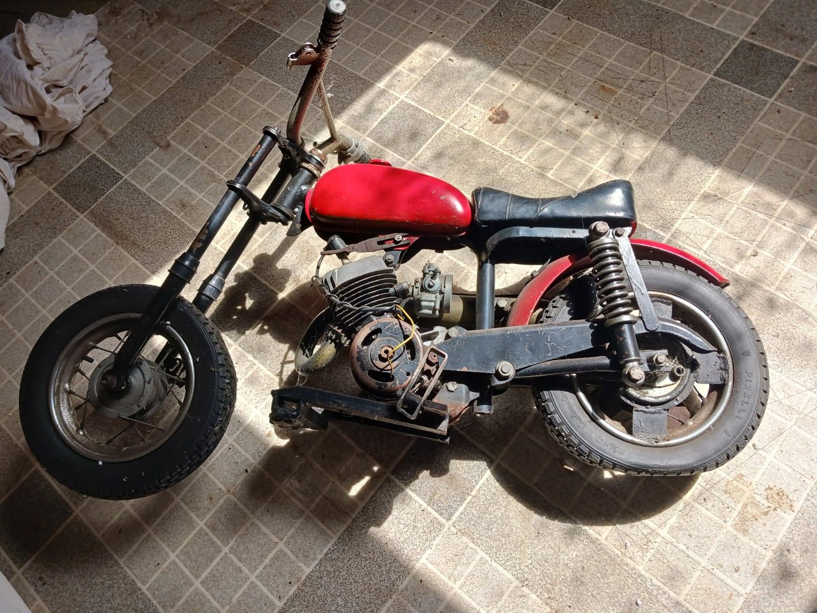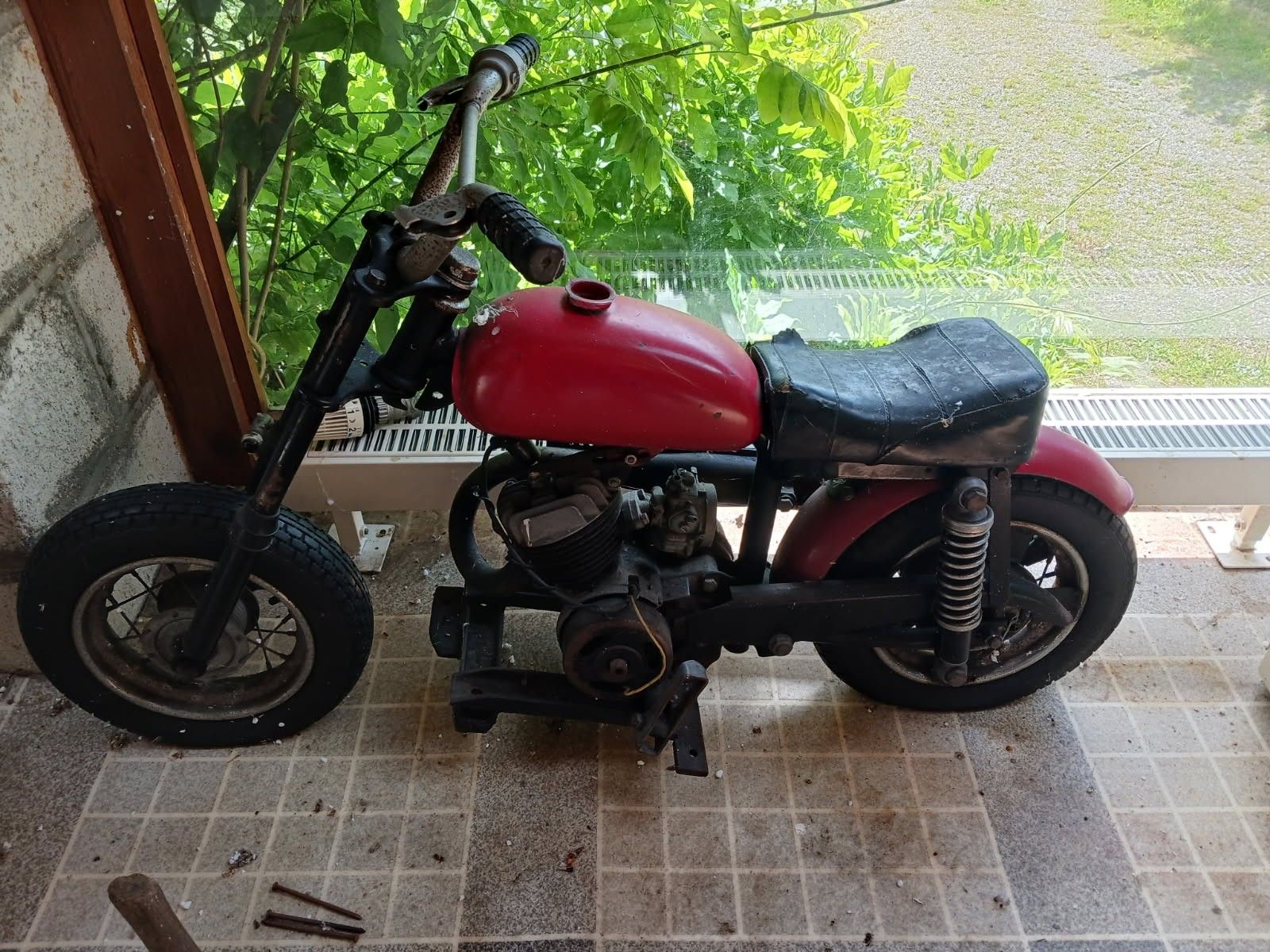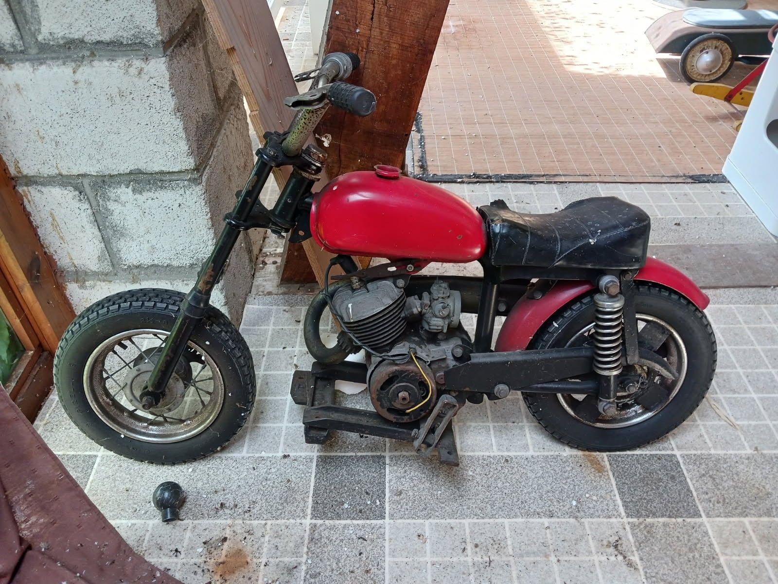 Red merry-go-round motorbike, with engine, length 105cm, H.