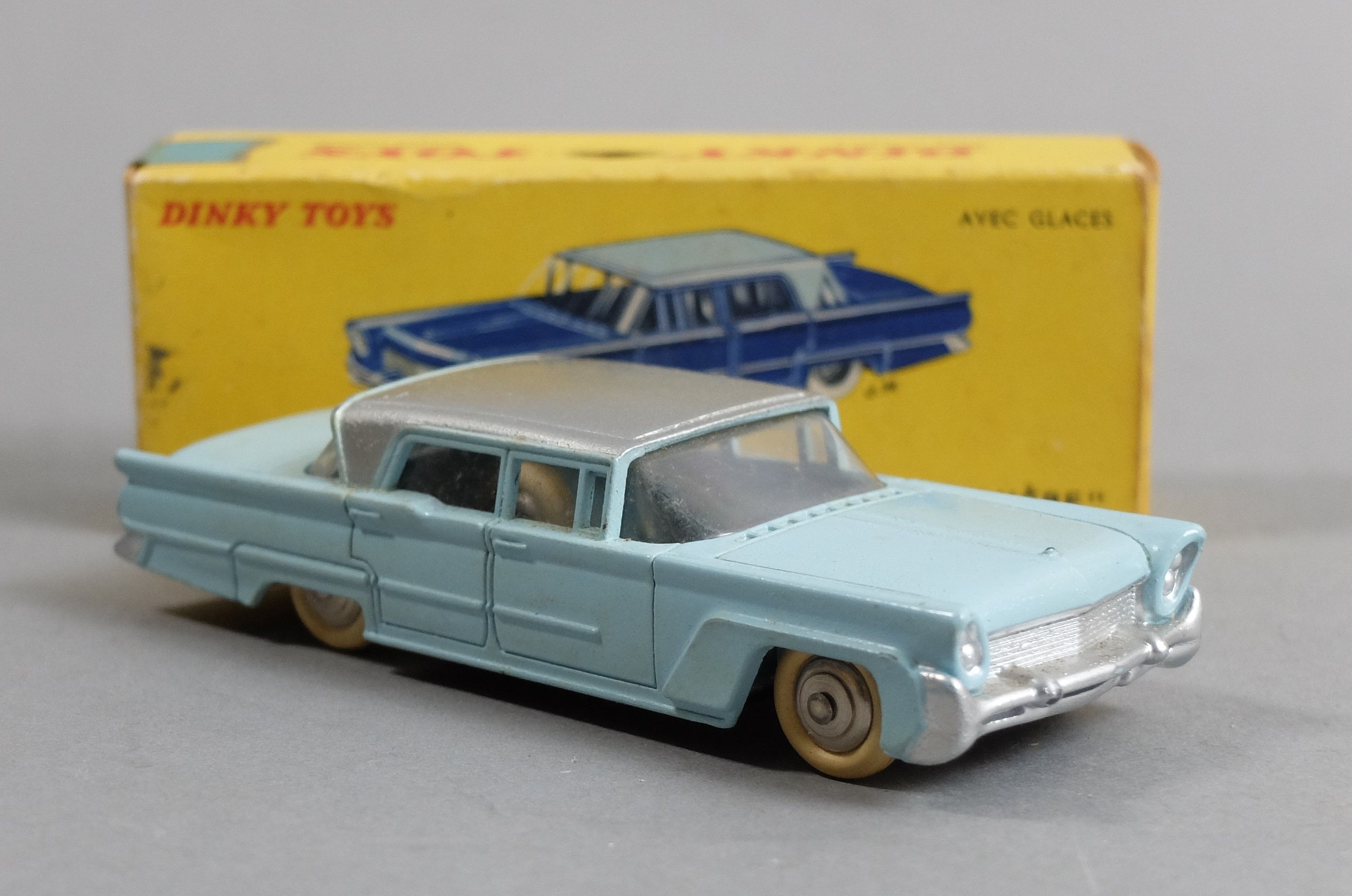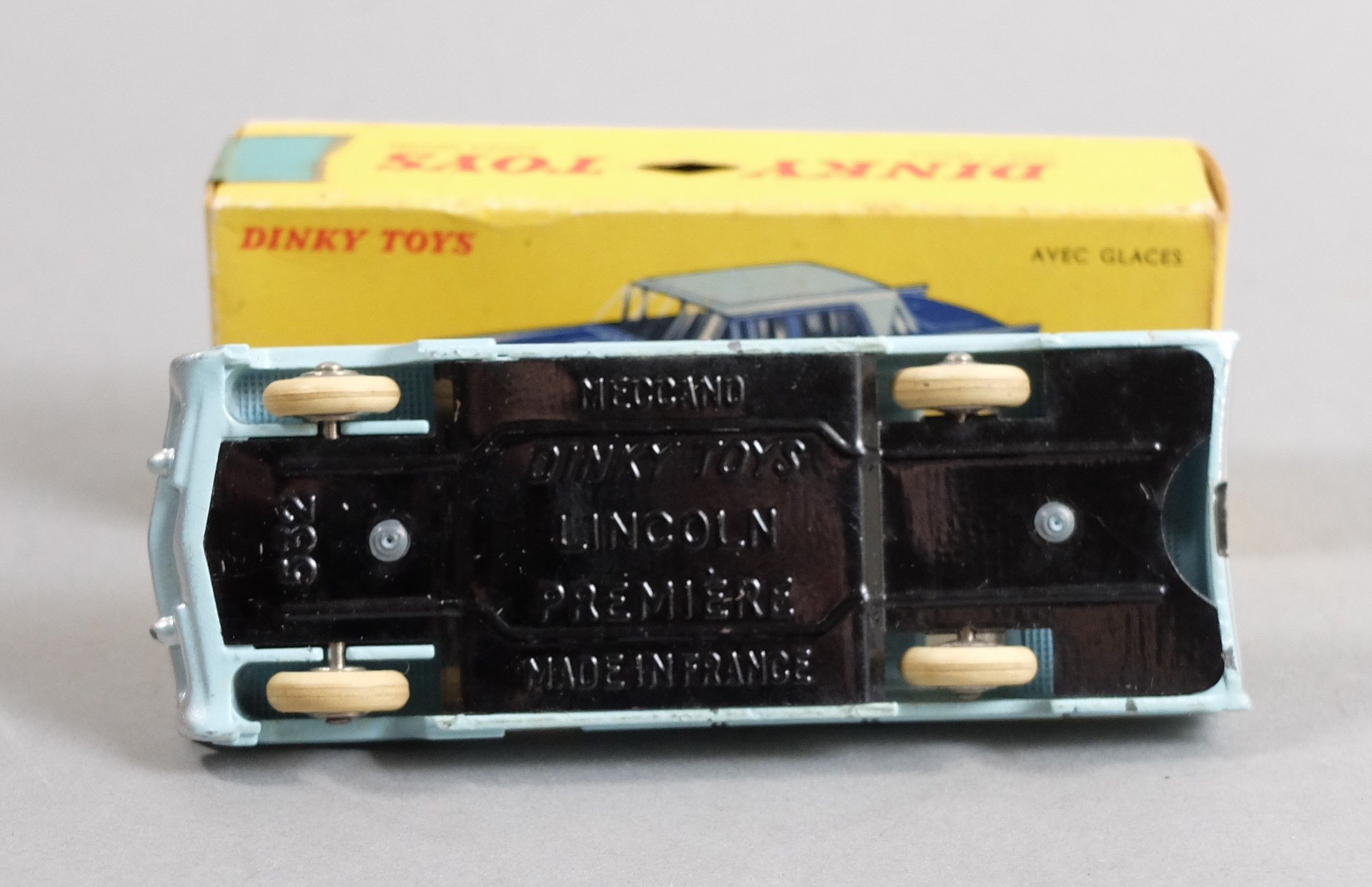 DINKY TOYS FRANCE - 1/43 - 532 - LINCOLN PREMIERE, sky blue with large metallic roof, with windows, convex rims, BOX (chatertone adhesive on one flap).