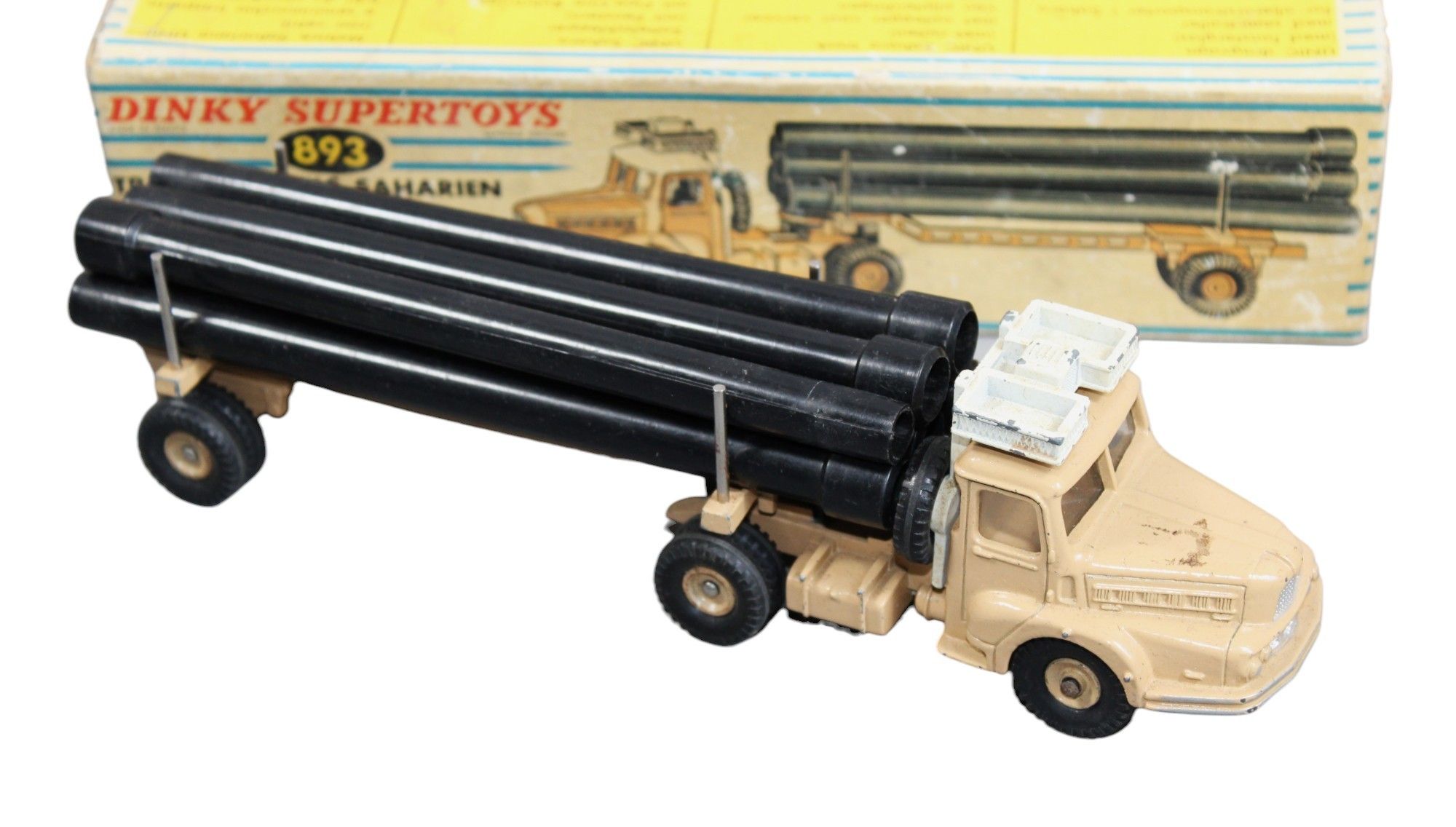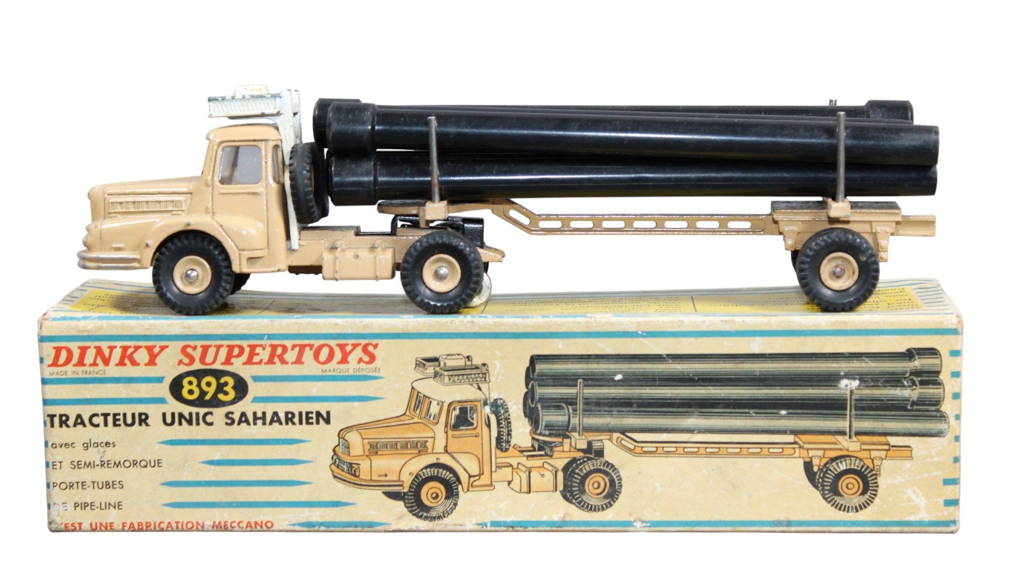 DINKY SUPERTOYS FRANCE - 1/43 - 893 - UNIC SAHARIAN TRACTOR, beige and white, 6 black plastic tubes, stain on bonnet, BOX (tears).