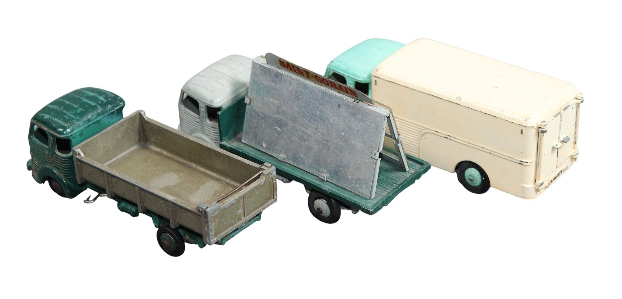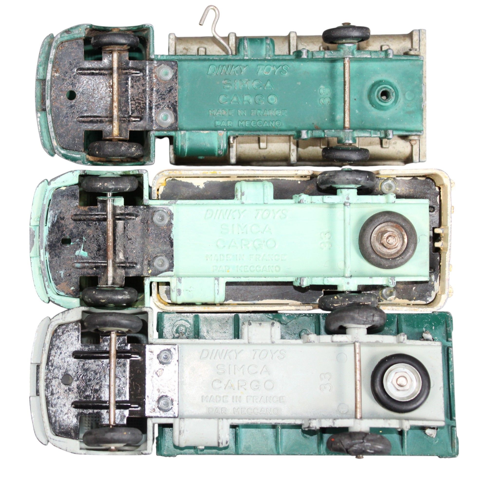 DINKY TOYS FRANCE - 1/43 - Set comprising: 33A - SIMCA CARGO FOURGON, water green with cream body, 33B - SIMCA CARGO BENNE BASCULANTE, dark green with smooth grey tipper, ET, 33C - SIMCA CARGO MIROITIER, medium grey and dark green top with window and mirror, repainted and with paint chips, in mint condition.