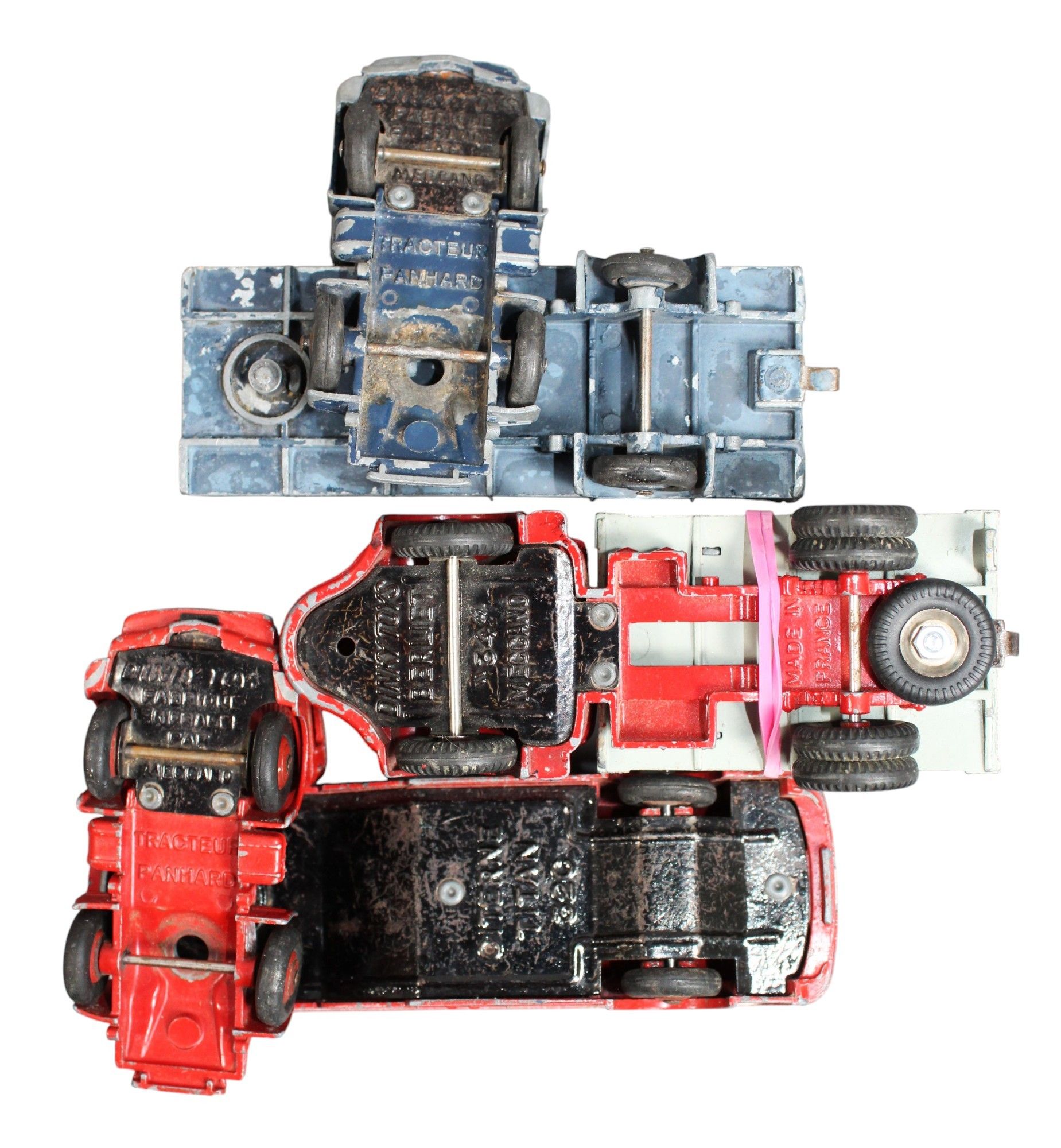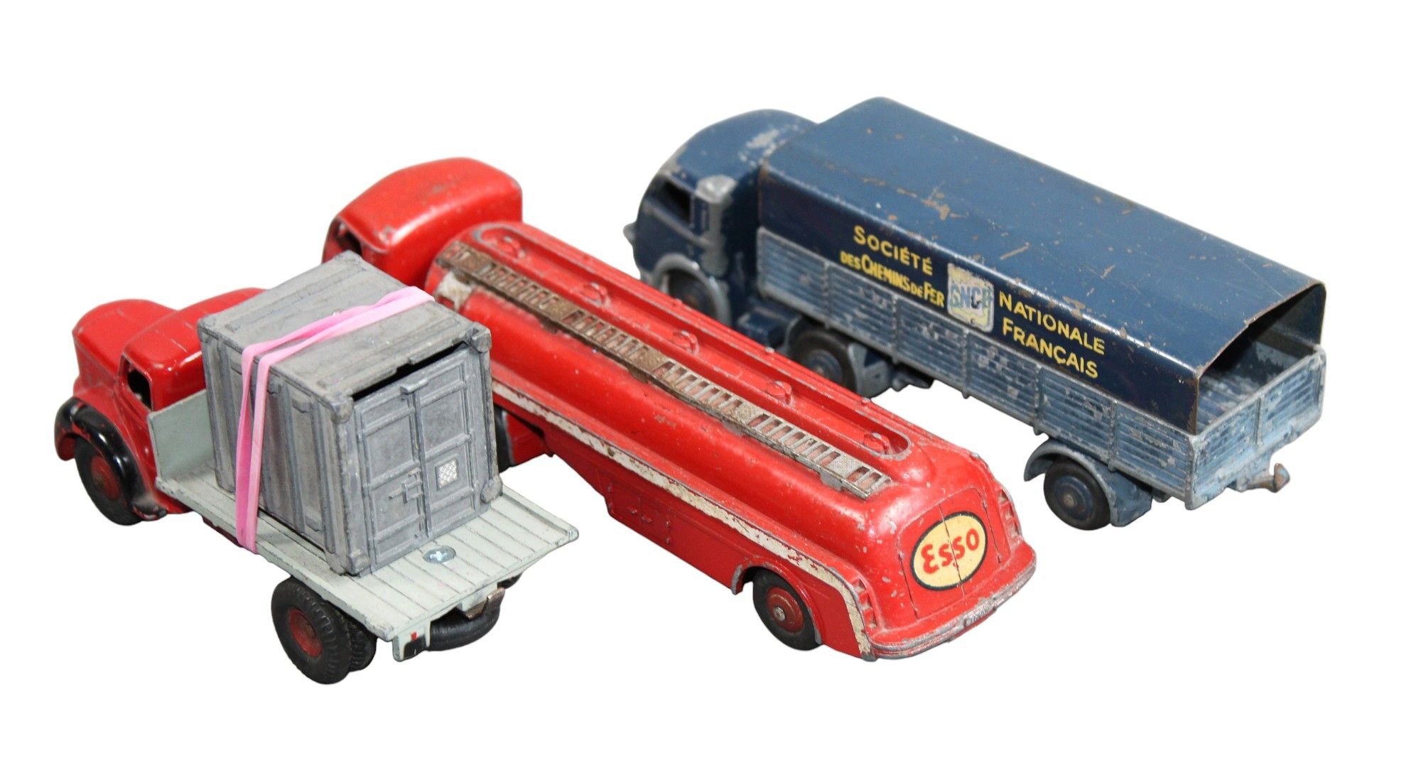 DINKY TOYS FRANCE - 1/43 - Set comprising: 32AB - PANHARD TRACTOR, navy blue, and SNCF SEMI-TRUCK, navy blue, 33C - PANHARD TRACTOR, red, and ESSO TITAN TANK, red with white stripes, ET, 34B - BERLIER PORTE-CONTENEURS TRUCK, red and black cab, grey tray and dark grey container, paintwork missing, as seen.