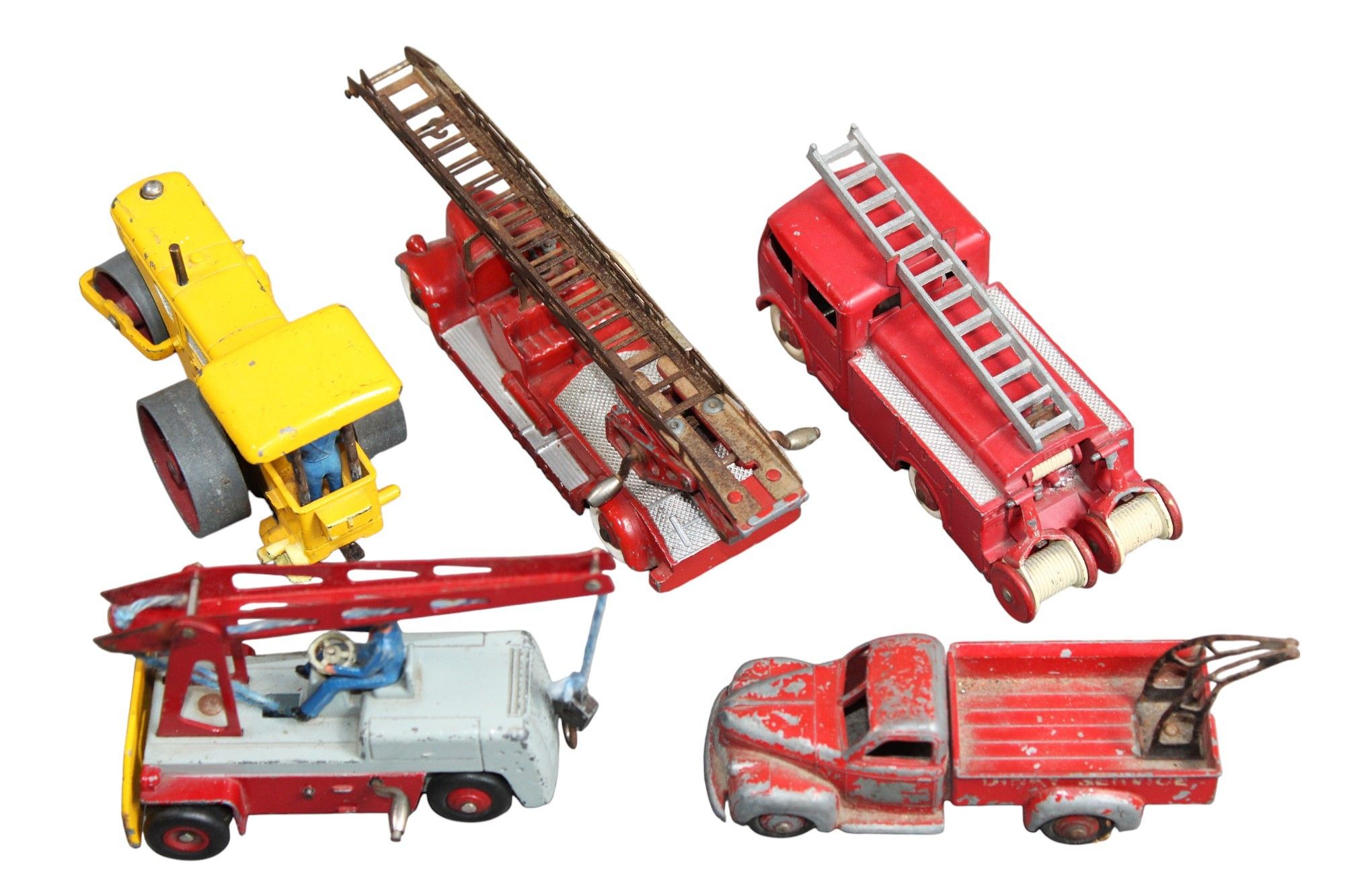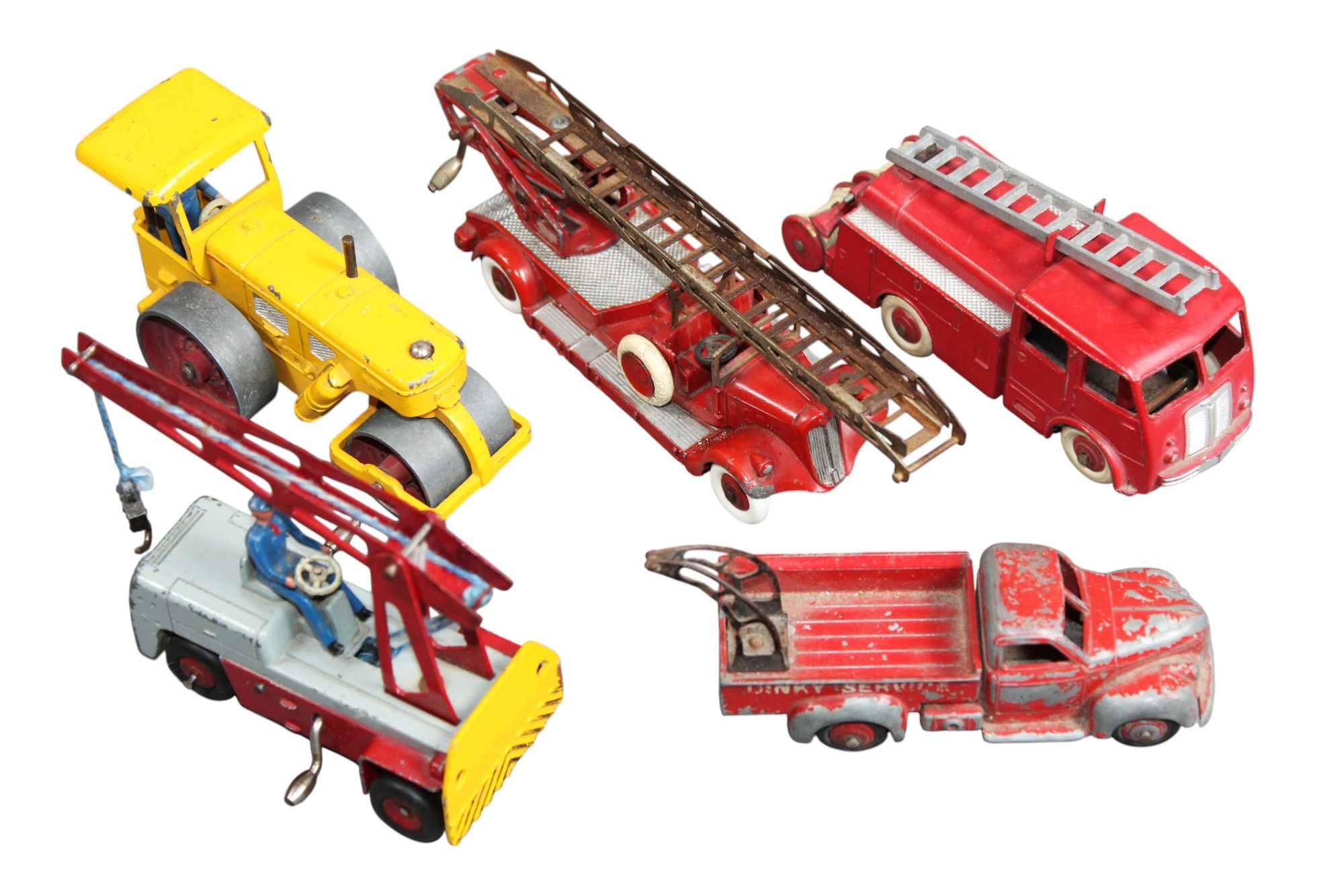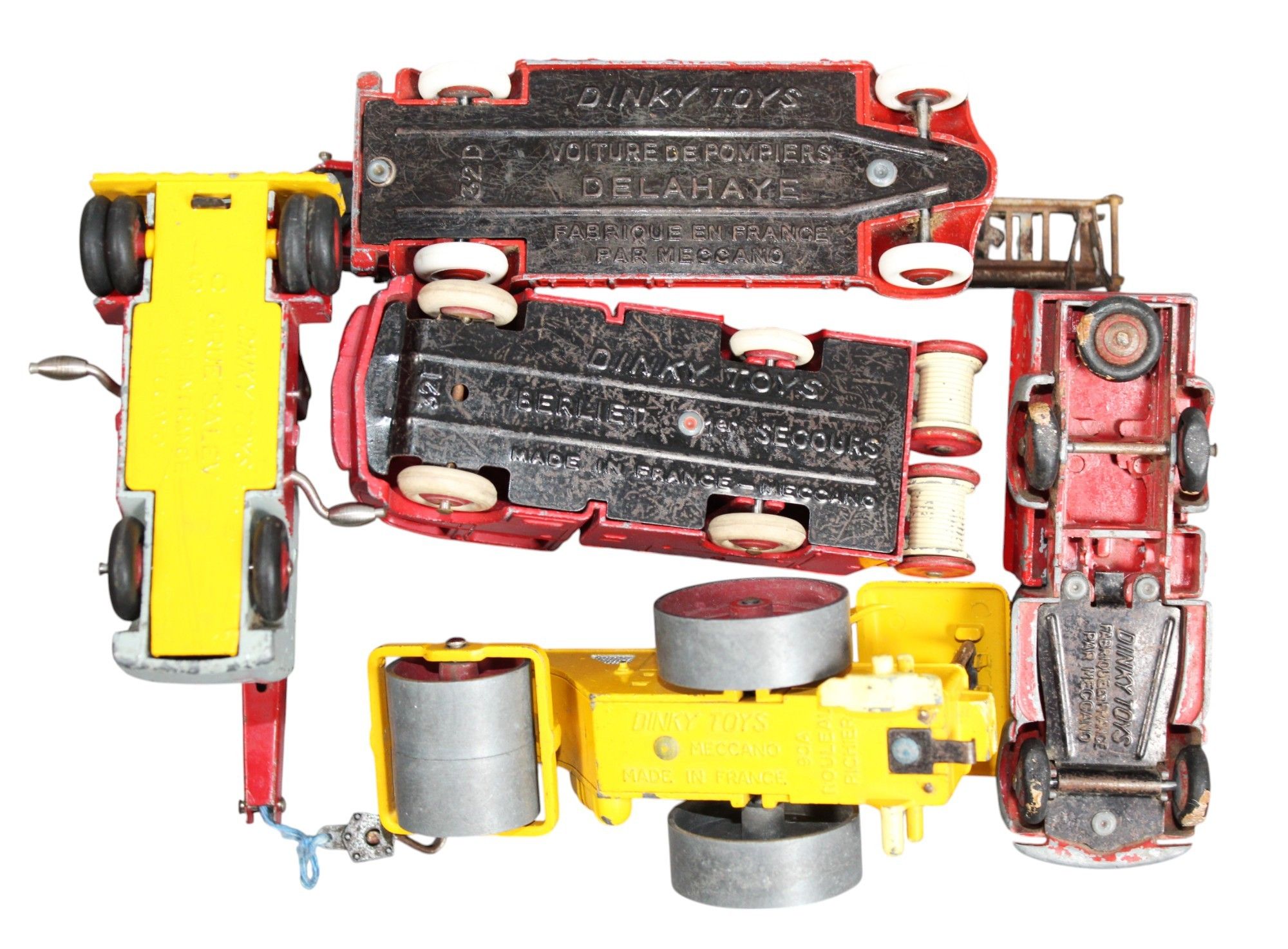 DINKY TOYS FRANCE - 1/43 - Set comprising: 32D - DELAHAYE AUTO FIREMAN'S SCALE TRUCK, red, 32E - BERLIET FIRST AID, red, 50 - SALEV MOBILE CRANE, red and grey with yellow apron and figure, ET, 90A - RICHIER COMPRESSOR ROLLER, yellow with red wheels and driver in blue overalls, paintwork missing, as new.