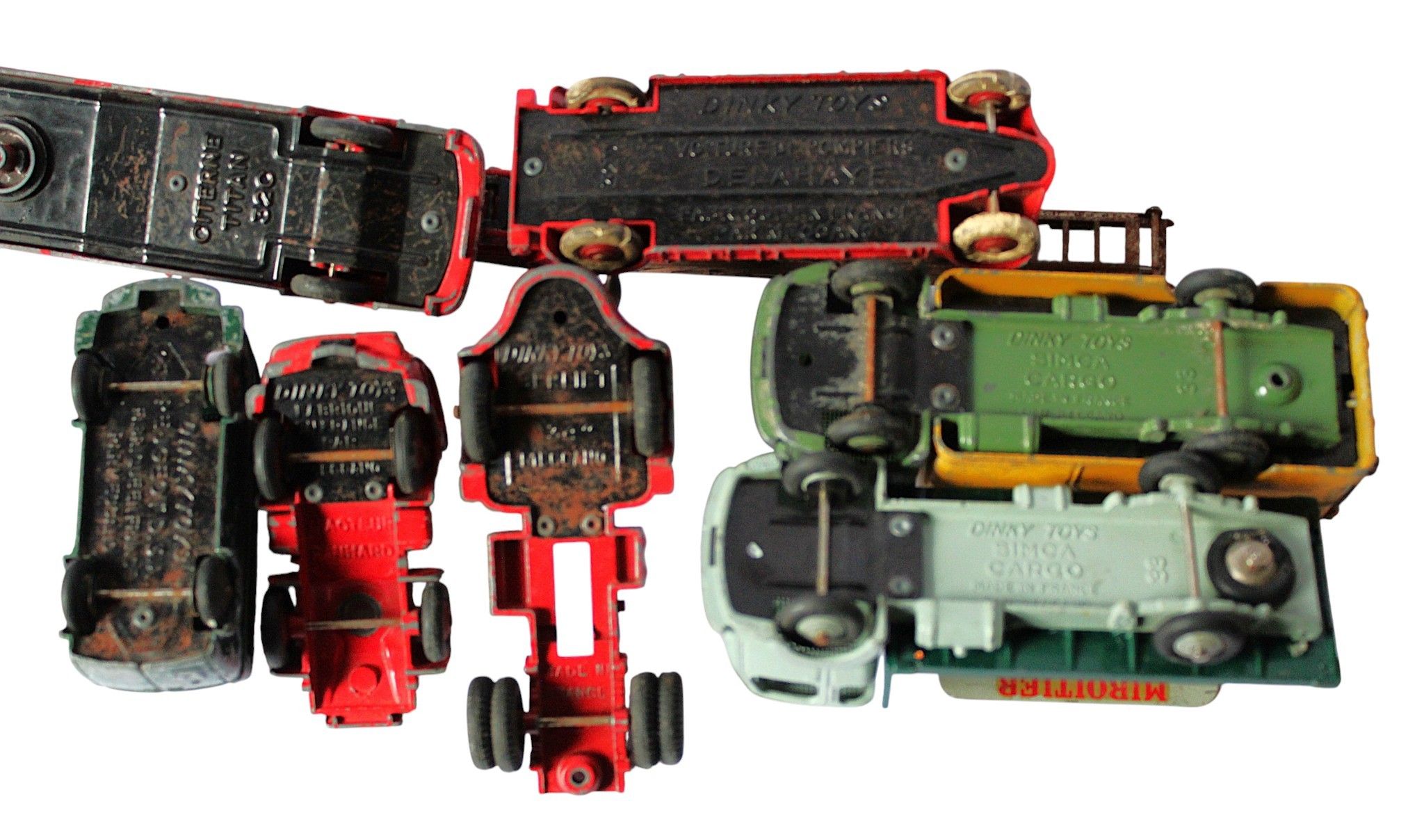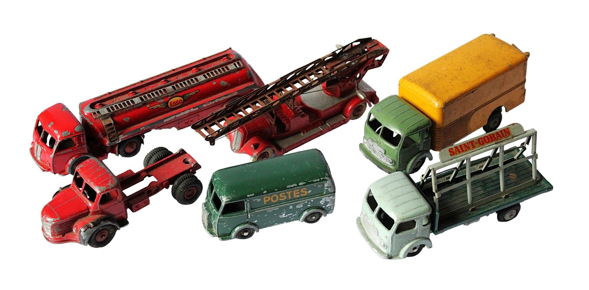 DINKY TOYS FRANCE - 1/43 - Set including 6 VEHICLES : 32C - CITERBE TITAN ESSO, 32D - DELAHAYE ECHELLE DE POMPIER, 34 - CAMION BERLIET, 25B - PEUGEOT D3A POSTES, 33 - 2 SIMCA CARGO including mirror, accidents and missing, some tyres crushed, IN THE STATE.