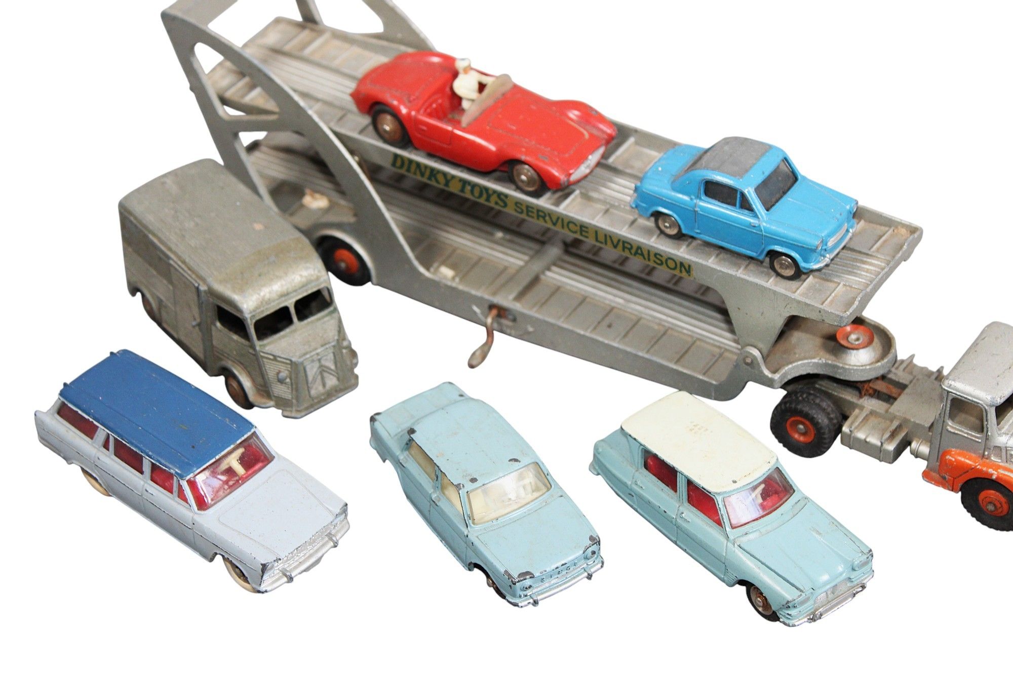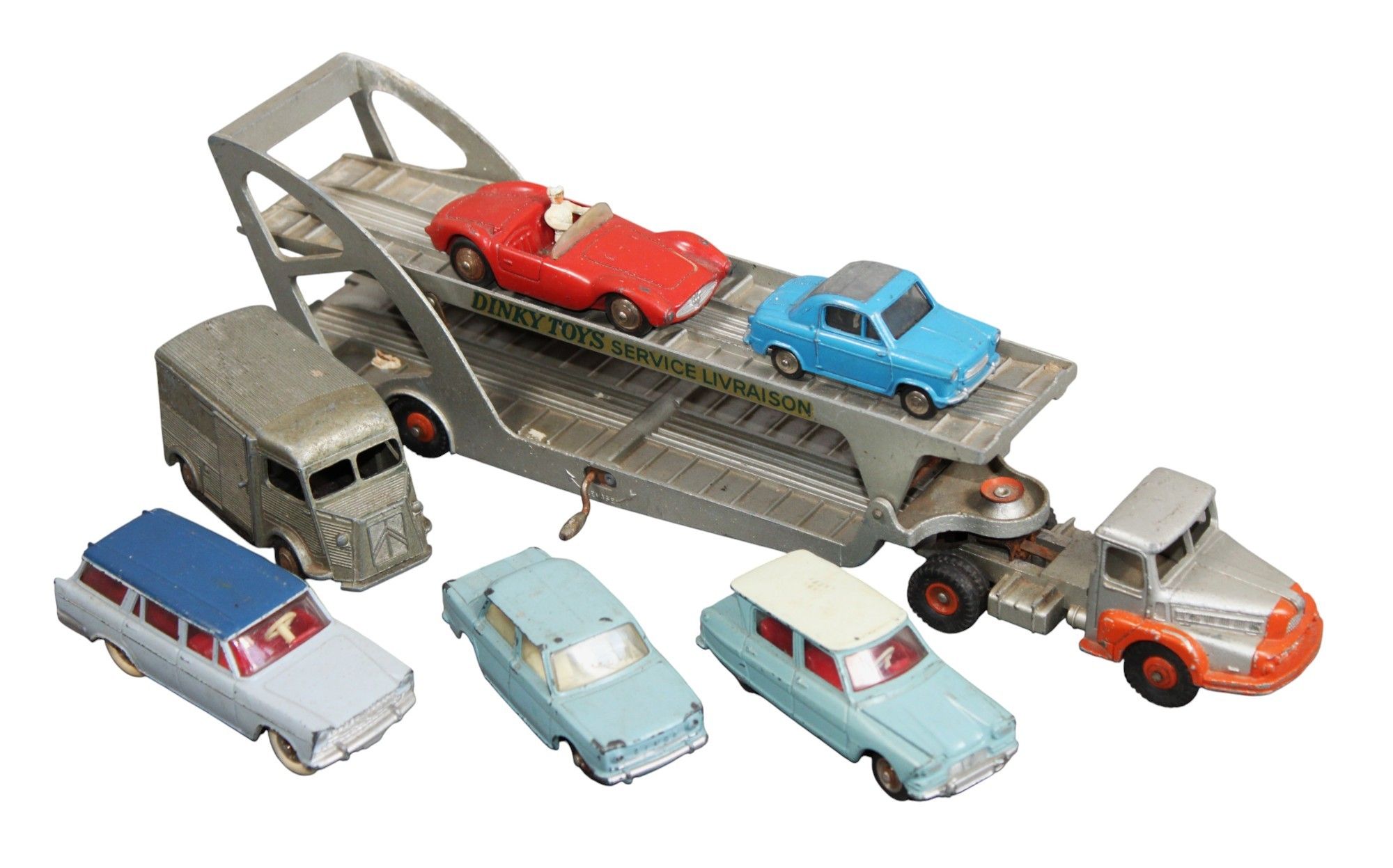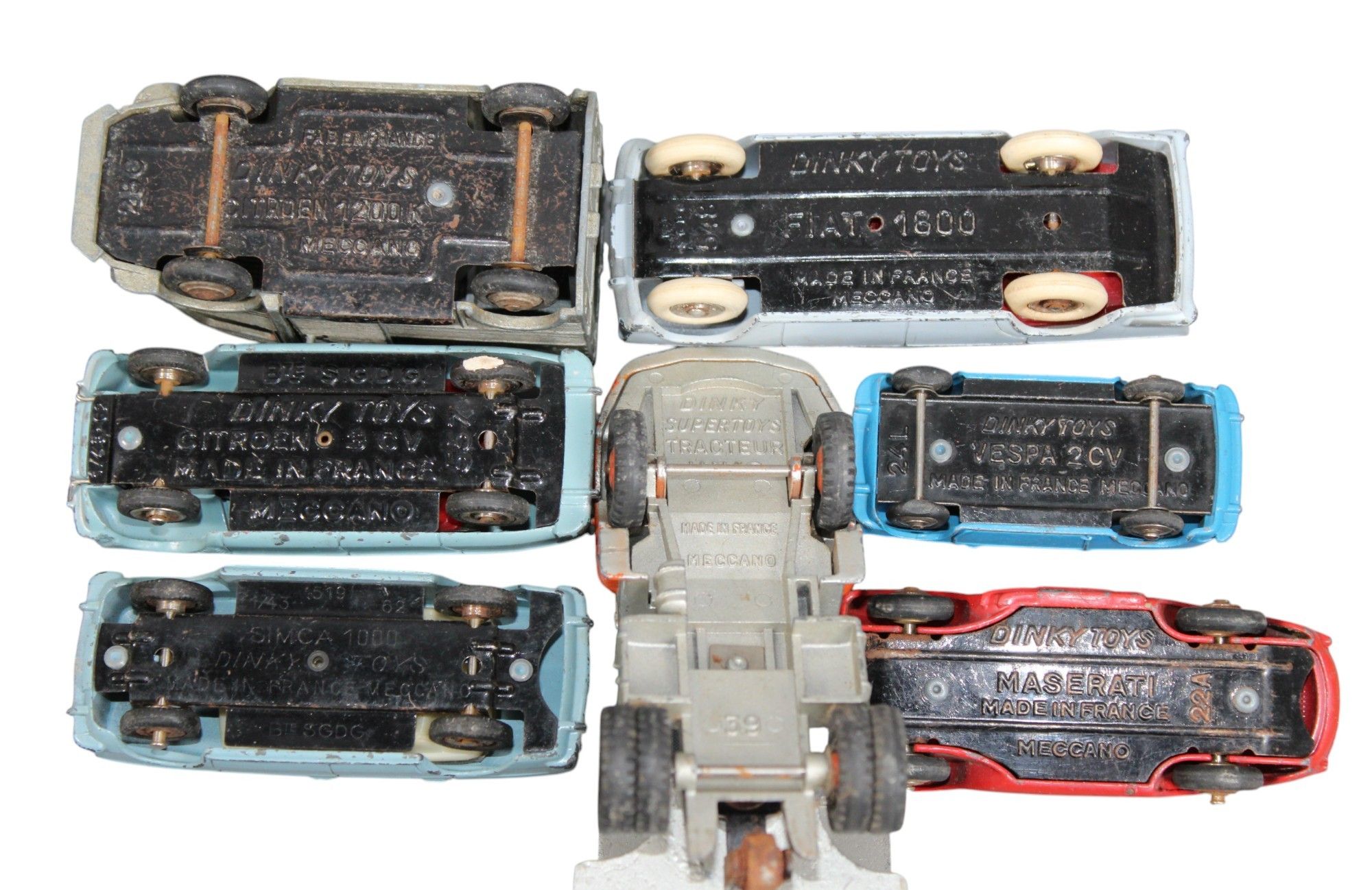 DINKY SUPERTOYS & DINKY TOYS FRANCE - 1/43 - Set including 7 VEHICLES : 39A - SINGLE TRACTOR AND BOILOT SEMI-REMORQUE PORTE-VOITURES, 22A - MASERATI SPORT 2000, 24L - VESPA 2CV, 25C - CITROEN 1200K, 519 - SIMCA 1000, 548 - FIAT 1800 ET 557 - CITROEN 3CV, paint alterations, some tyres crushed, IN GOOD CONDITION.
